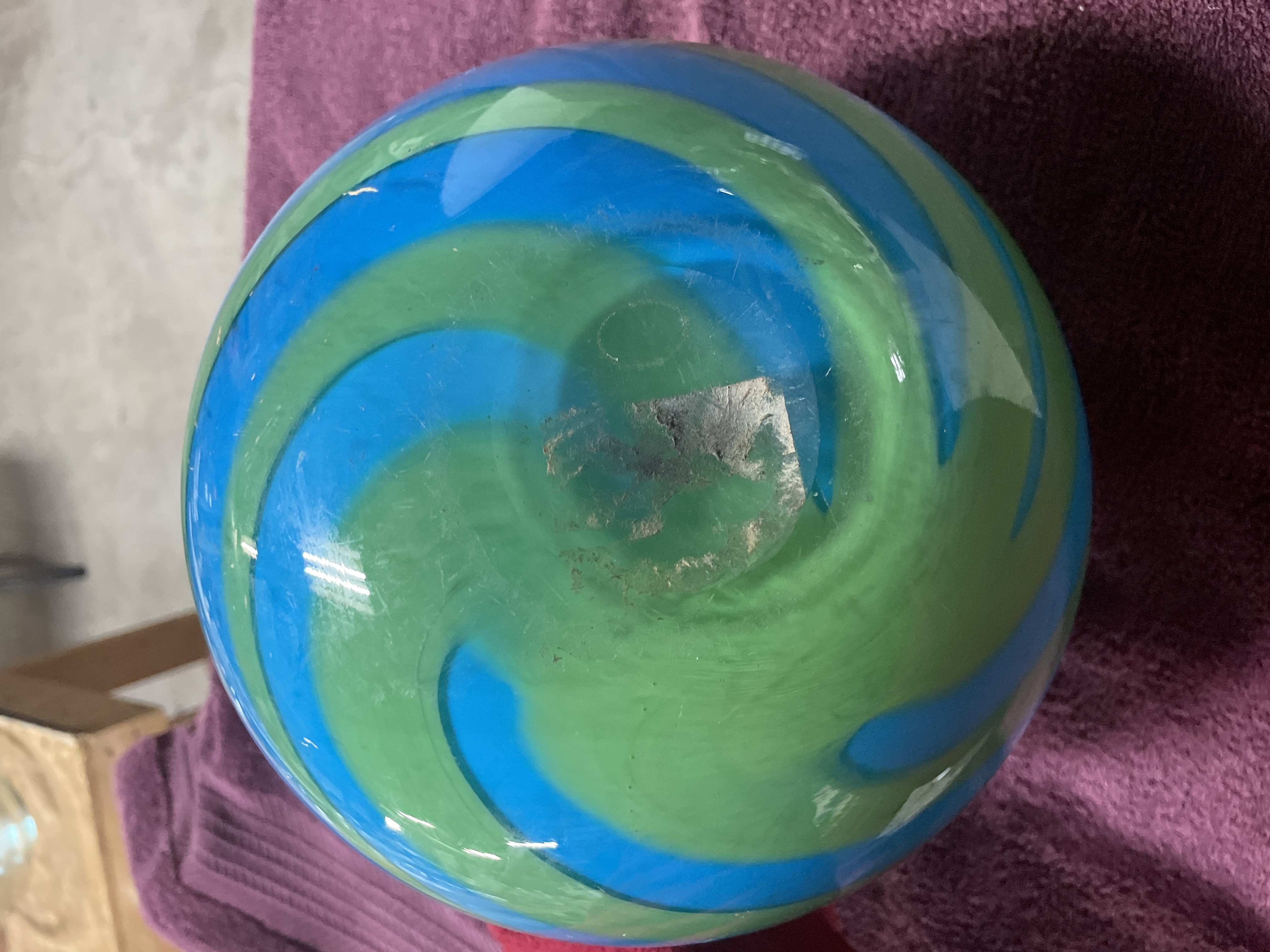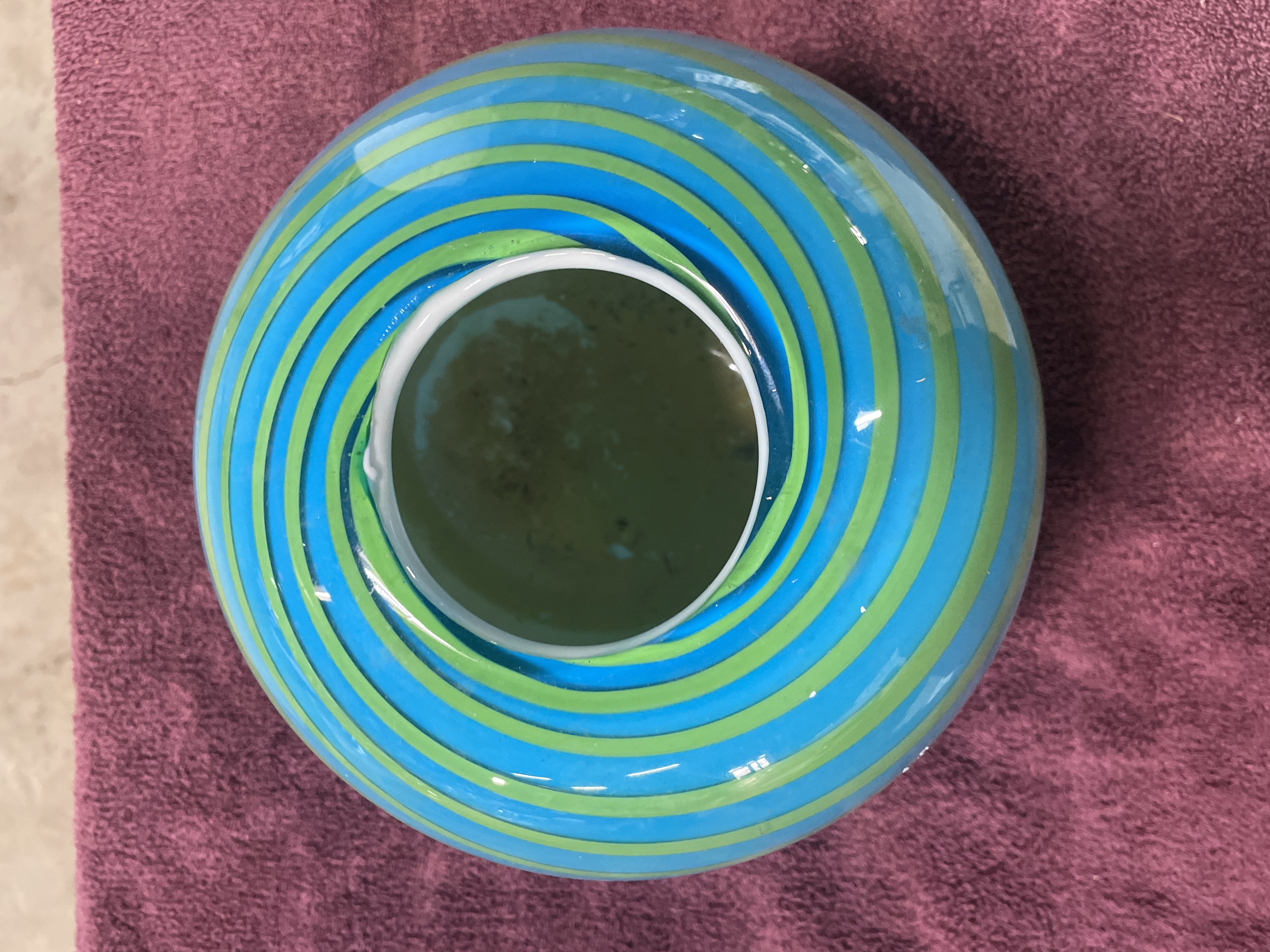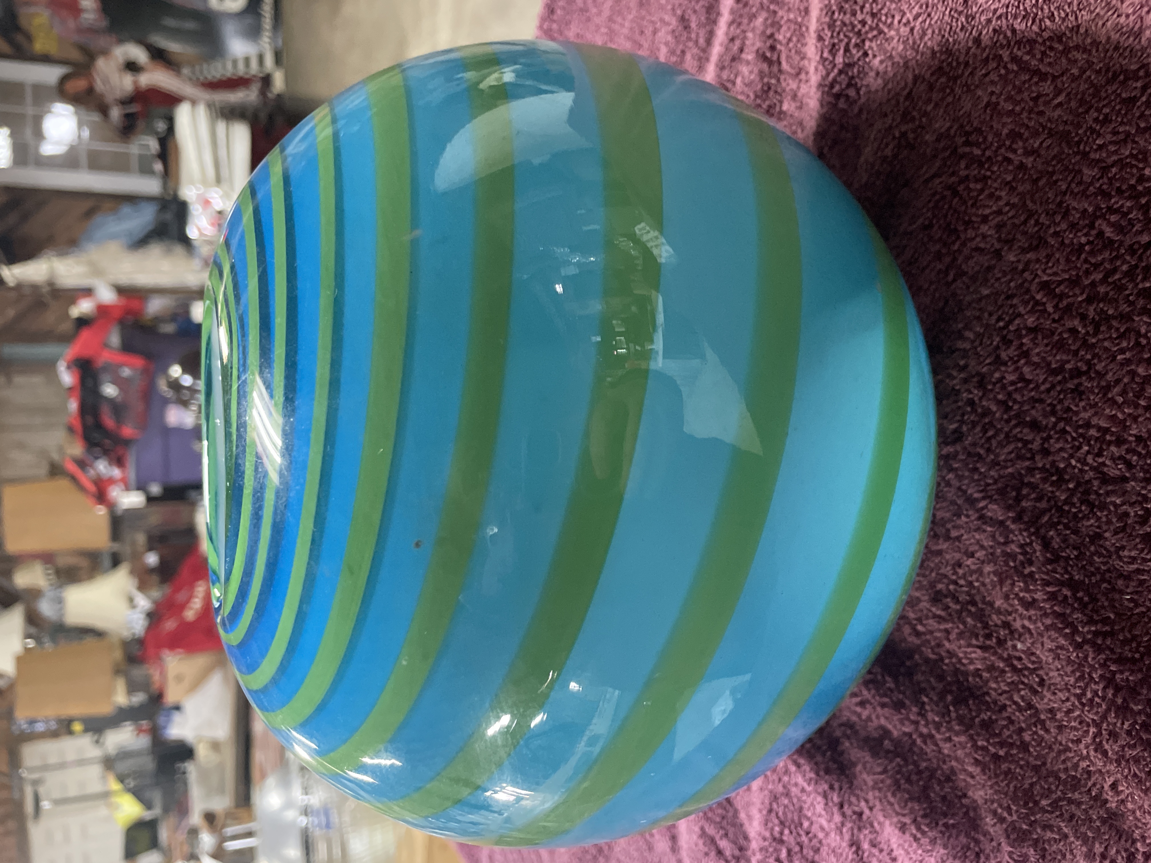 A spherical handblown glass vase featuring alternating light blue and green horizontal stripes, measuring approximately 7.5 inches in diameter.