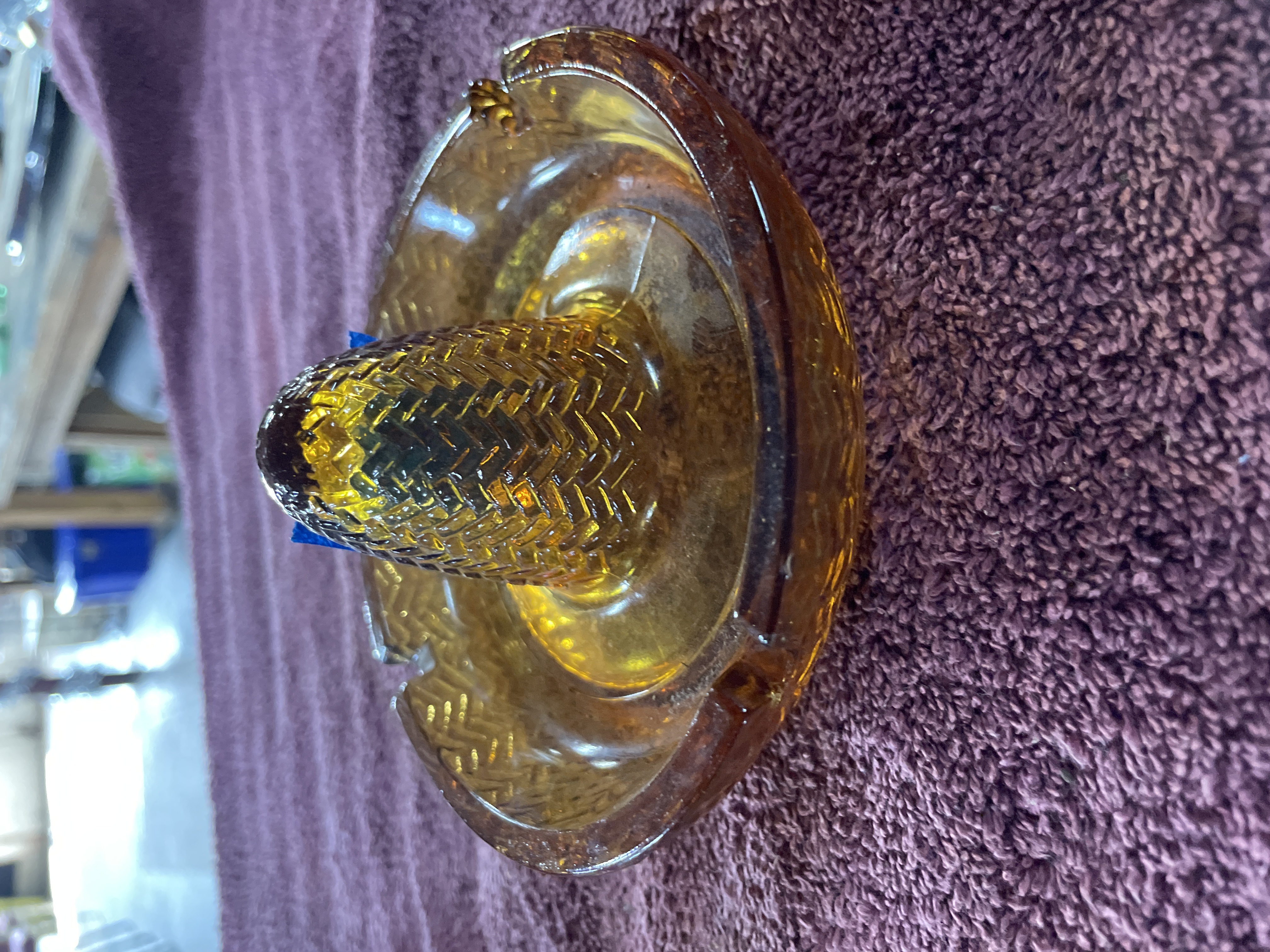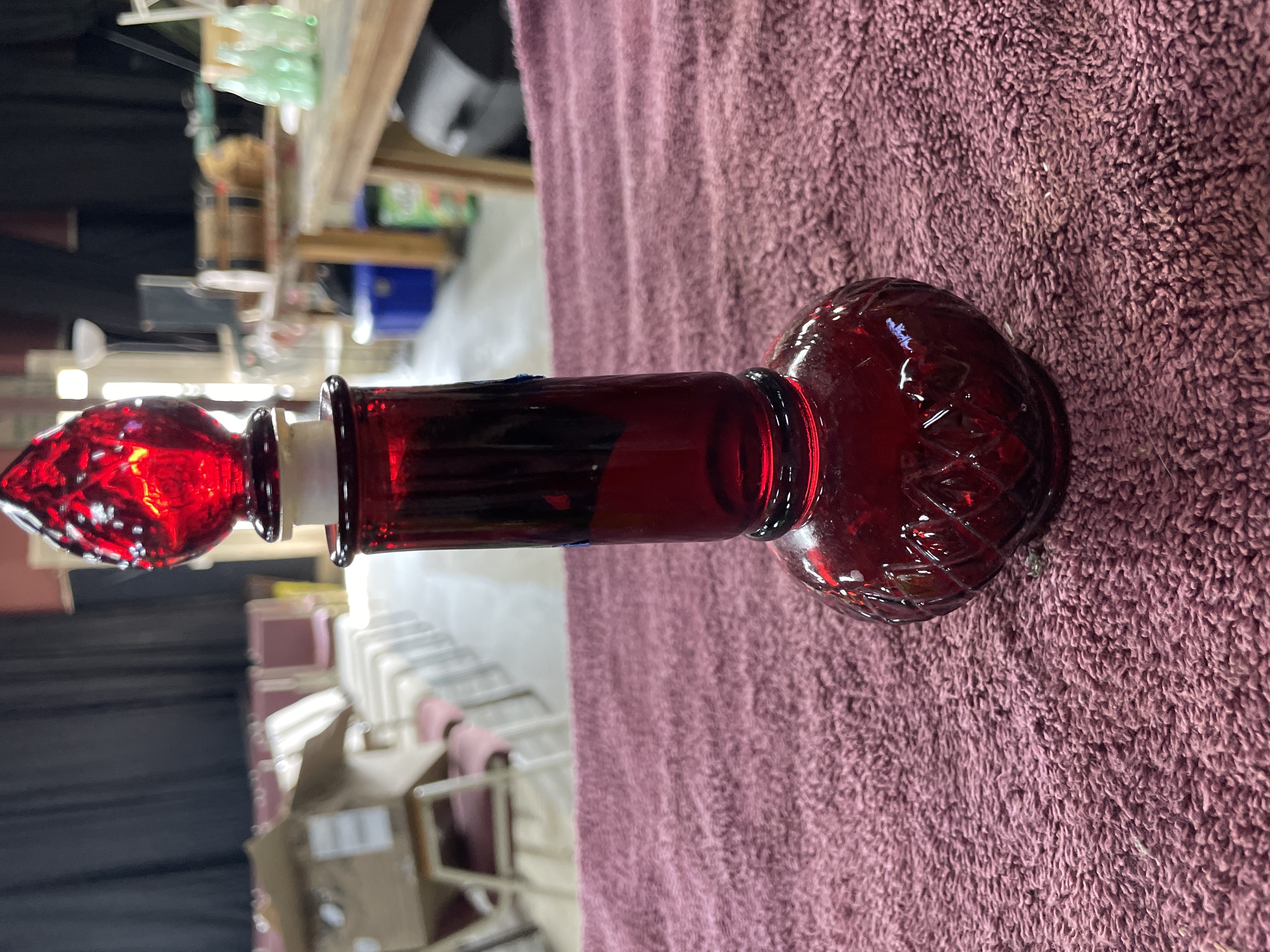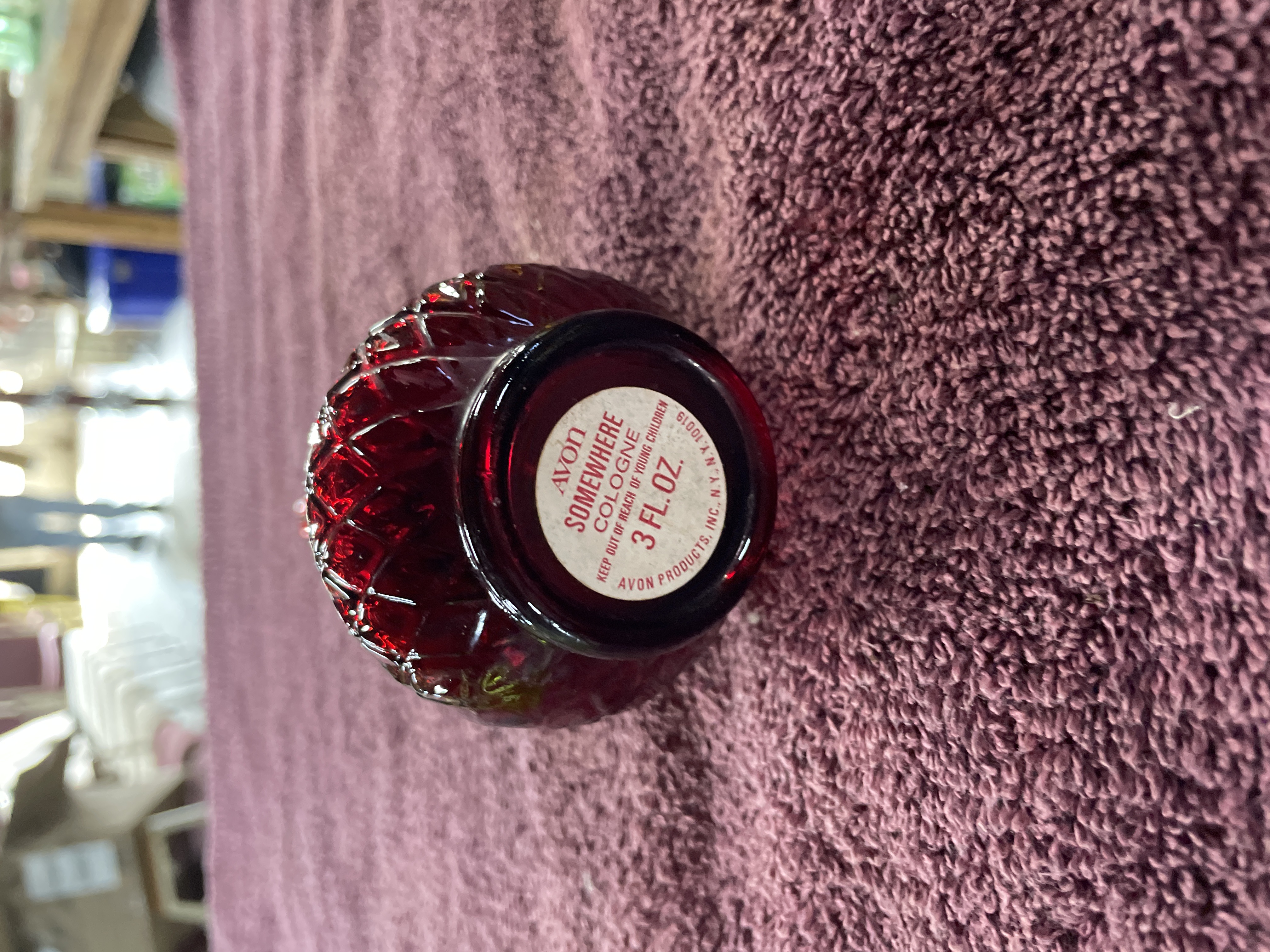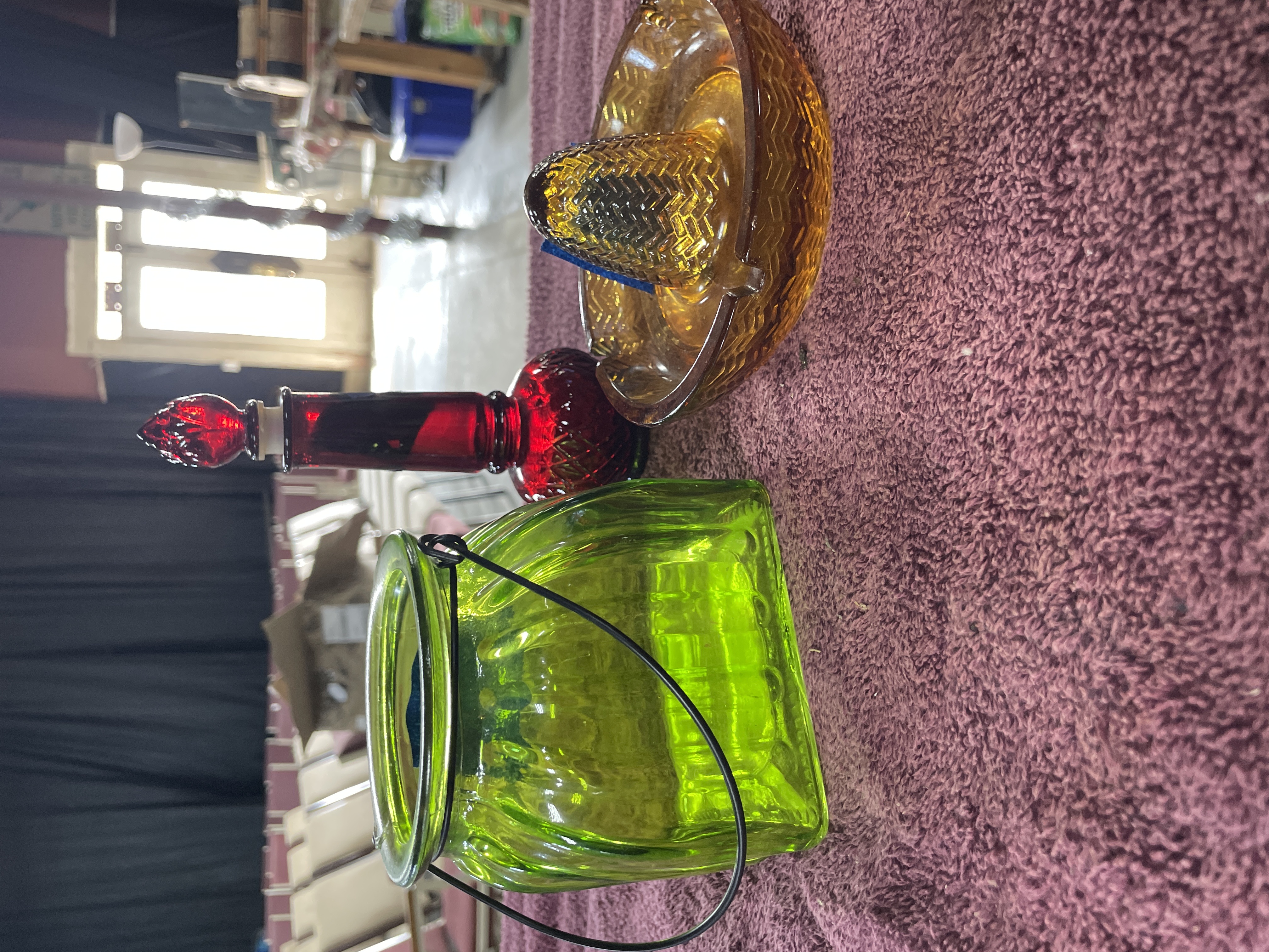 An amber sombrero-shaped ashtray inscribed South of the Border, a ruby-red Avon Somewhere cologne bottle with its stopper, and a lime-green ribbed glass lantern with a black metal handle.