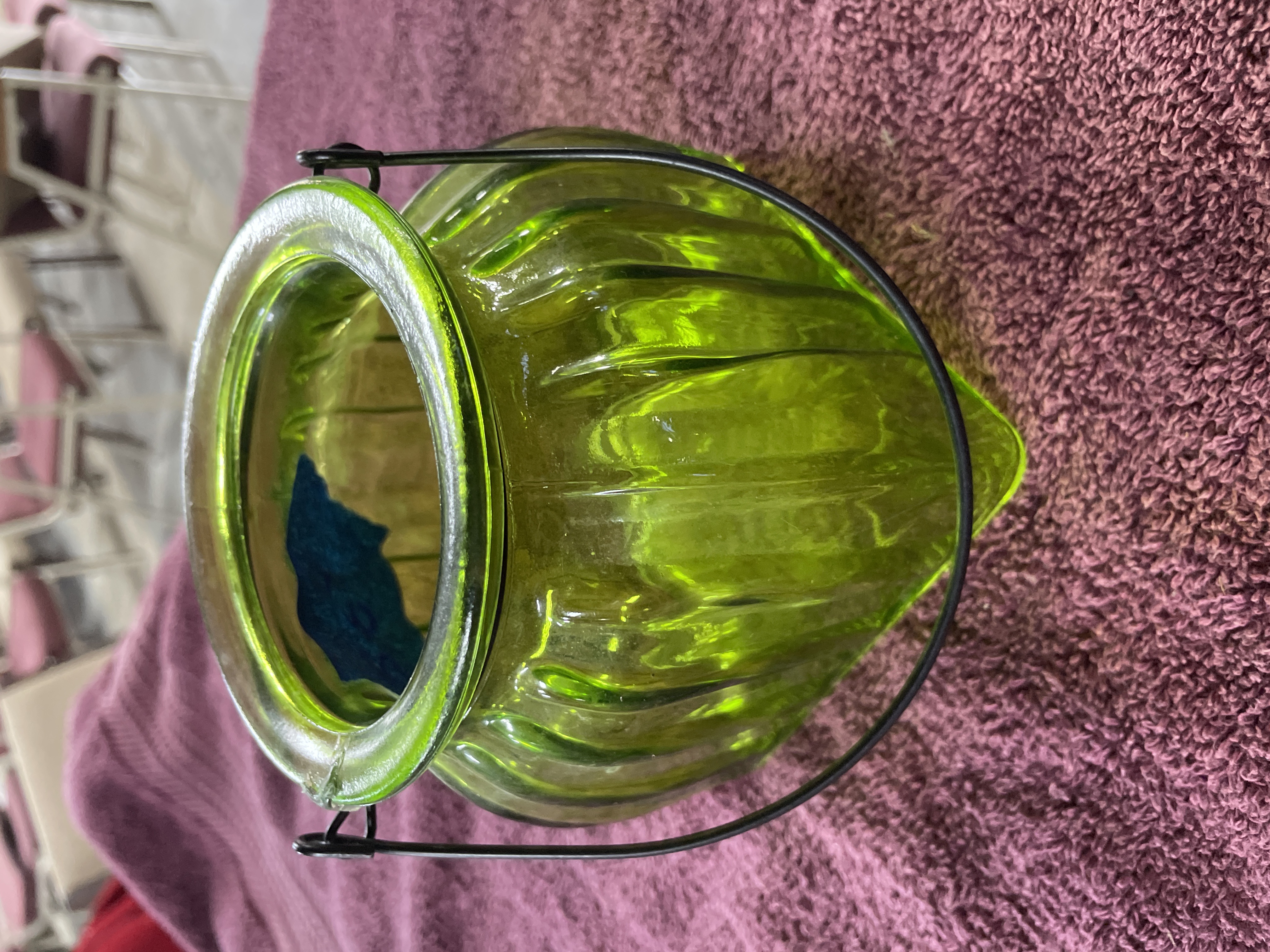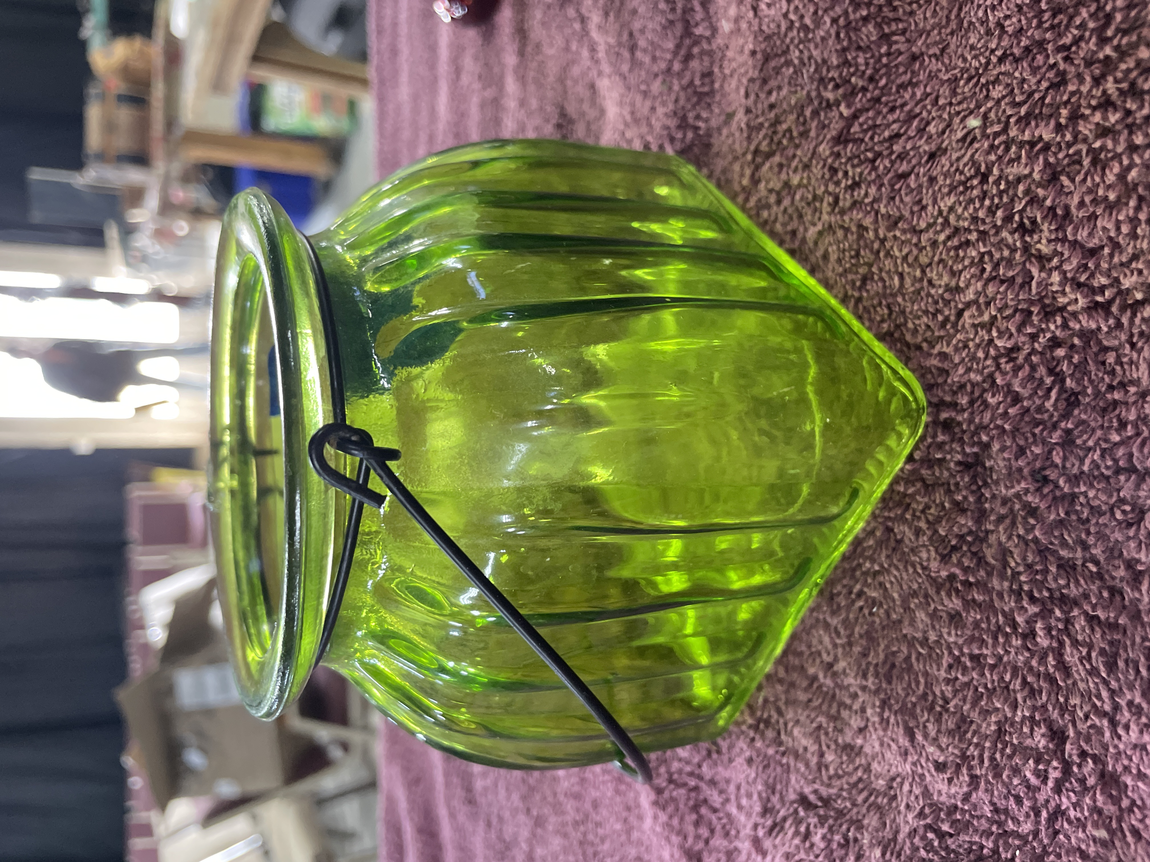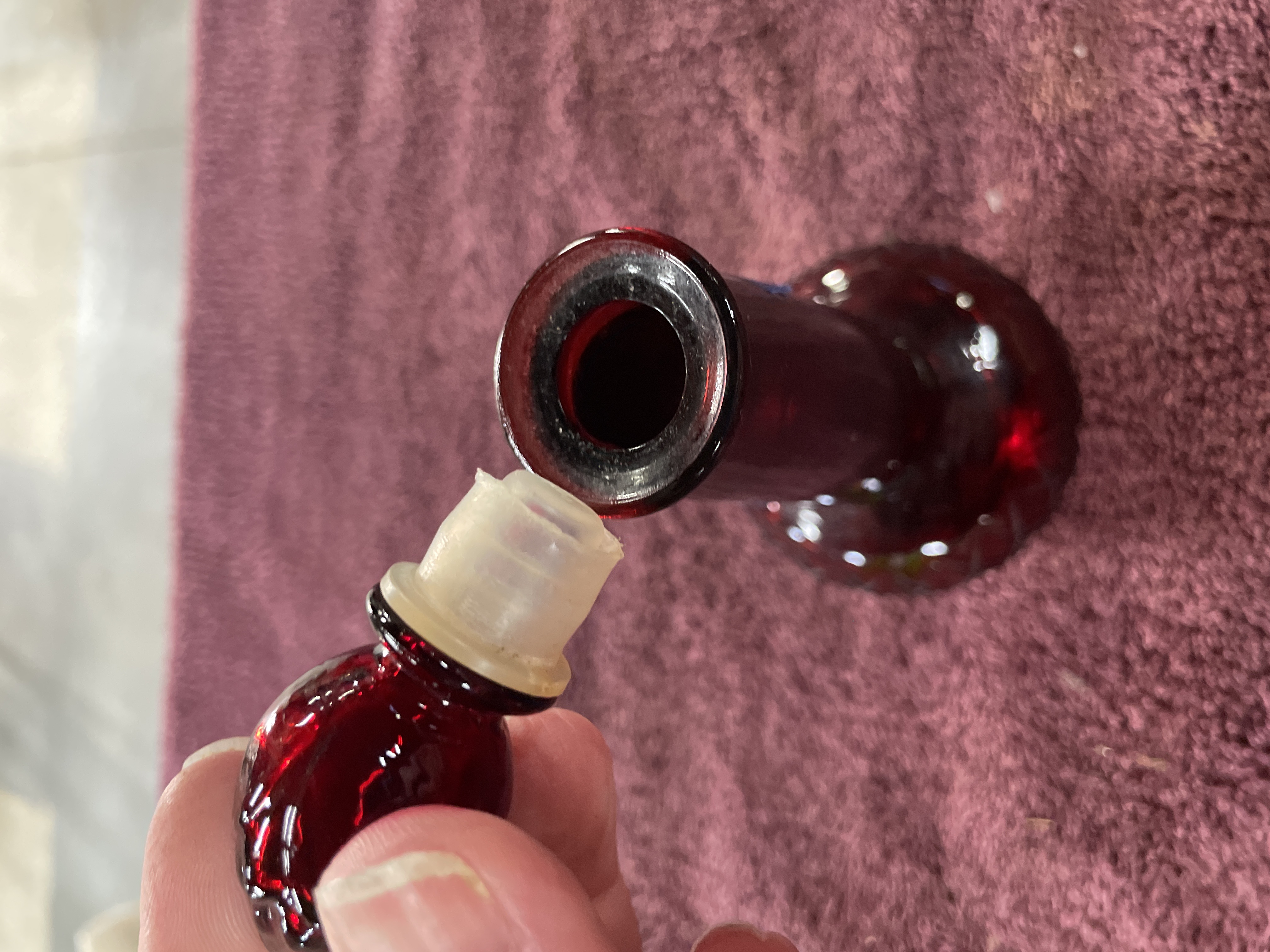 An amber sombrero-shaped ashtray inscribed South of the Border, a ruby-red Avon Somewhere cologne bottle with its stopper, and a lime-green ribbed glass lantern with a black metal handle.