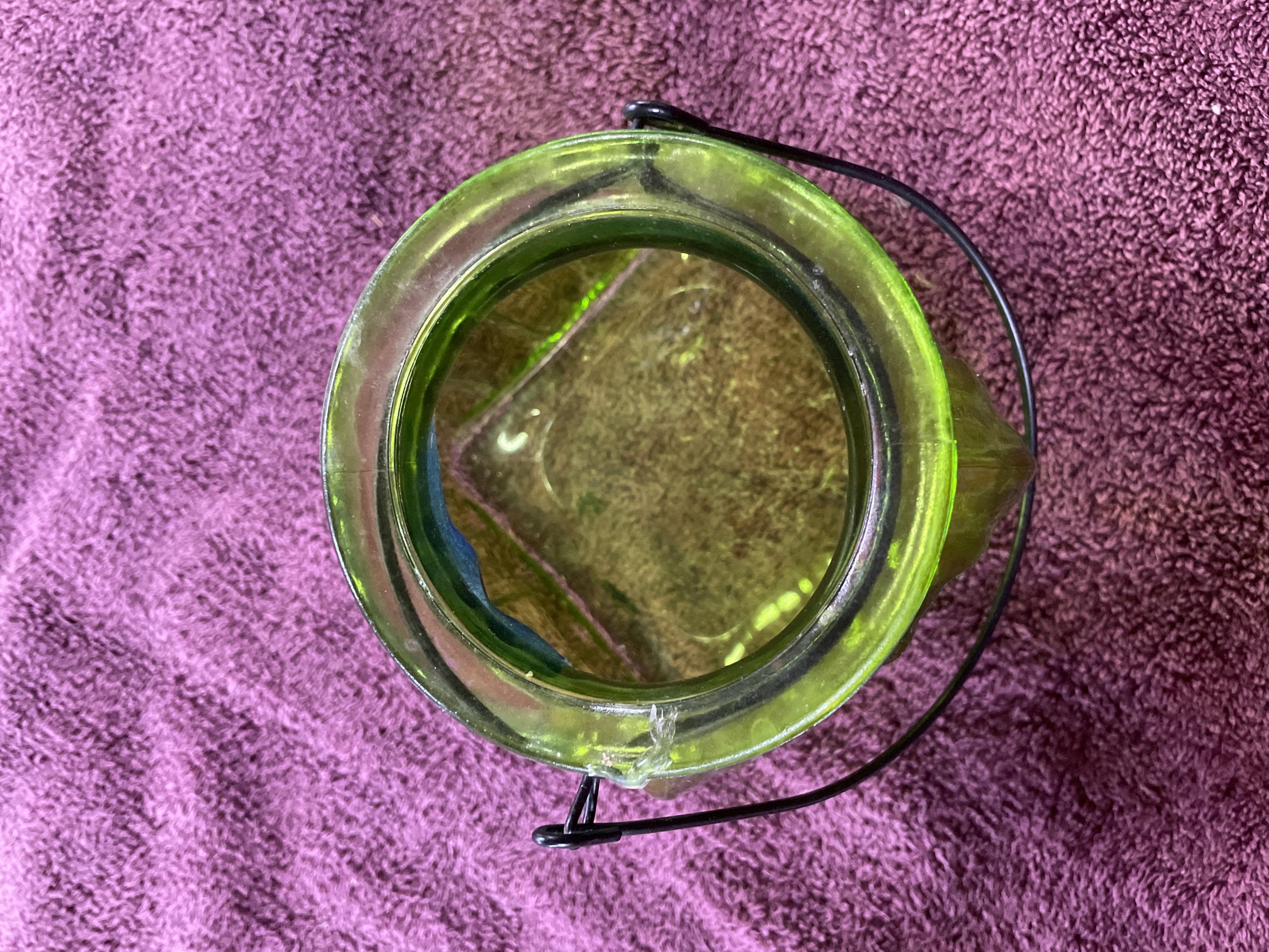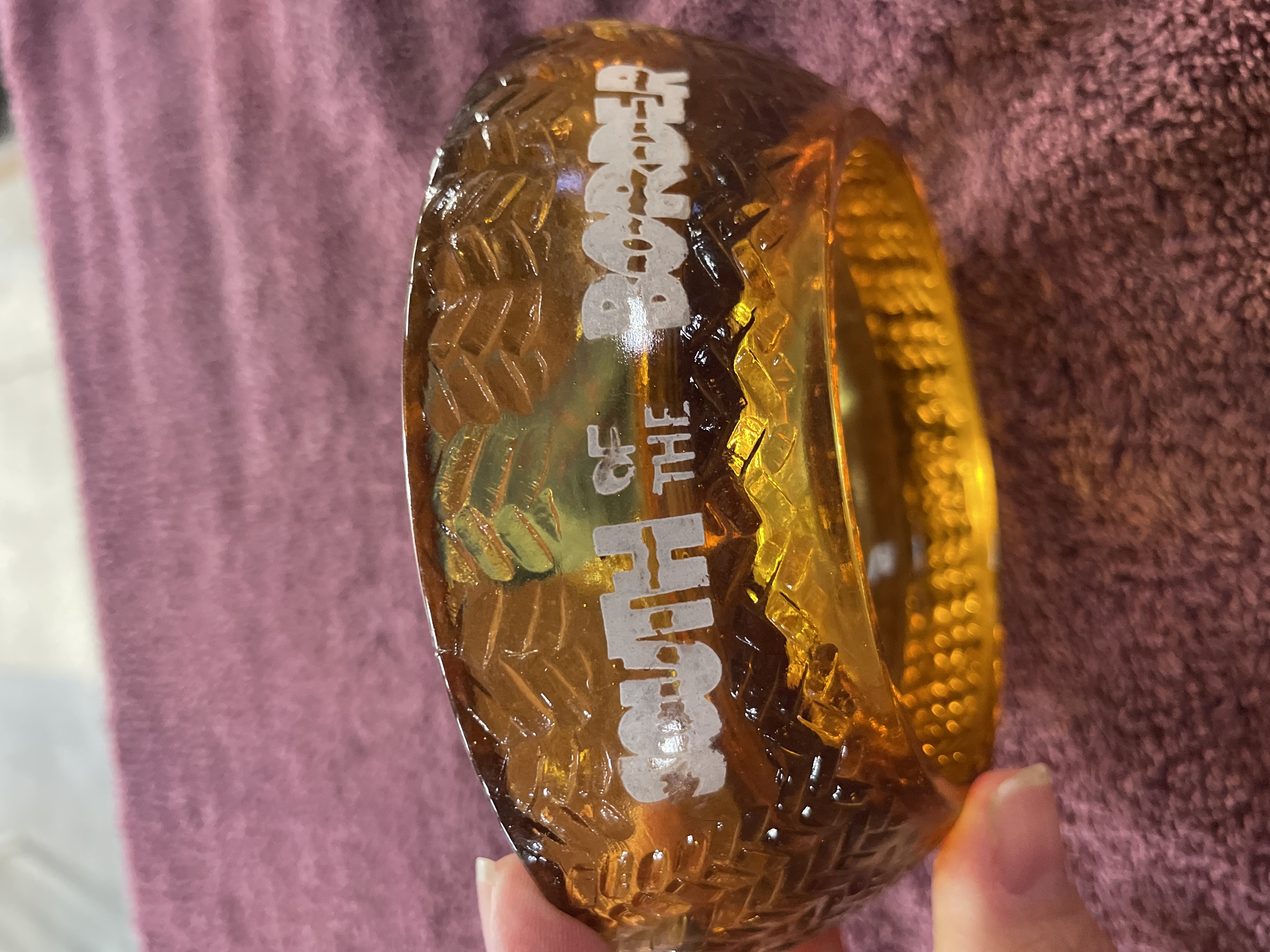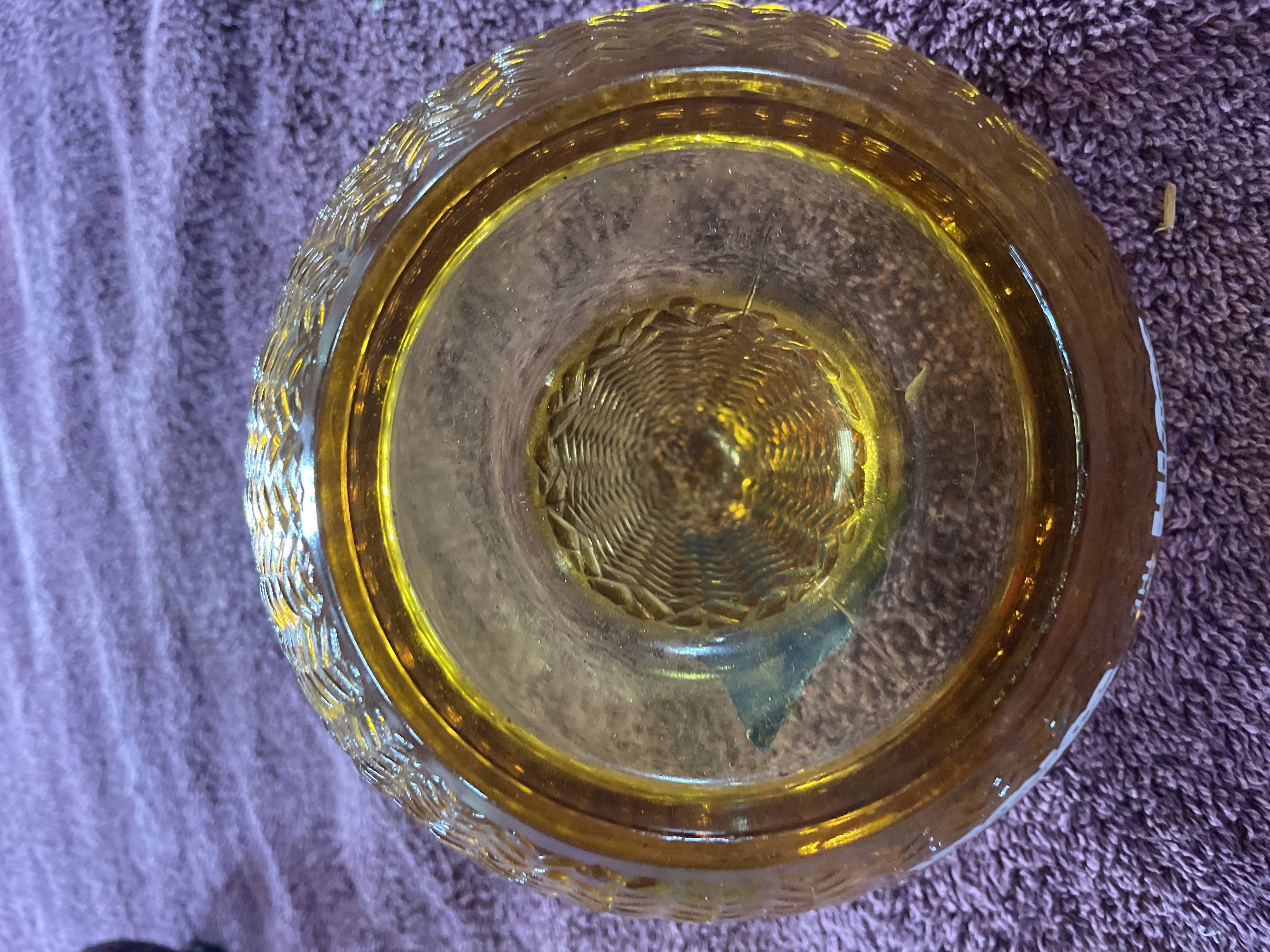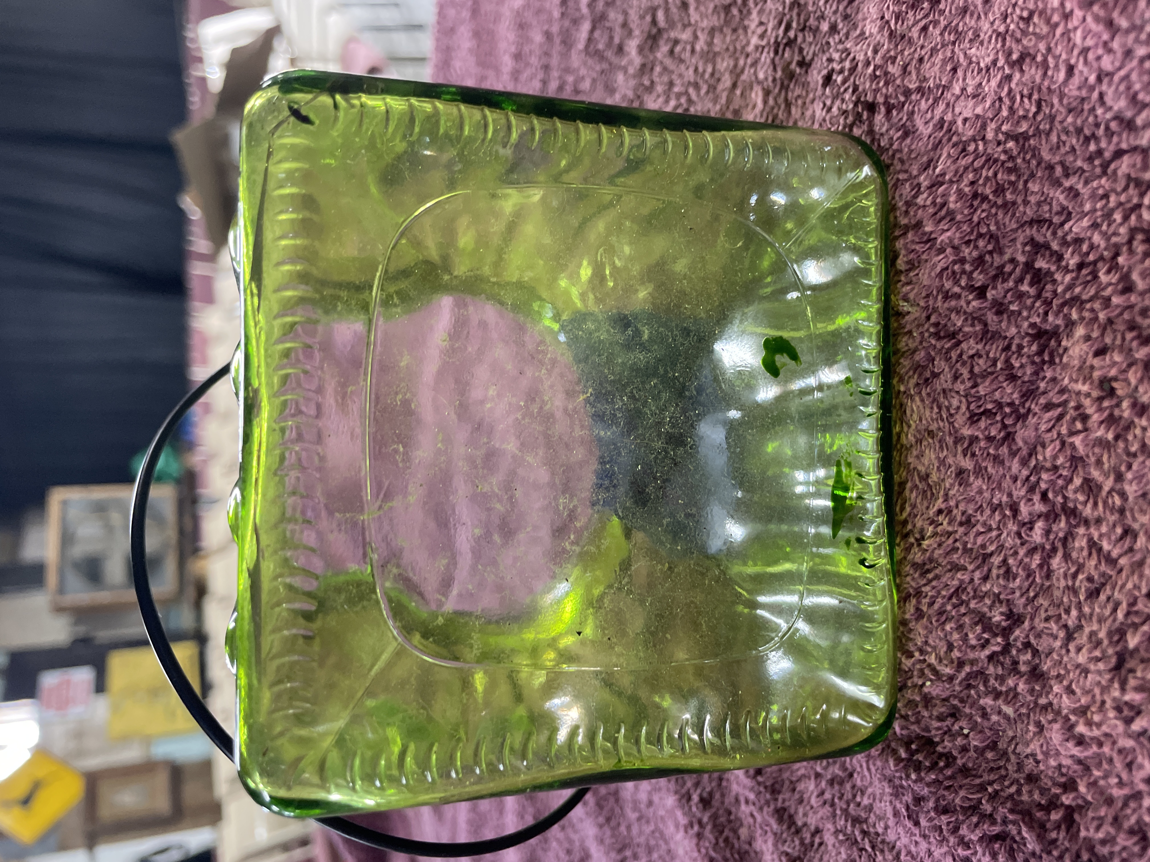 An amber sombrero-shaped ashtray inscribed South of the Border, a ruby-red Avon Somewhere cologne bottle with its stopper, and a lime-green ribbed glass lantern with a black metal handle.