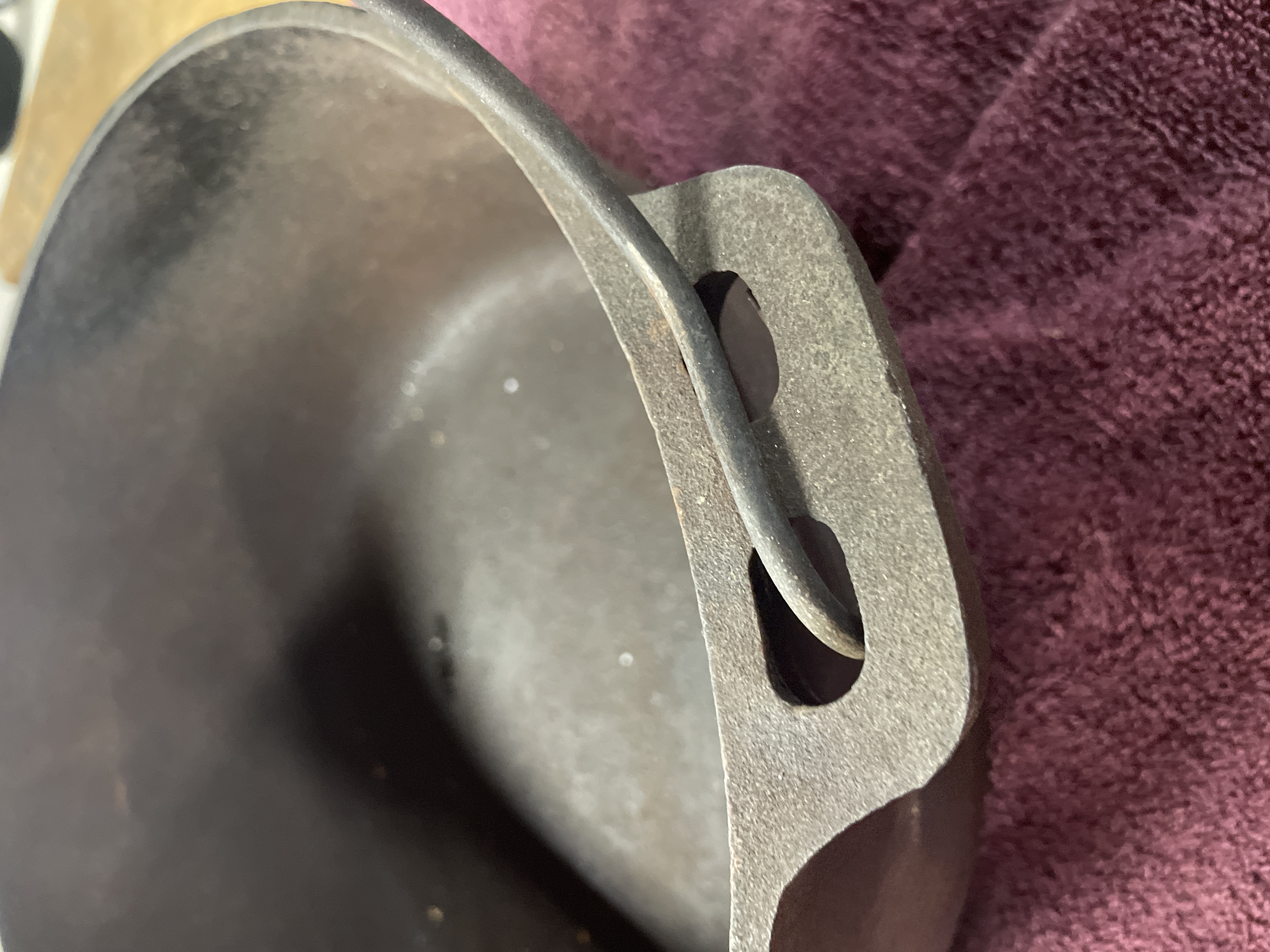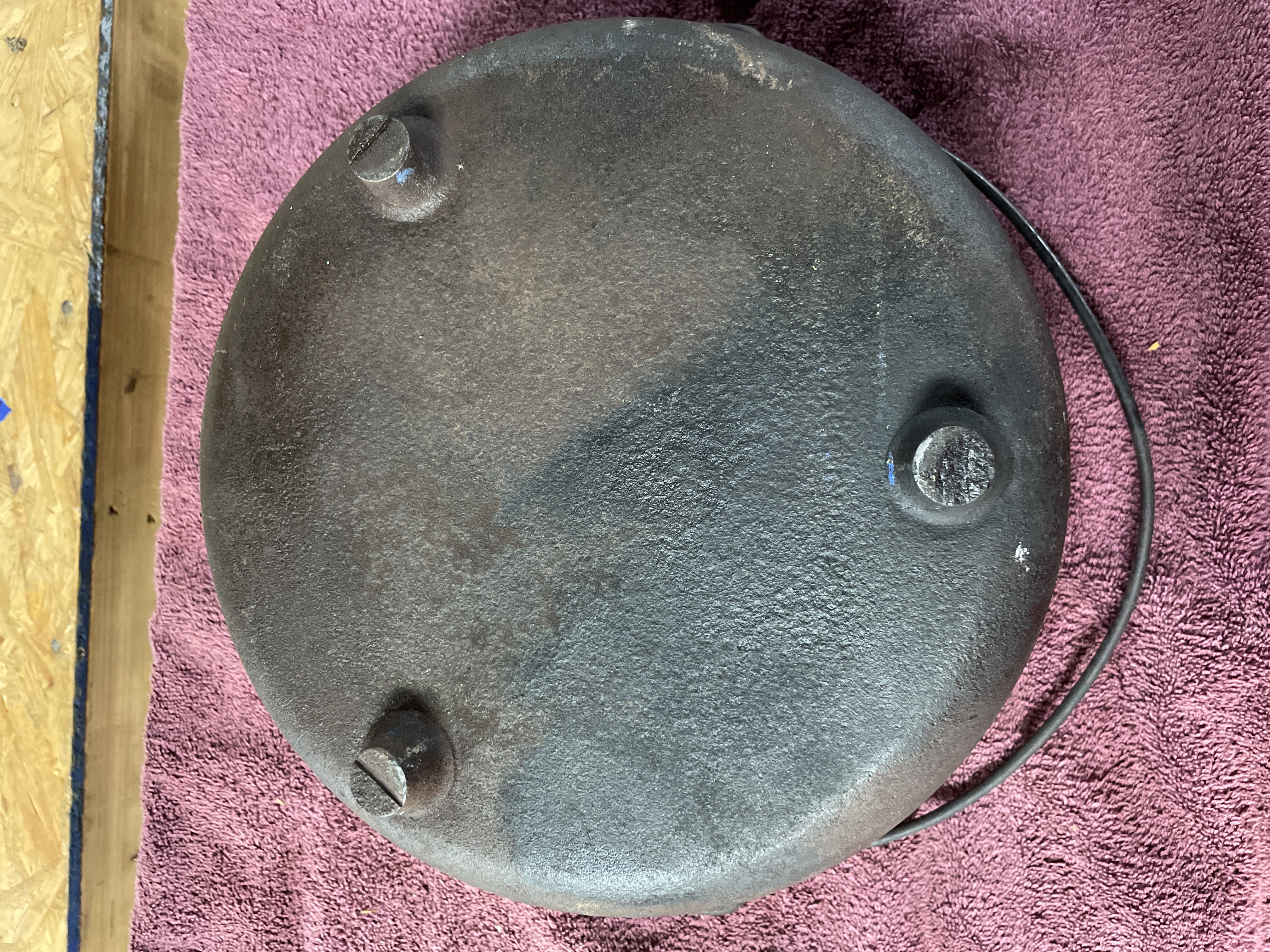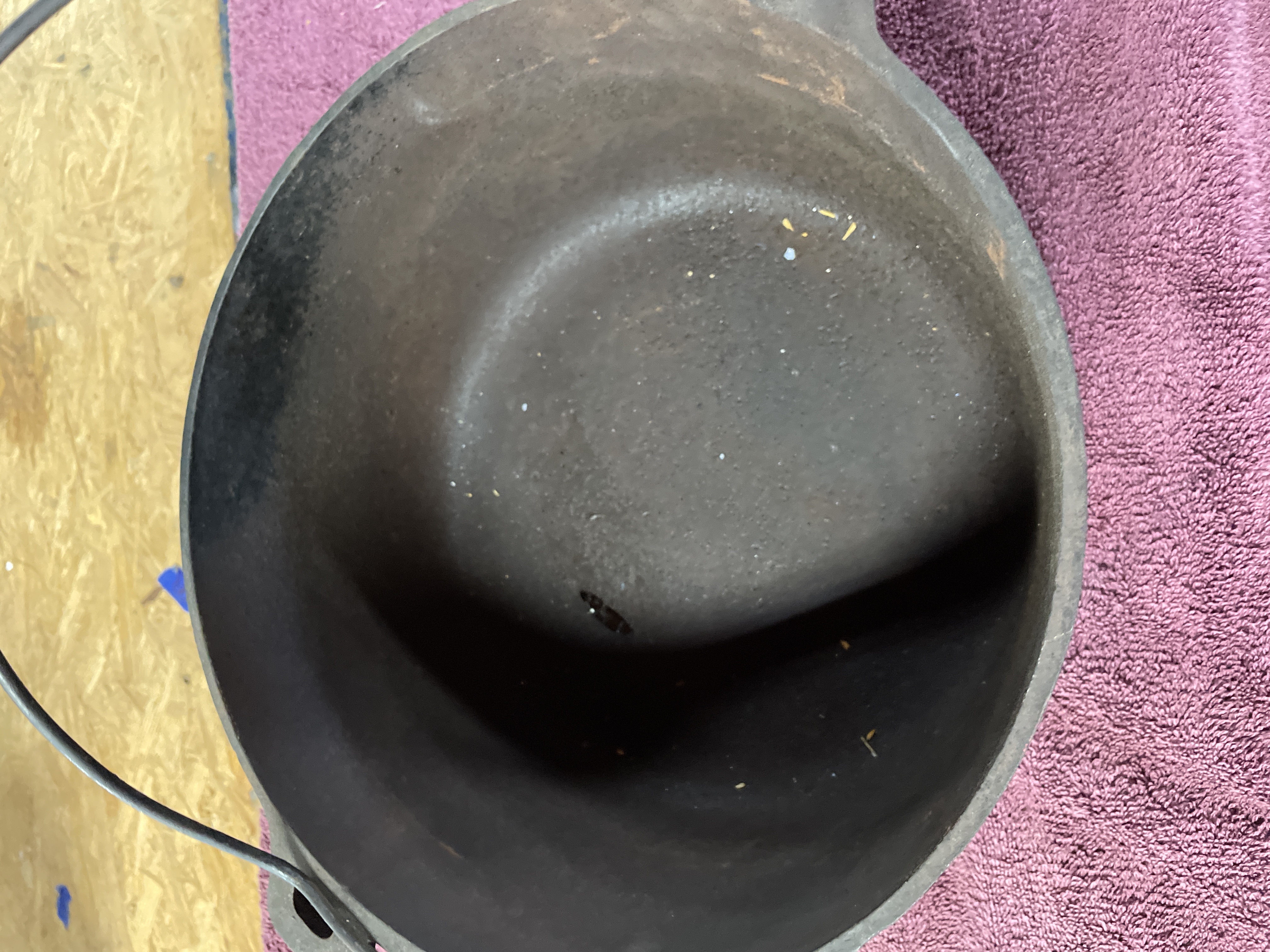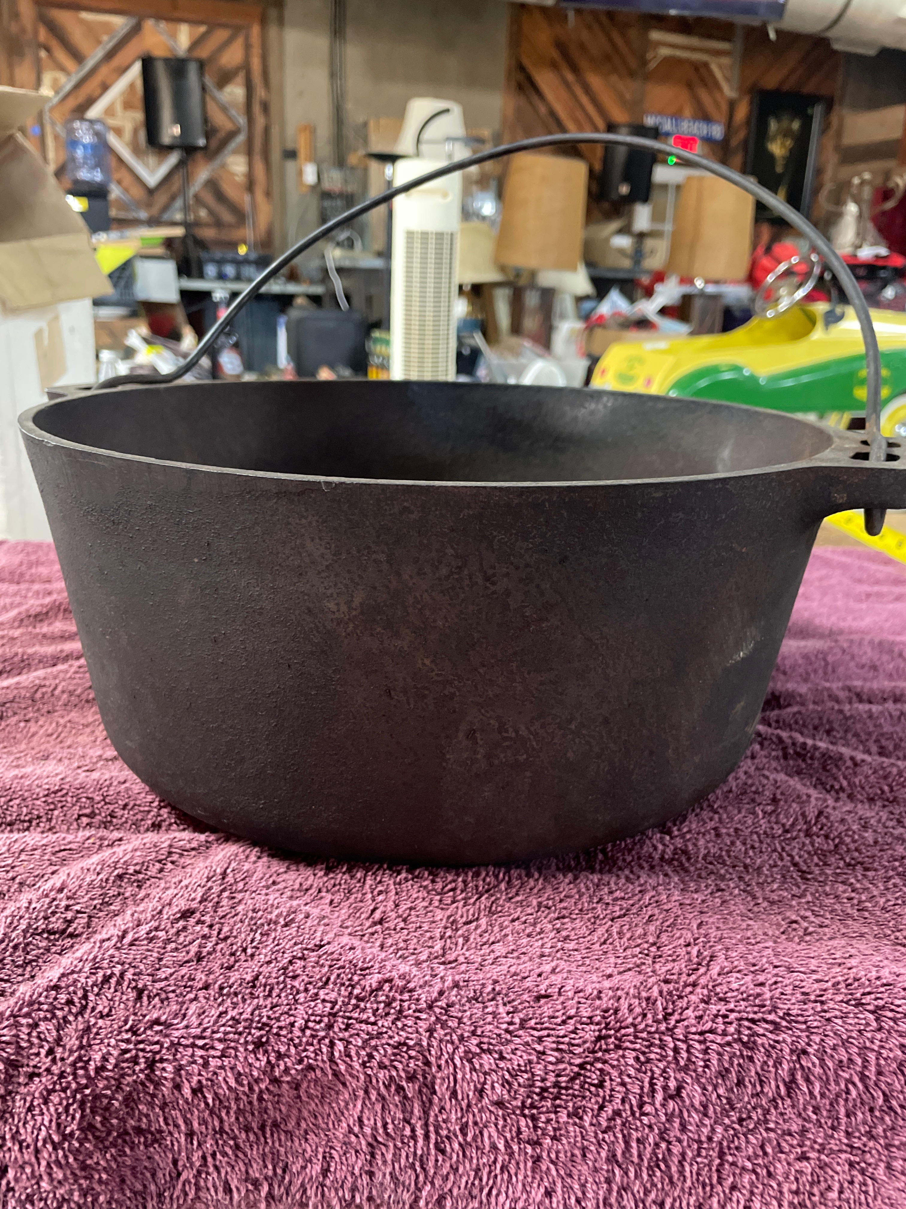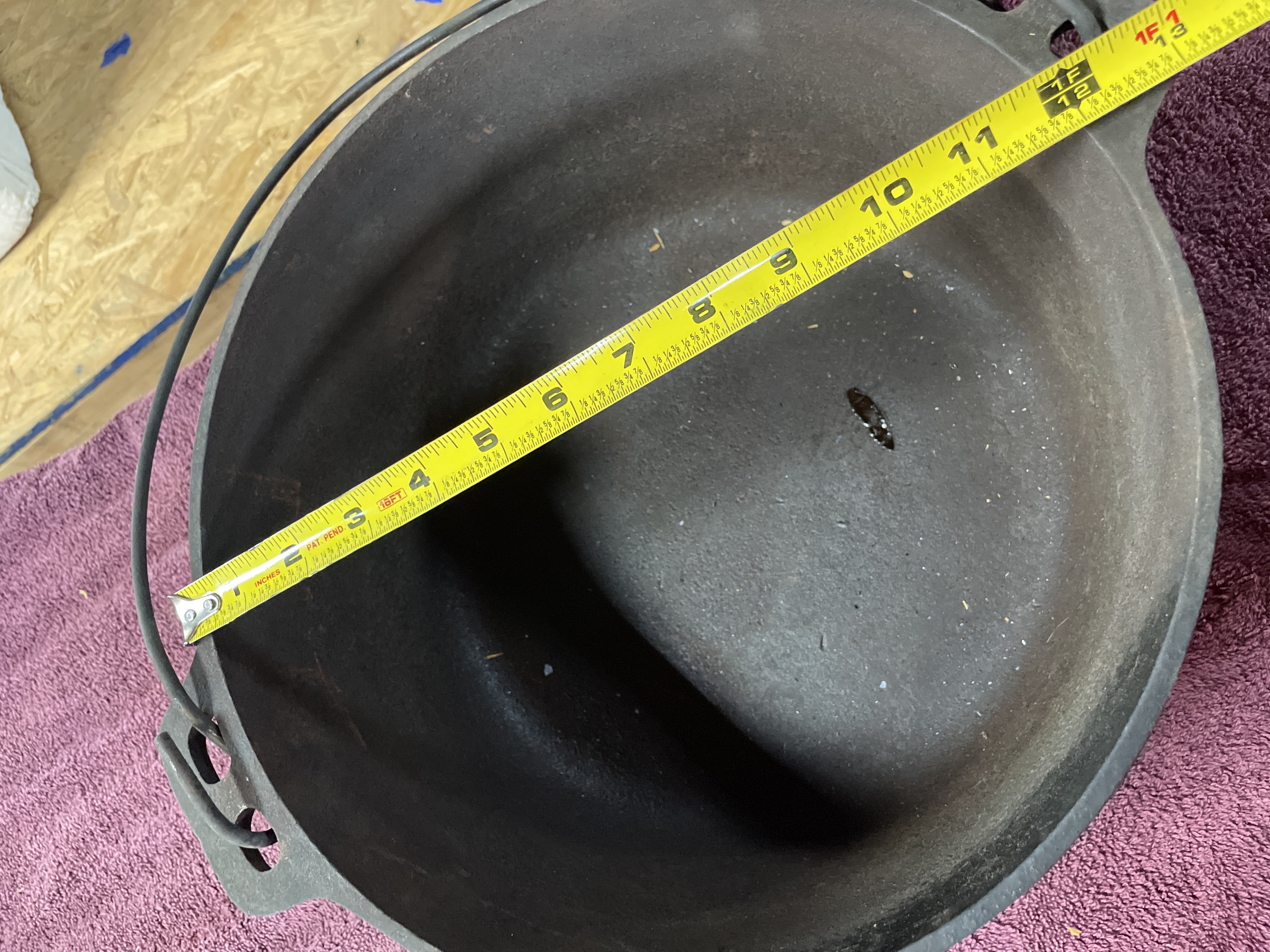 A black cast iron kettle featuring a wire bail handle and three small feet on the underside, measuring approximately 11.5 inches in diameter.