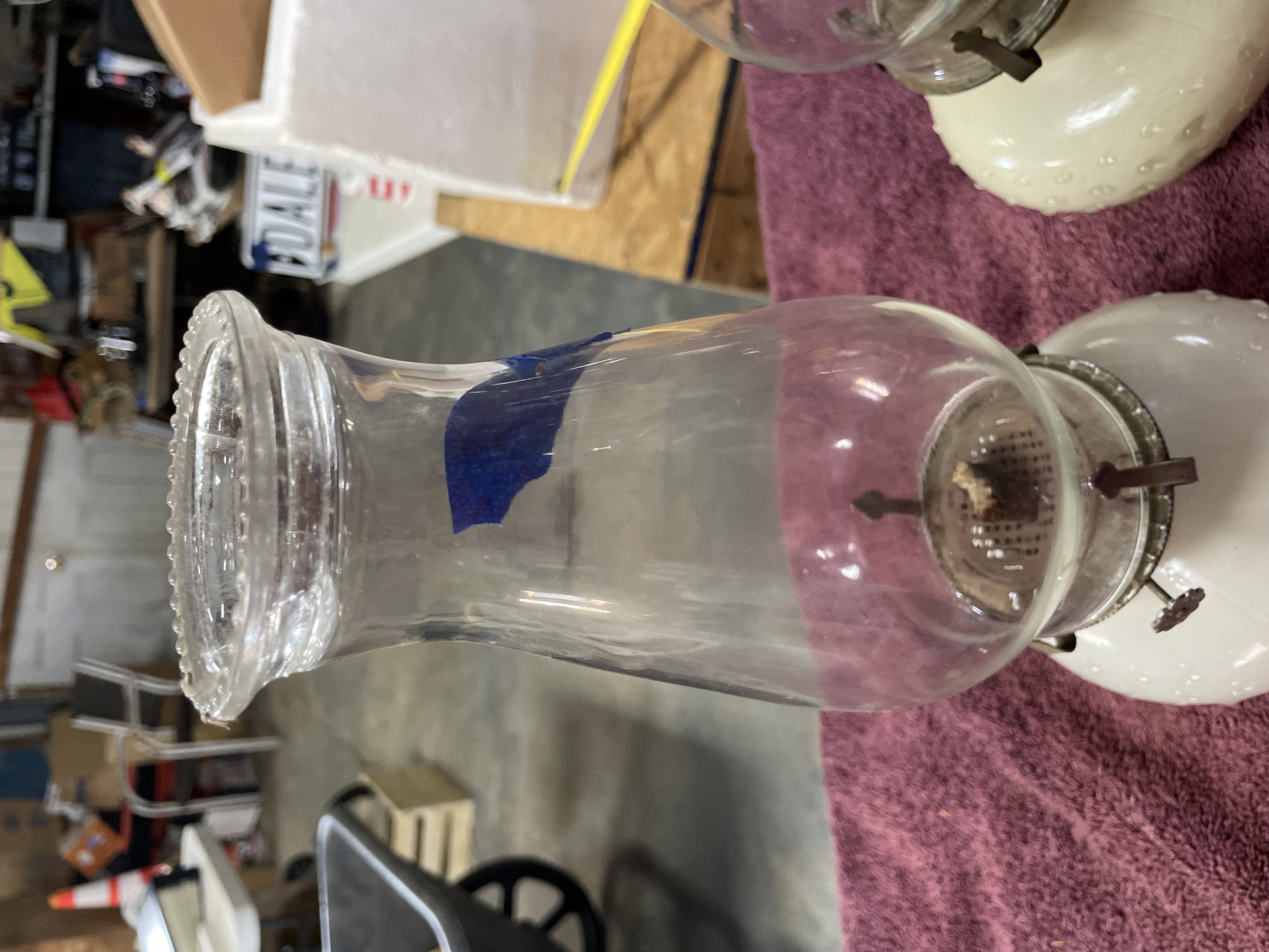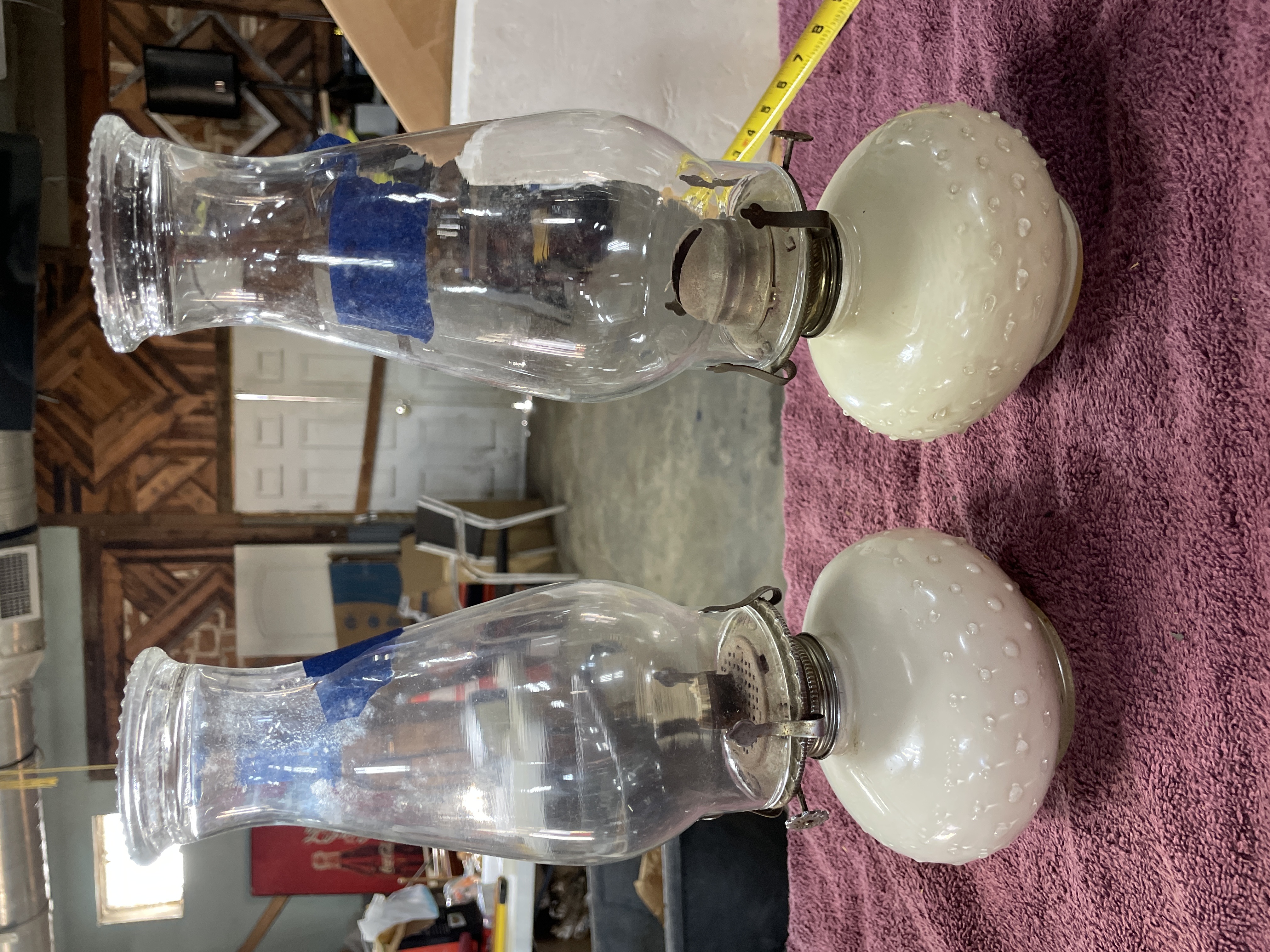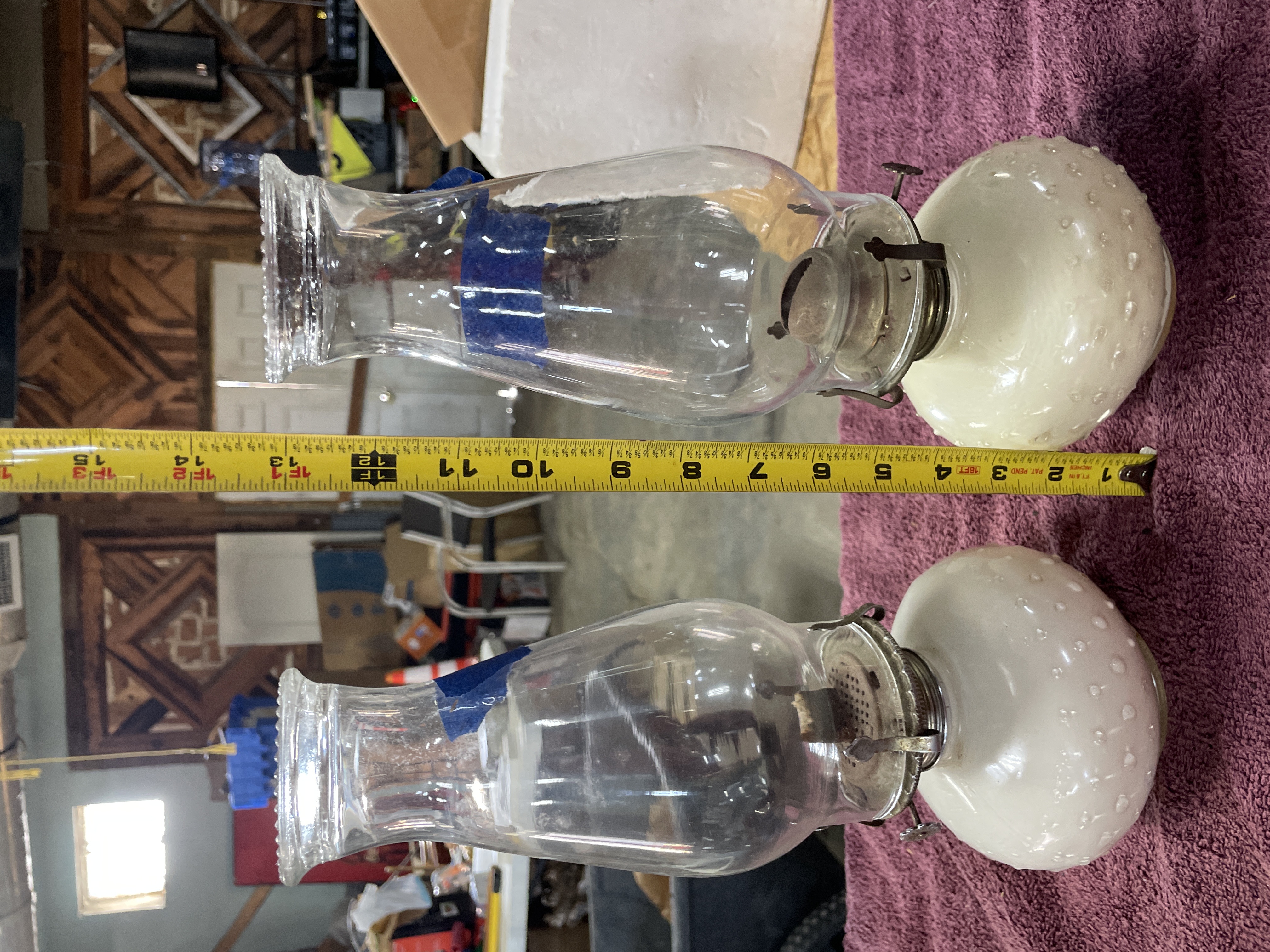 A pair of oil lamps featuring clear glass chimneys and white hobnail glass bases with metal burner assemblies, measuring approximately 12 inches in height.