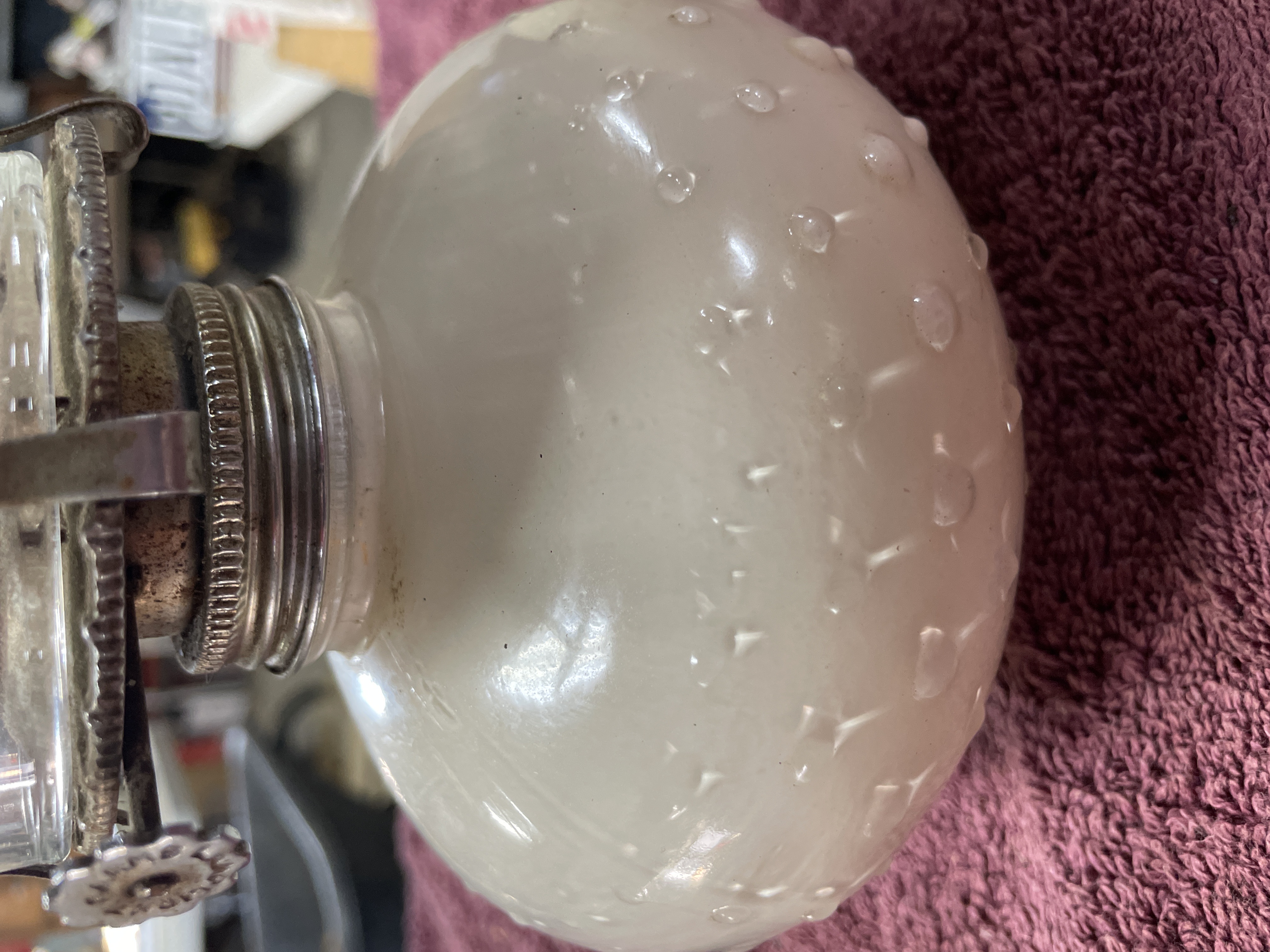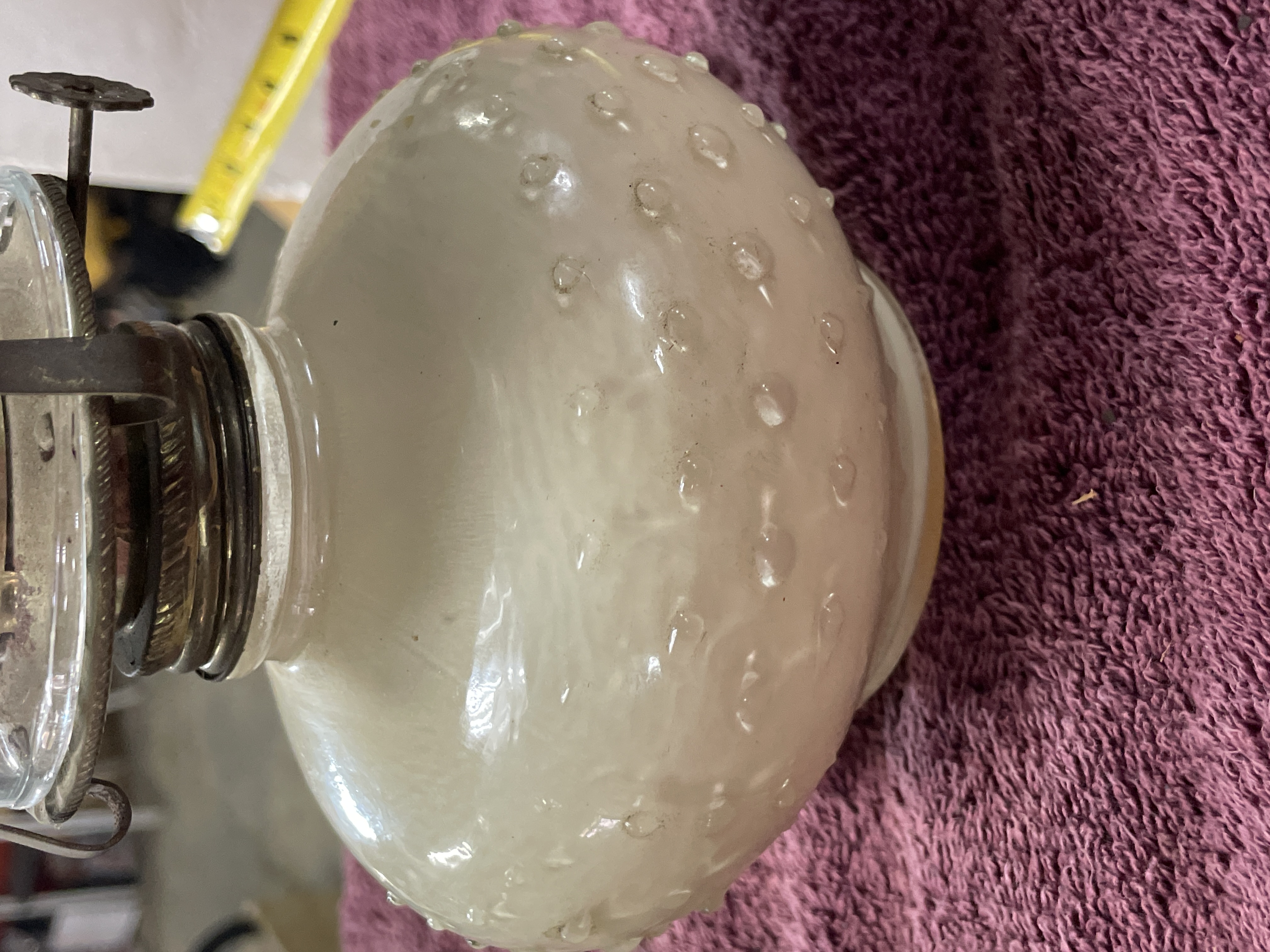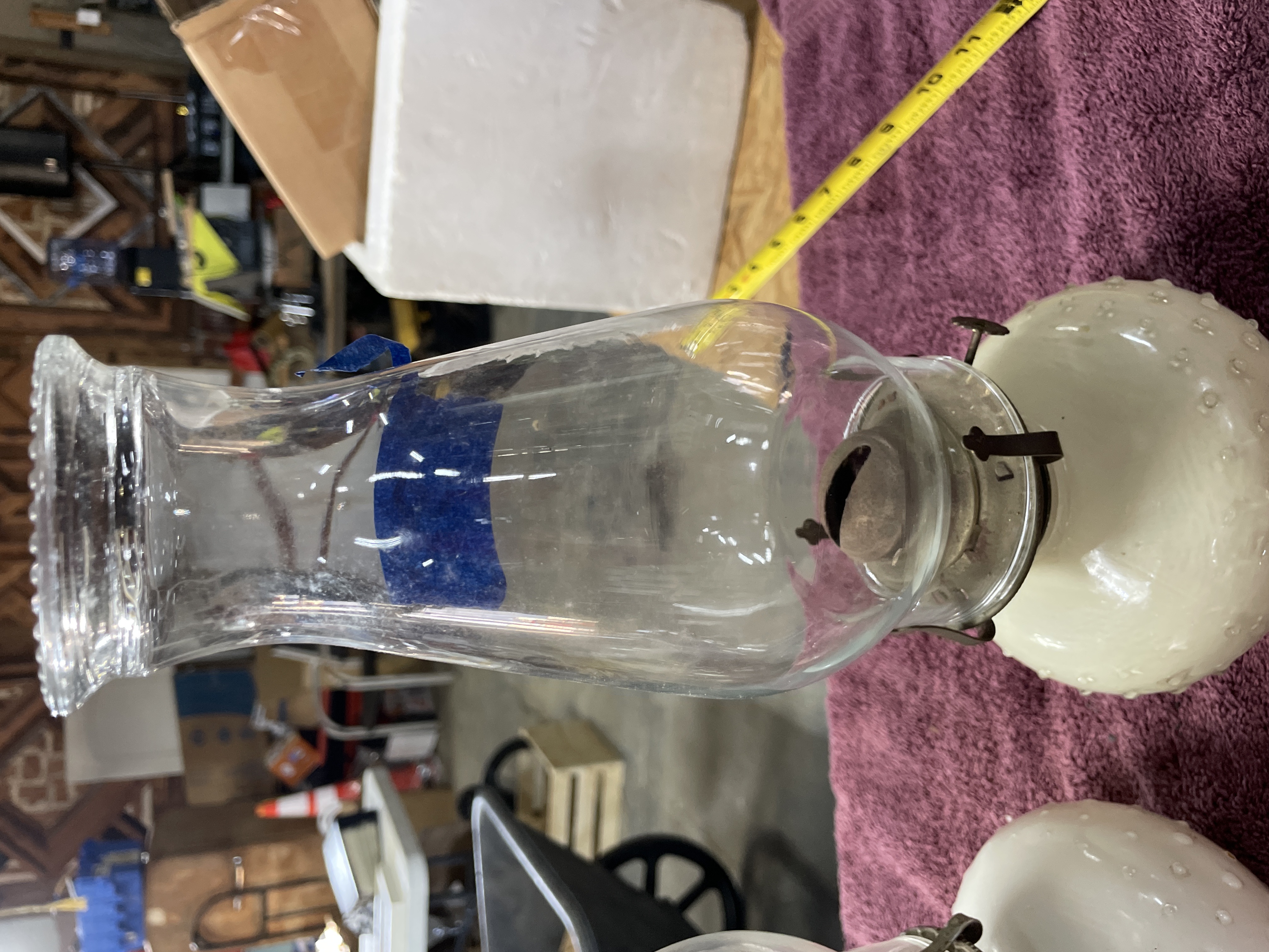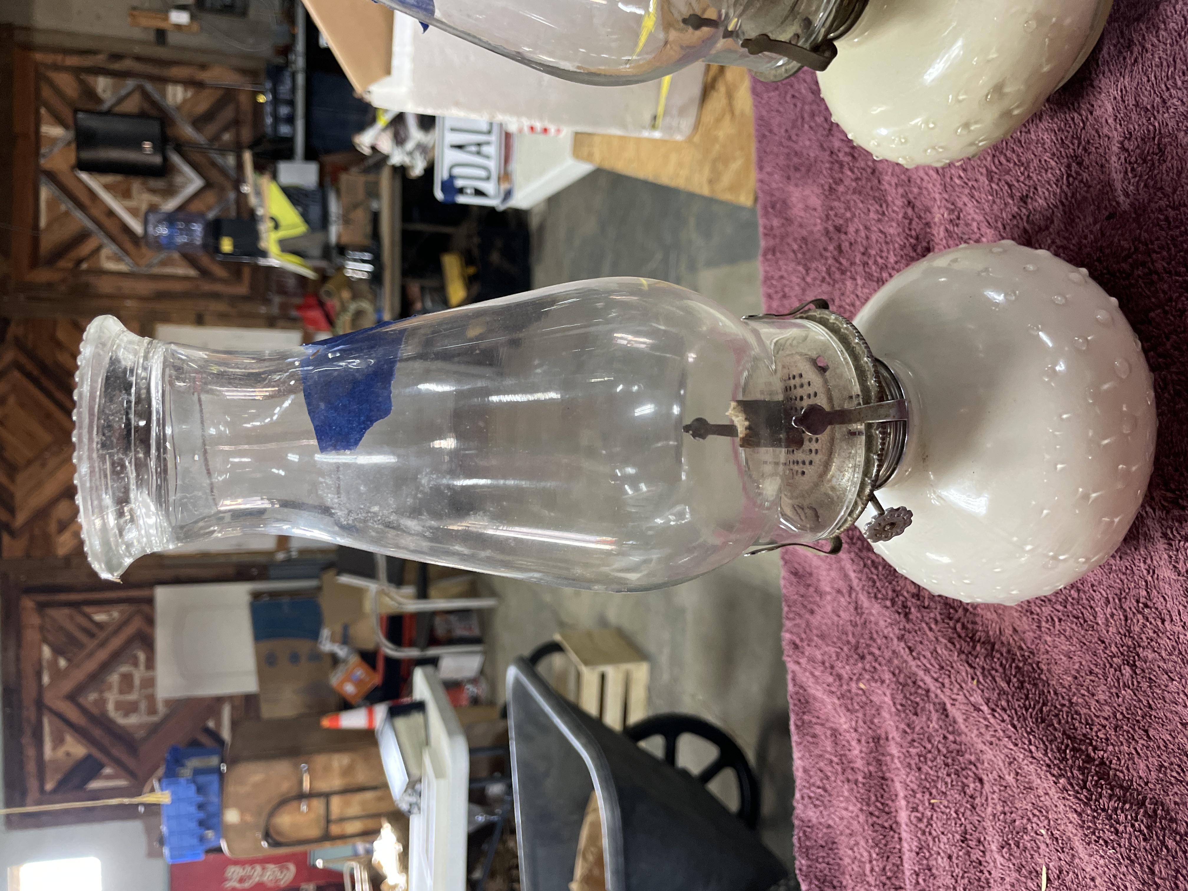A pair of oil lamps featuring clear glass chimneys and white hobnail glass bases with metal burner assemblies, measuring approximately 12 inches in height.