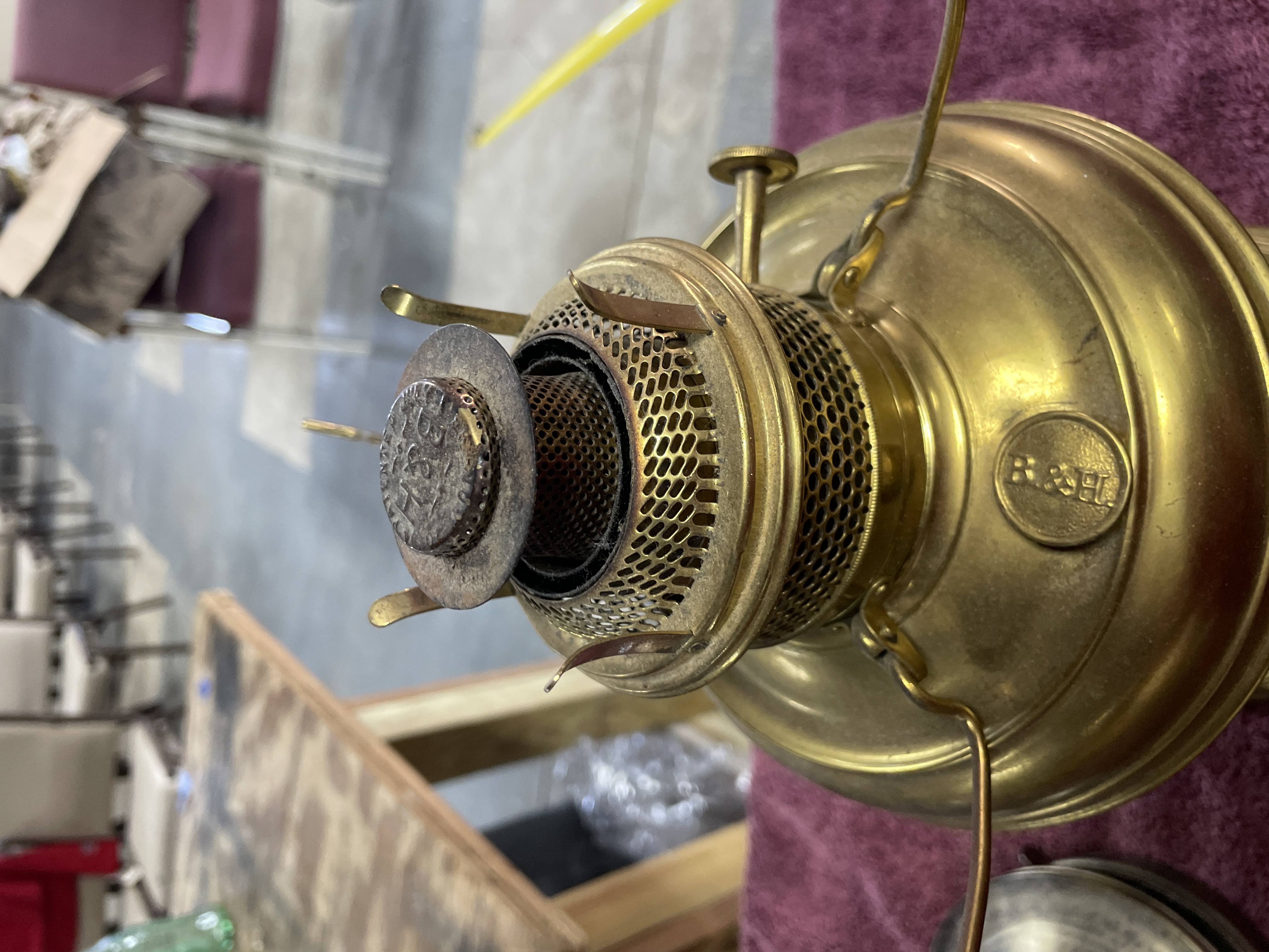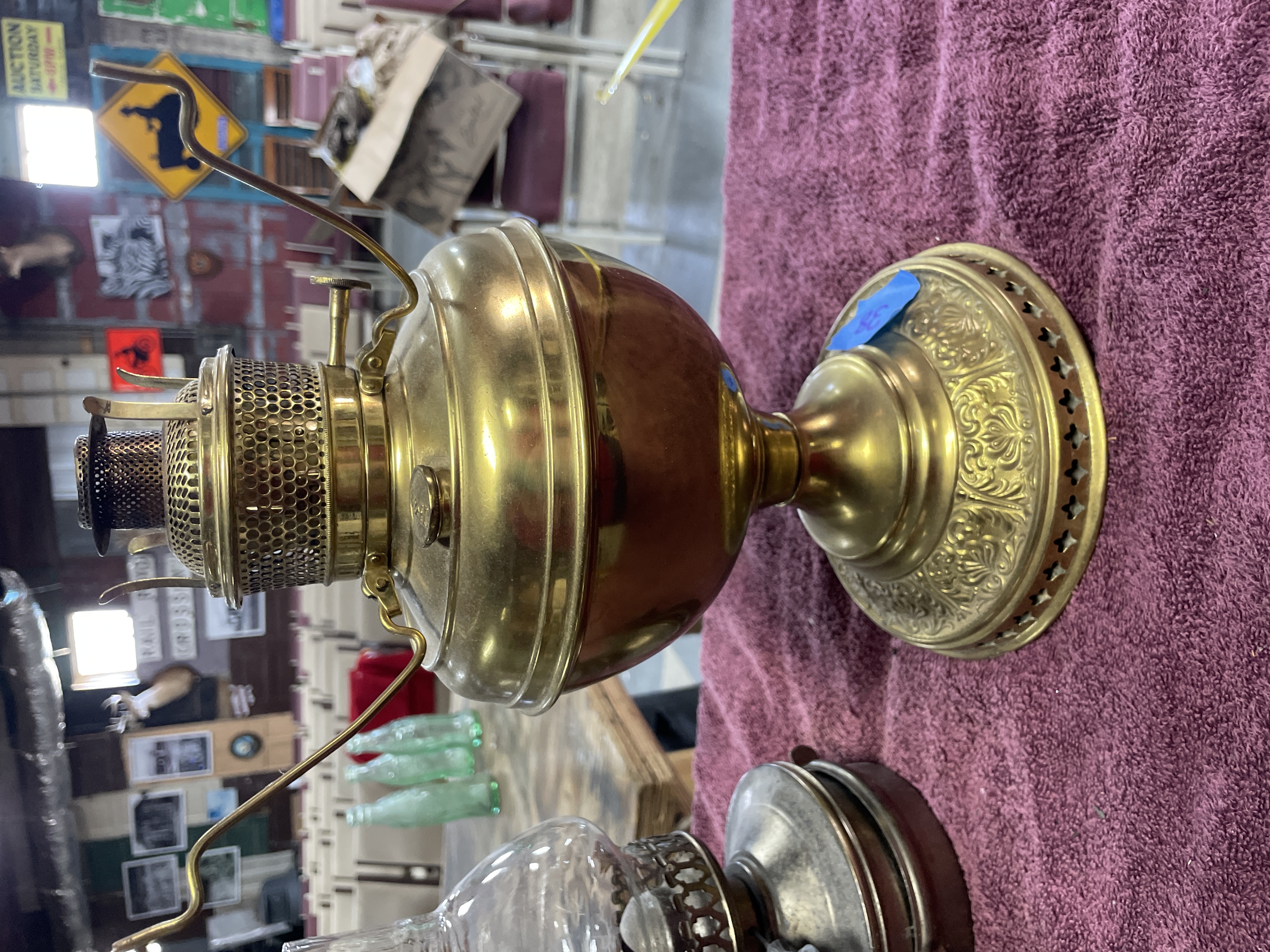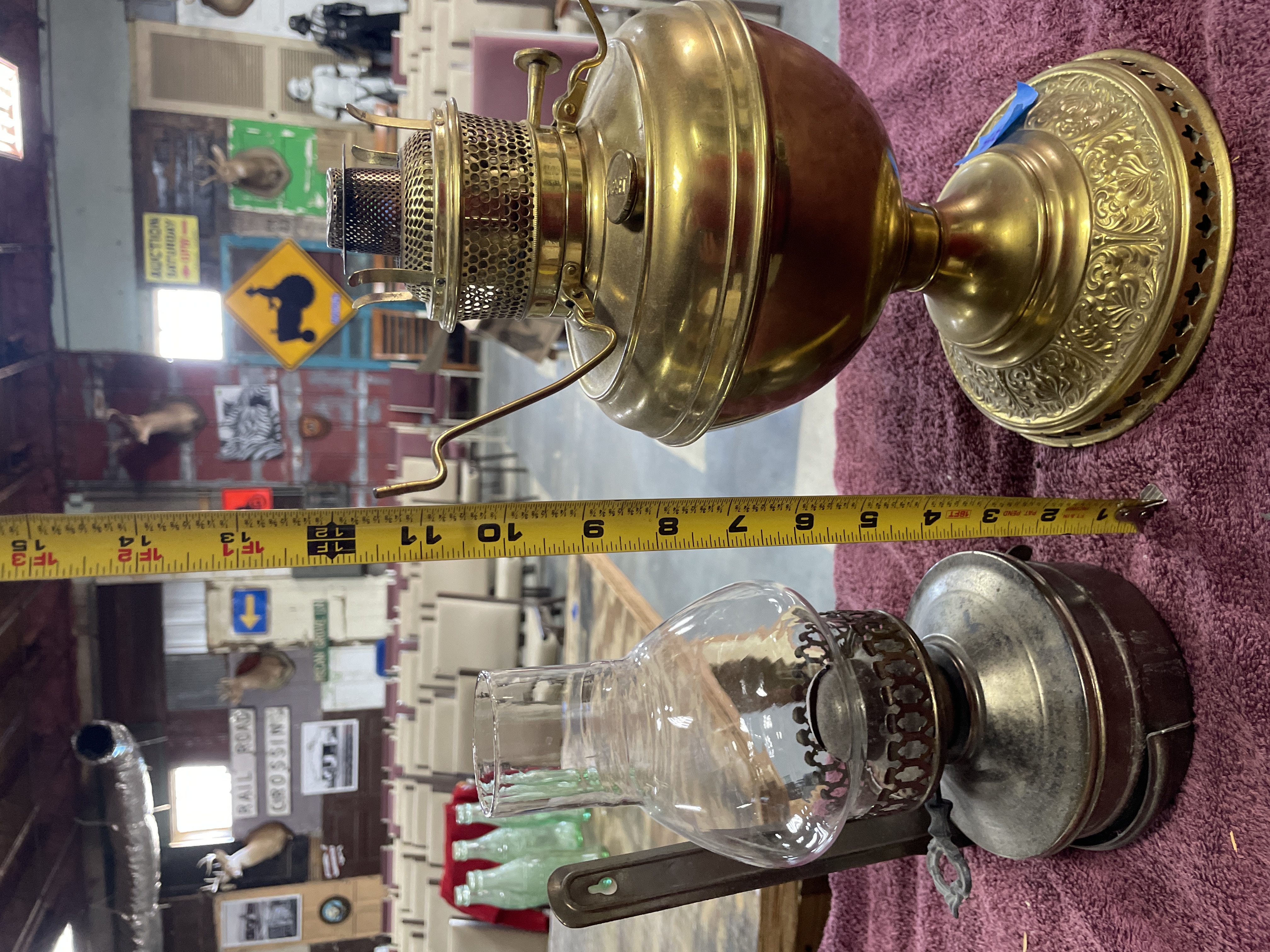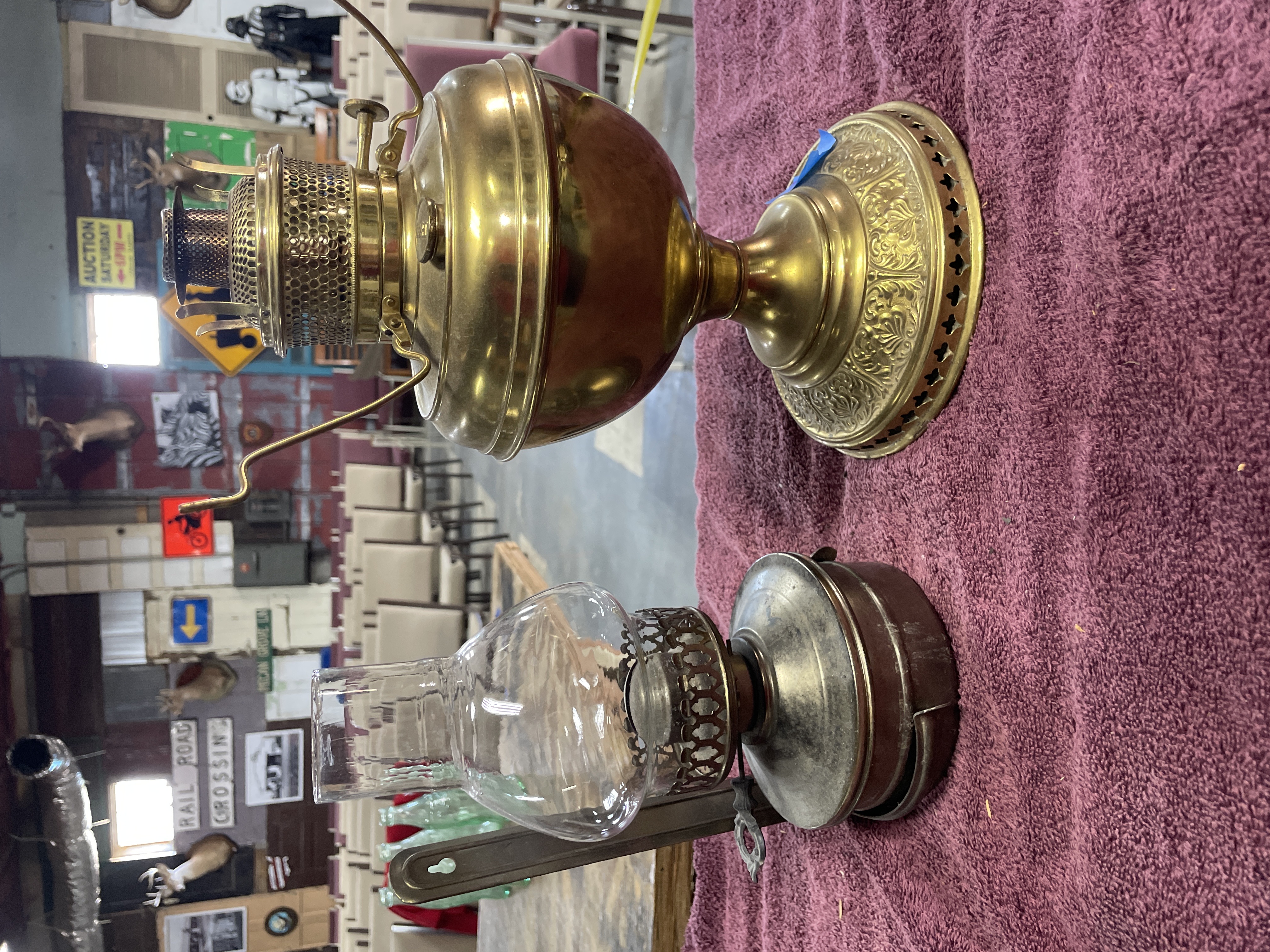 Two oil lamps including a large brass and copper lamp marked B. and H. and New Rochester Pat. Aug 27 95 measuring approximately 11 inches tall and a smaller silver-toned metal lamp with a clear glass chimney measuring approximately 9 inches tall.
