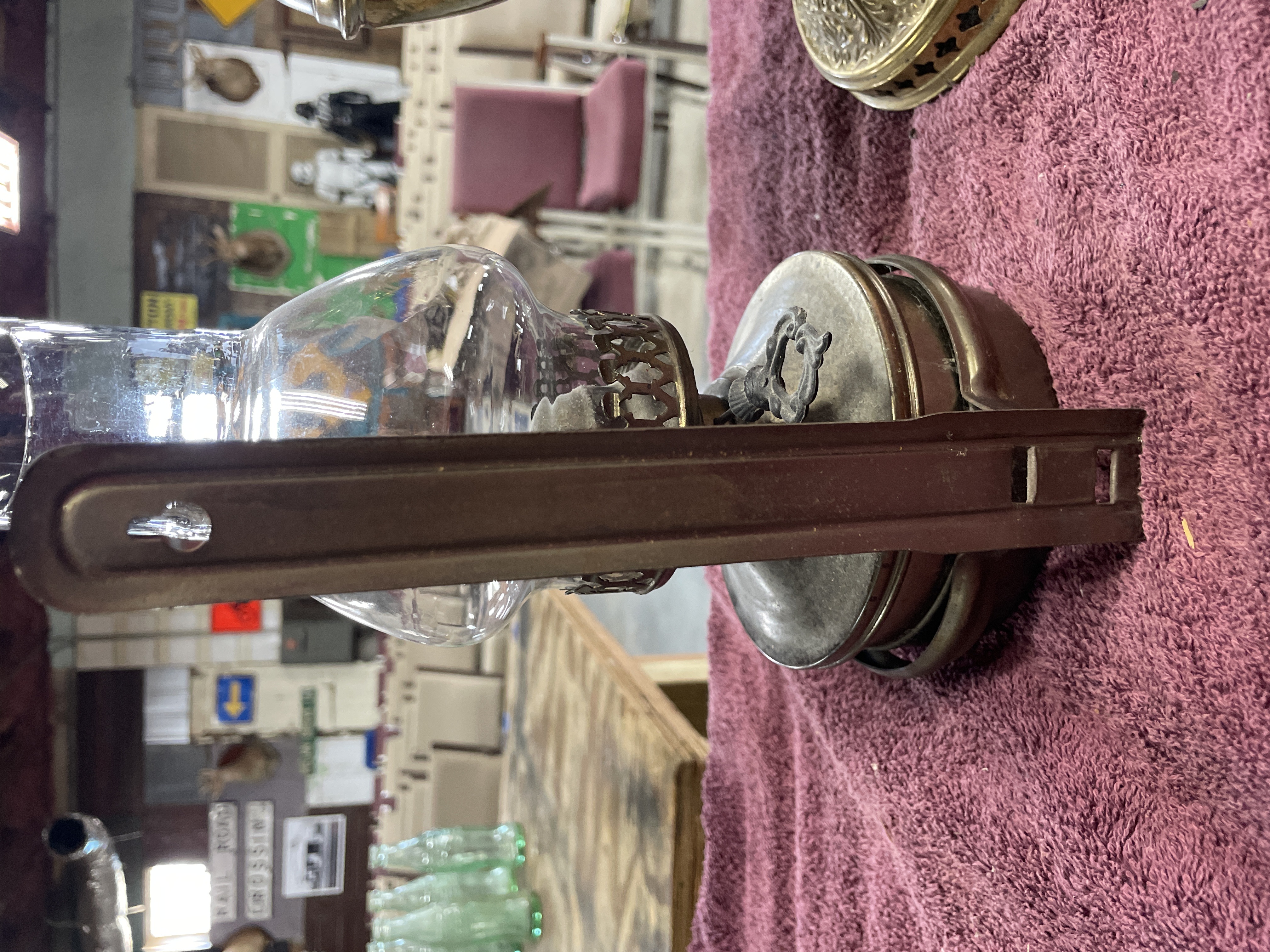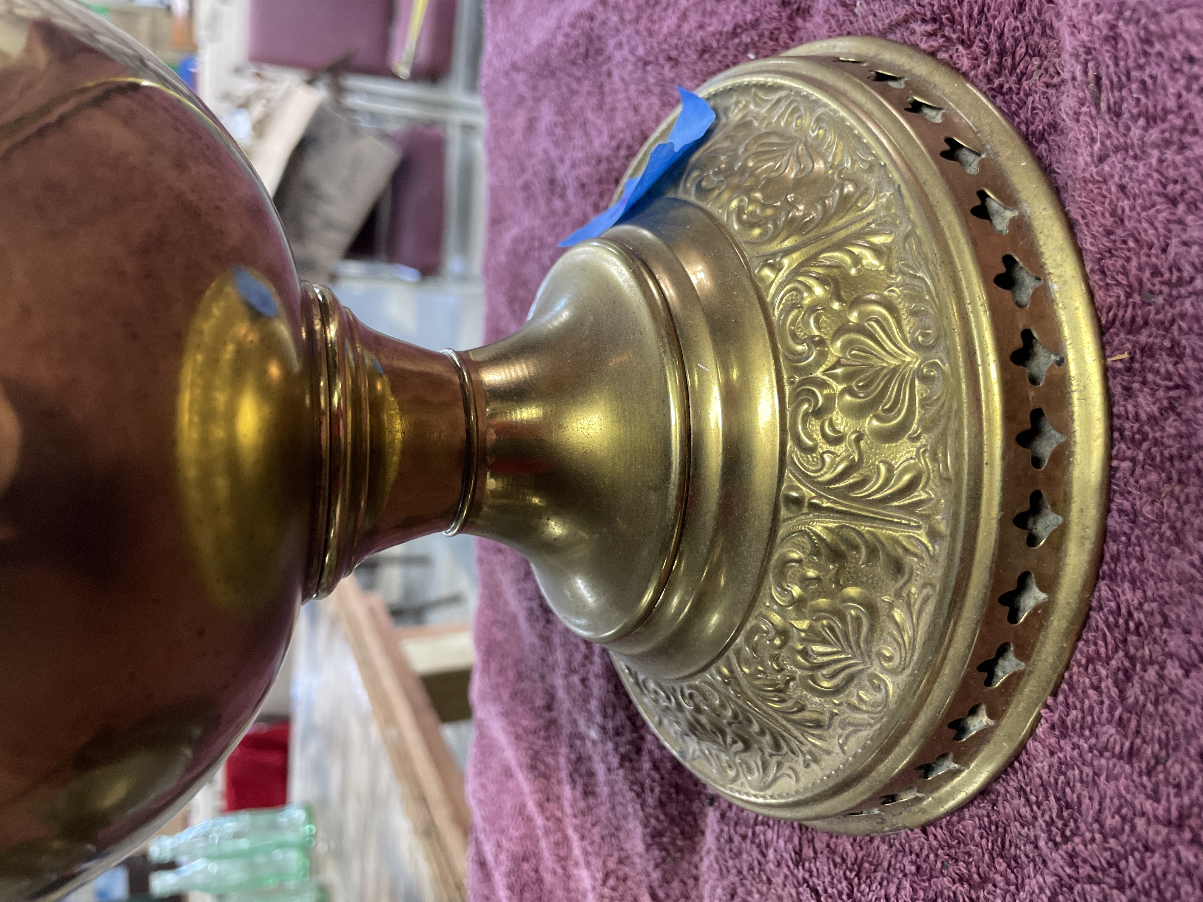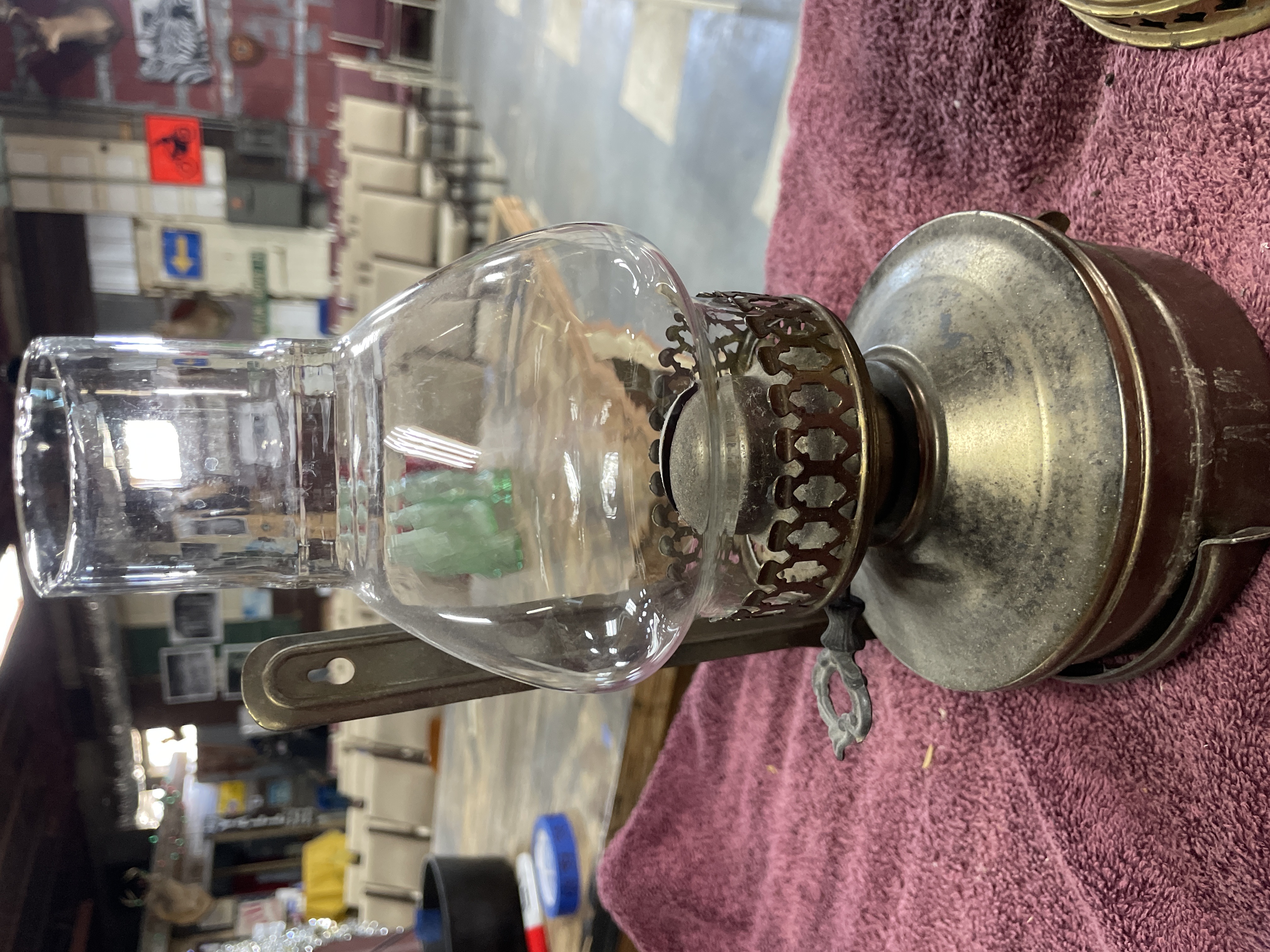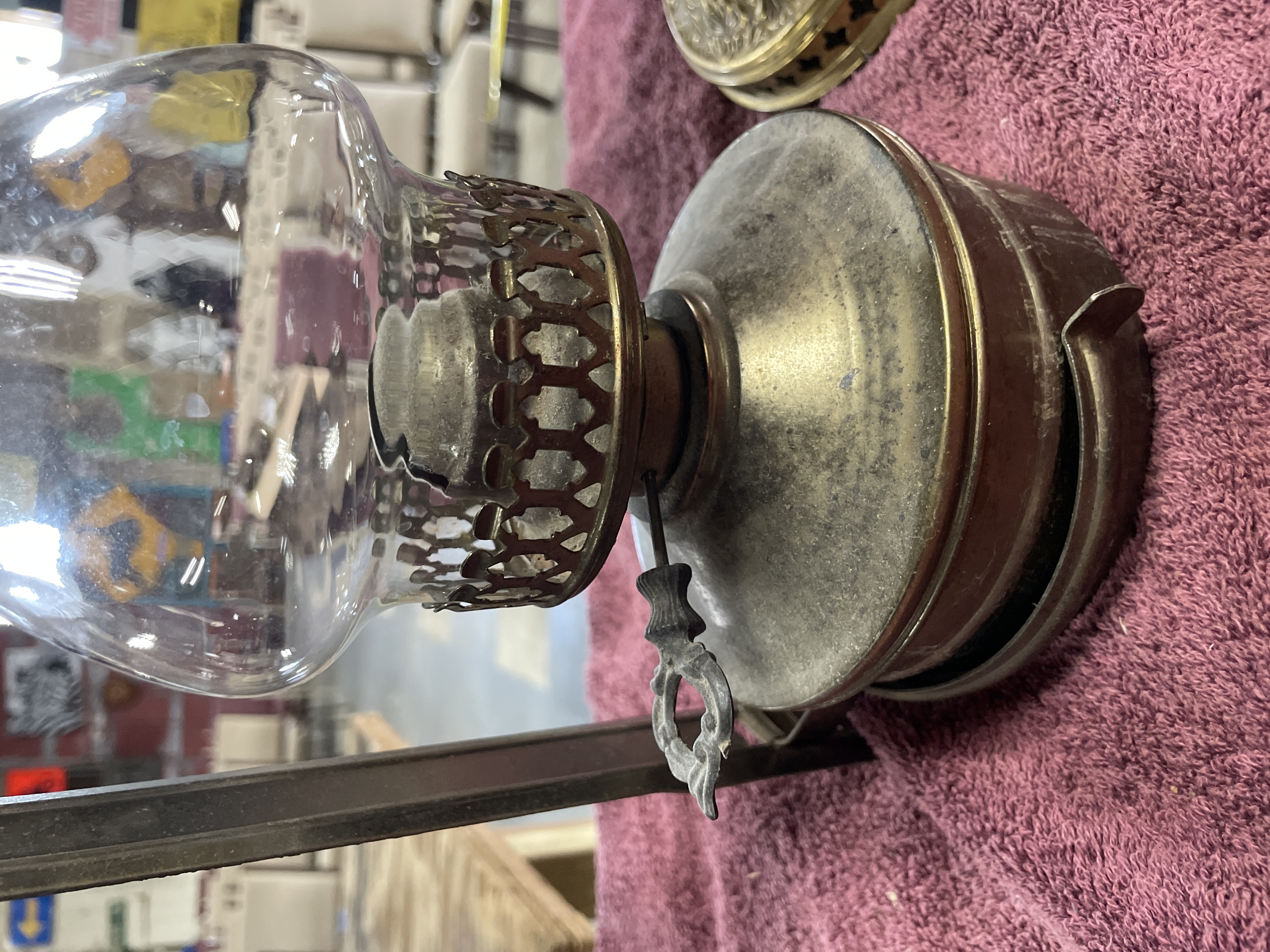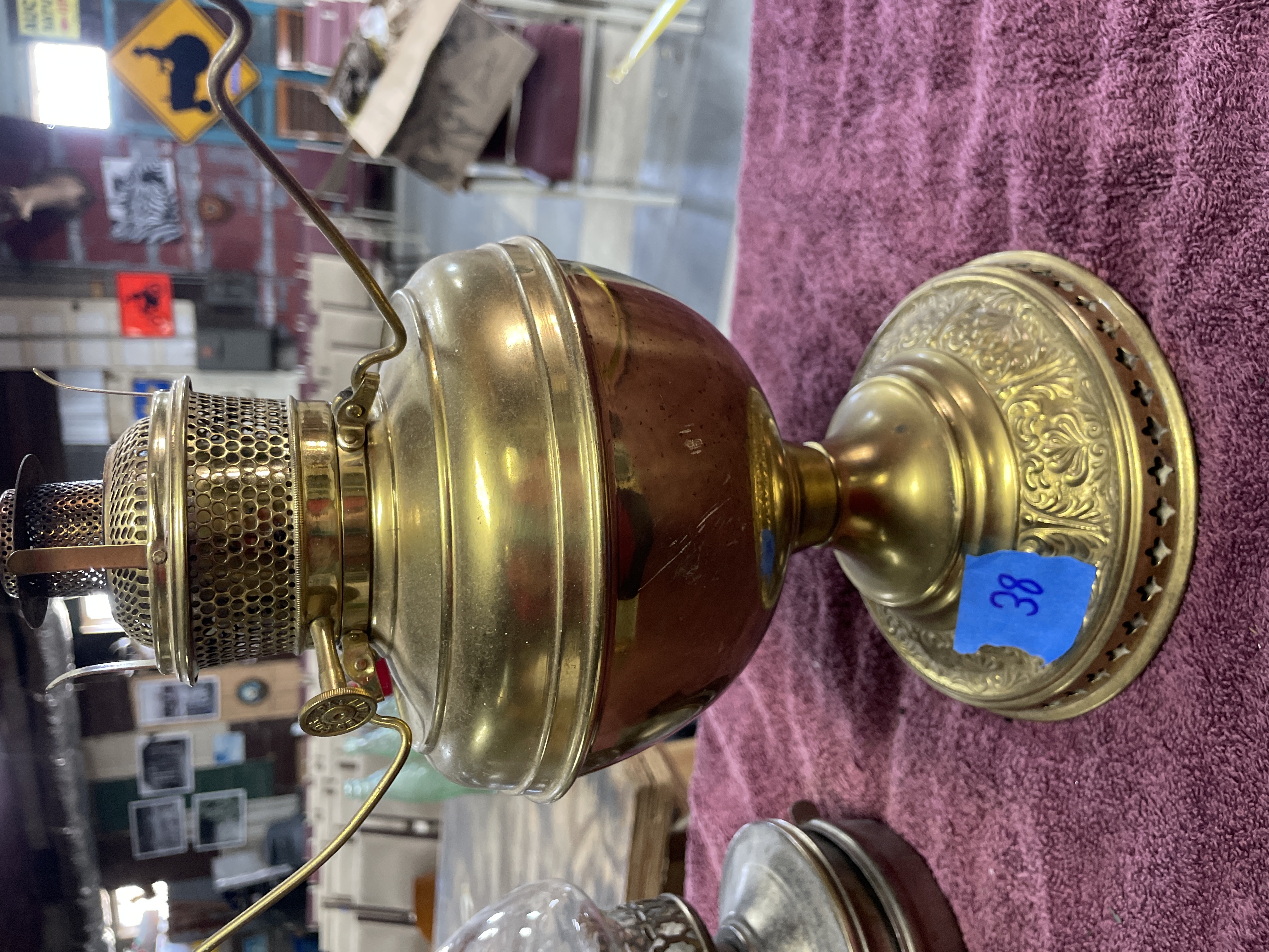 Two oil lamps including a large brass and copper lamp marked B. and H. and New Rochester Pat. Aug 27 95 measuring approximately 11 inches tall and a smaller silver-toned metal lamp with a clear glass chimney measuring approximately 9 inches tall.