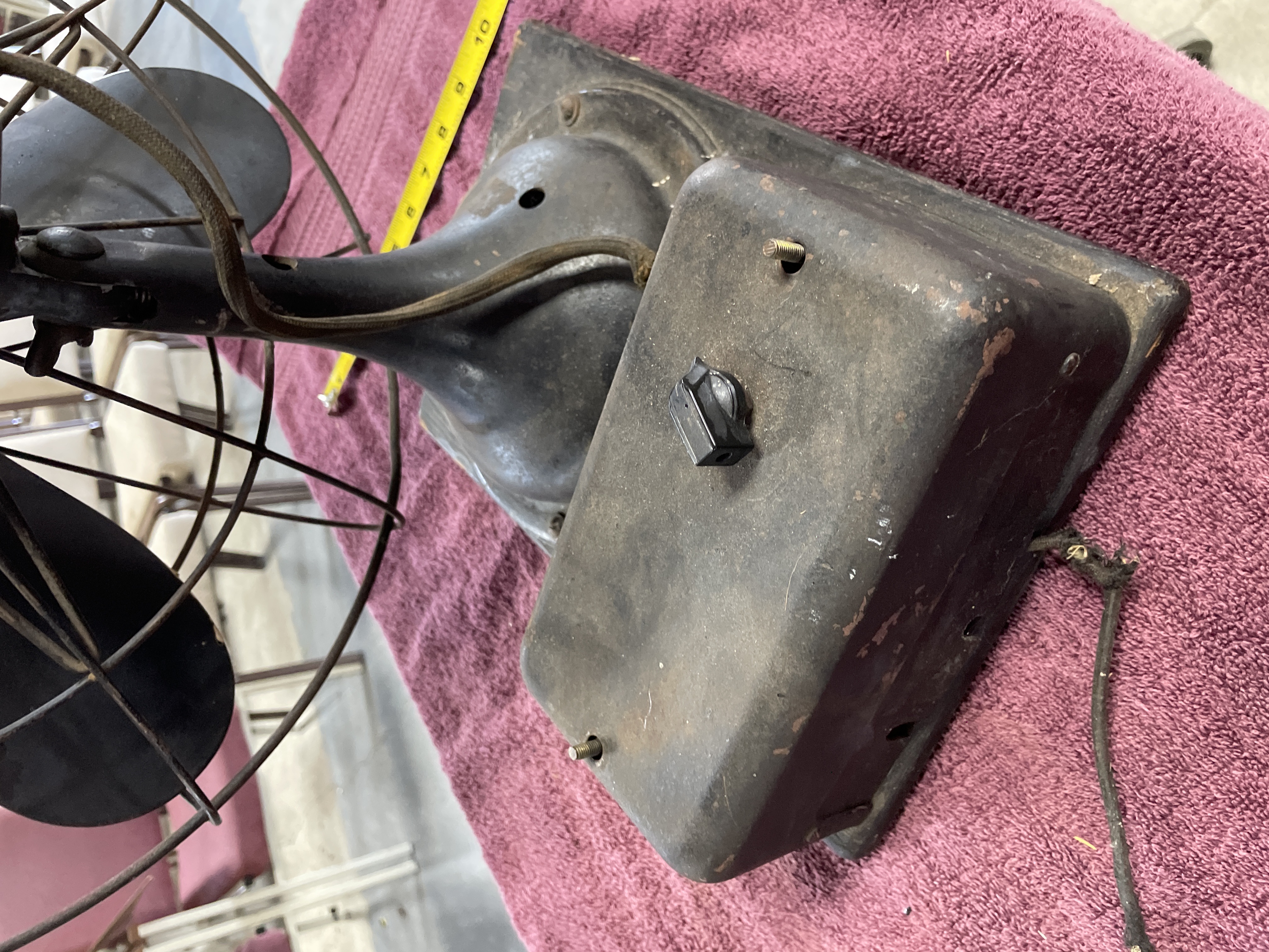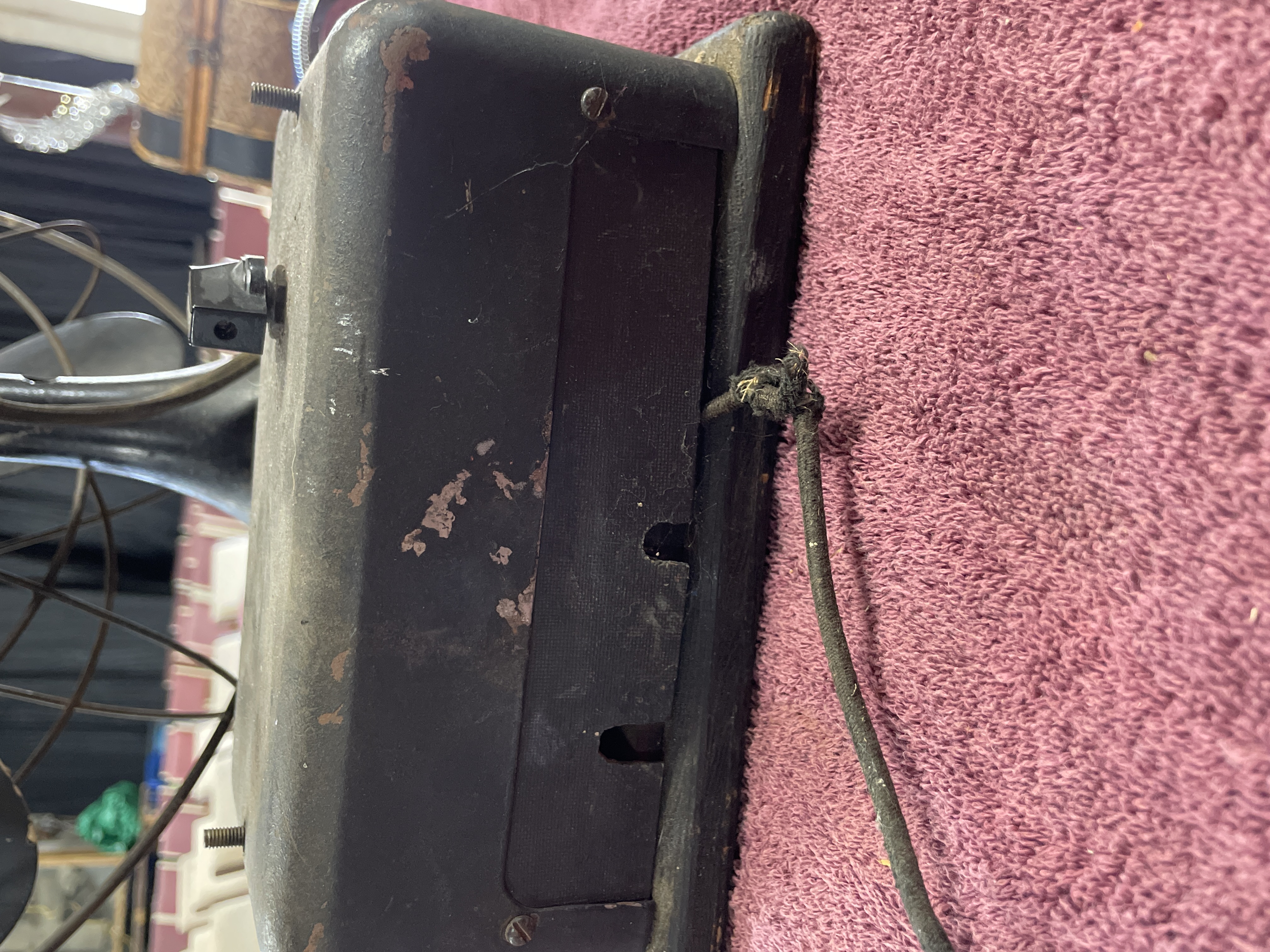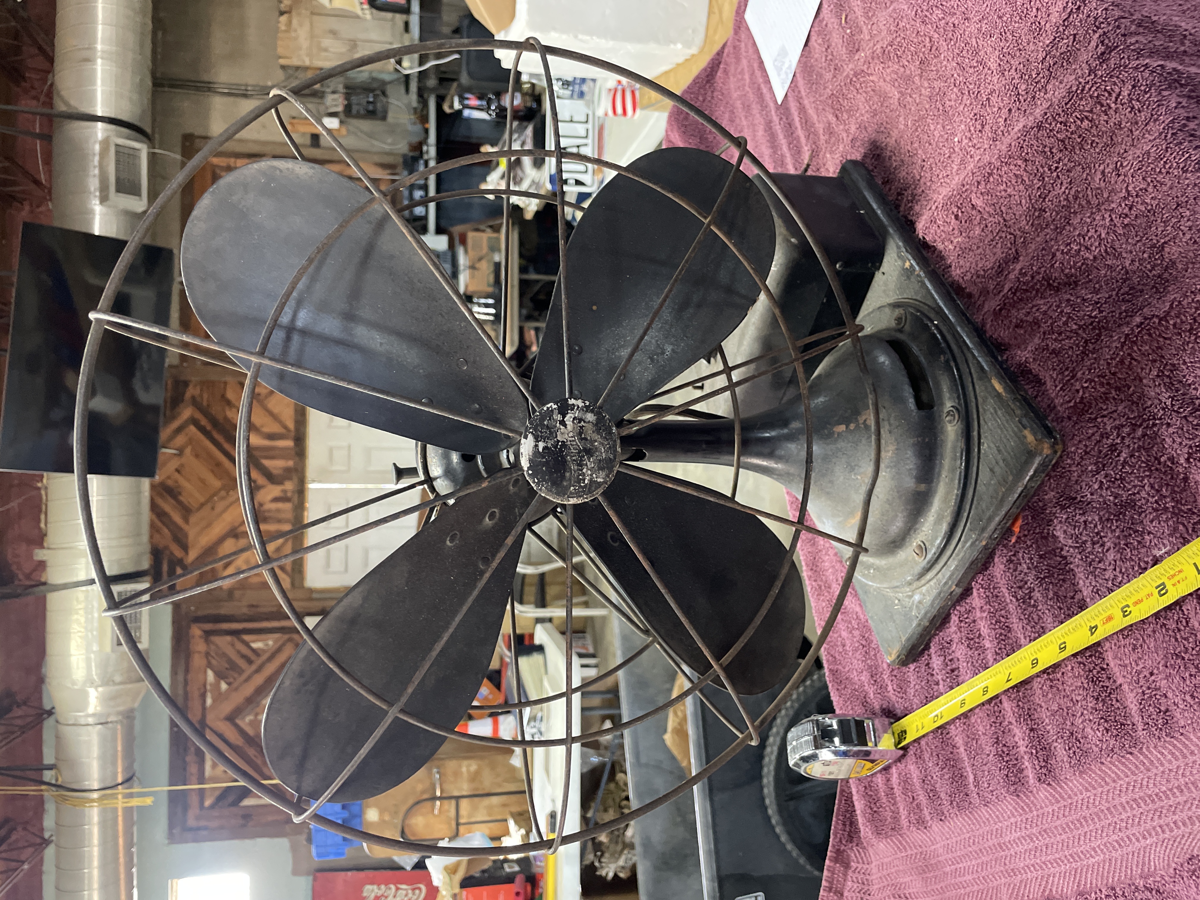 A black metal electric fan with four blades and a wire cage measuring approximately 12 inches in diameter mounted on a rectangular wooden and metal base. Needs new cord