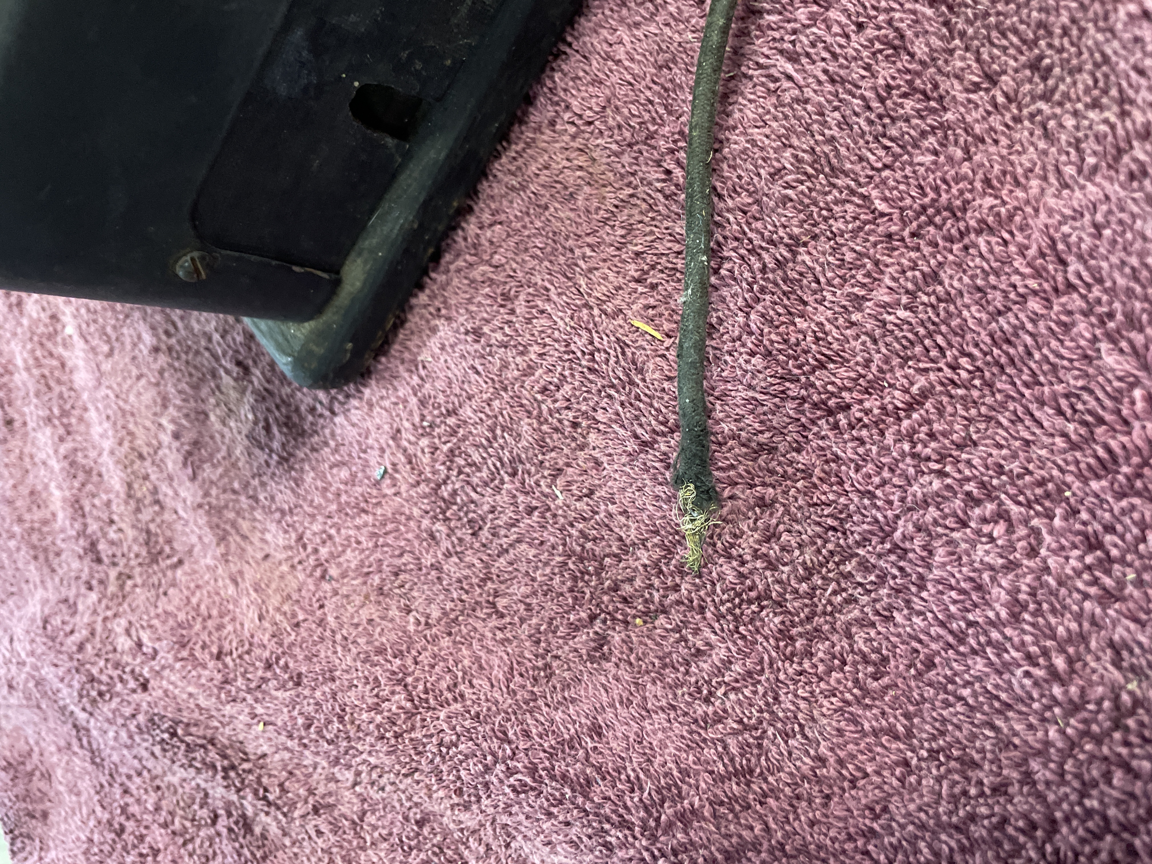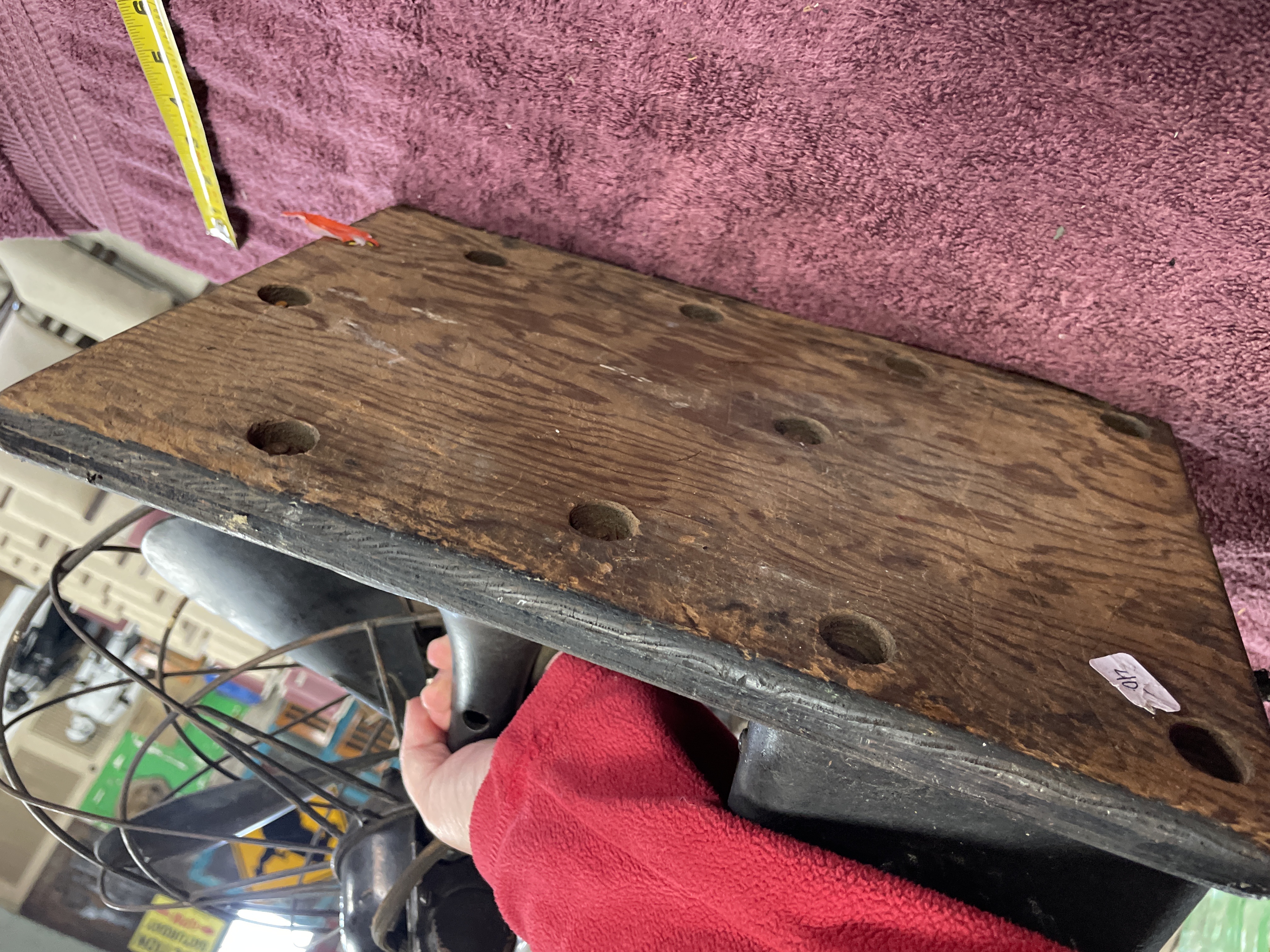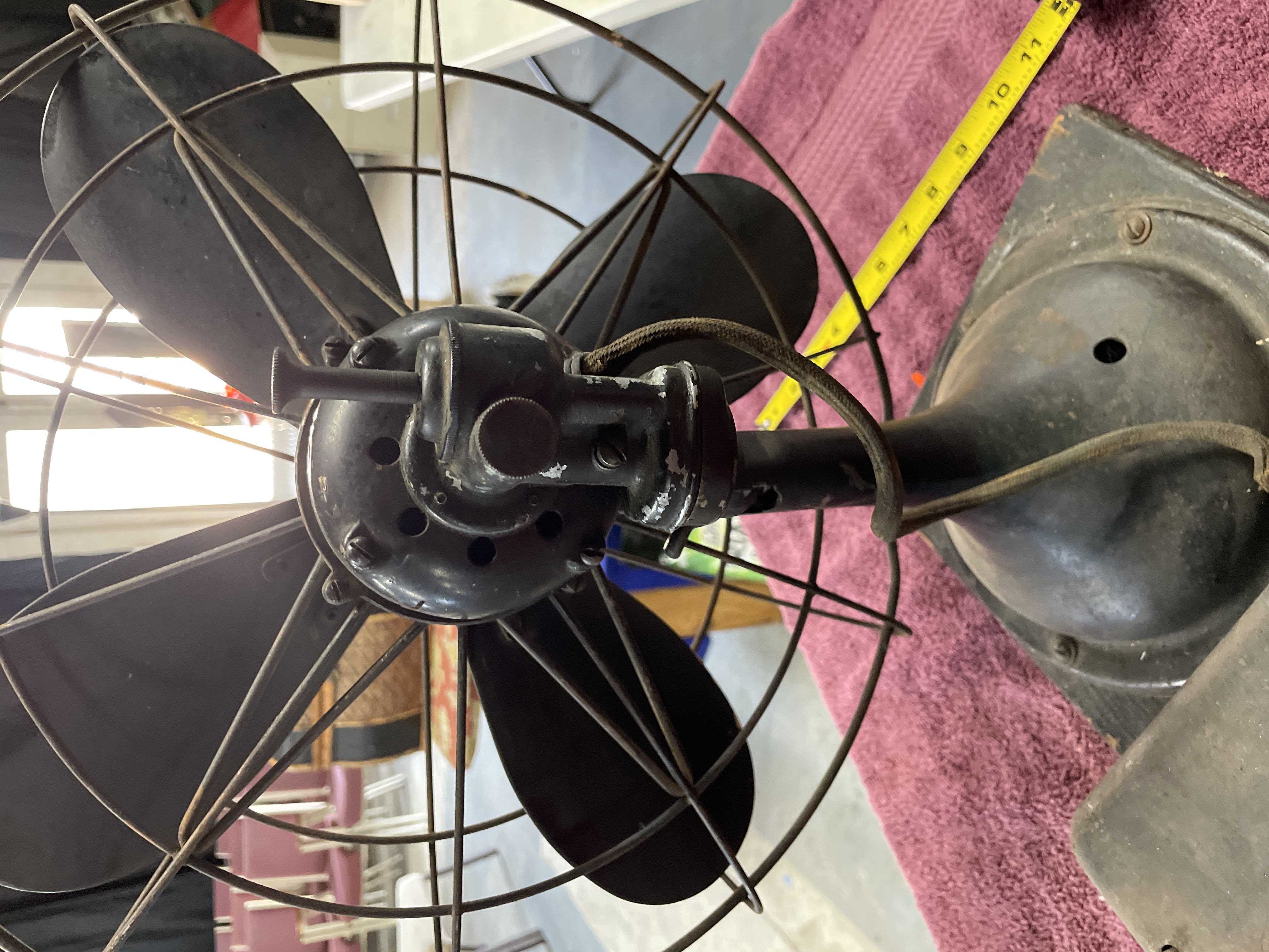 A black metal electric fan with four blades and a wire cage measuring approximately 12 inches in diameter mounted on a rectangular wooden and metal base. Needs new cord