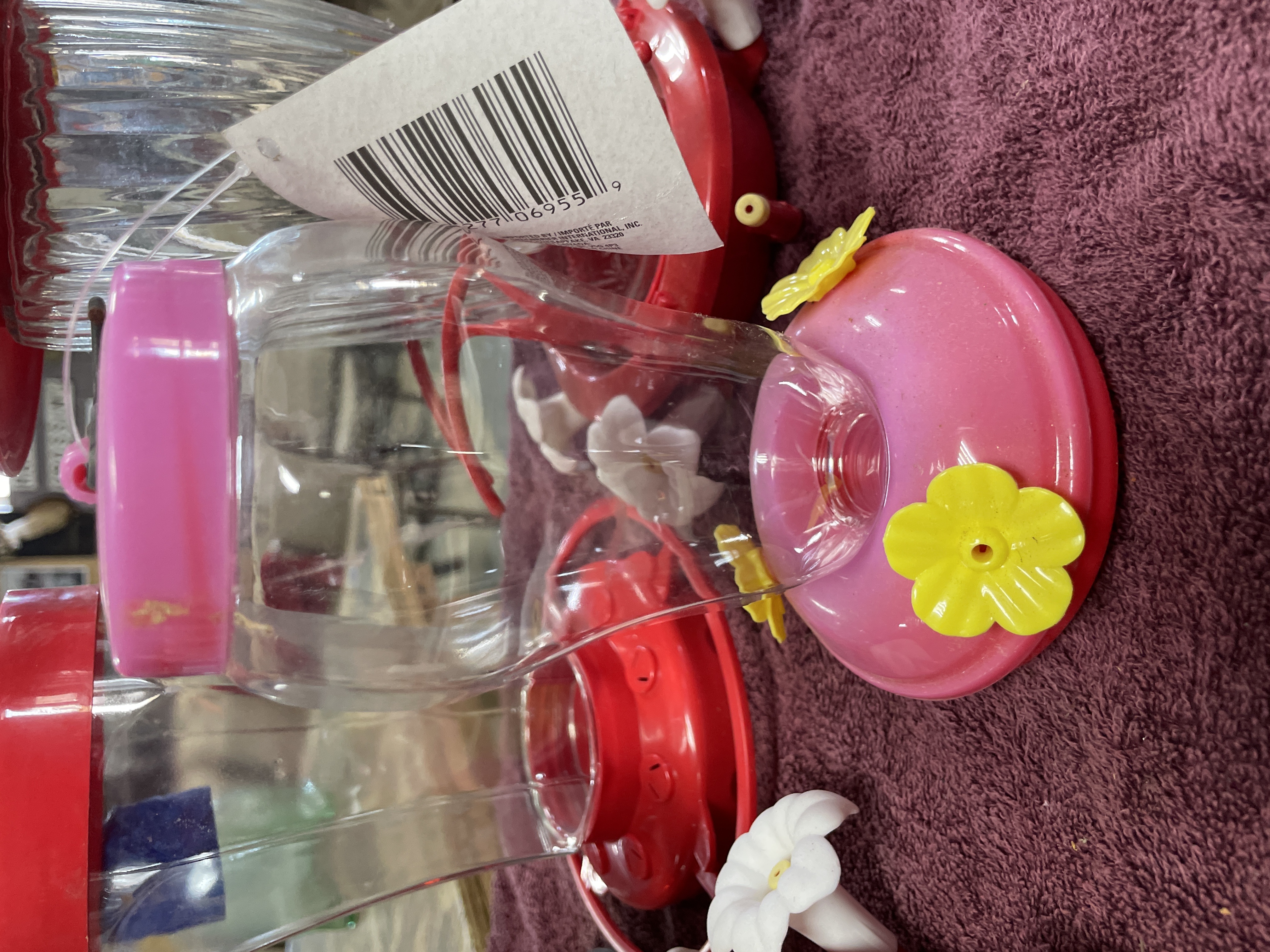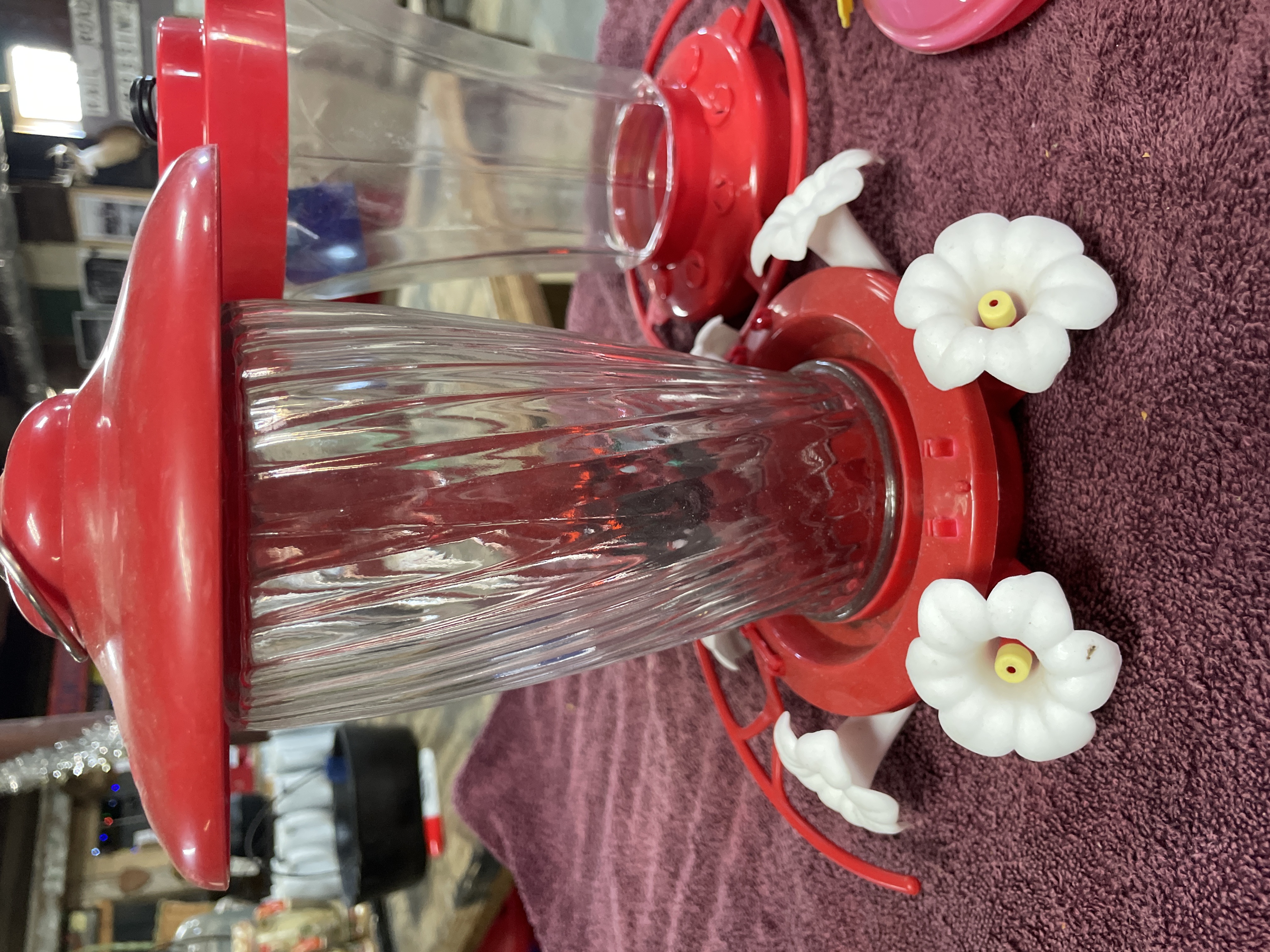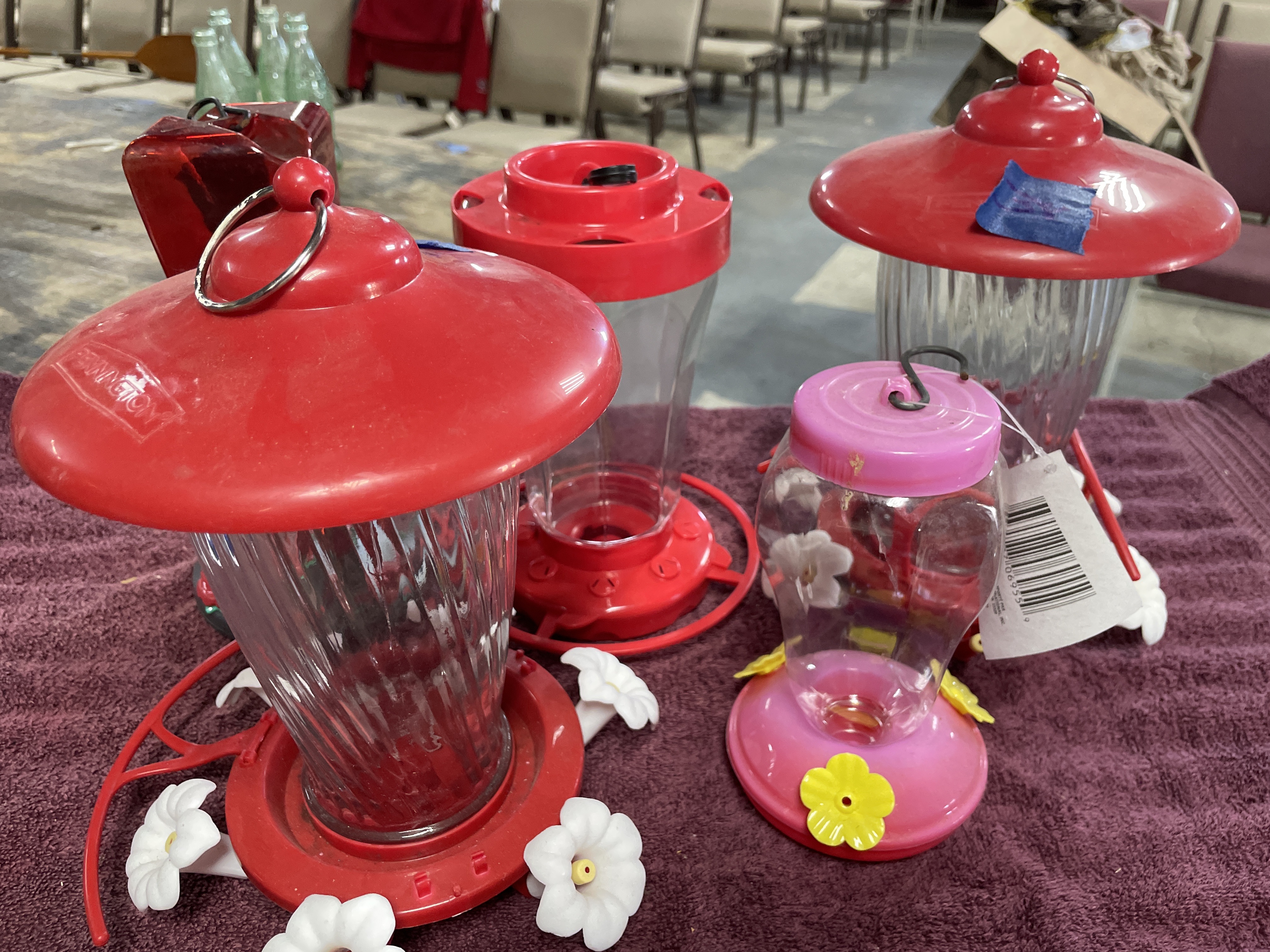 A collection of various hummingbird feeders in red, pink, and clear glass and plastic, including one Pennington branded lid and various floral feeding ports.