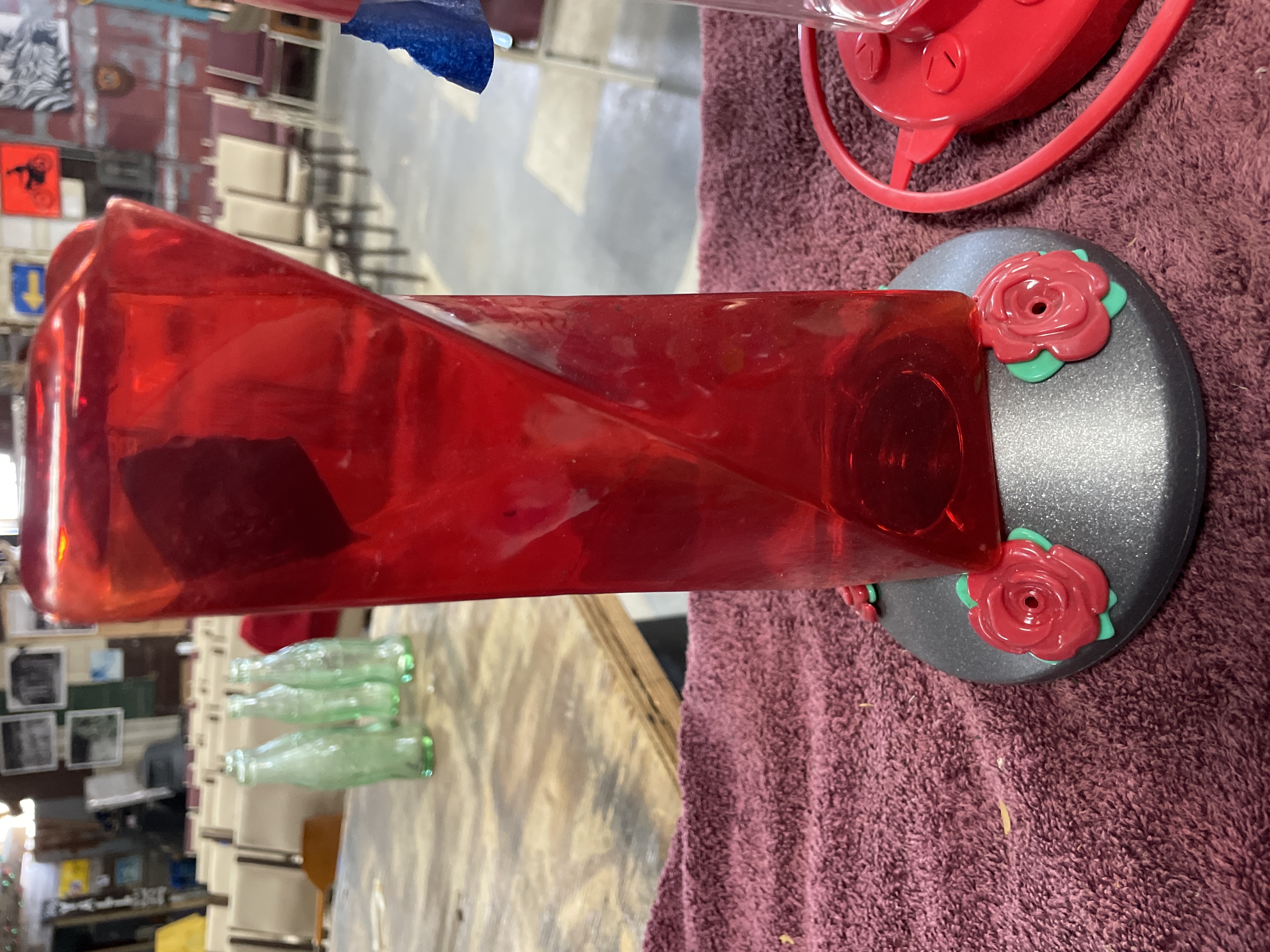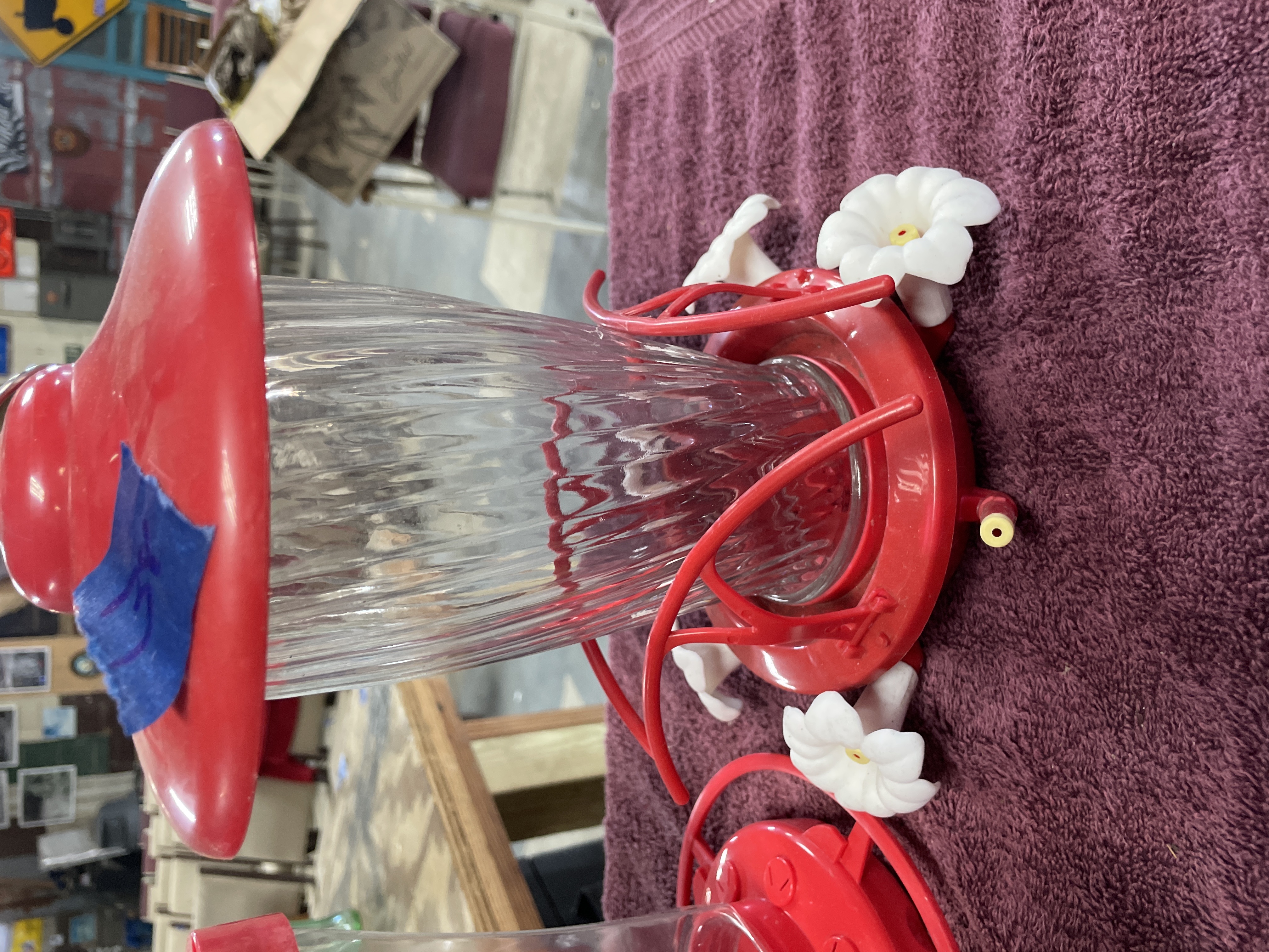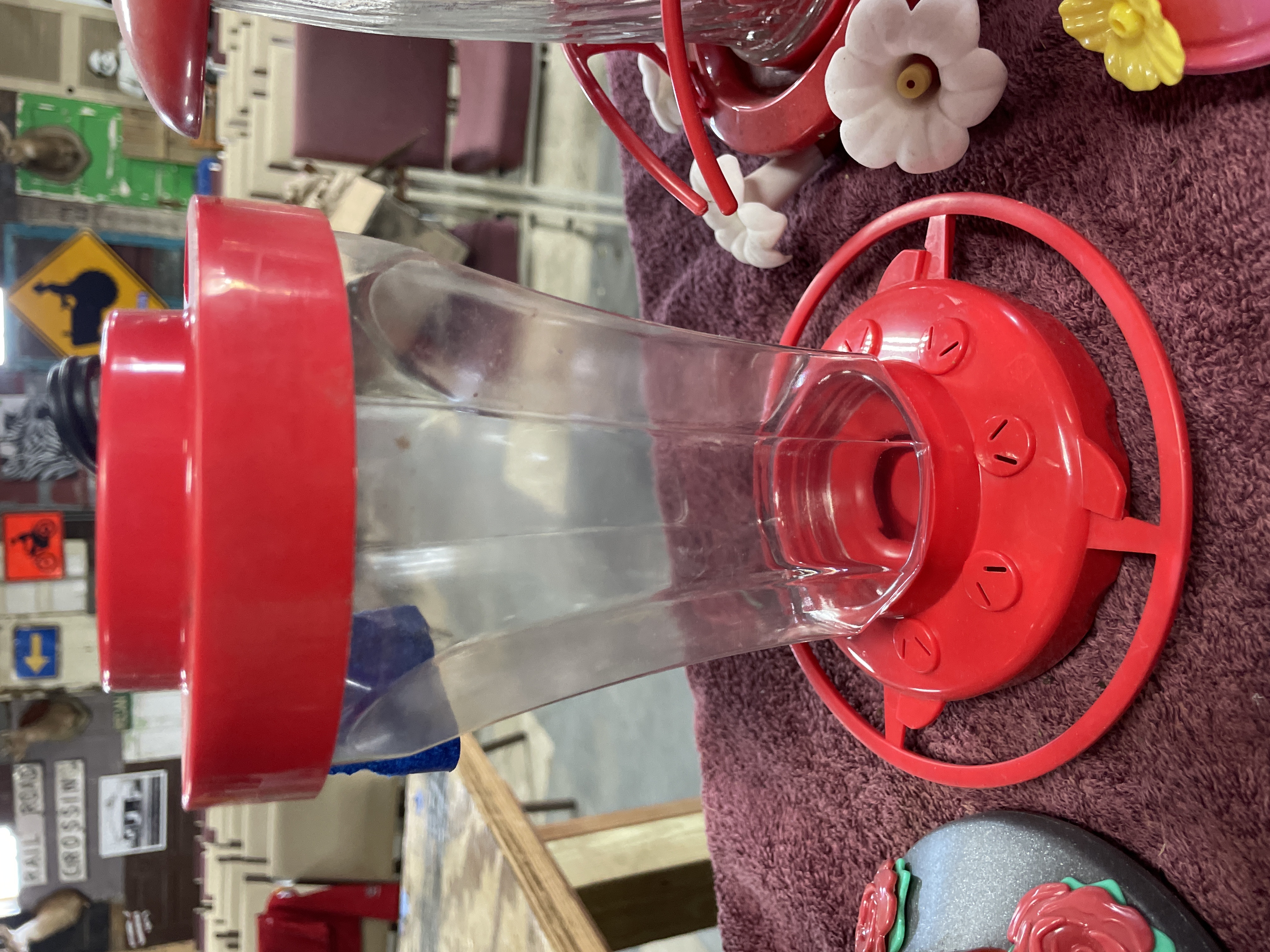 A collection of various hummingbird feeders in red, pink, and clear glass and plastic, including one Pennington branded lid and various floral feeding ports.