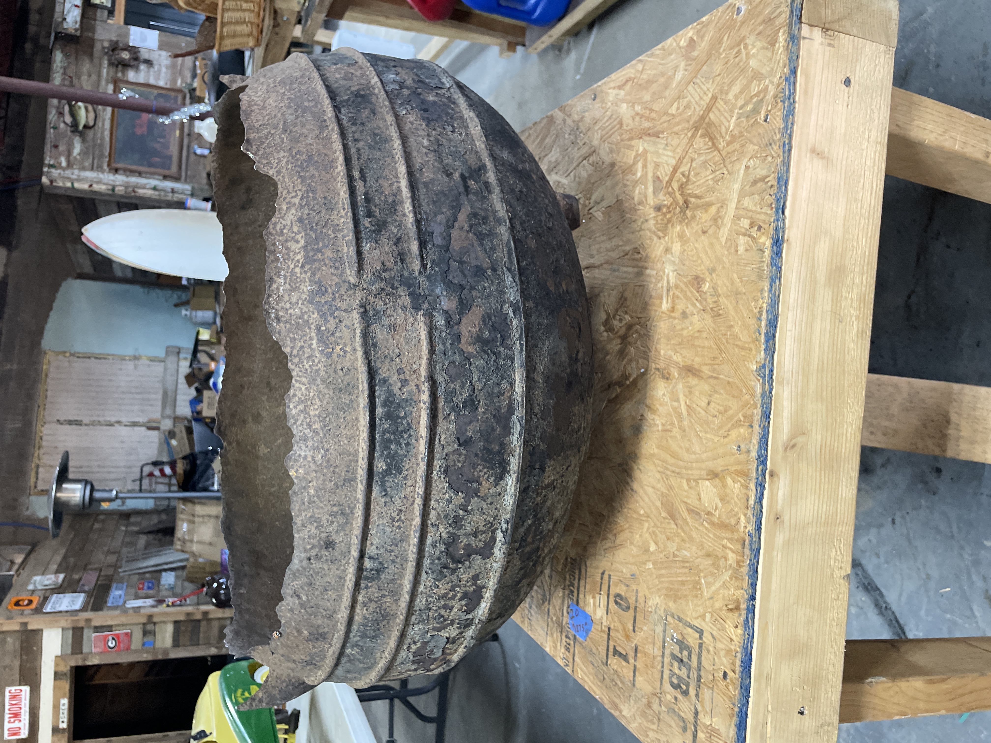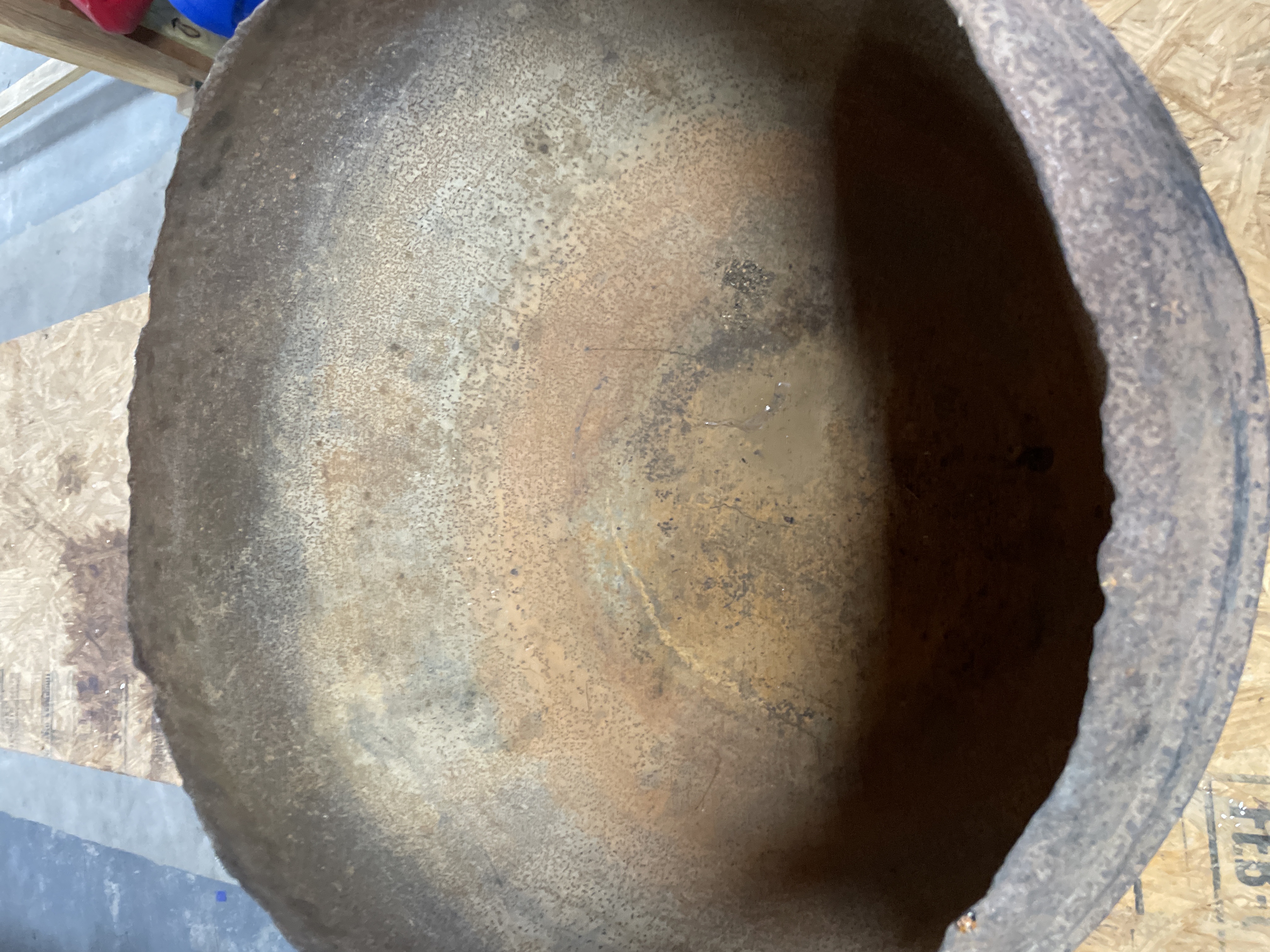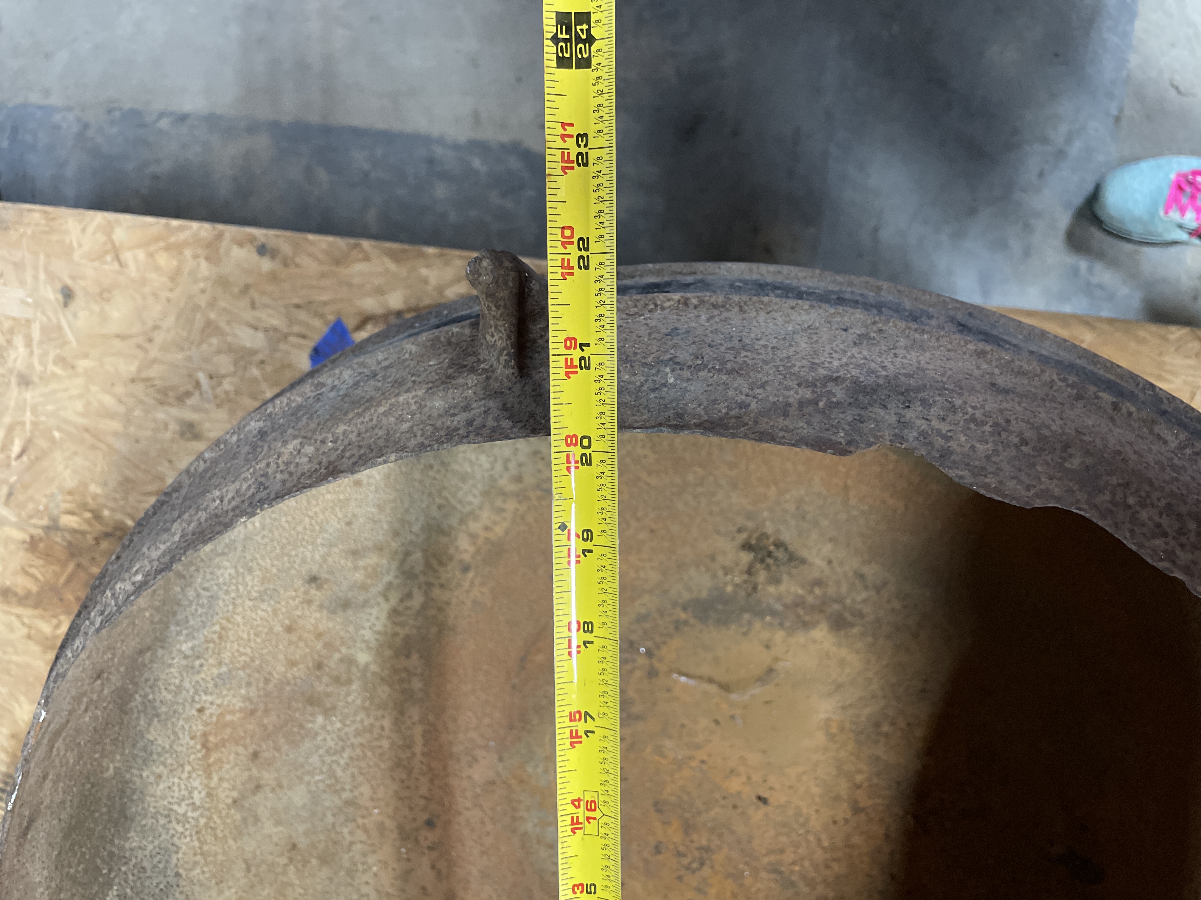 A large rusted brown and black cast iron cauldron featuring integral mounting lugs and a jagged broken rim, measuring approximately 22 inches in diameter and 15 inches in height.