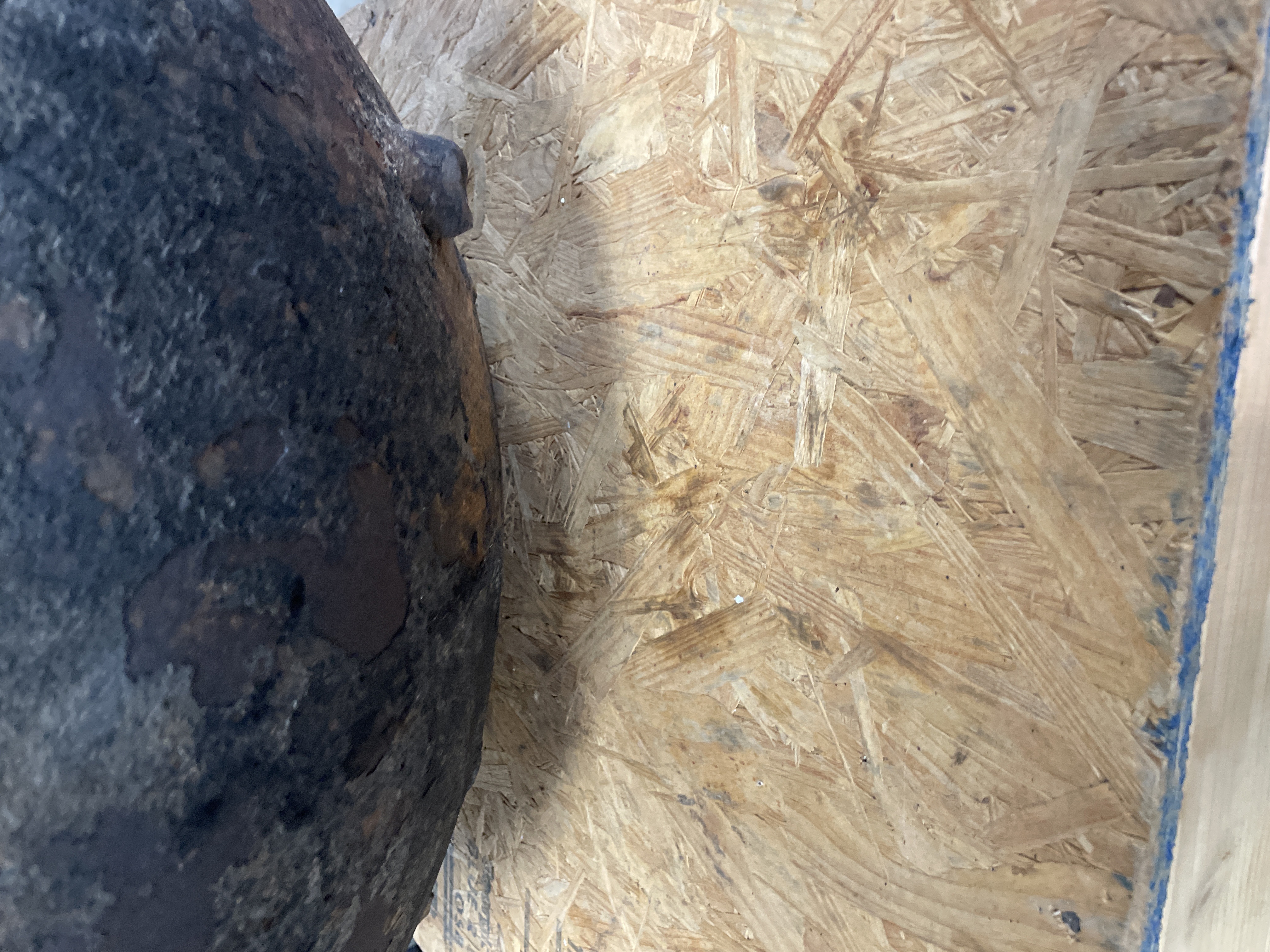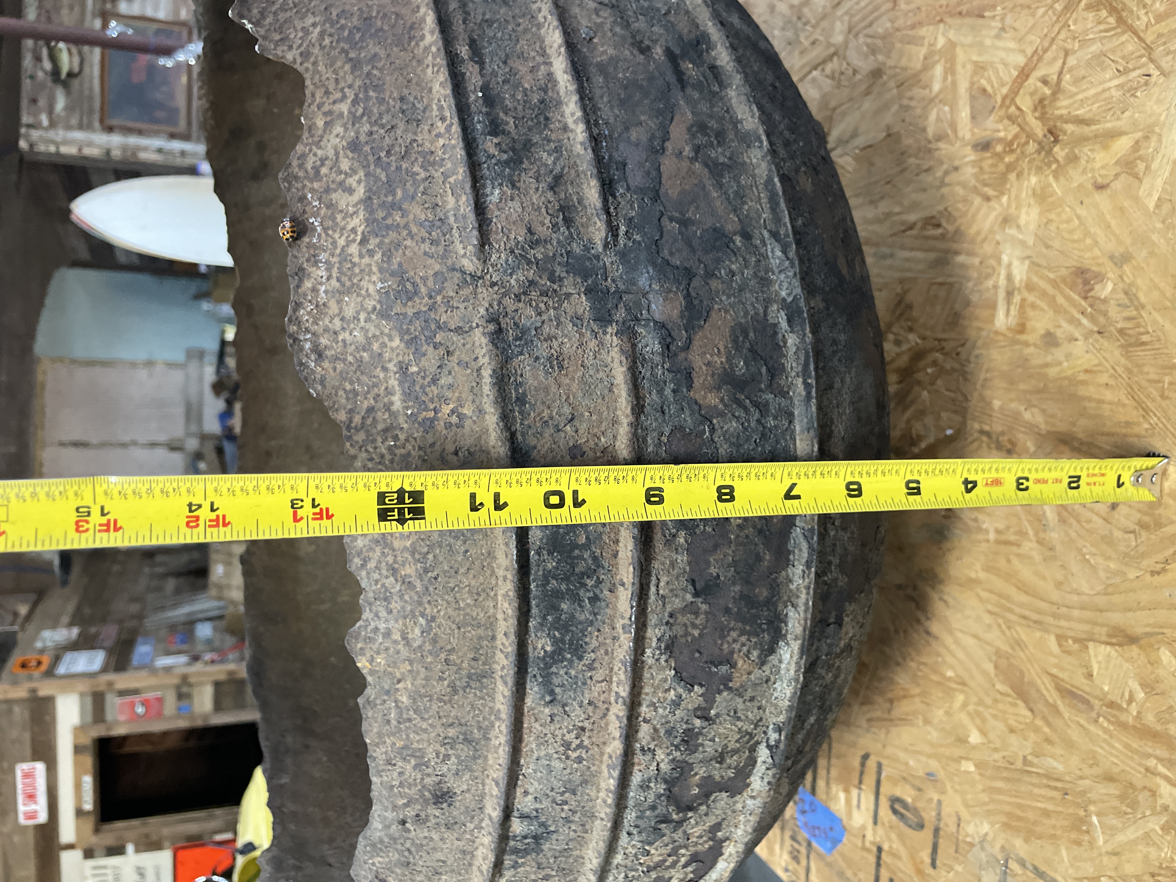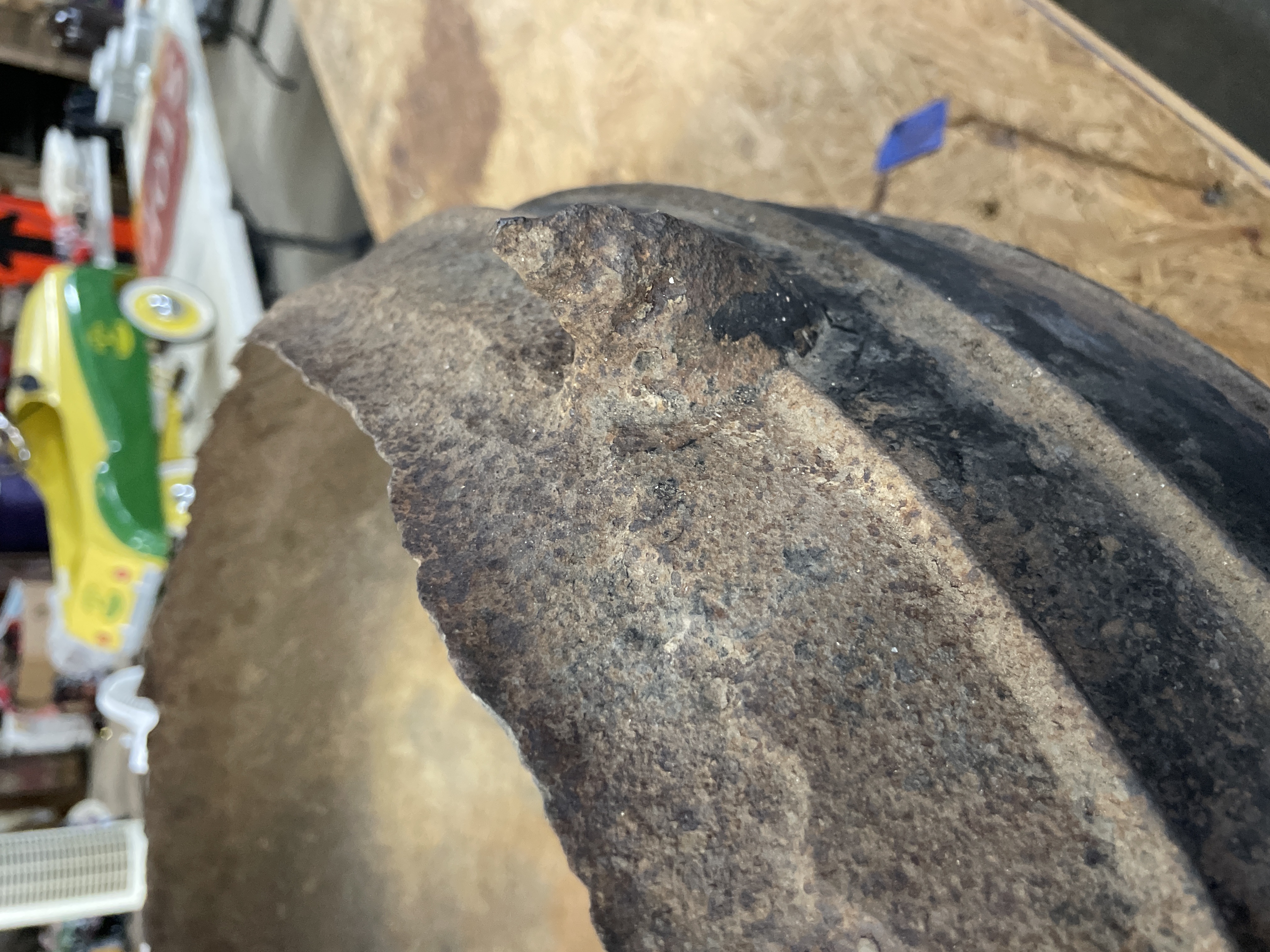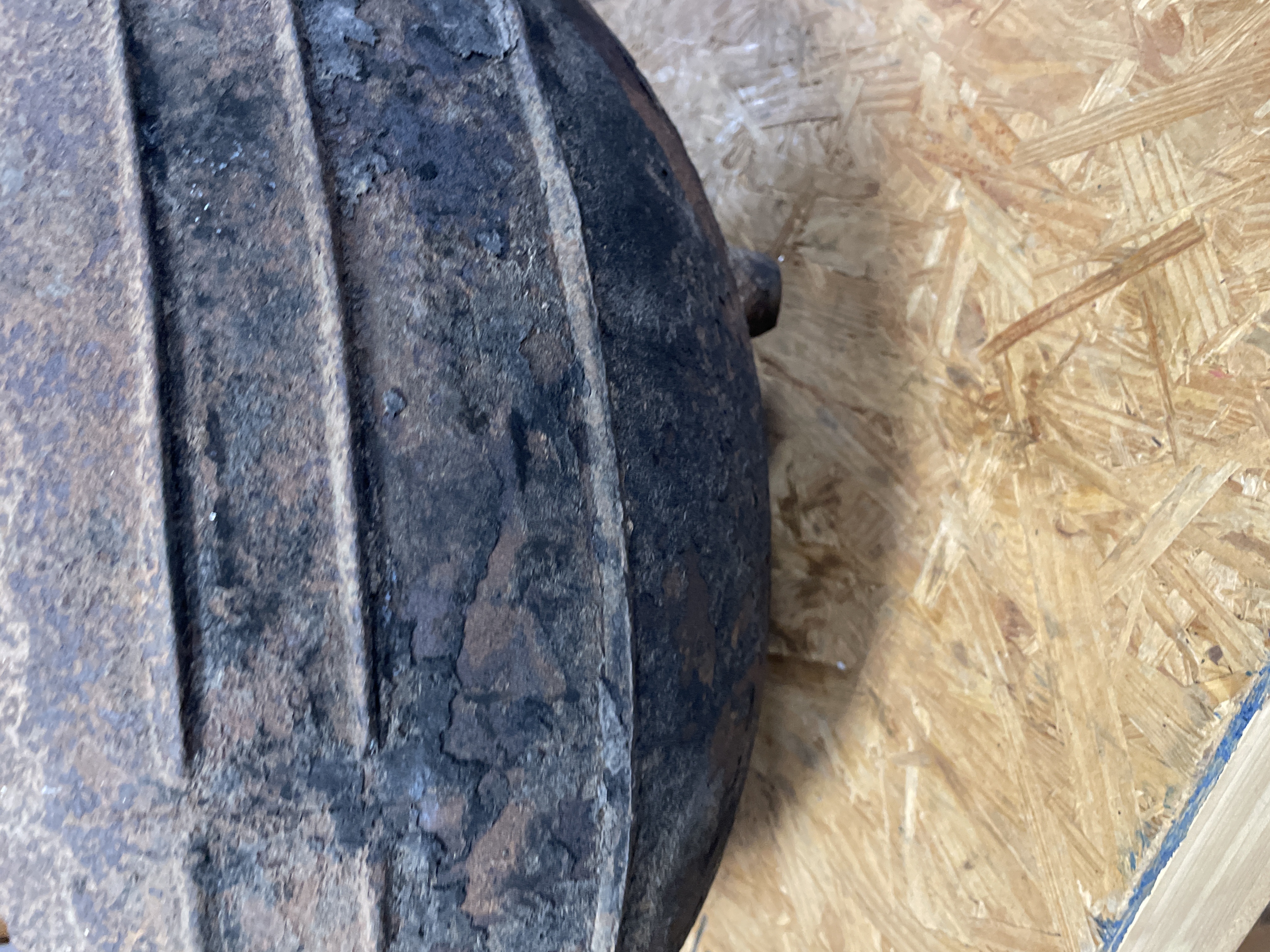 A large rusted brown and black cast iron cauldron featuring integral mounting lugs and a jagged broken rim, measuring approximately 22 inches in diameter and 15 inches in height.