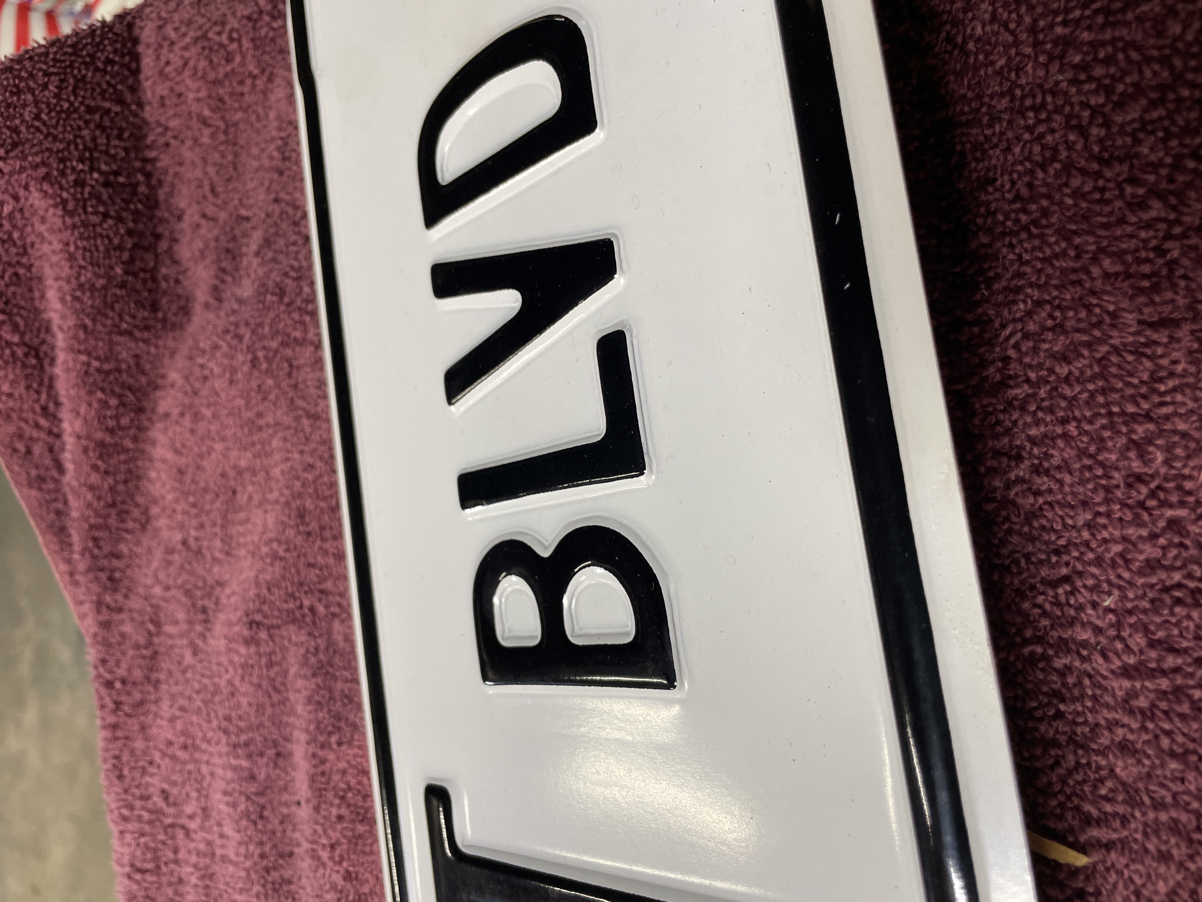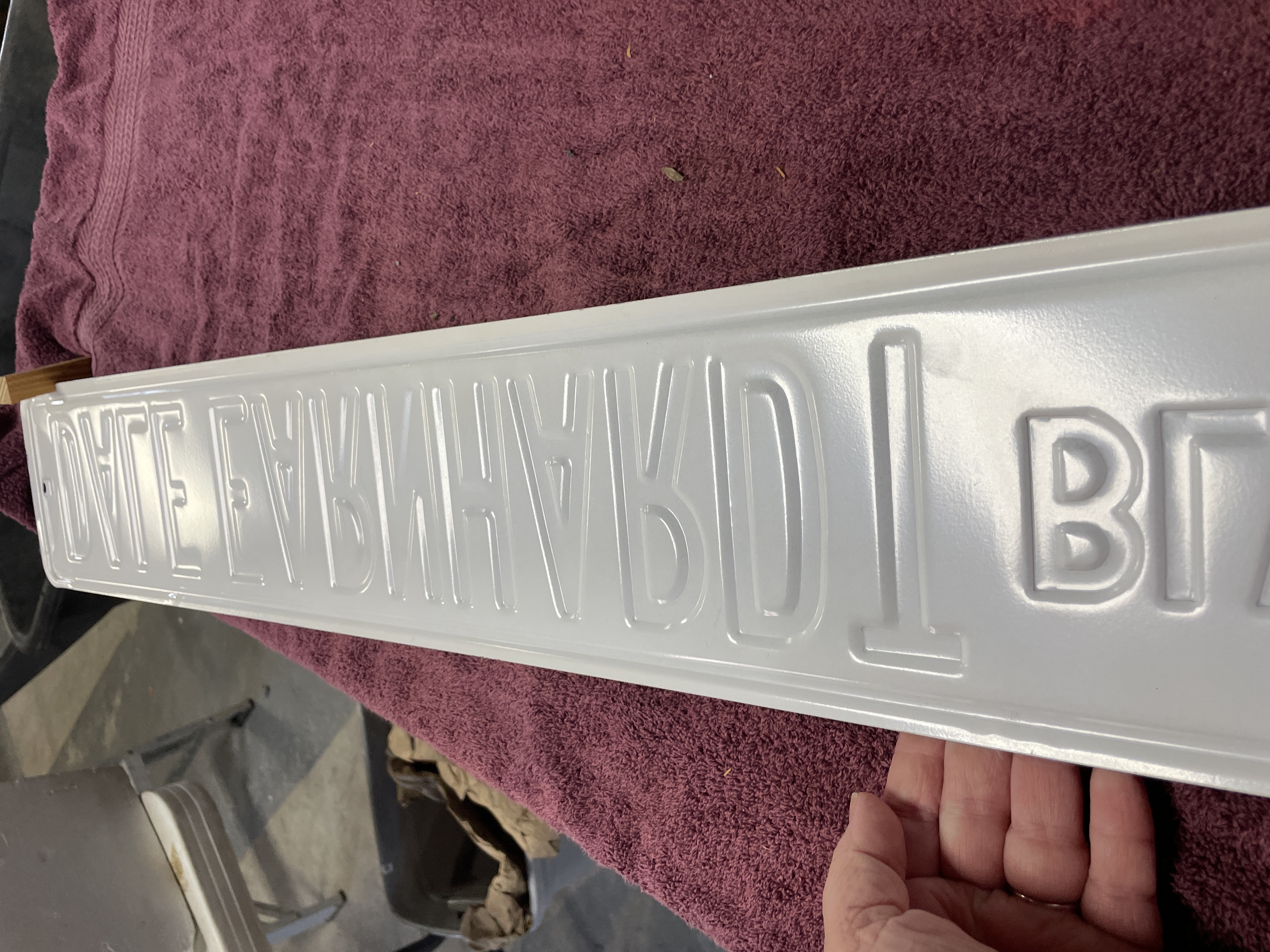A white and black embossed metal street sign inscribed with Dale Earnhardt Blvd measuring approximately 36 inches in length.