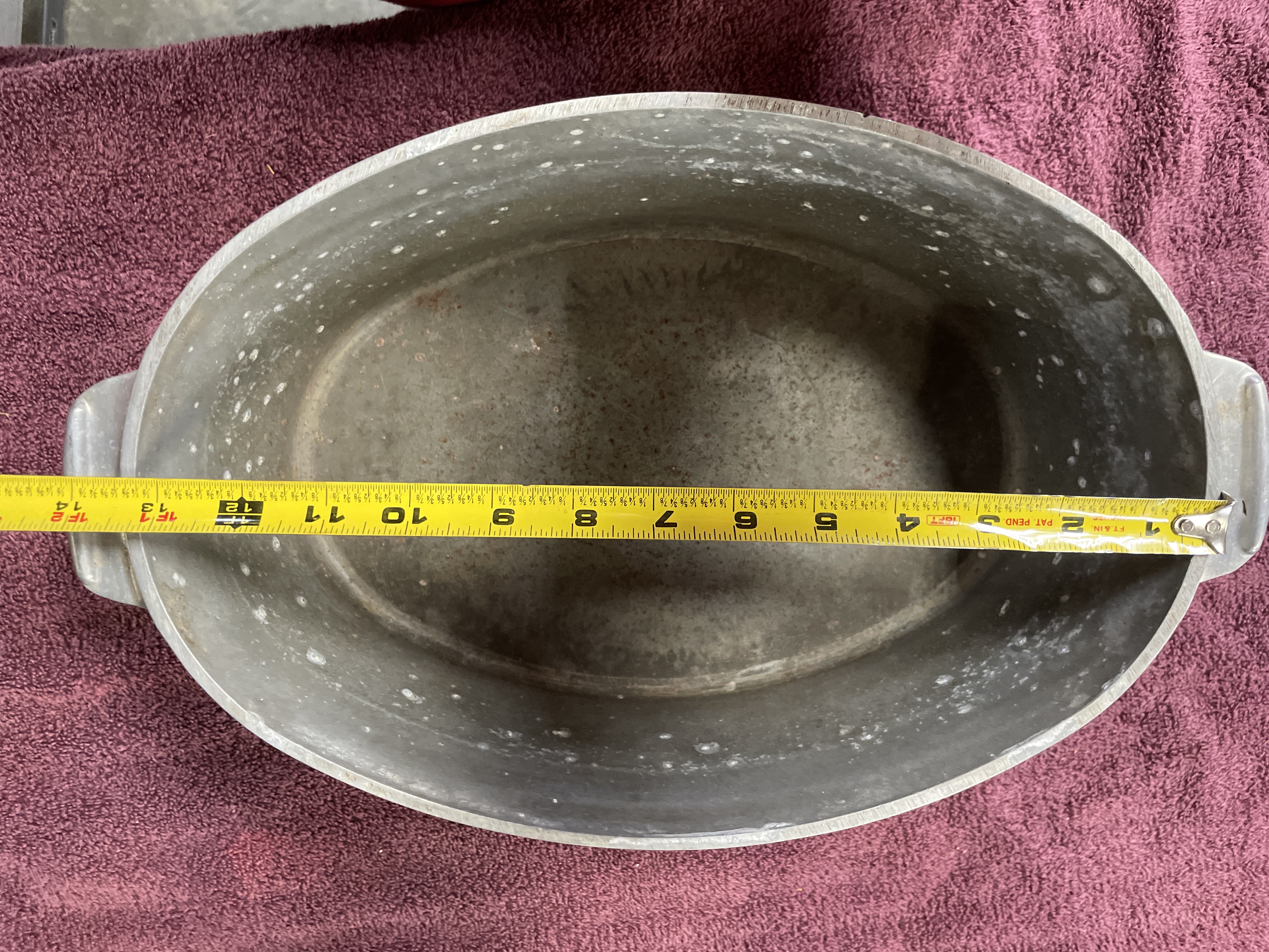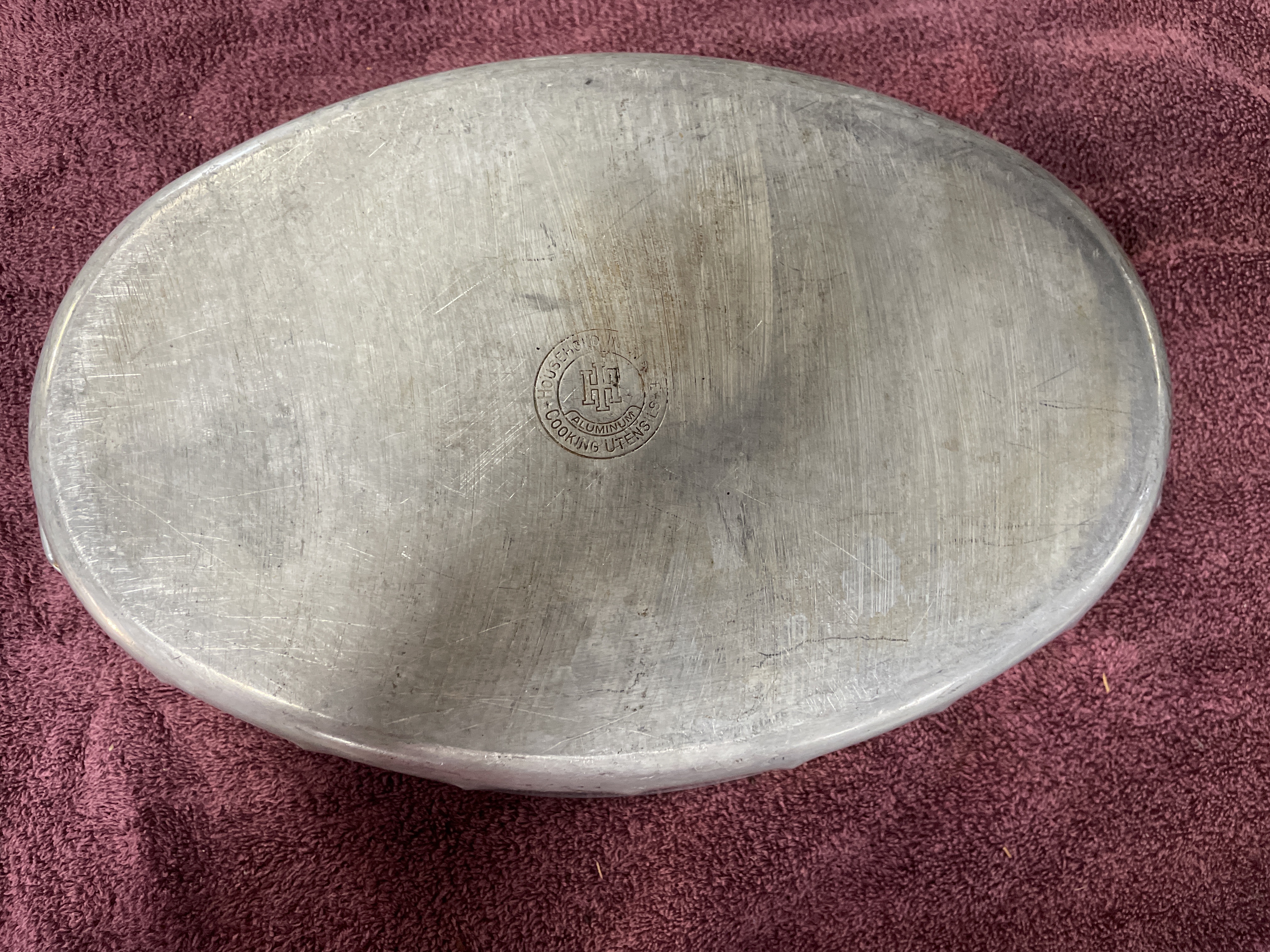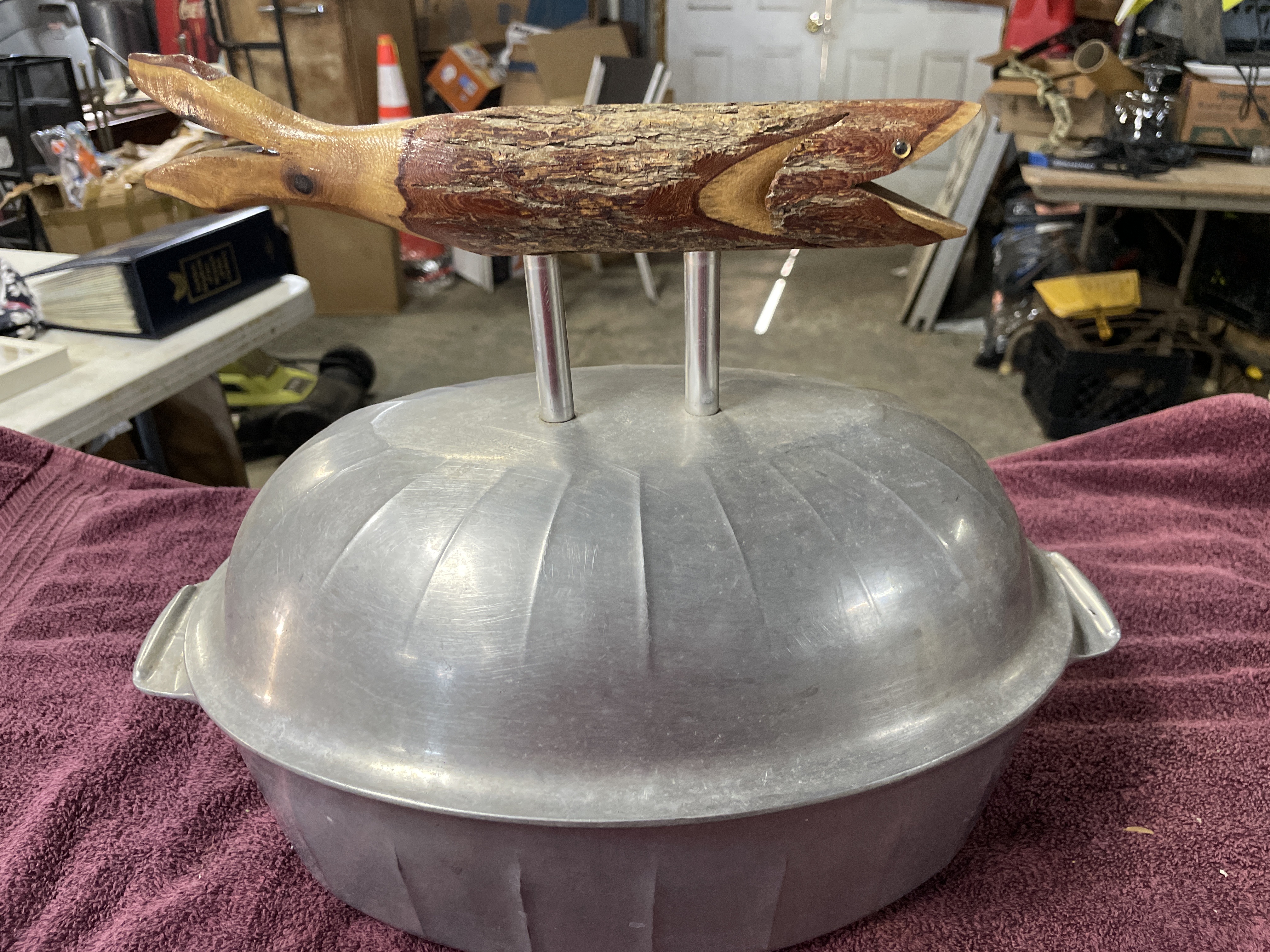 A vintage Household Institute cast aluminum oval roaster featuring a lid with a hand-carved wooden fish handle, measuring approximately 15 inches in length.