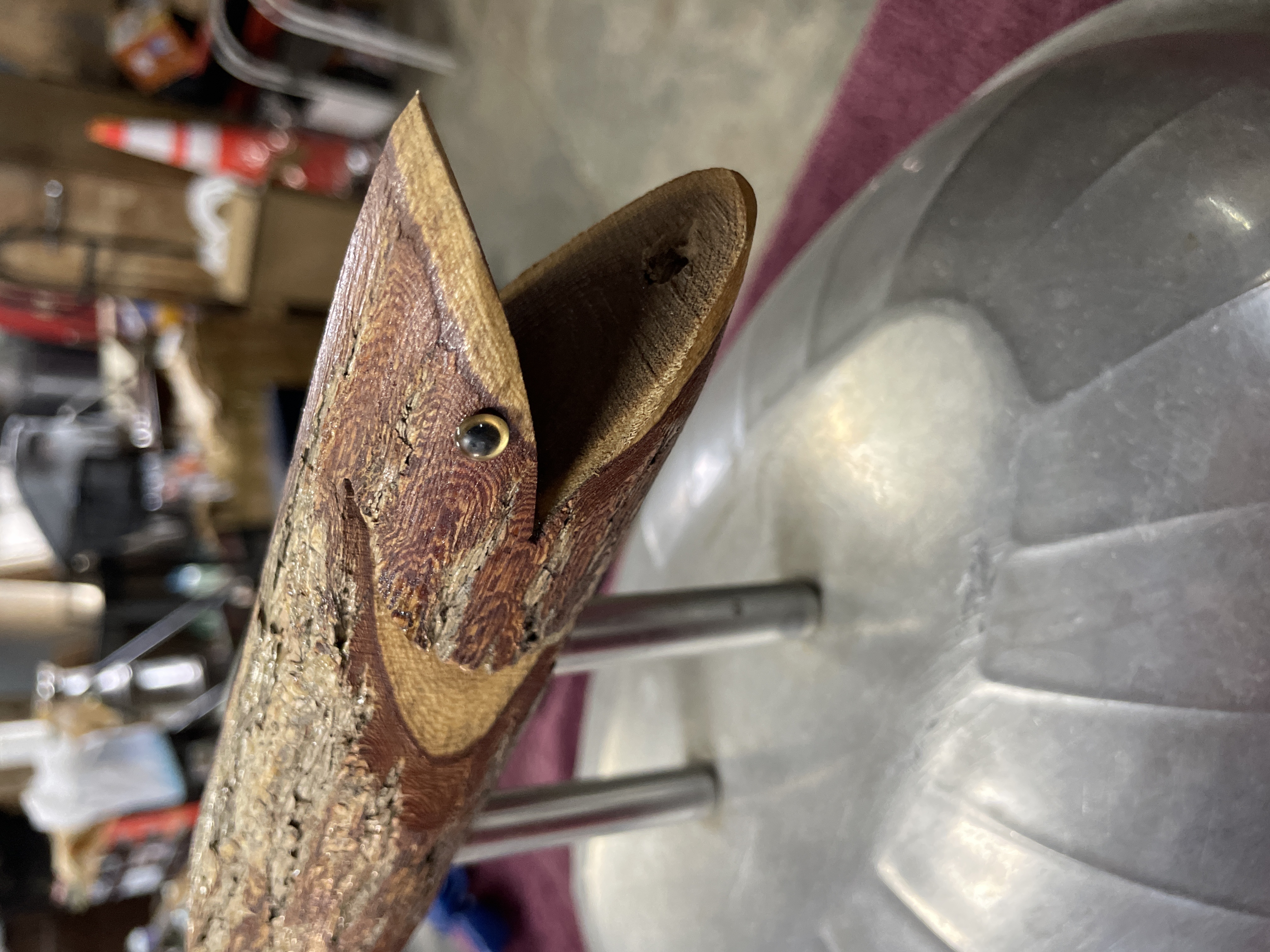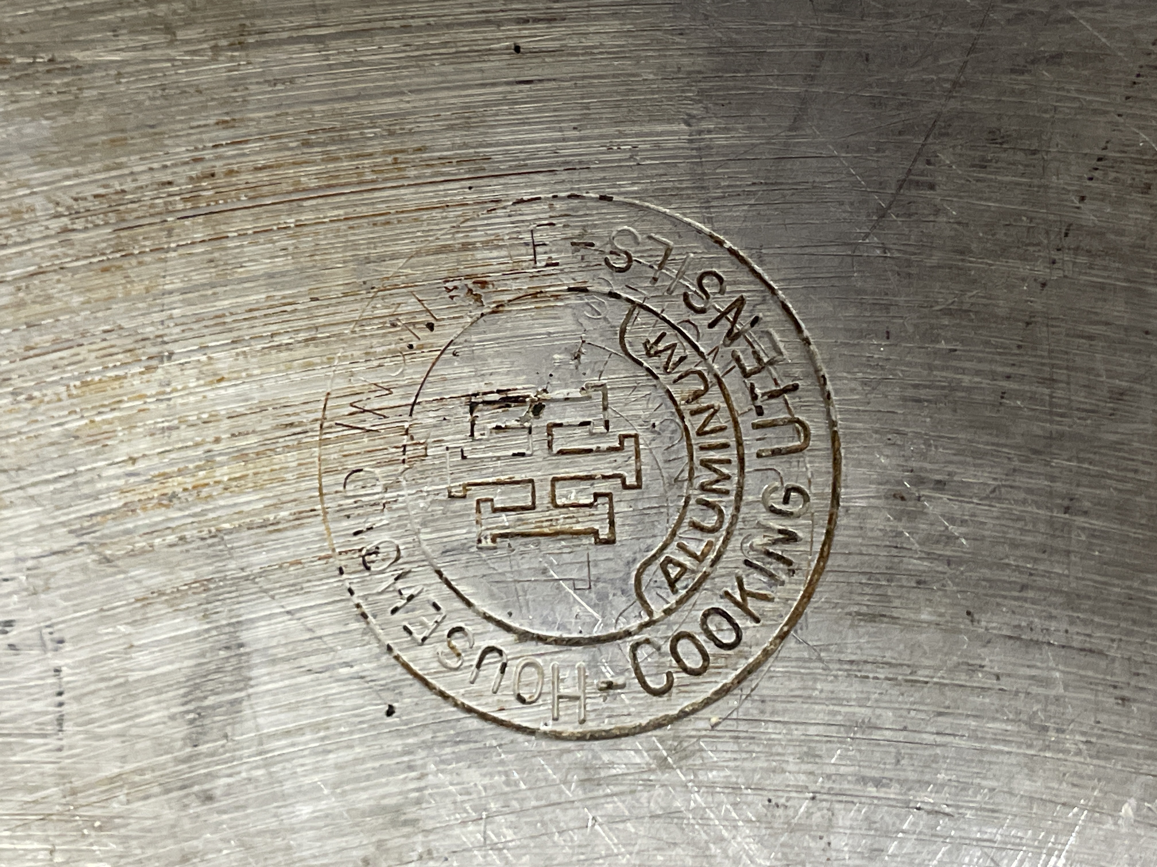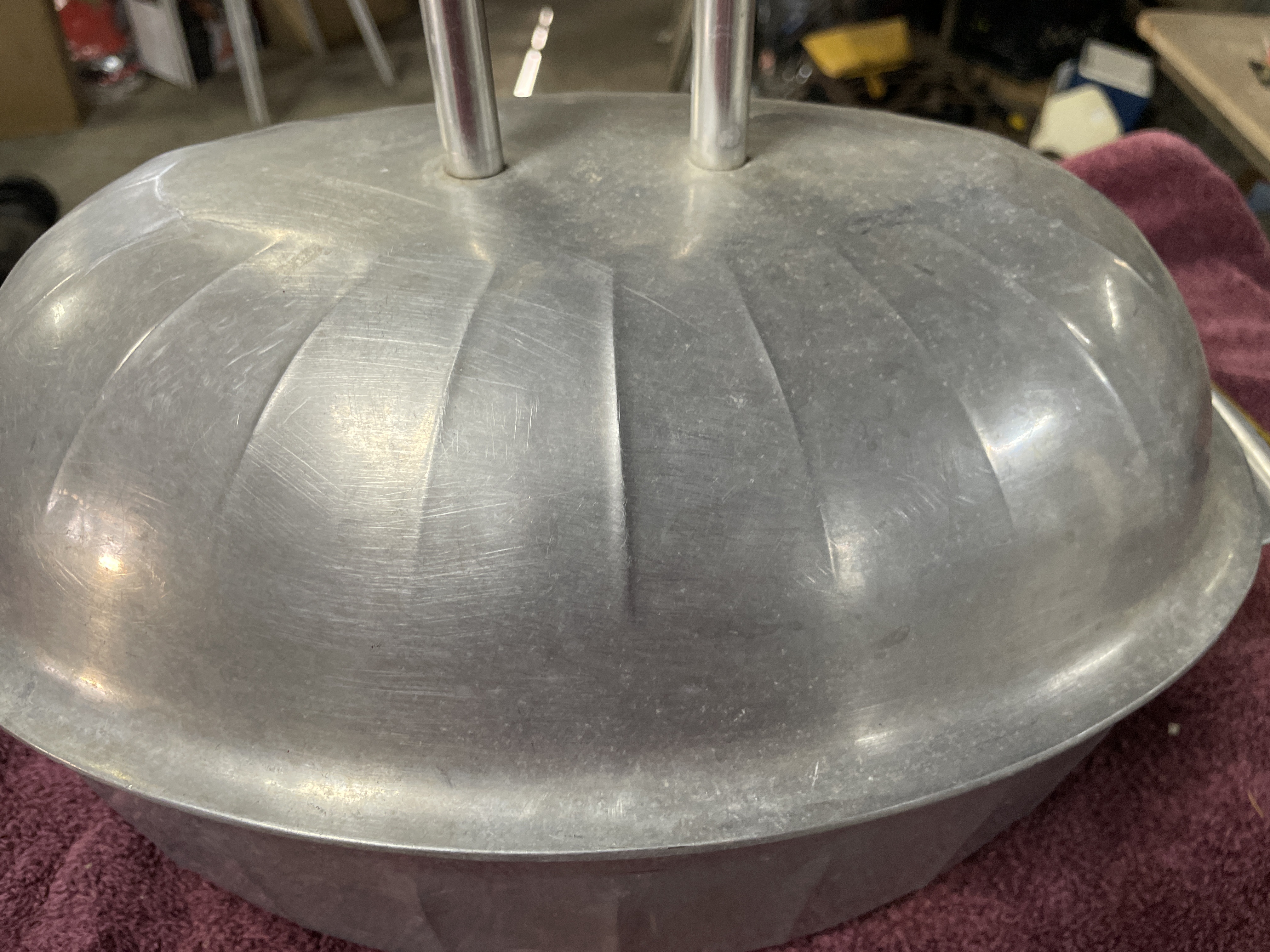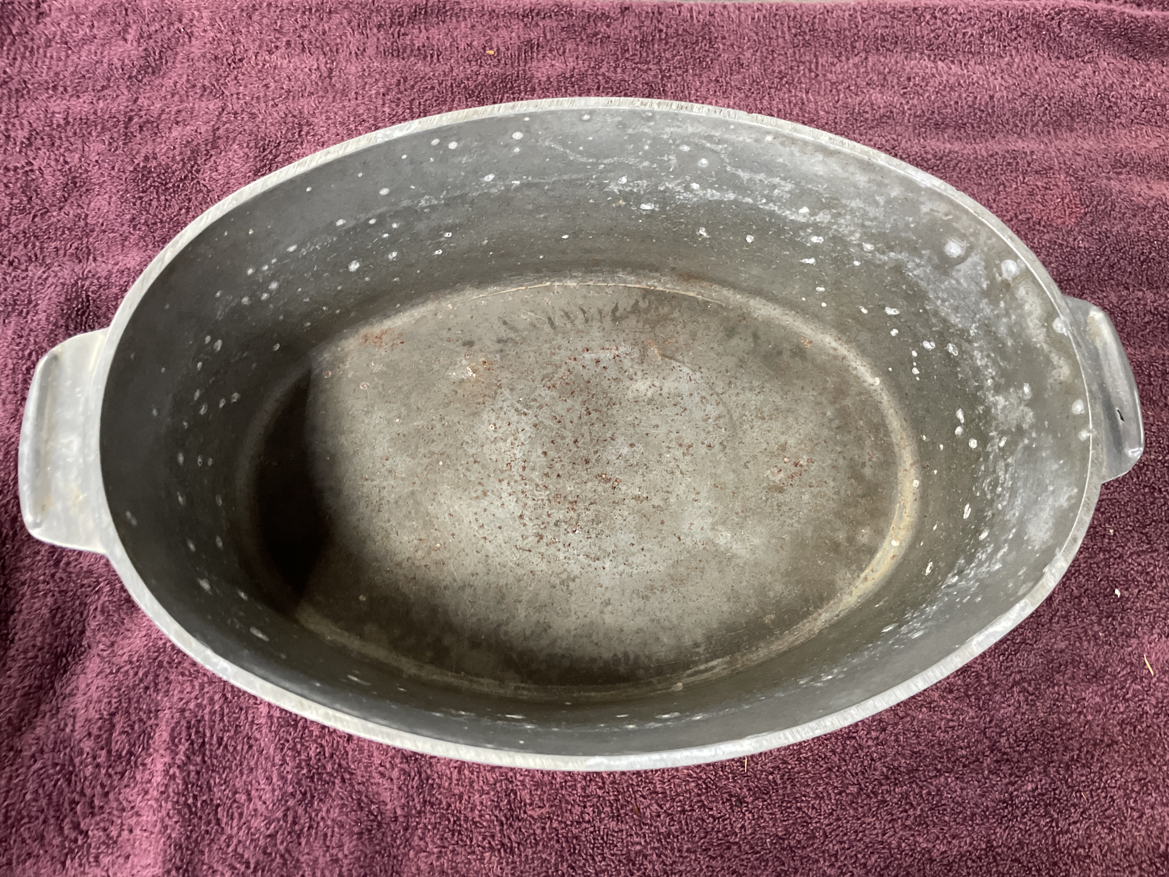 A vintage Household Institute cast aluminum oval roaster featuring a lid with a hand-carved wooden fish handle, measuring approximately 15 inches in length.