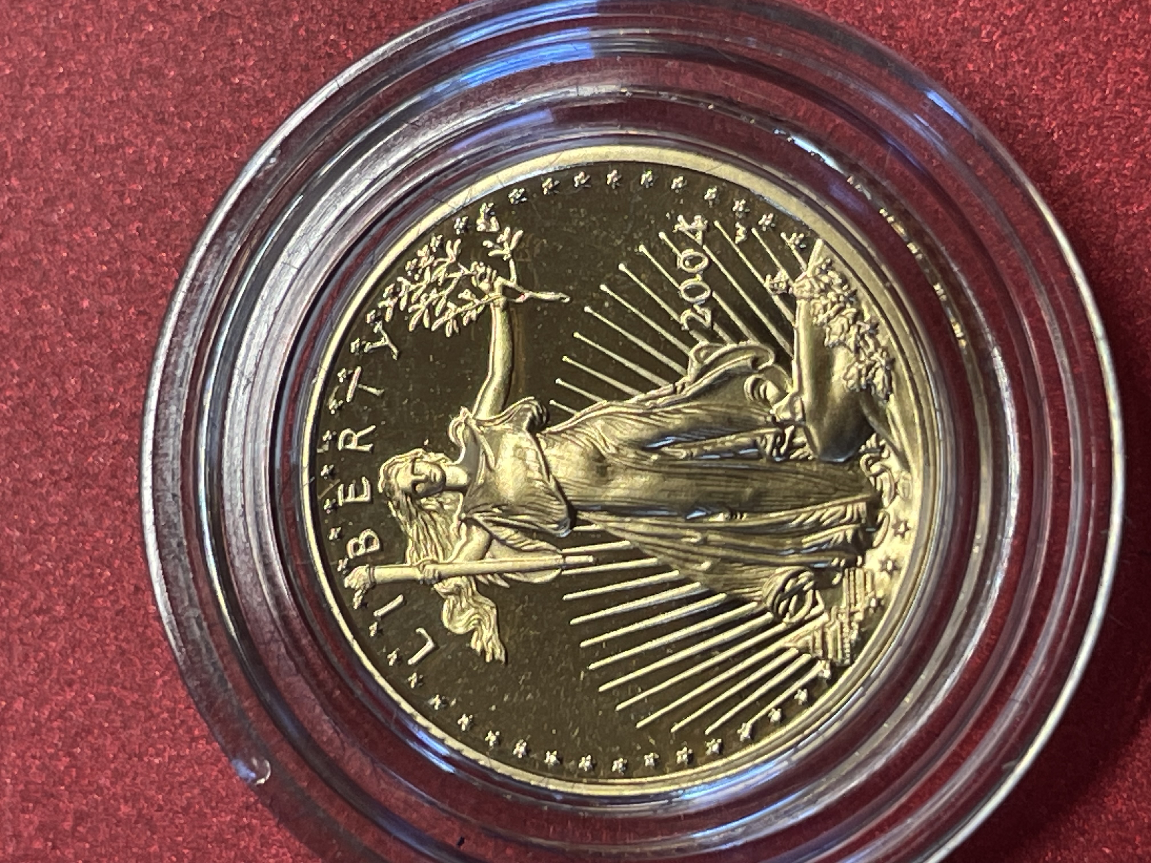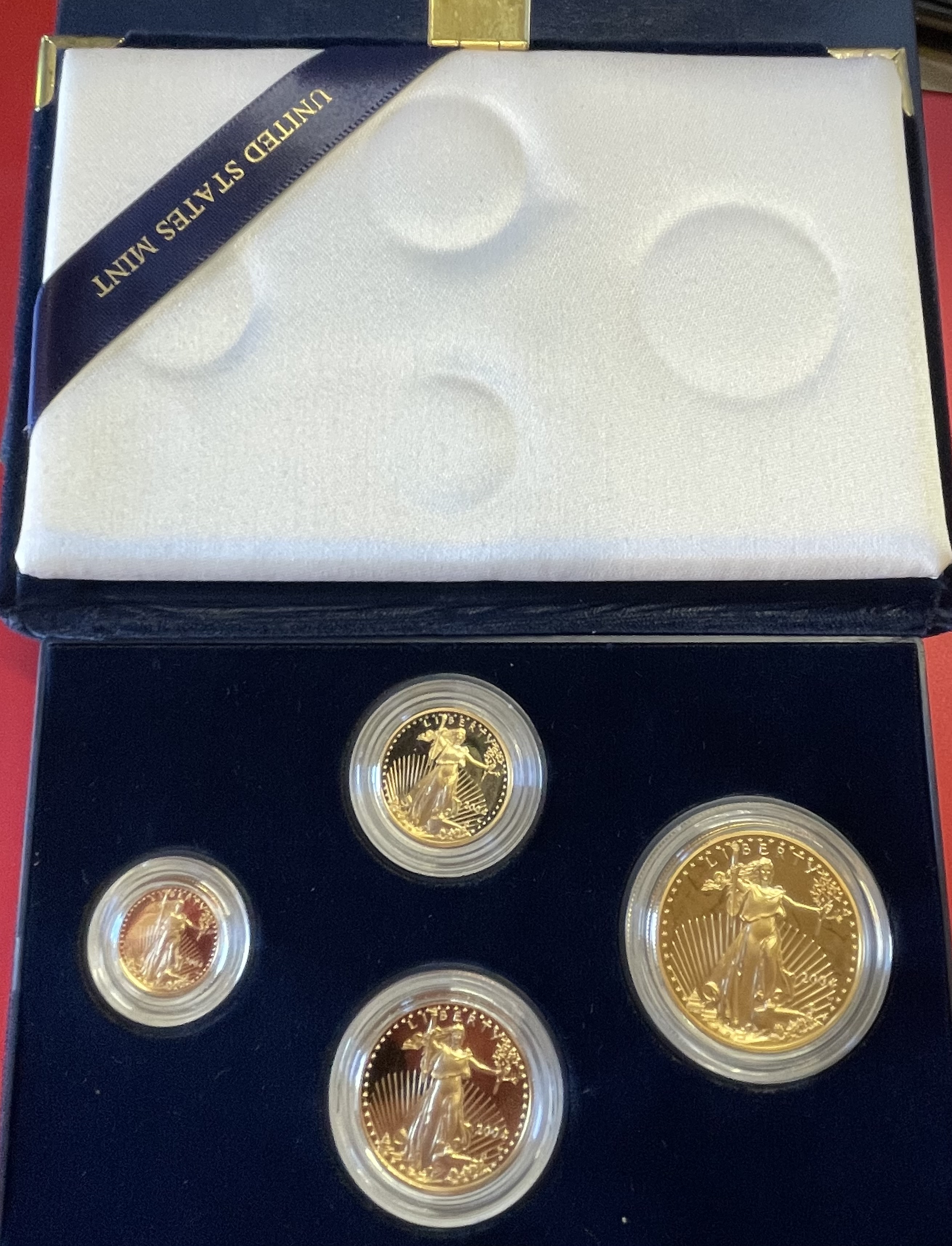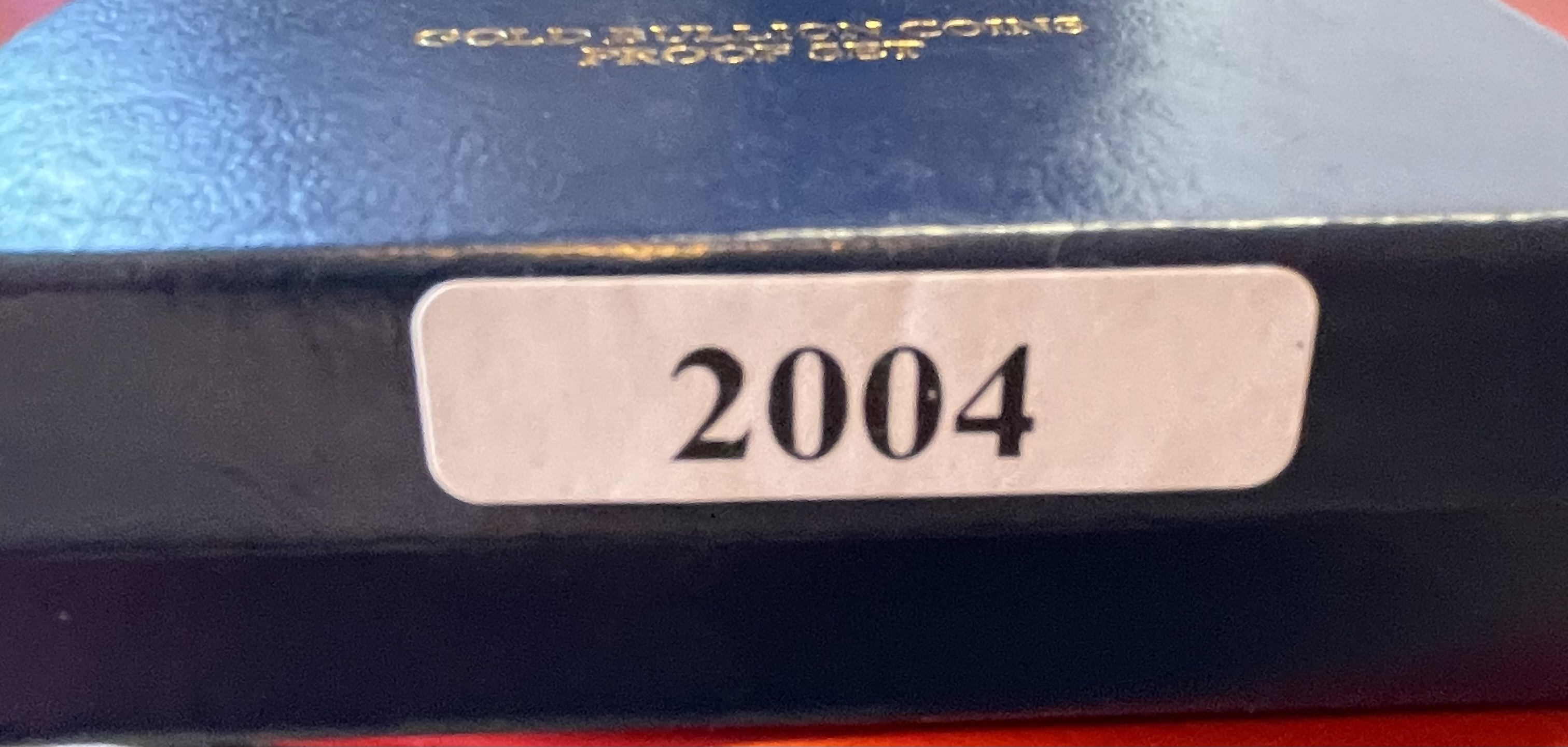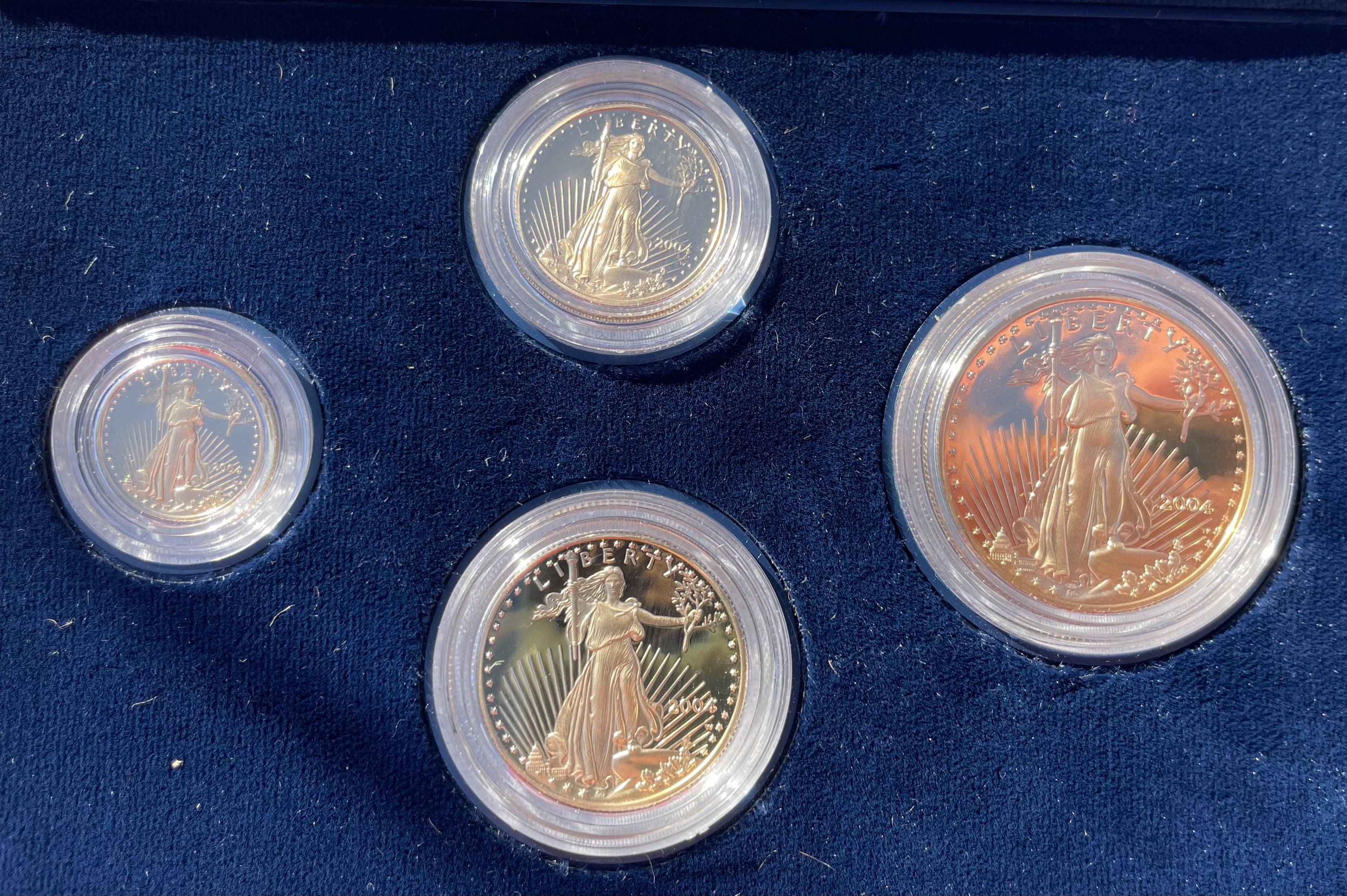 A collection of four 2004 United States Mint American Eagle gold proof coins with denominations of $50, $25, $10, and $5, containing a total of 1.85 troy ounces of fine gold and presented in a blue velvet box with a certificate of authenticity.