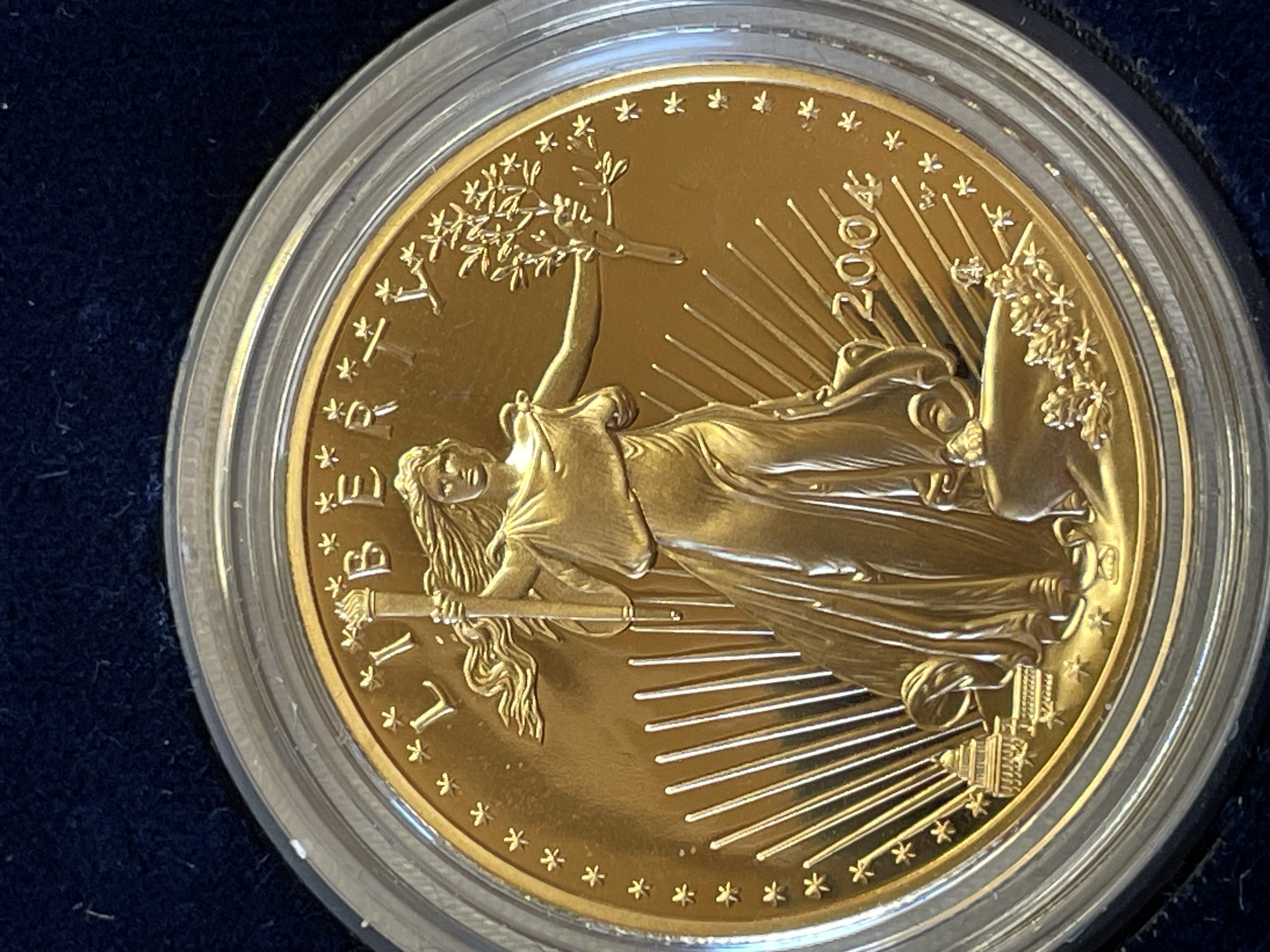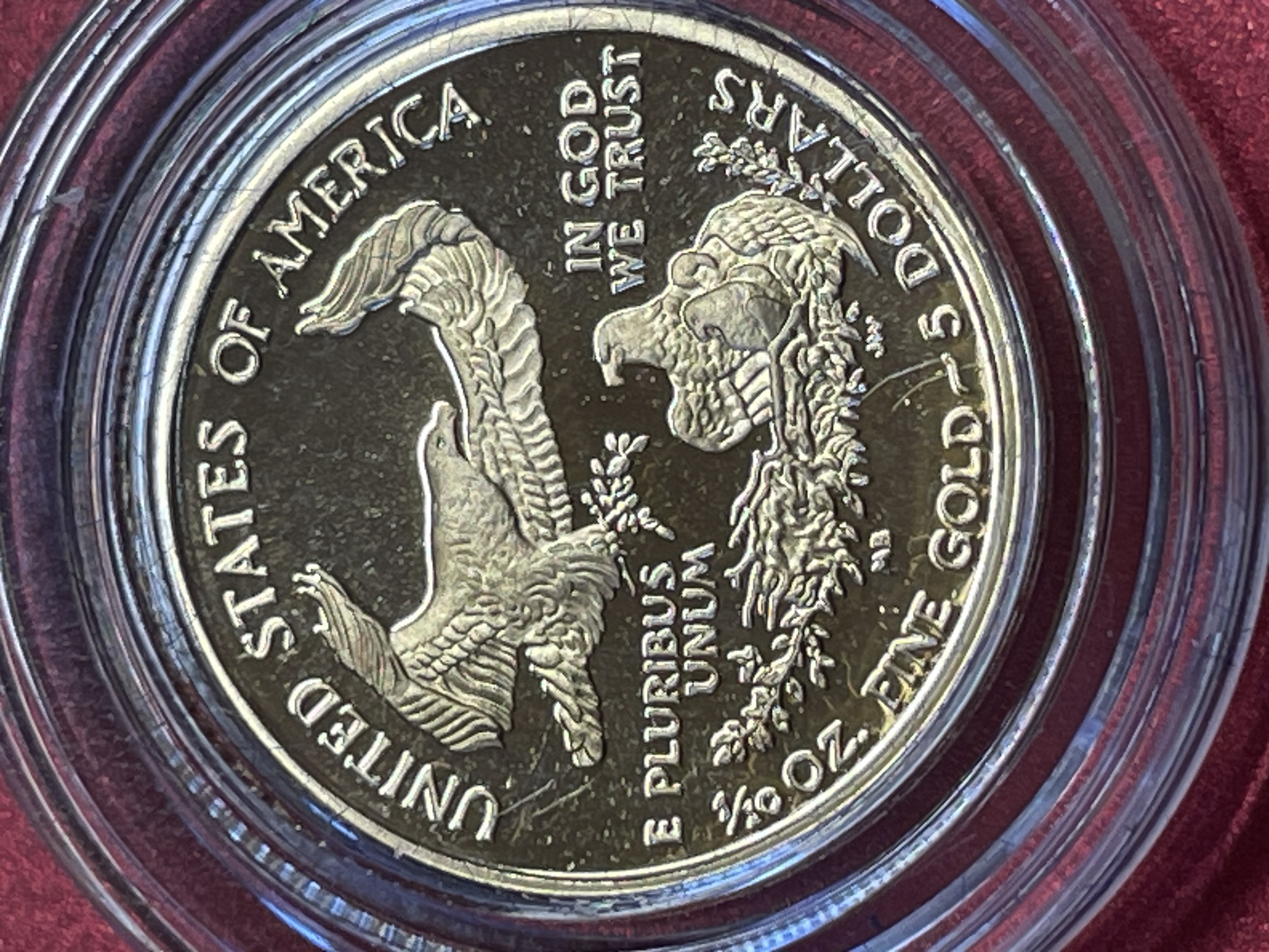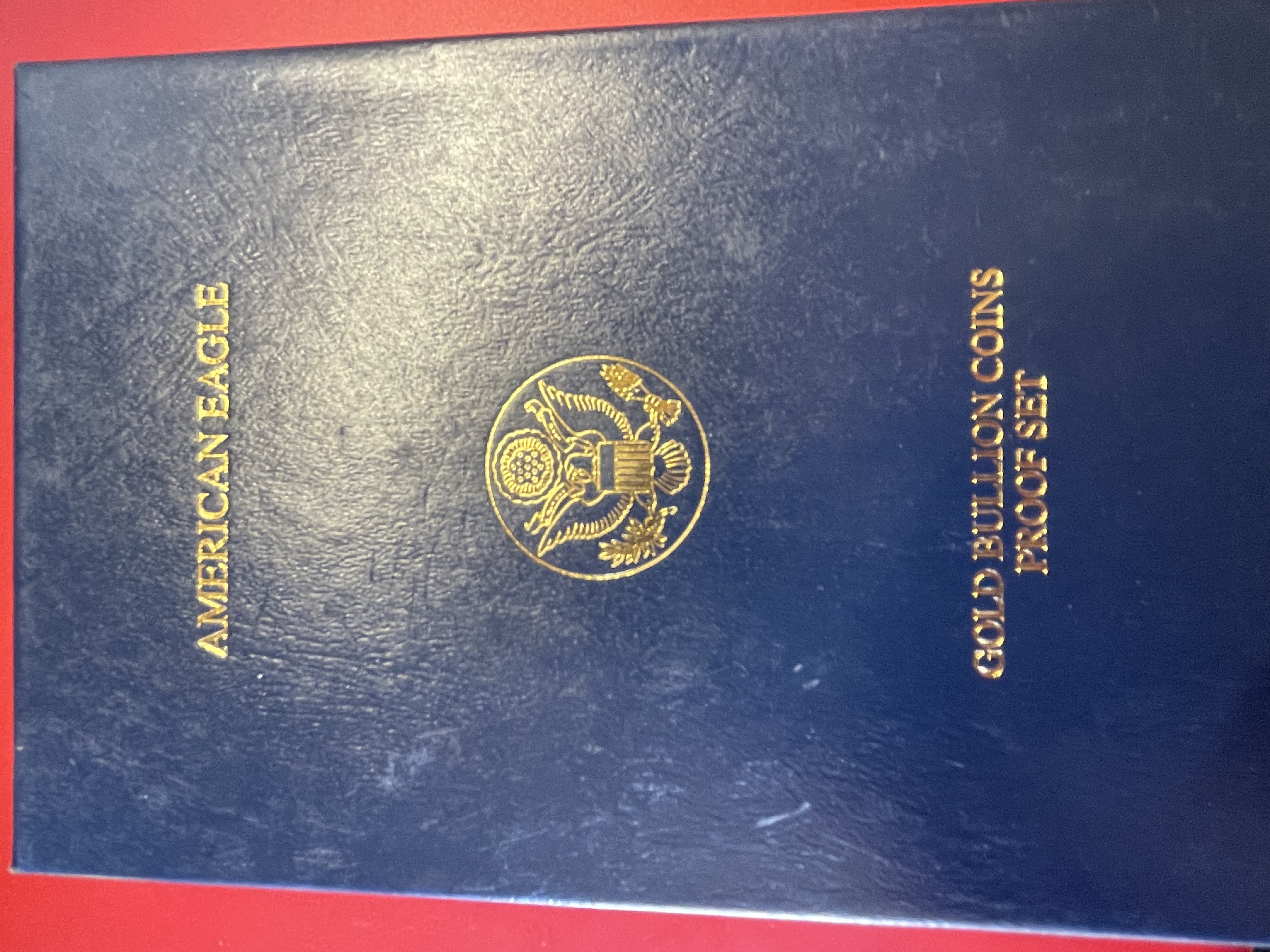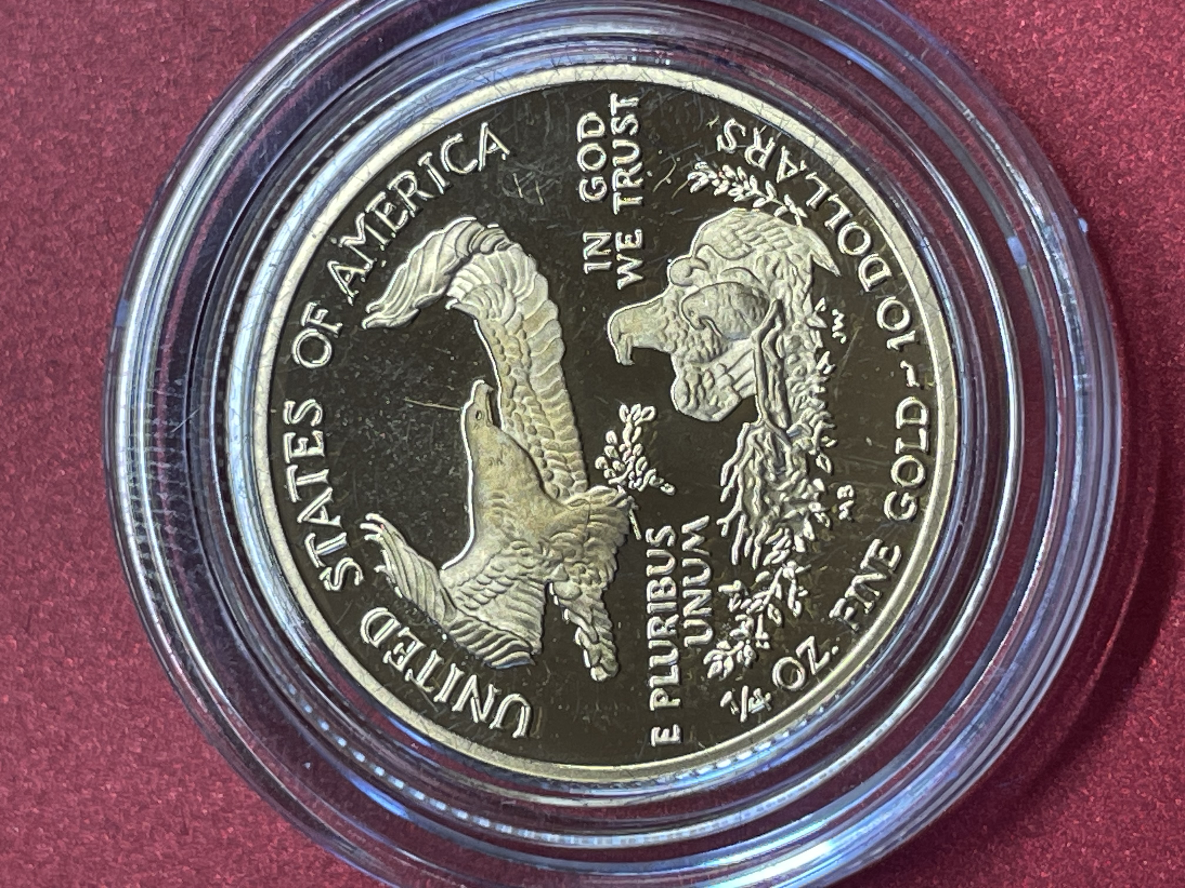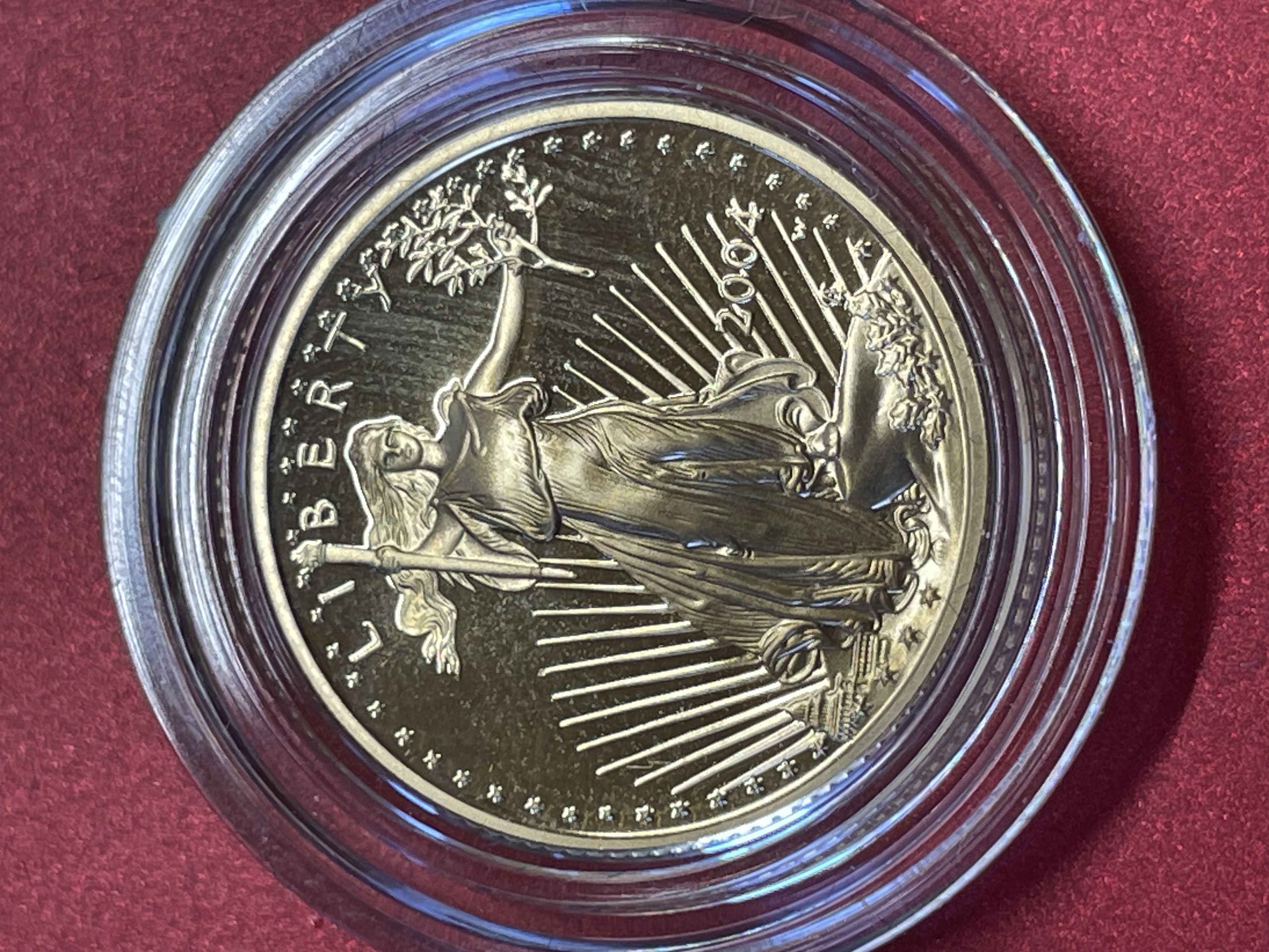 A collection of four 2004 United States Mint American Eagle gold proof coins with denominations of $50, $25, $10, and $5, containing a total of 1.85 troy ounces of fine gold and presented in a blue velvet box with a certificate of authenticity.