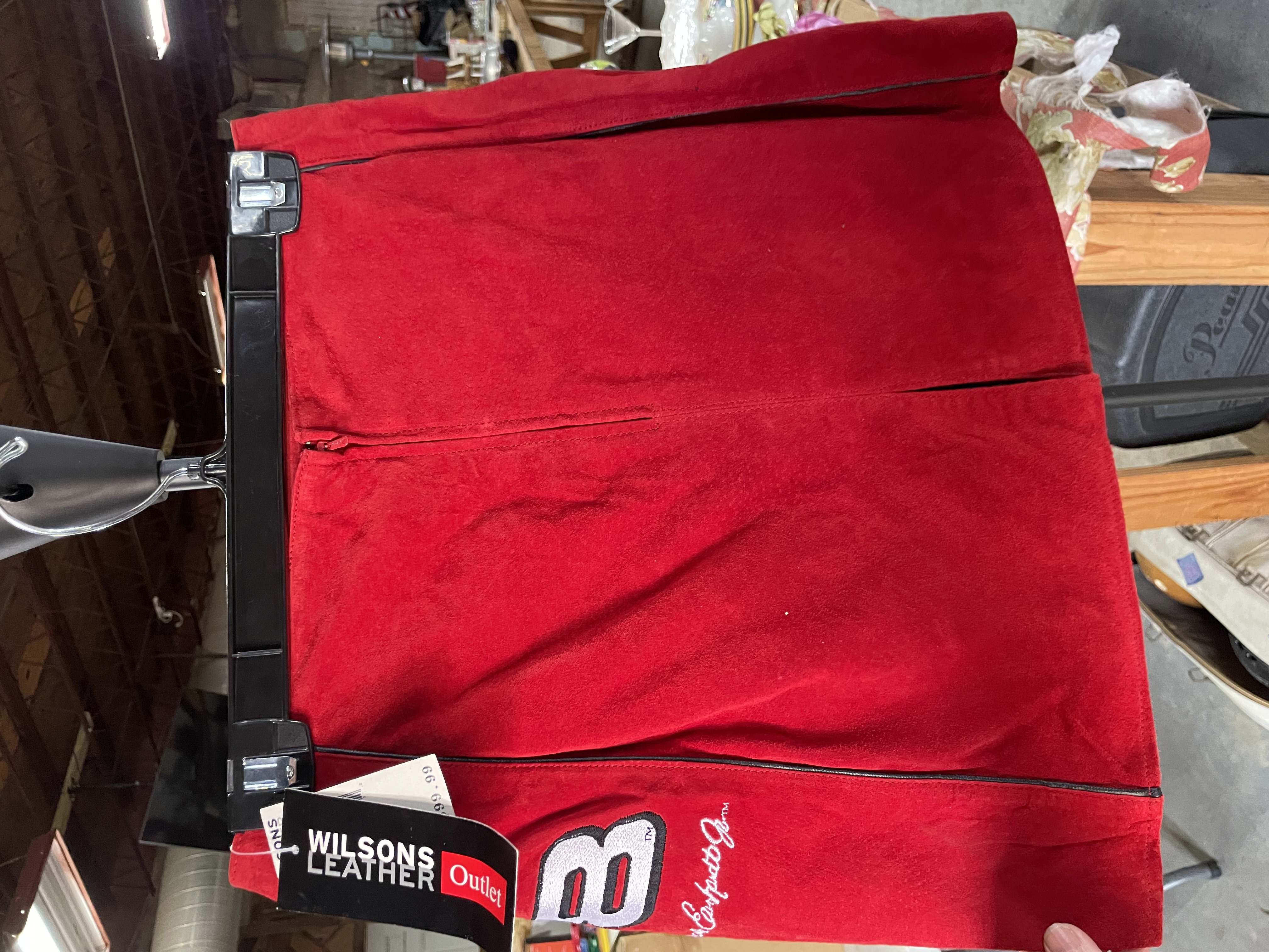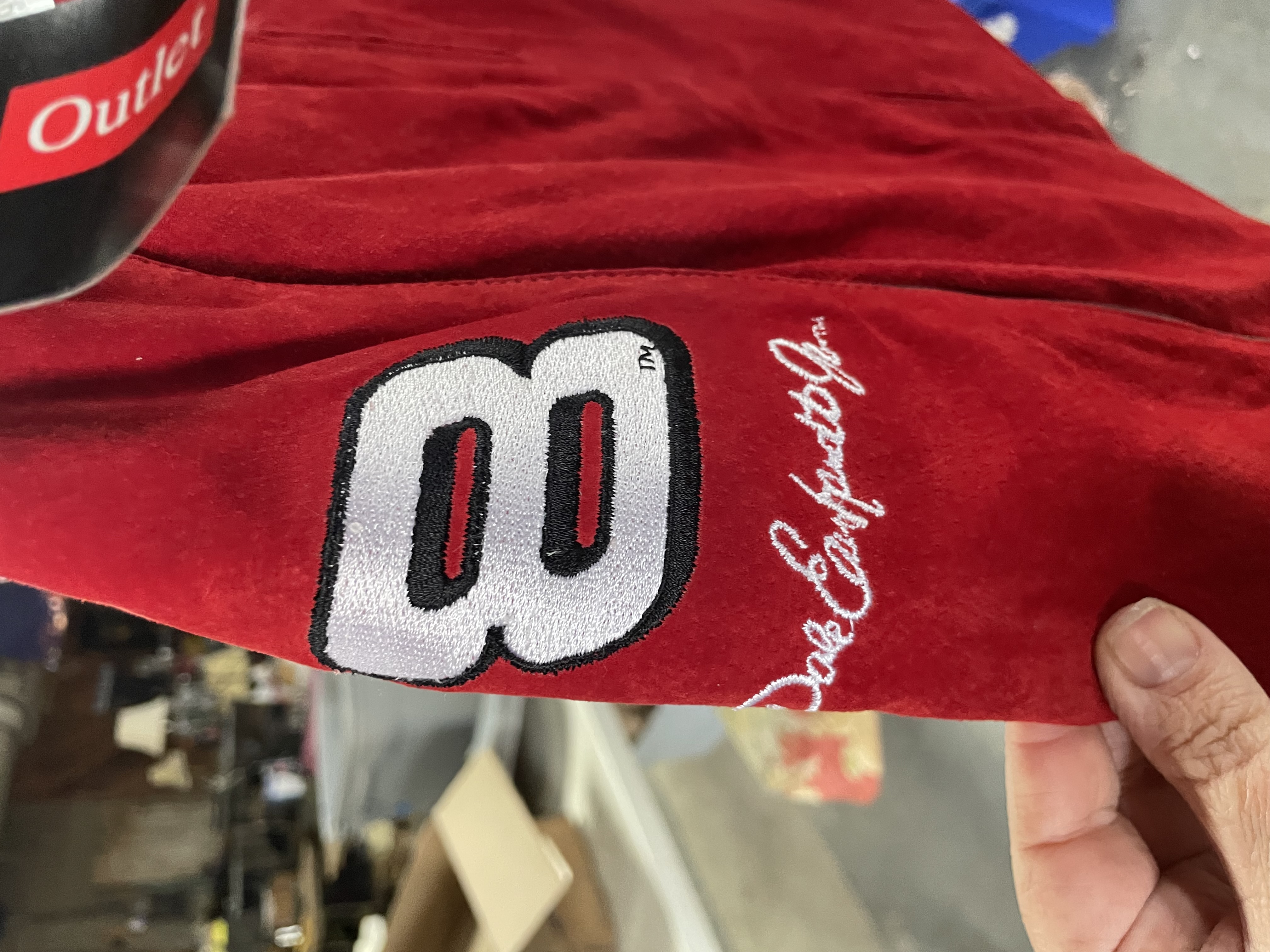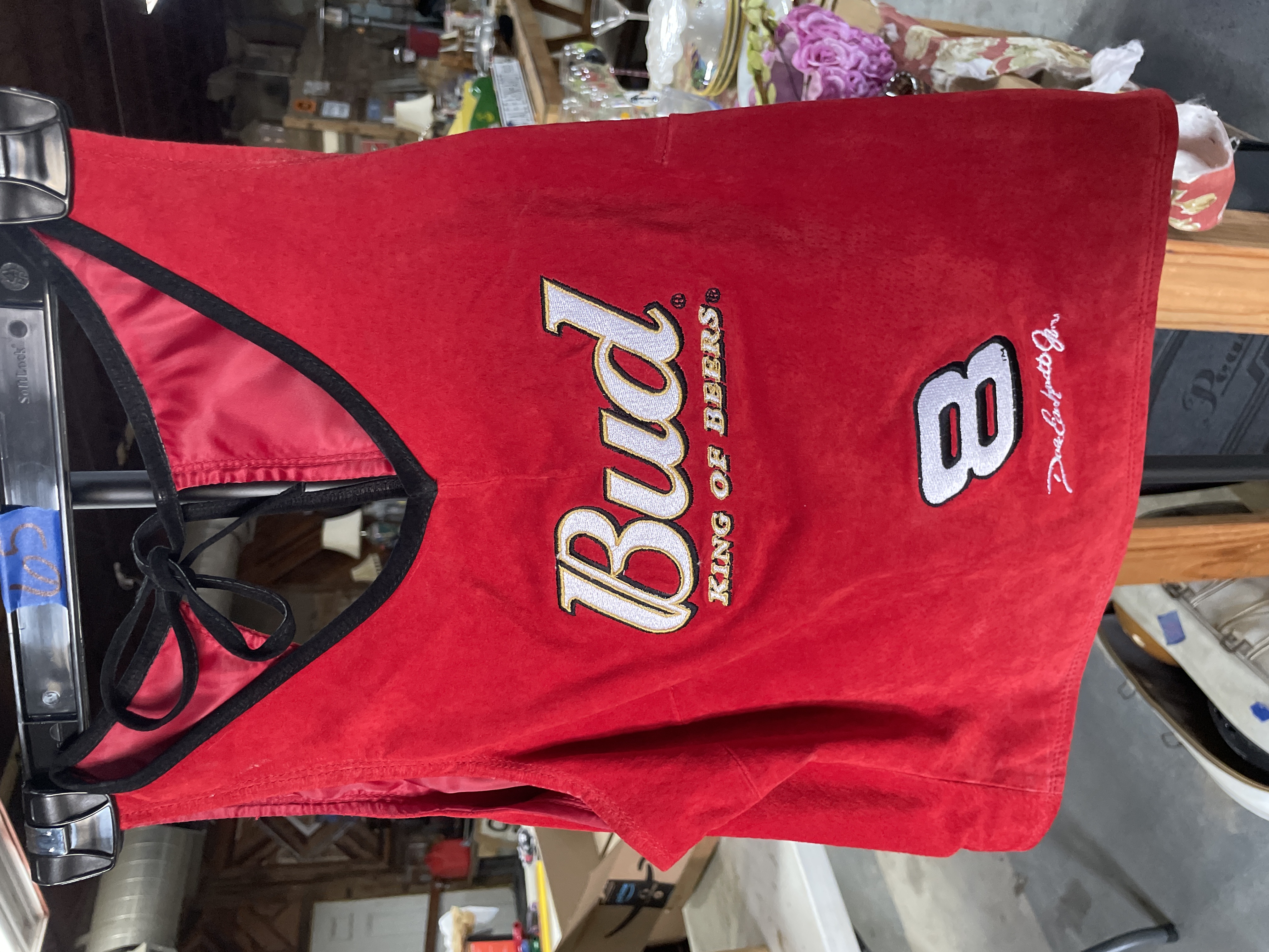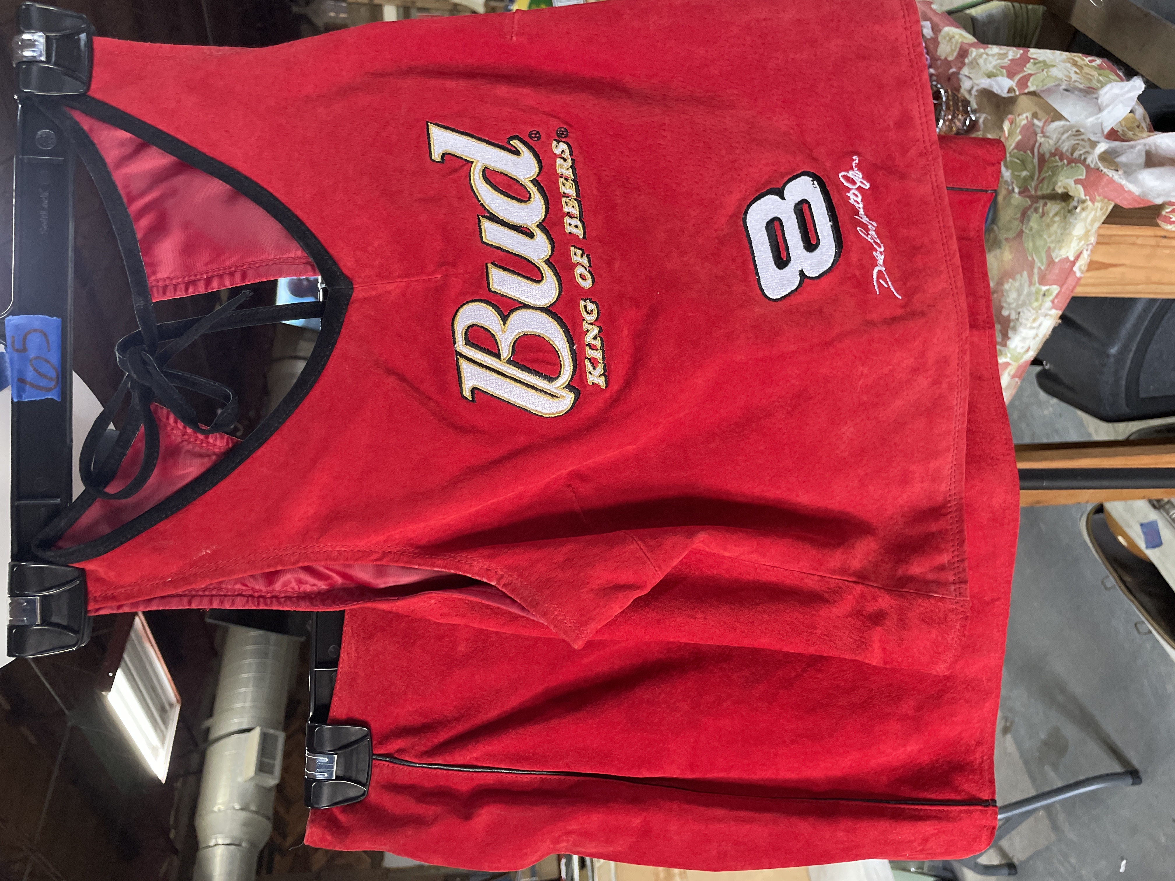 Red suede women’s apparel halter top and skirt featuring Dale Earnhardt Jr. Budweiser sponsorship patches and branding for Chase Authentics and Wilsons Leather.