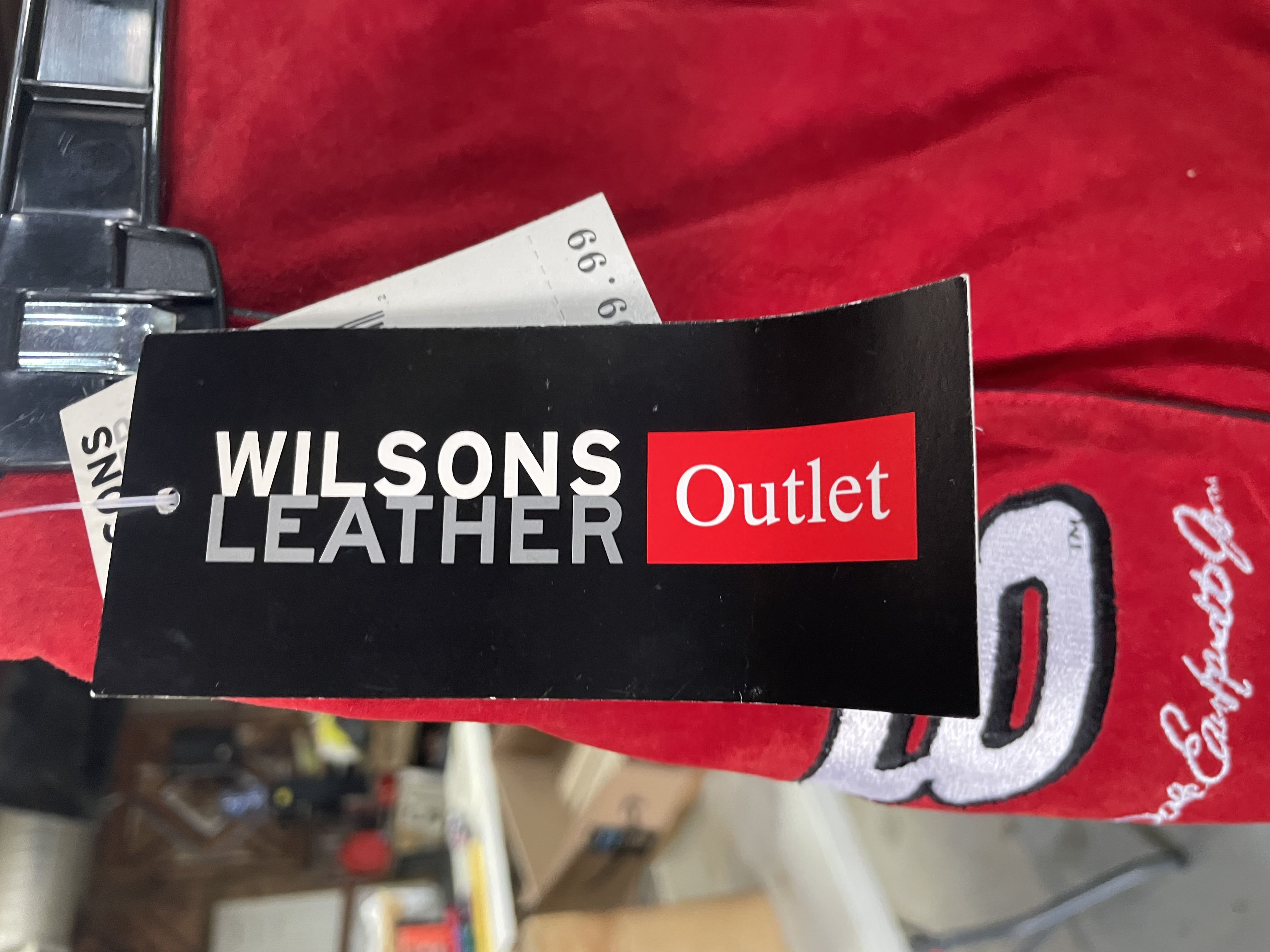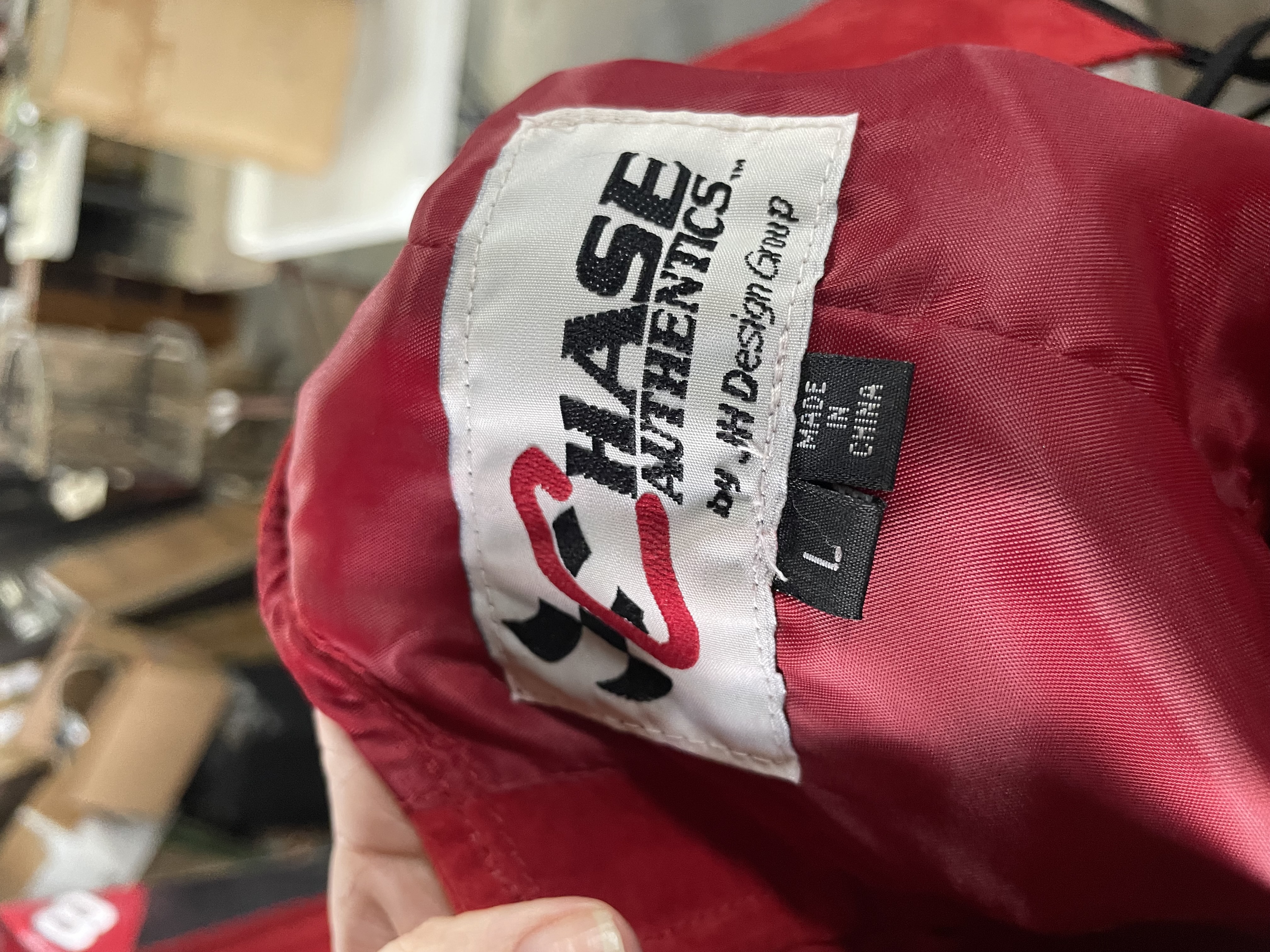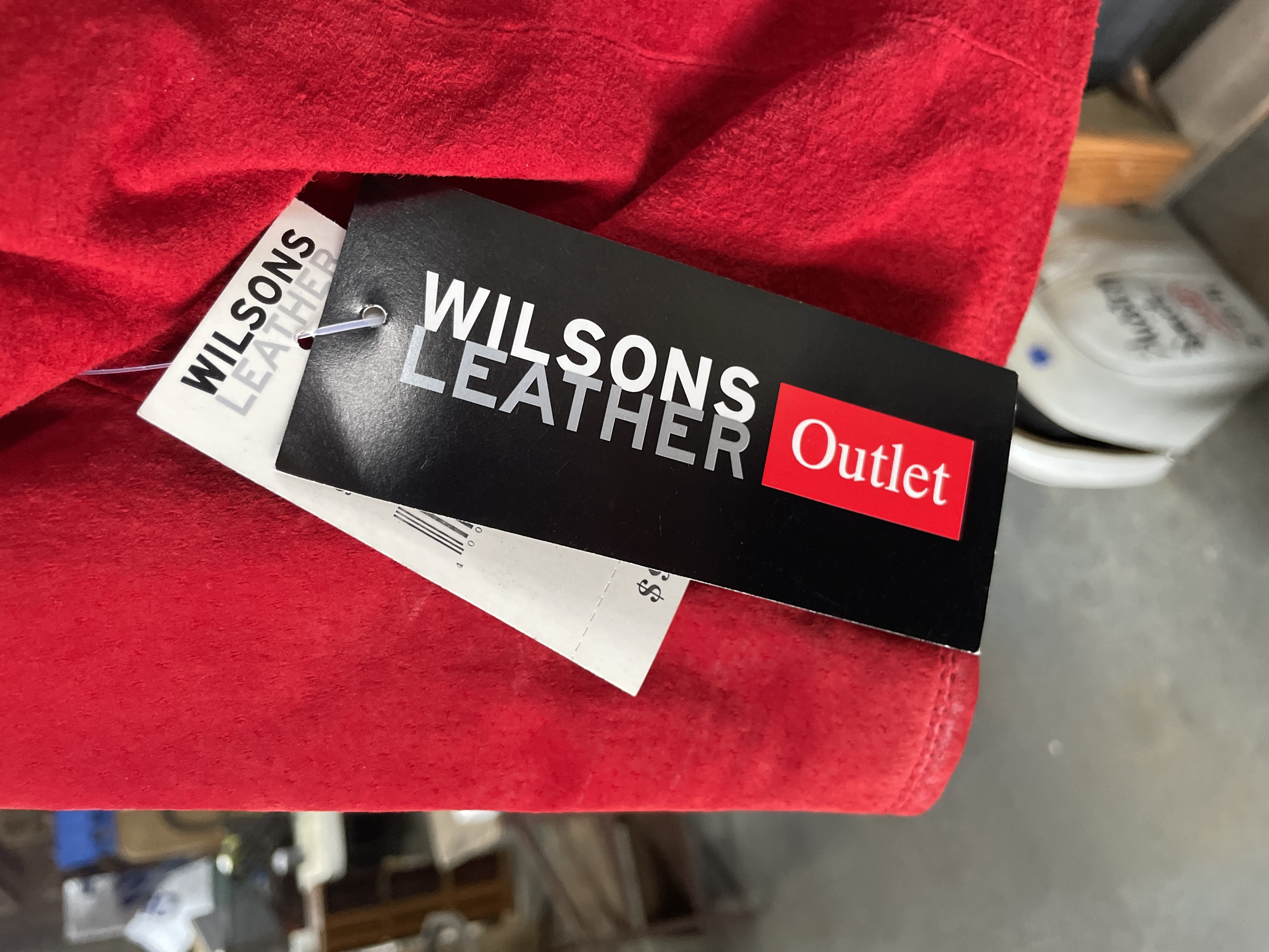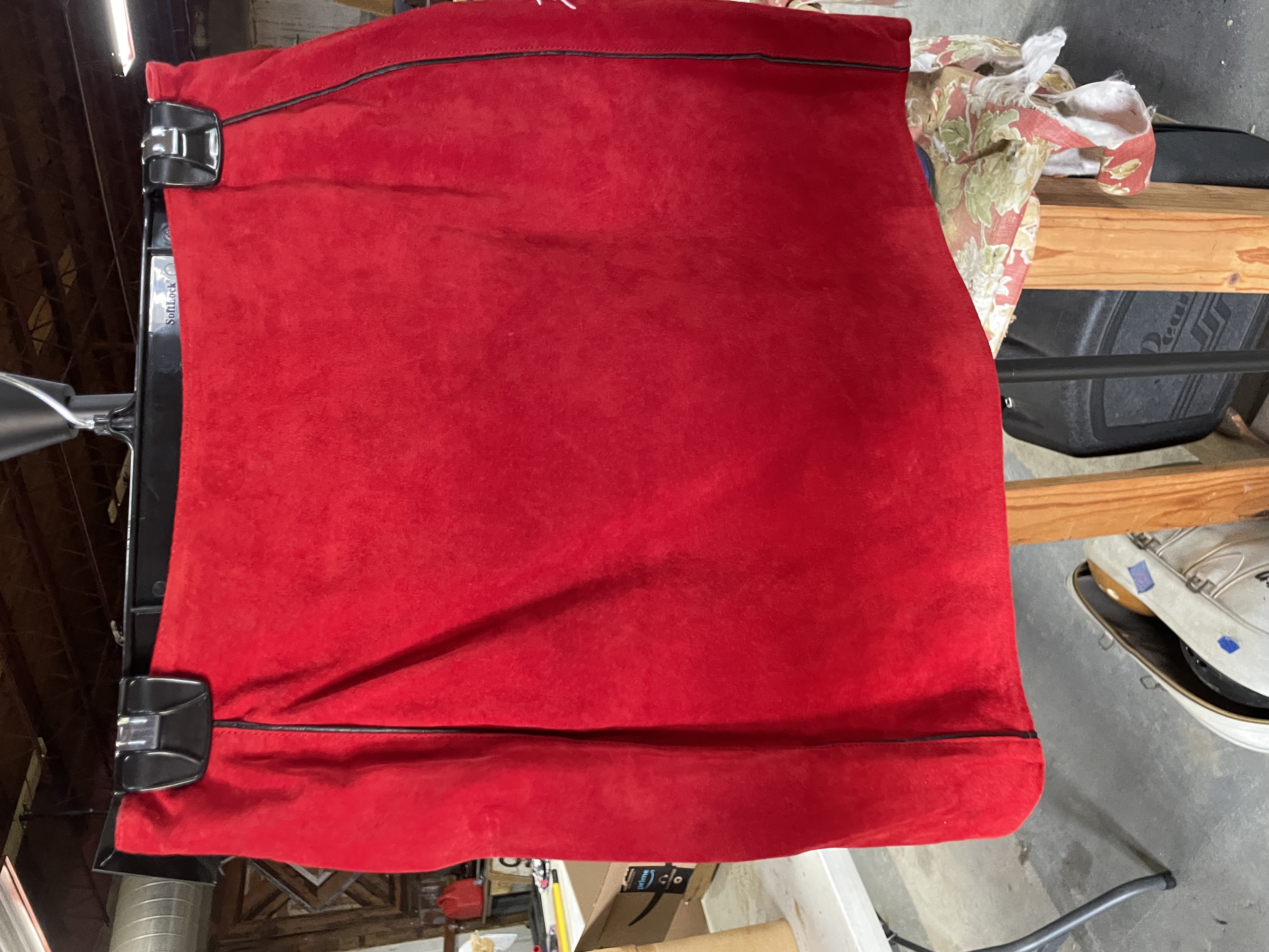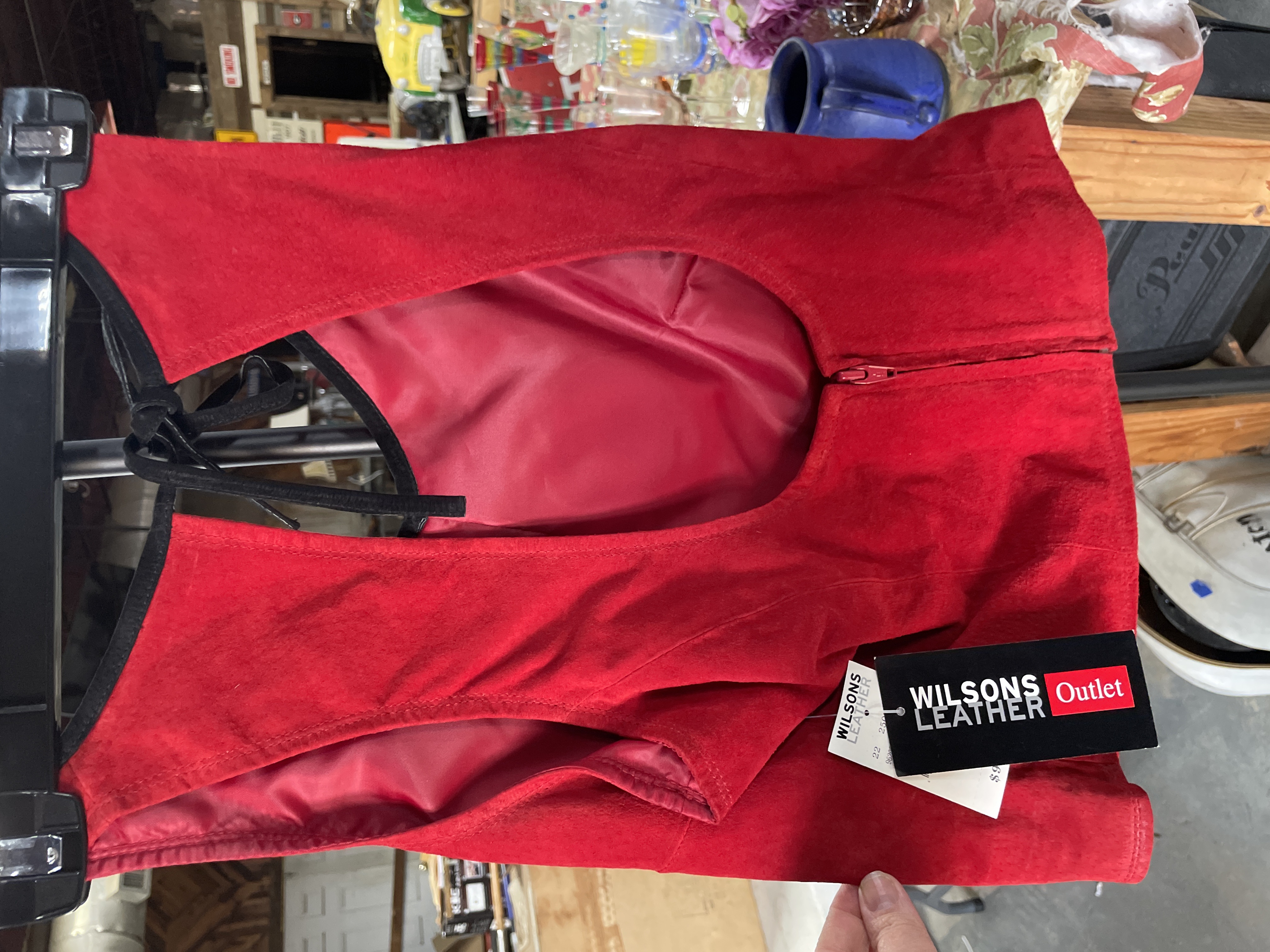 Red suede women’s apparel halter top and skirt featuring Dale Earnhardt Jr. Budweiser sponsorship patches and branding for Chase Authentics and Wilsons Leather.