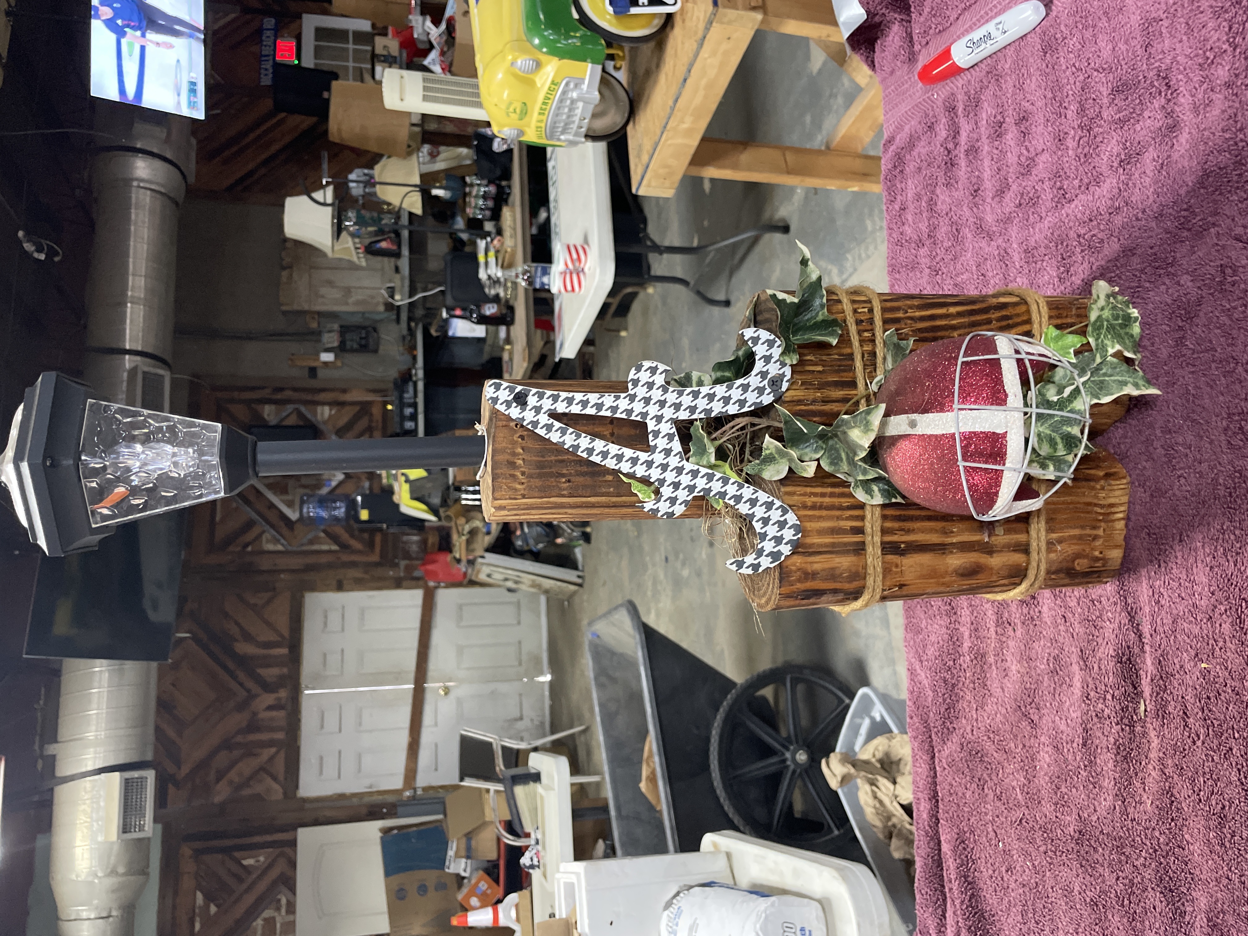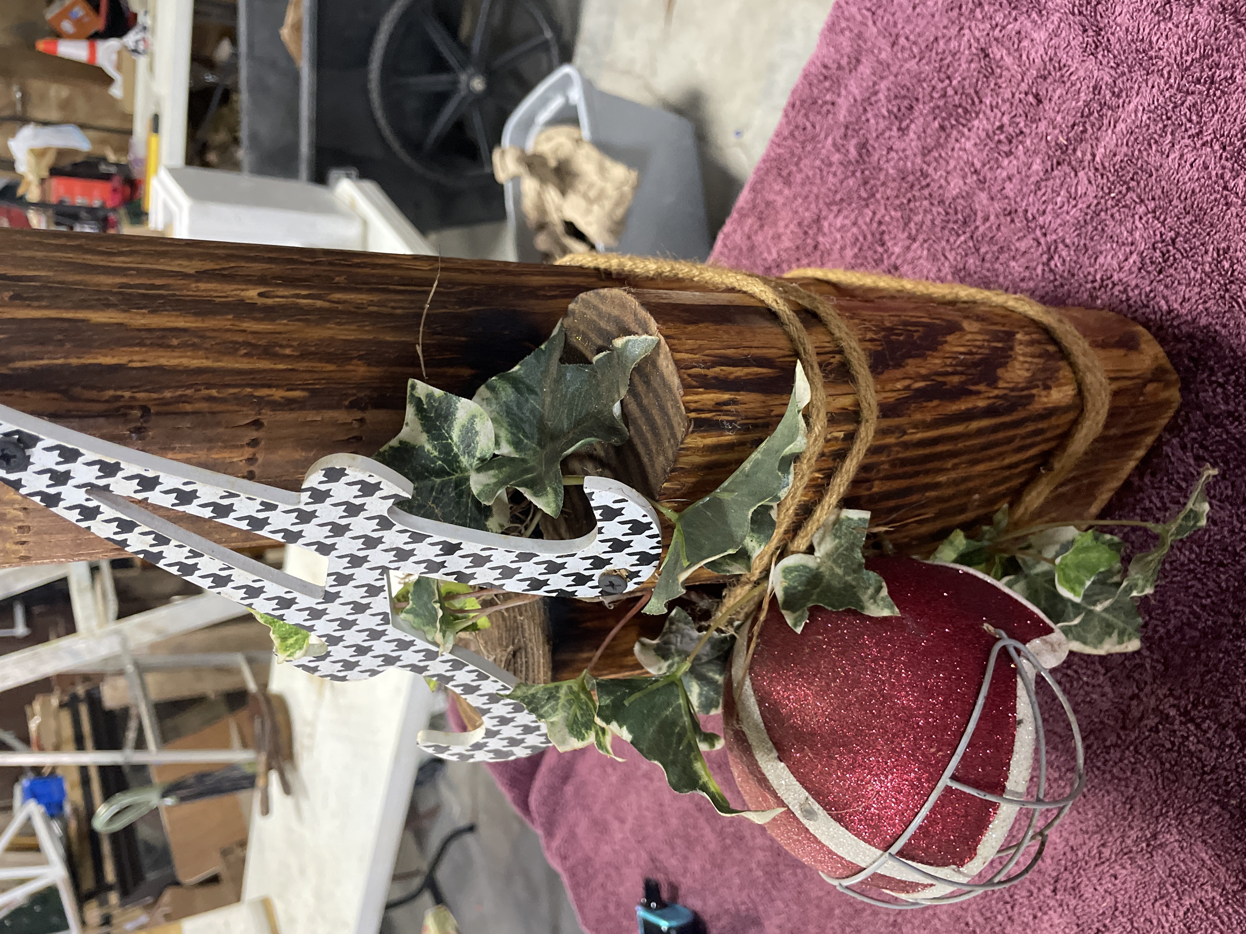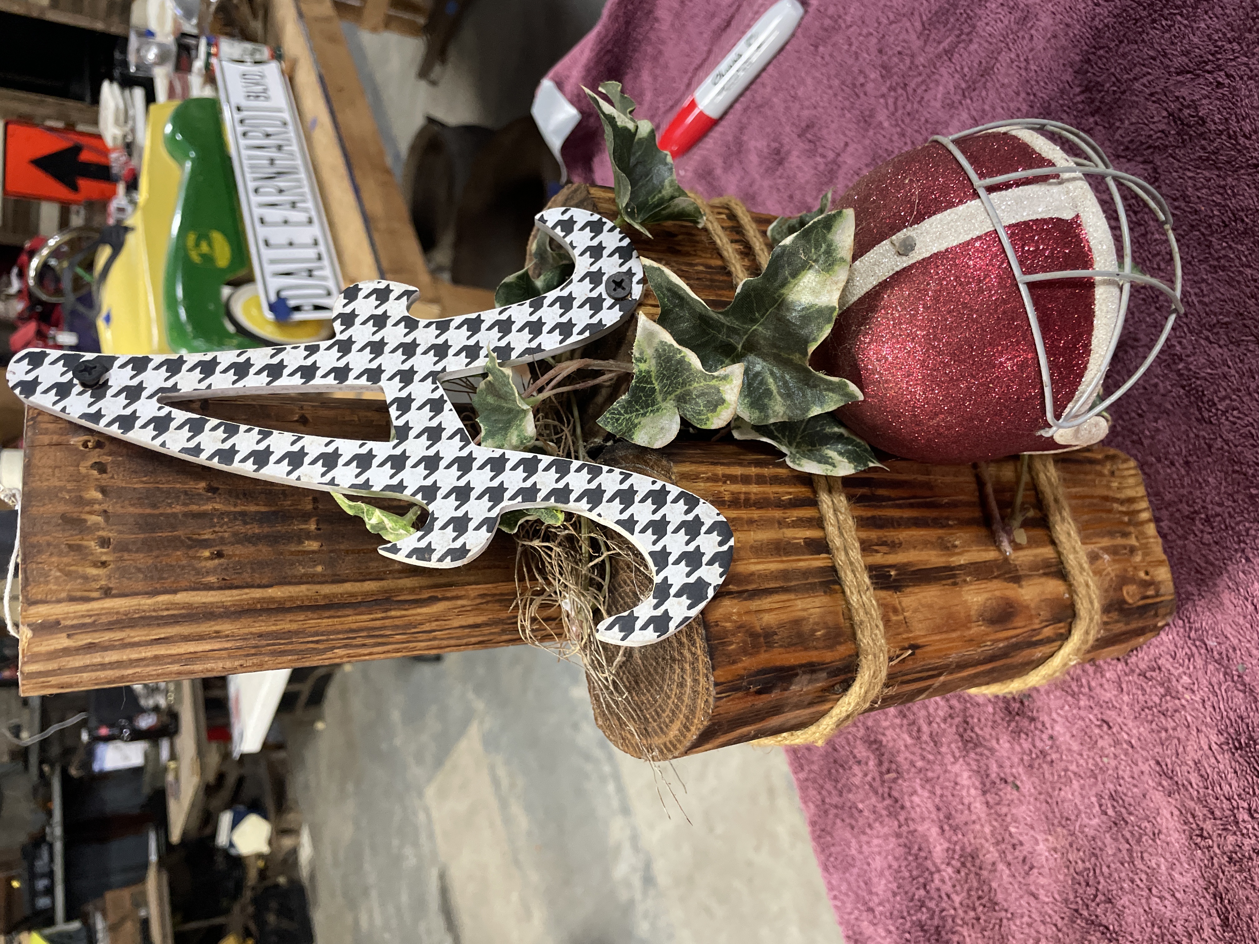 A handcrafted decorative assembly featuring dark-stained wooden logs bound with rope, a solar-powered garden light, faux ivy, a red glitter football ornament, and a houndstooth-patterned letter A, measuring approximately 22 inches in length.
