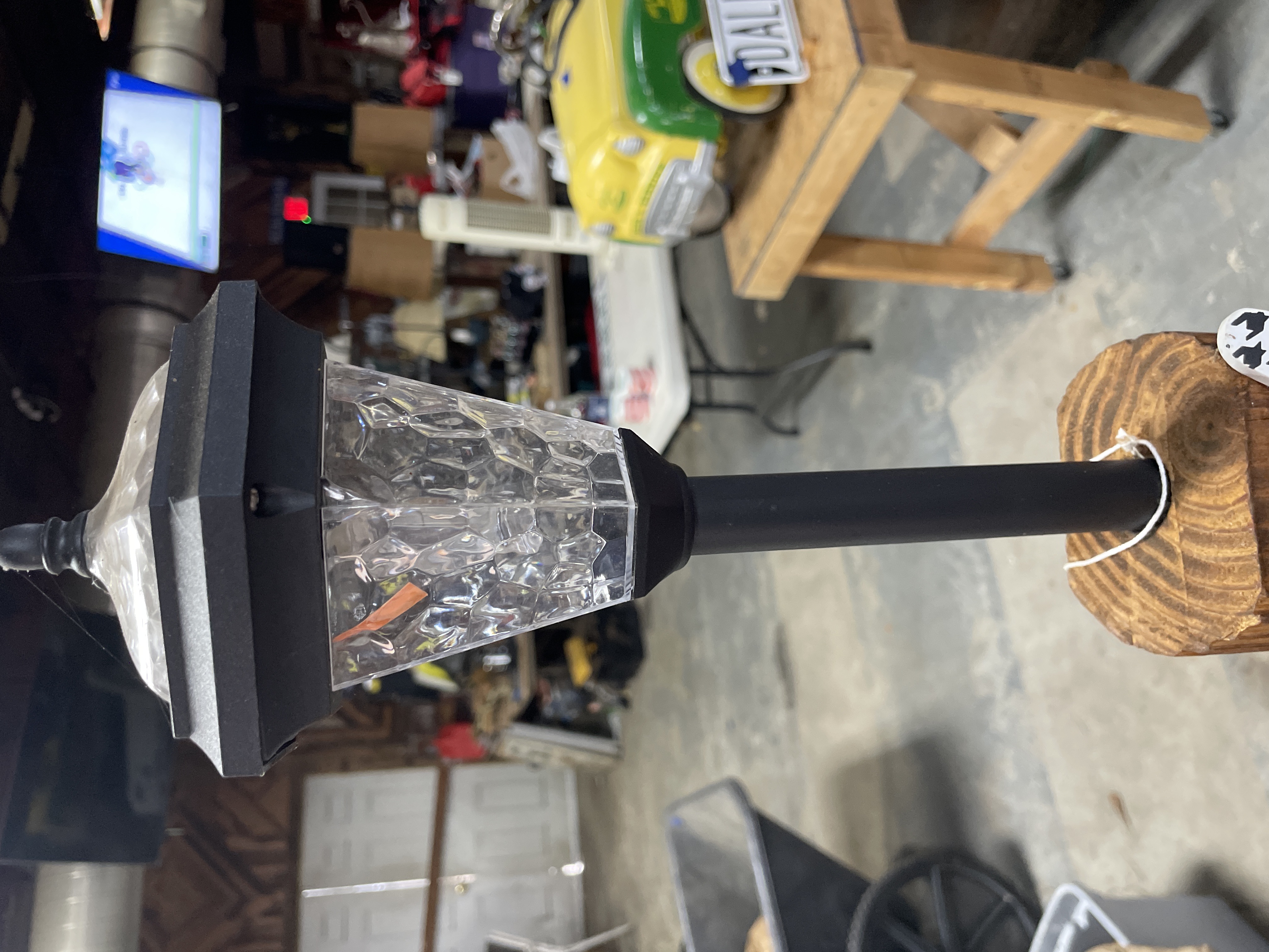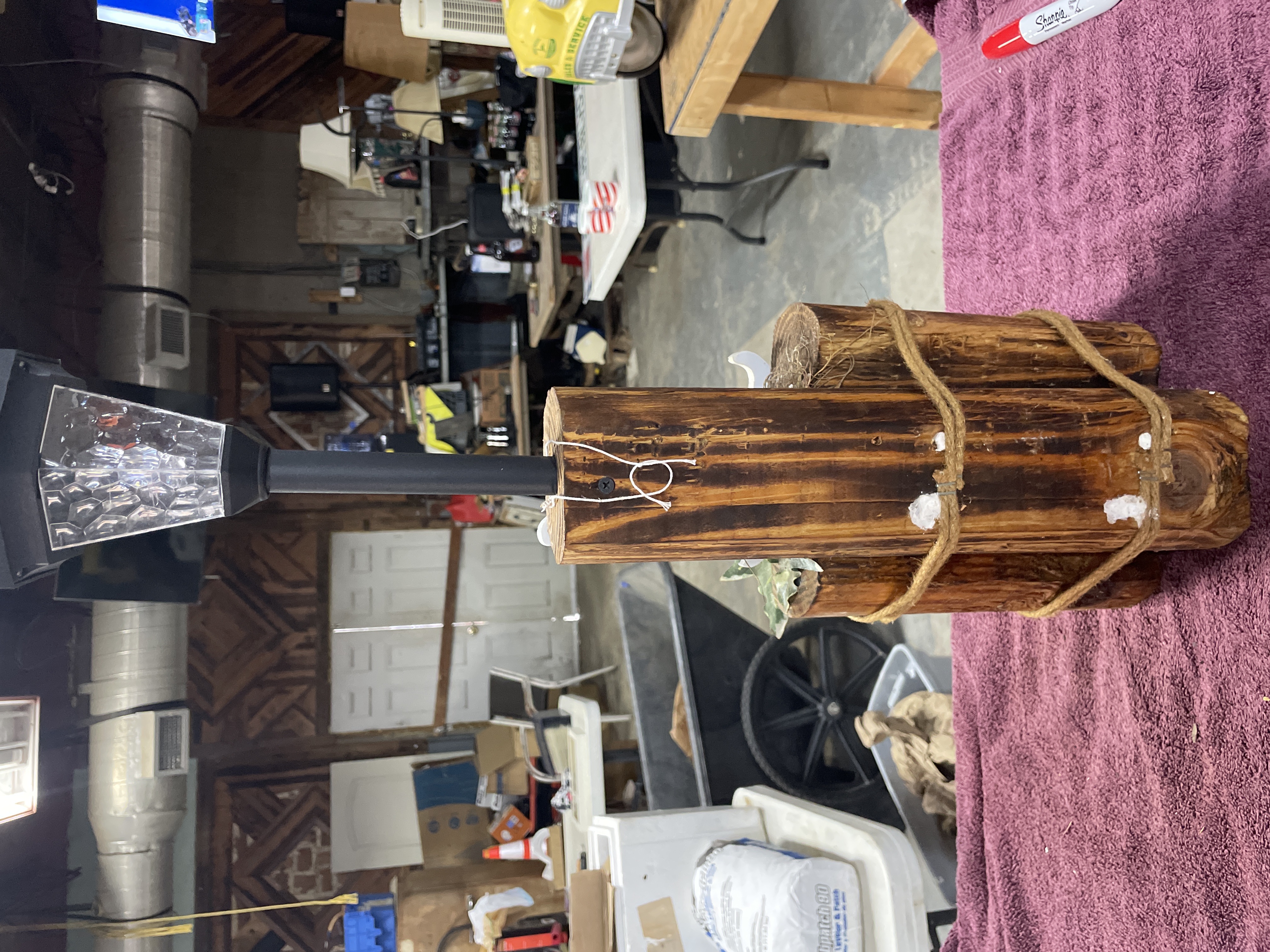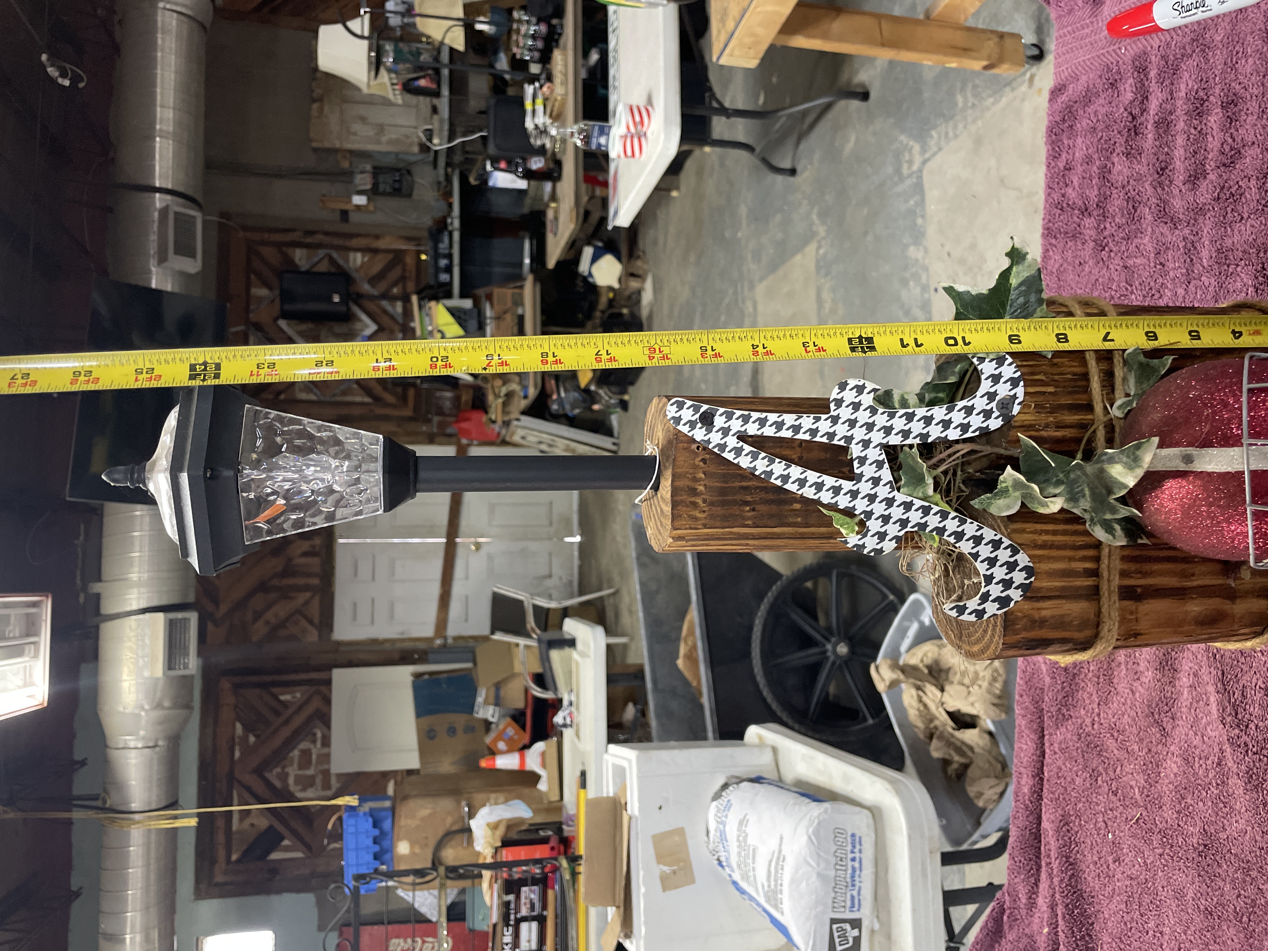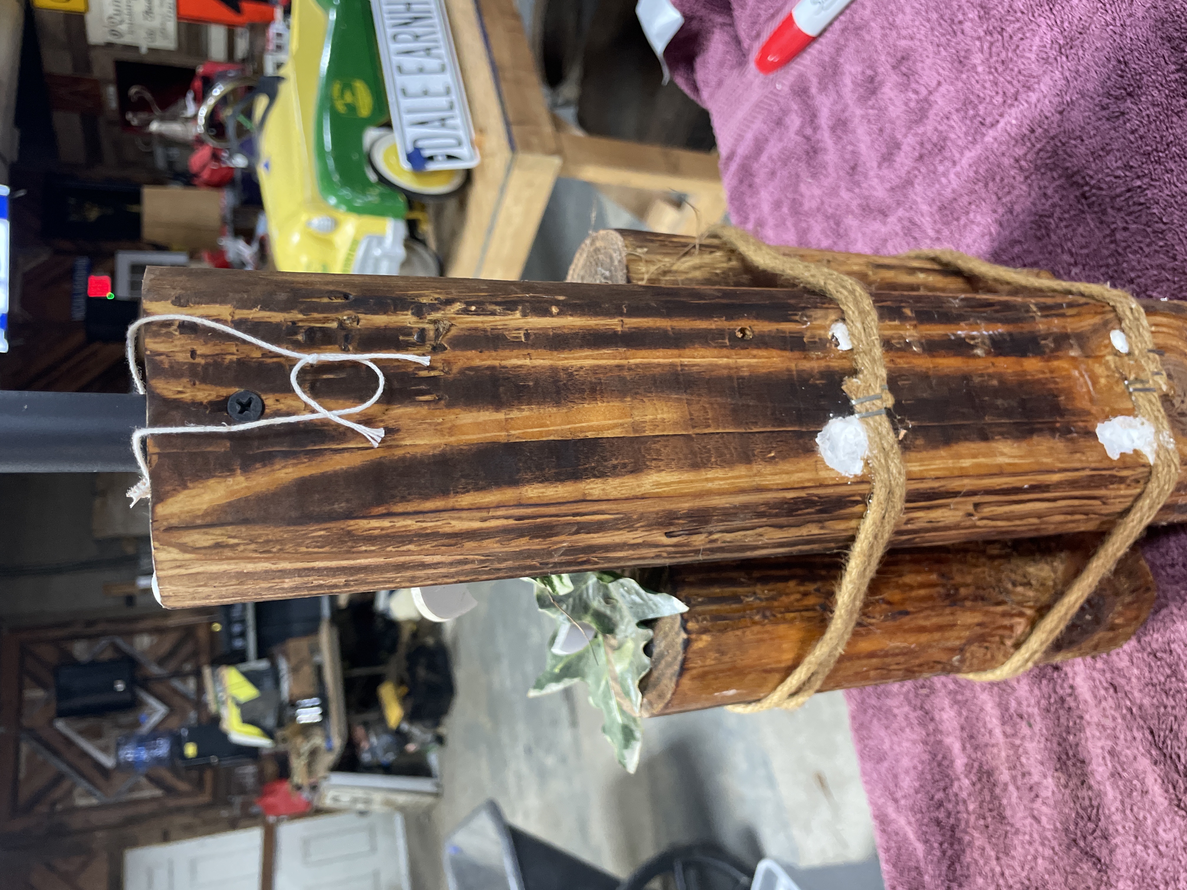 A handcrafted decorative assembly featuring dark-stained wooden logs bound with rope, a solar-powered garden light, faux ivy, a red glitter football ornament, and a houndstooth-patterned letter A, measuring approximately 22 inches in length.