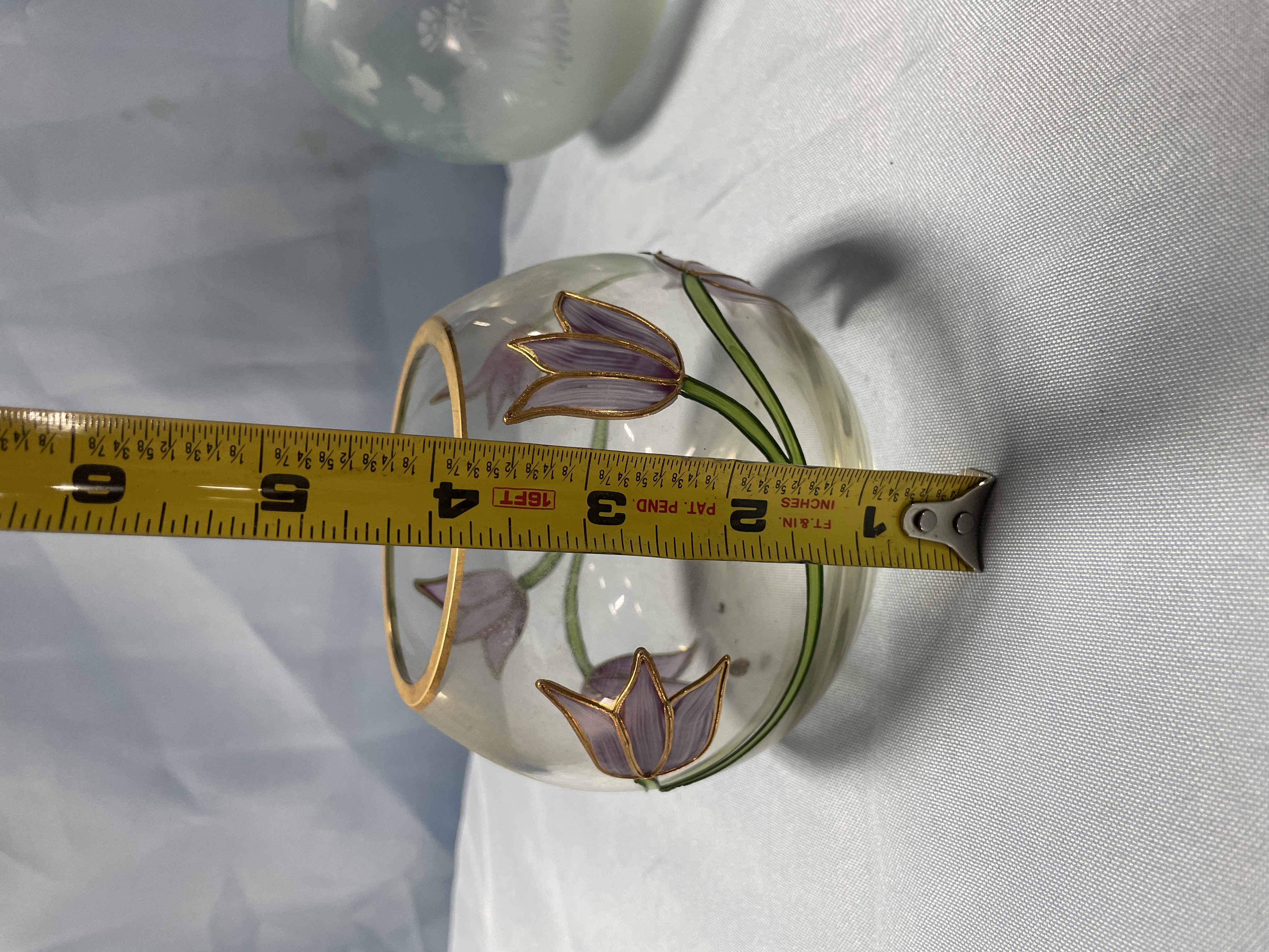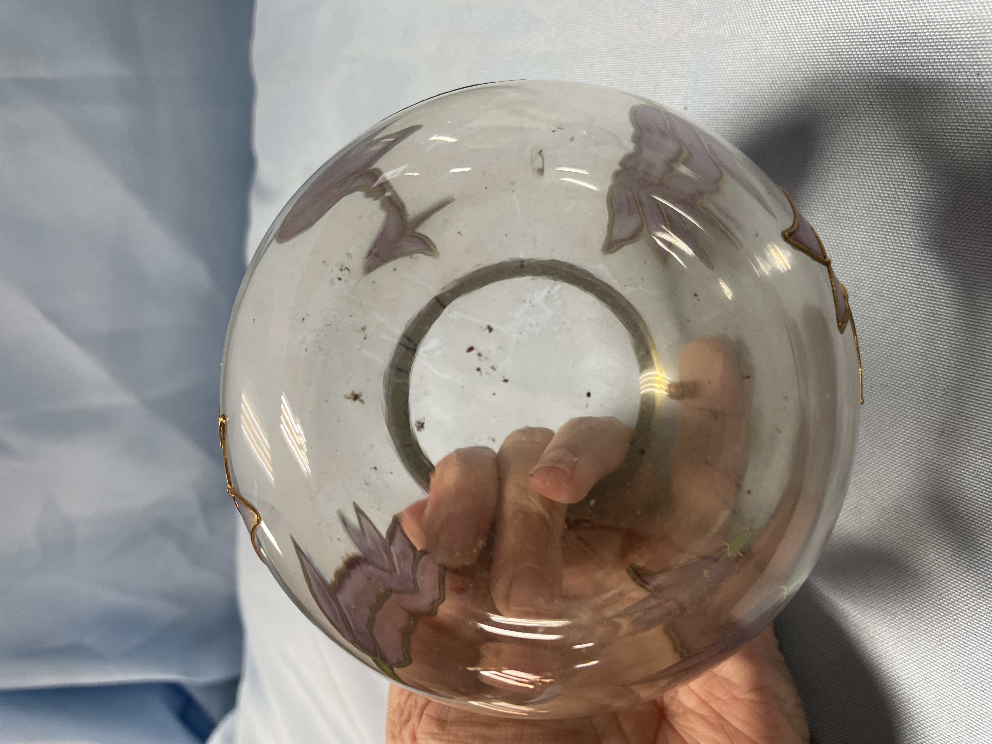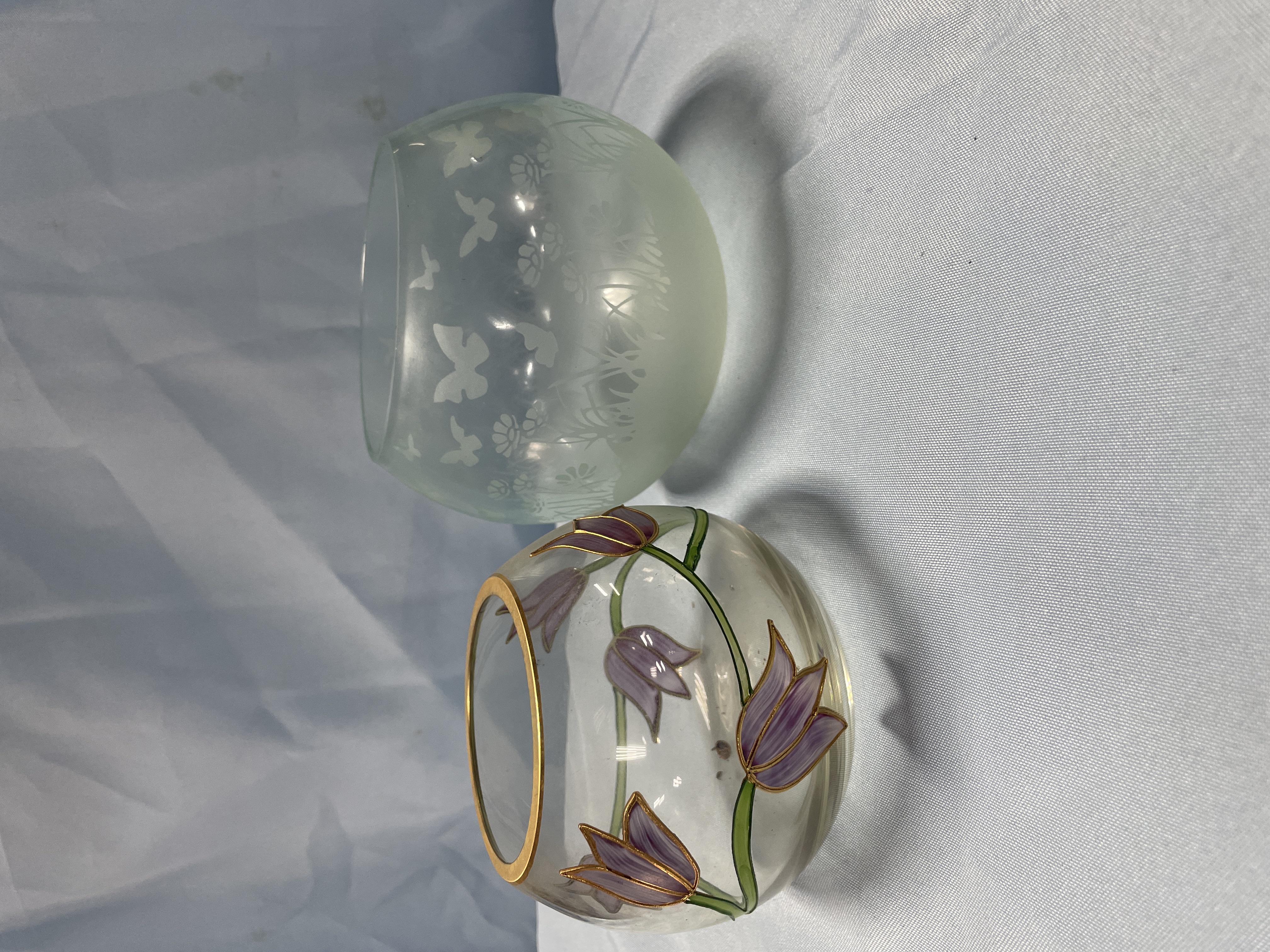 A collection of two decorative glass bowls including one light green frosted bowl with etched butterfly patterns and one clear bowl with hand-painted purple flowers and a gold rim, each measuring approximately 4.5 inches in diameter.