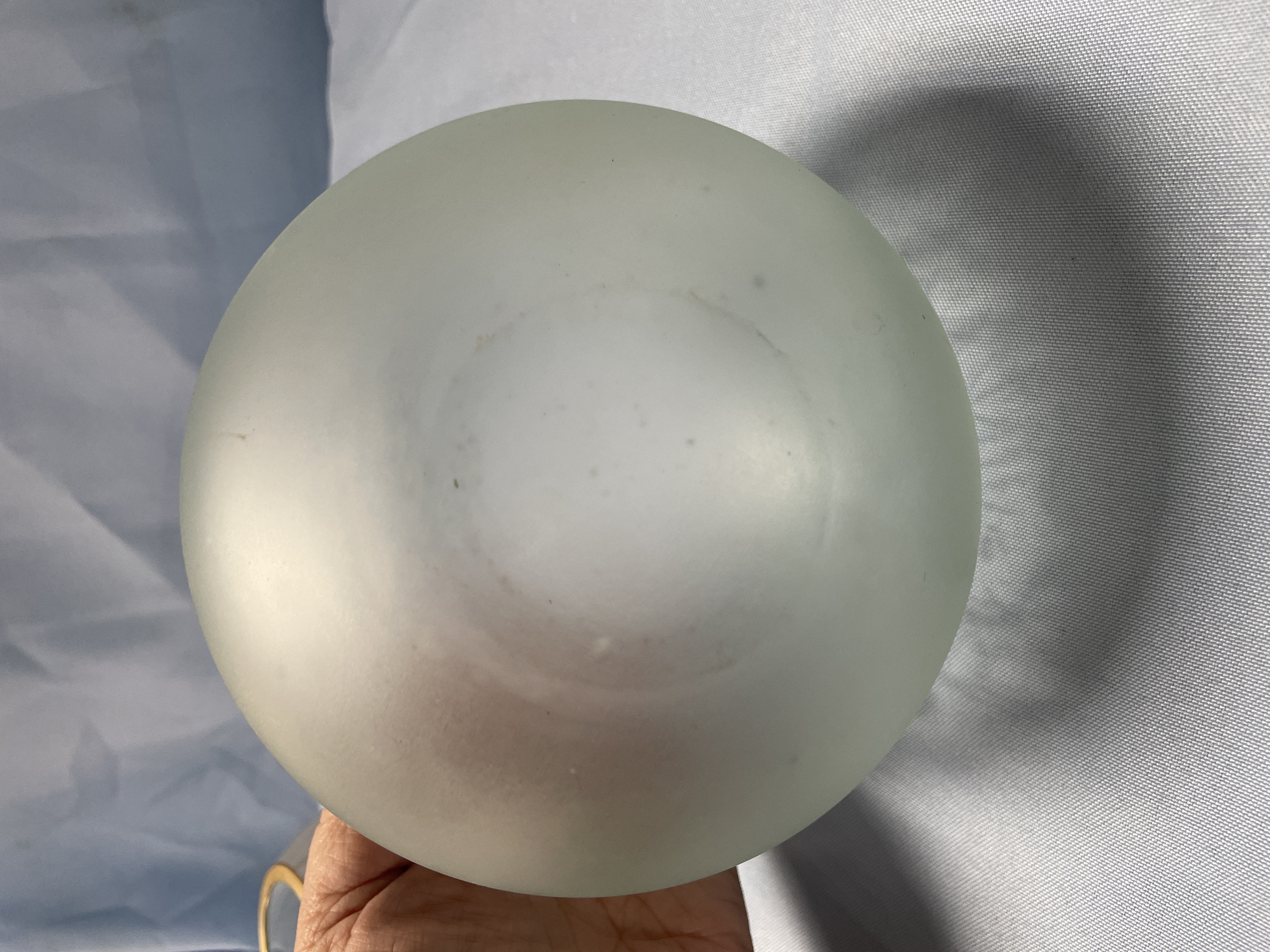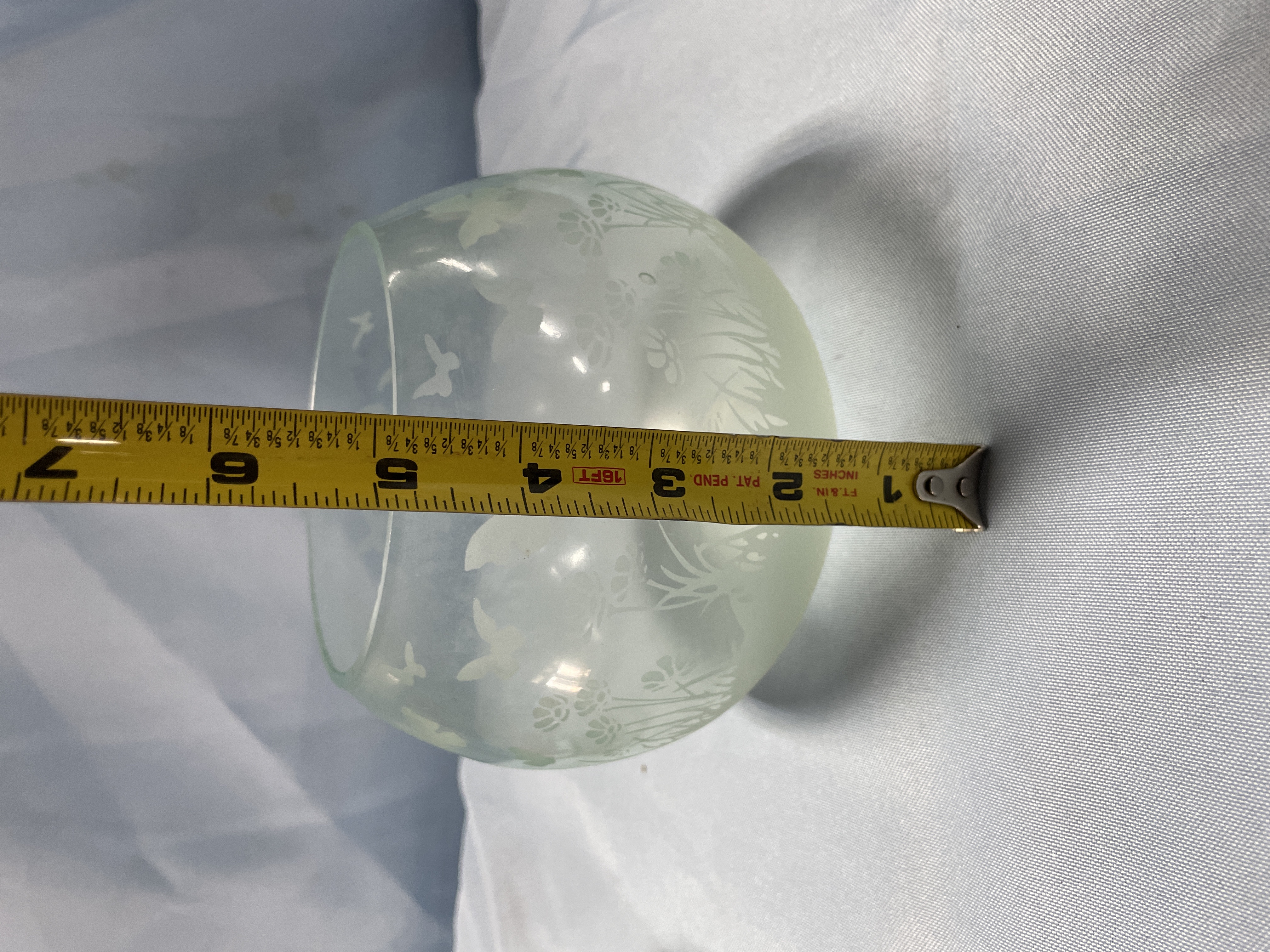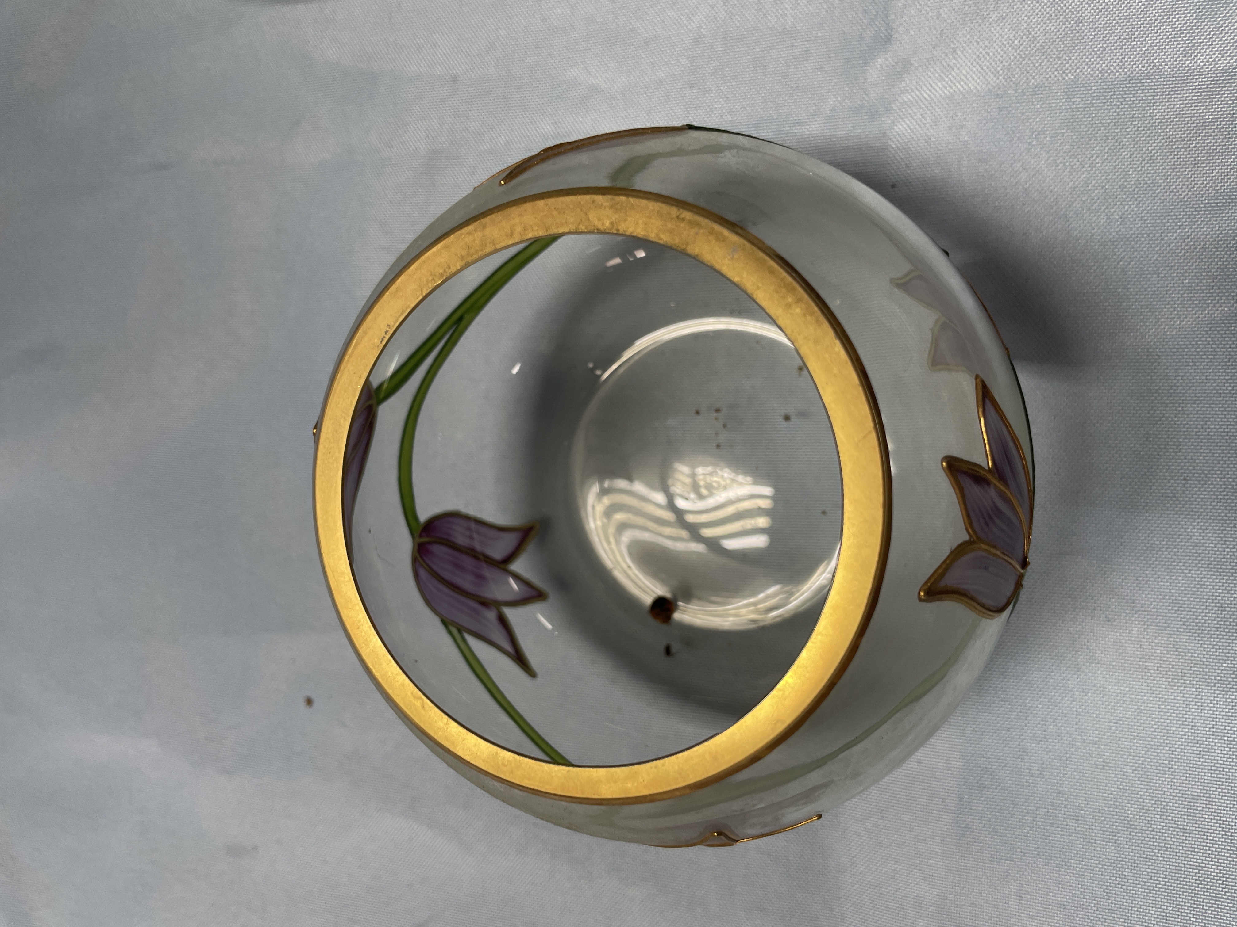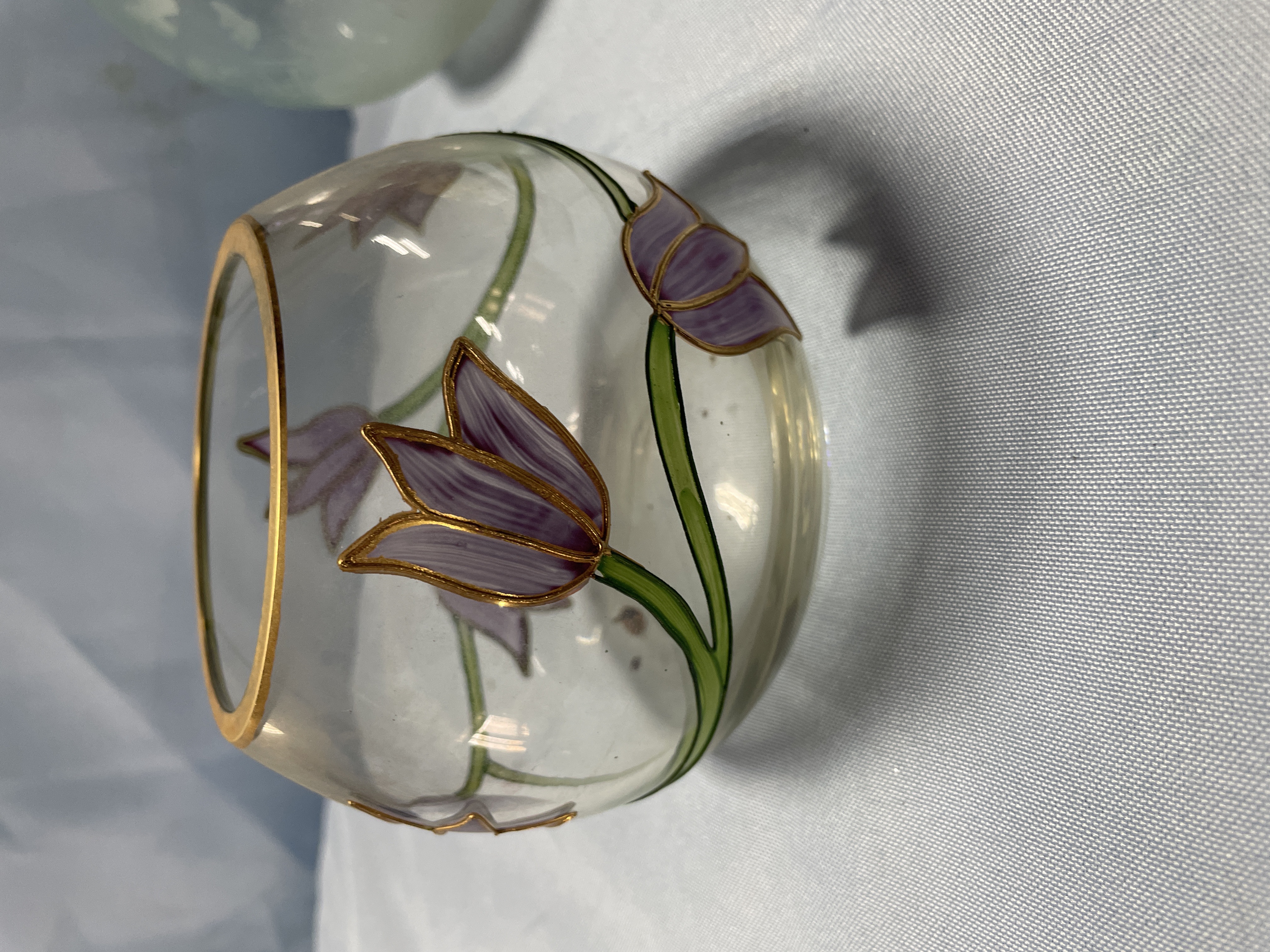 A collection of two decorative glass bowls including one light green frosted bowl with etched butterfly patterns and one clear bowl with hand-painted purple flowers and a gold rim, each measuring approximately 4.5 inches in diameter.