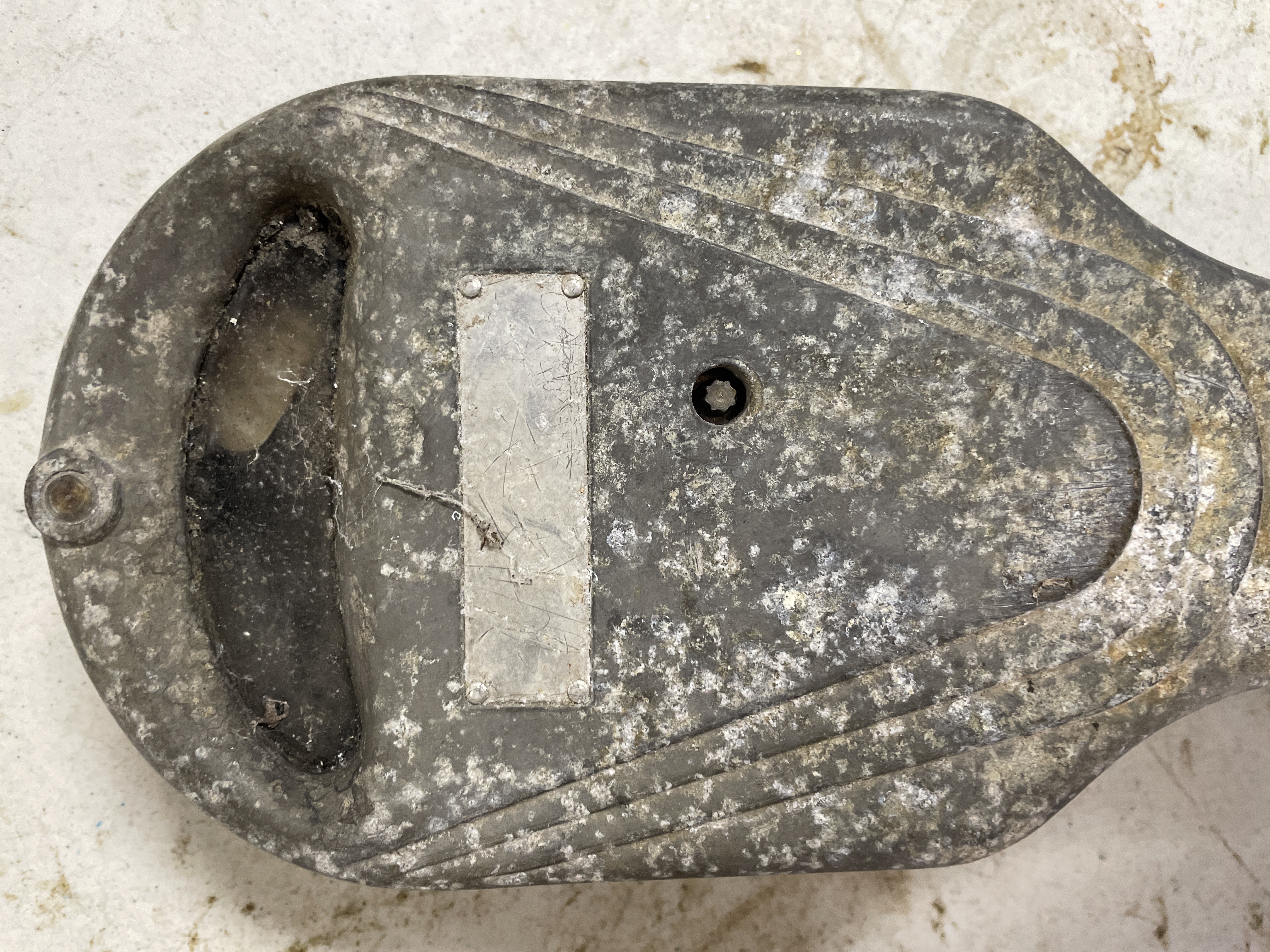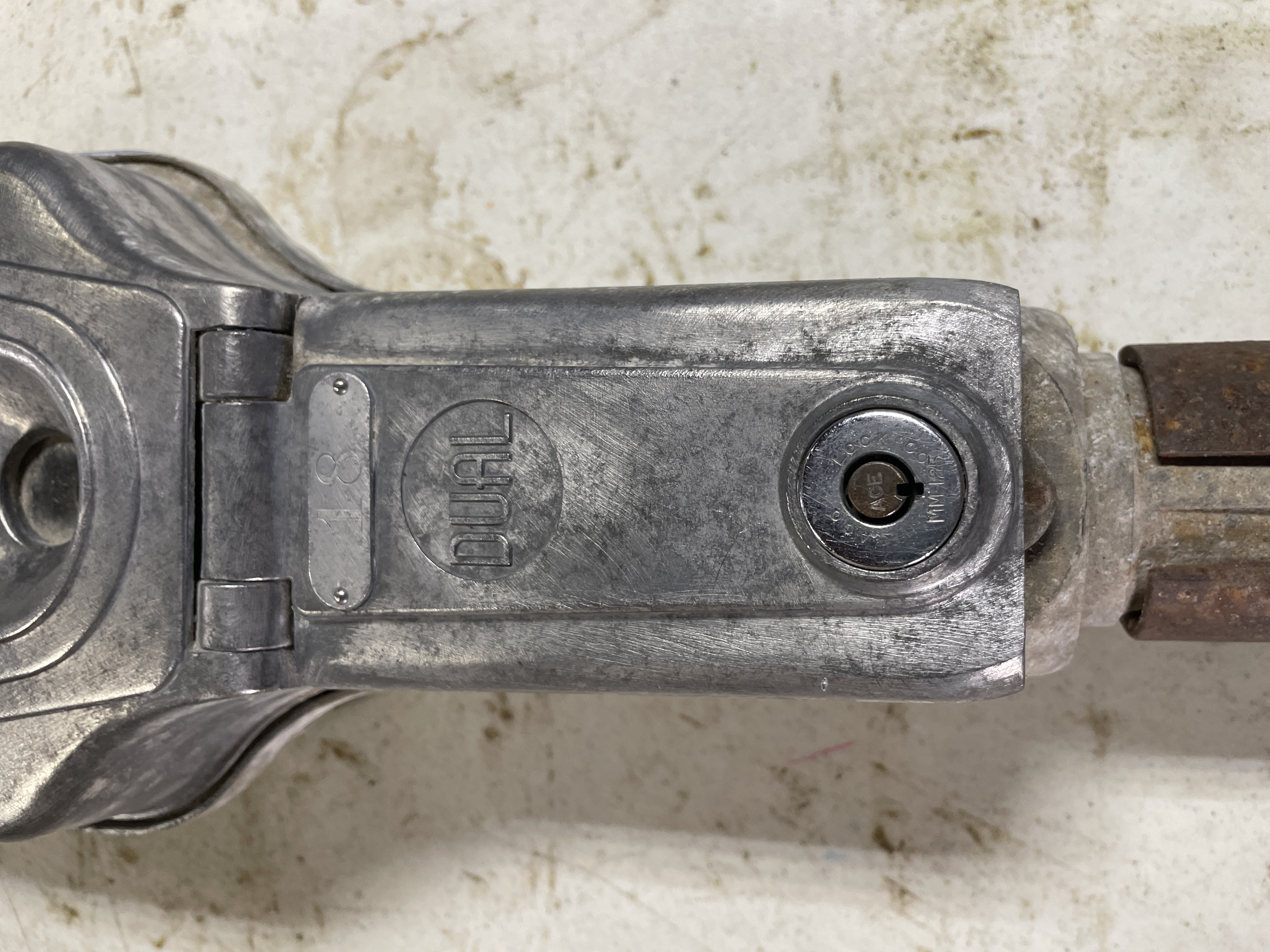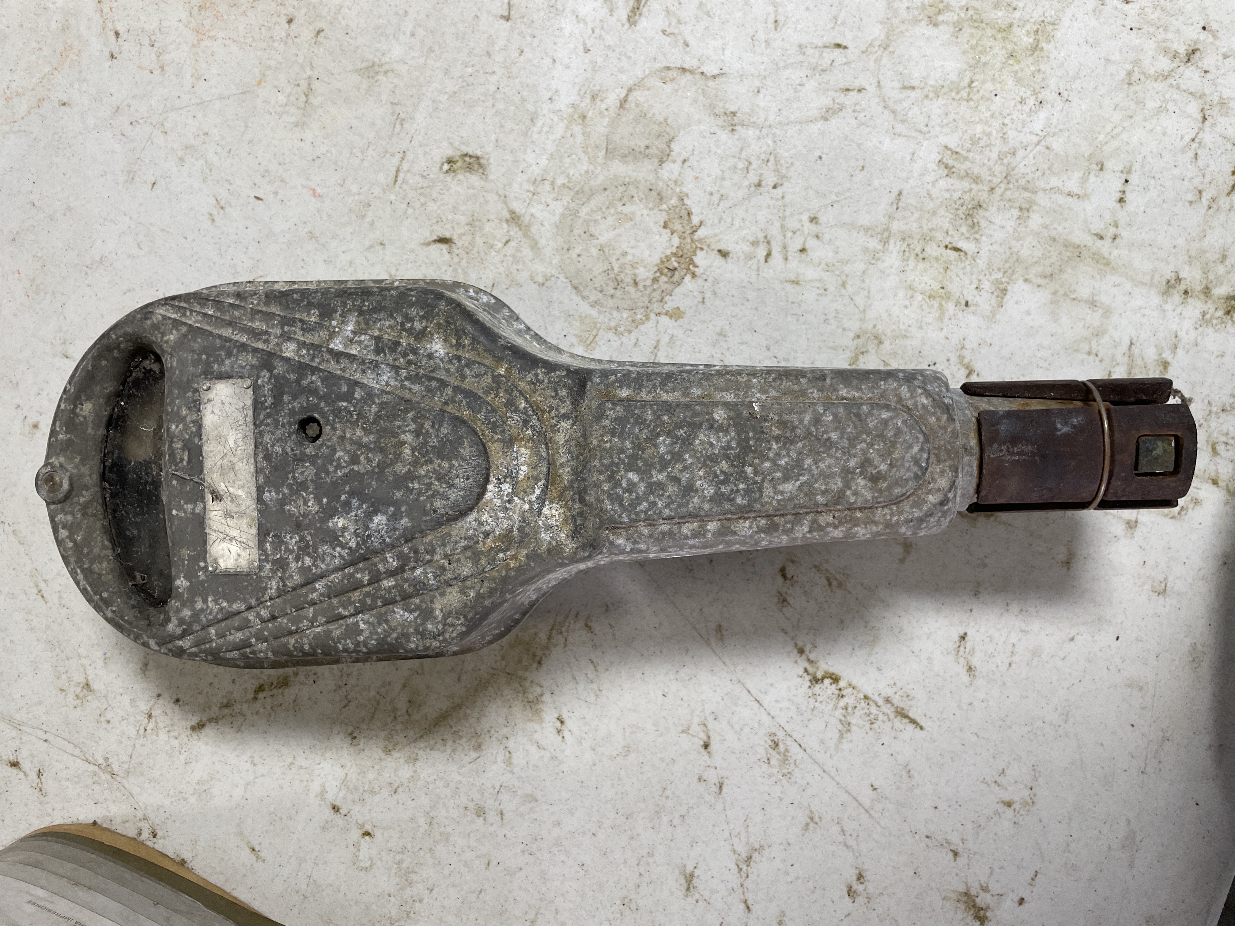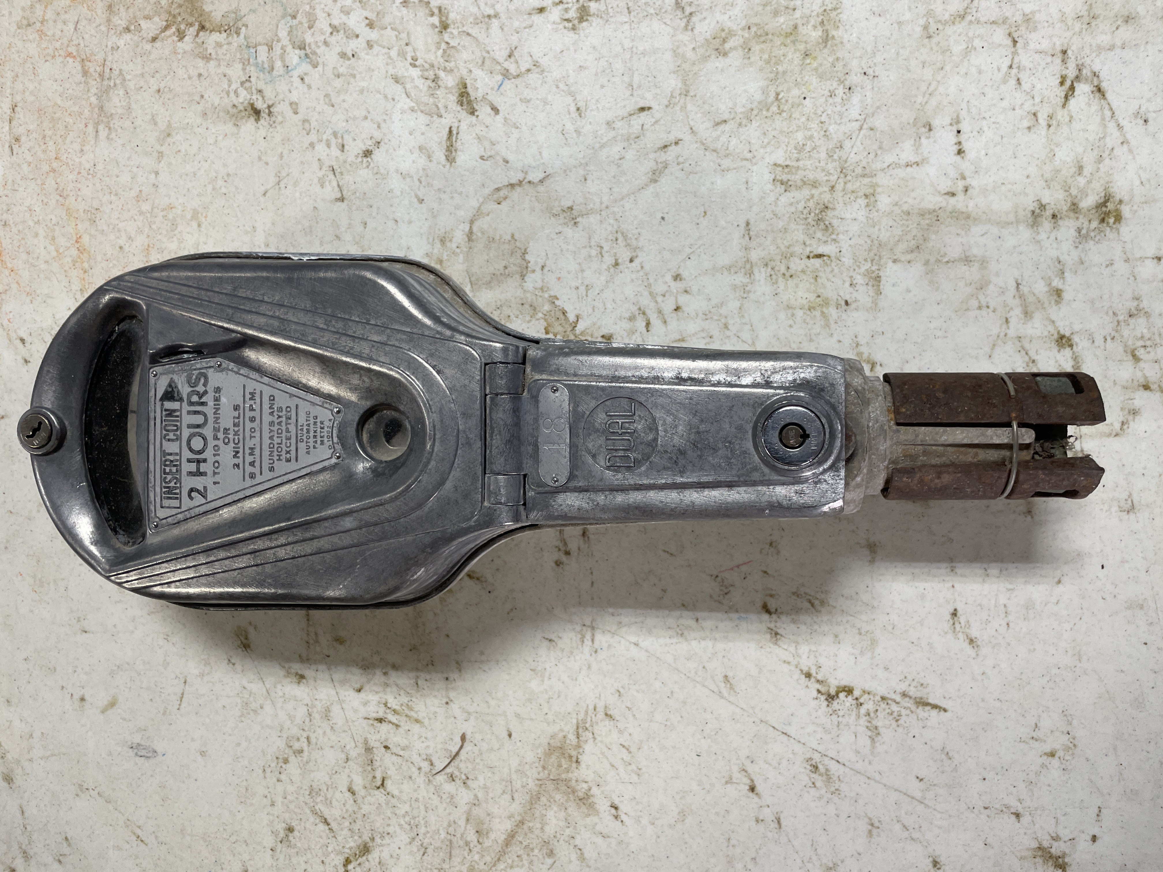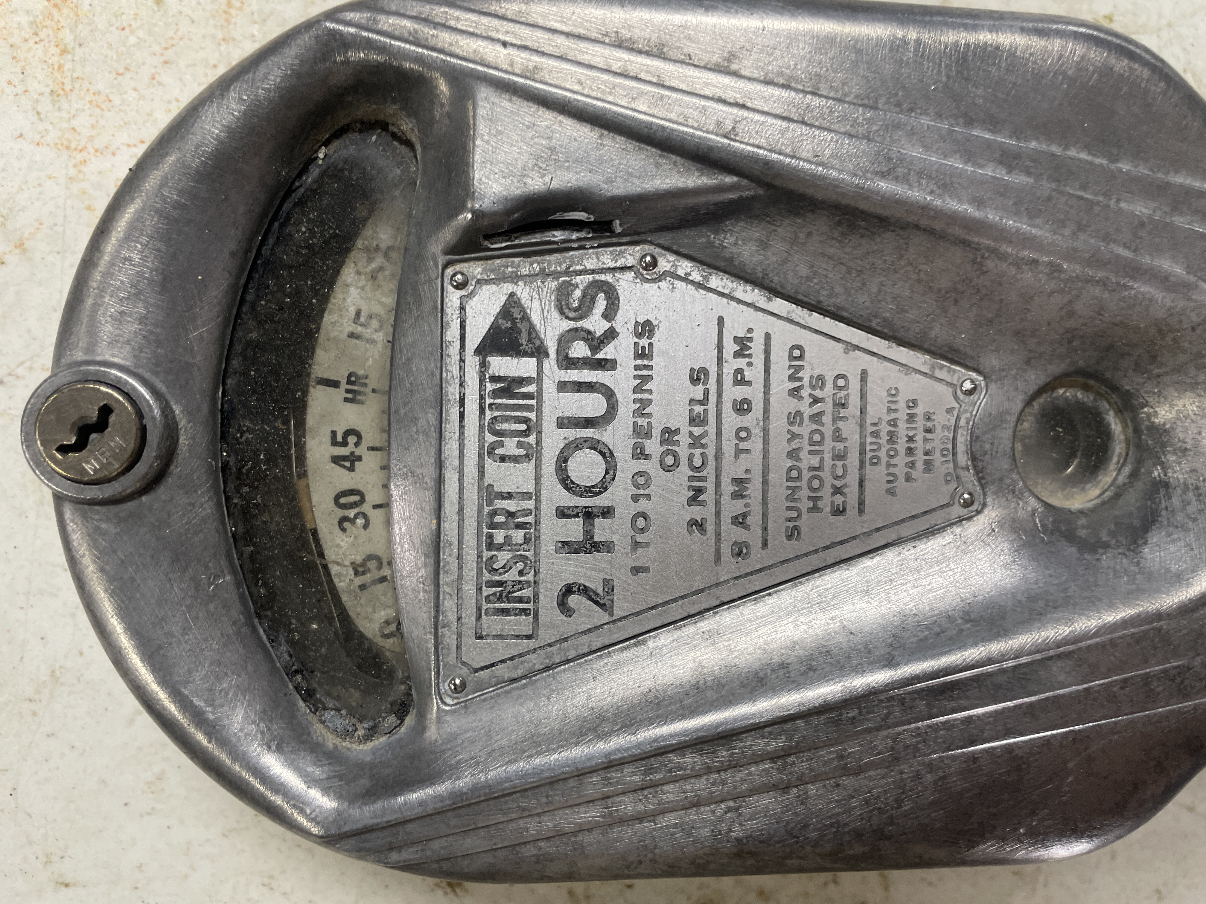 A silver-grey vintage Dual automatic parking meter head featuring a faceplate with coin instructions for two hours of parking and a metal identification tag numbered 48.