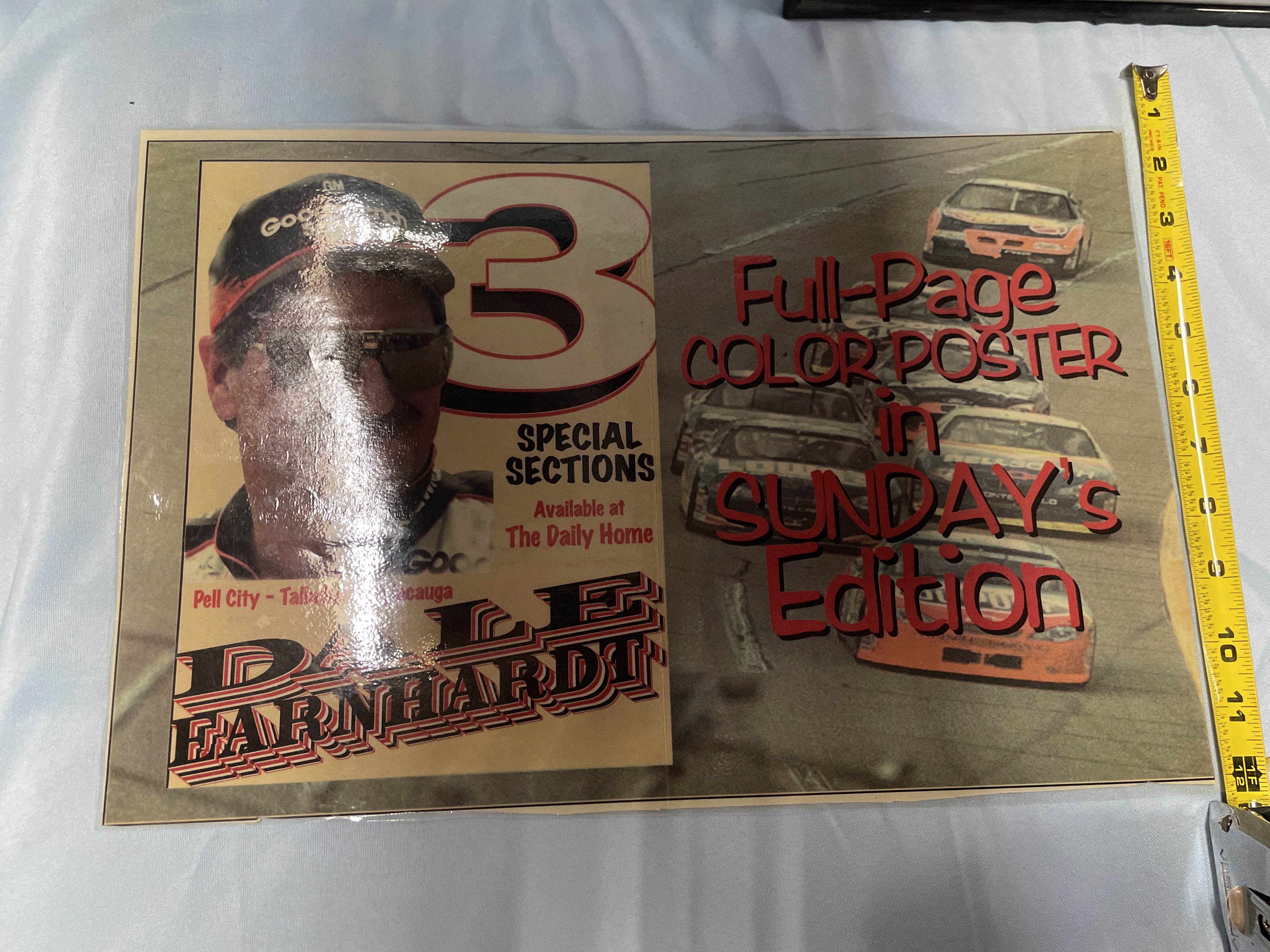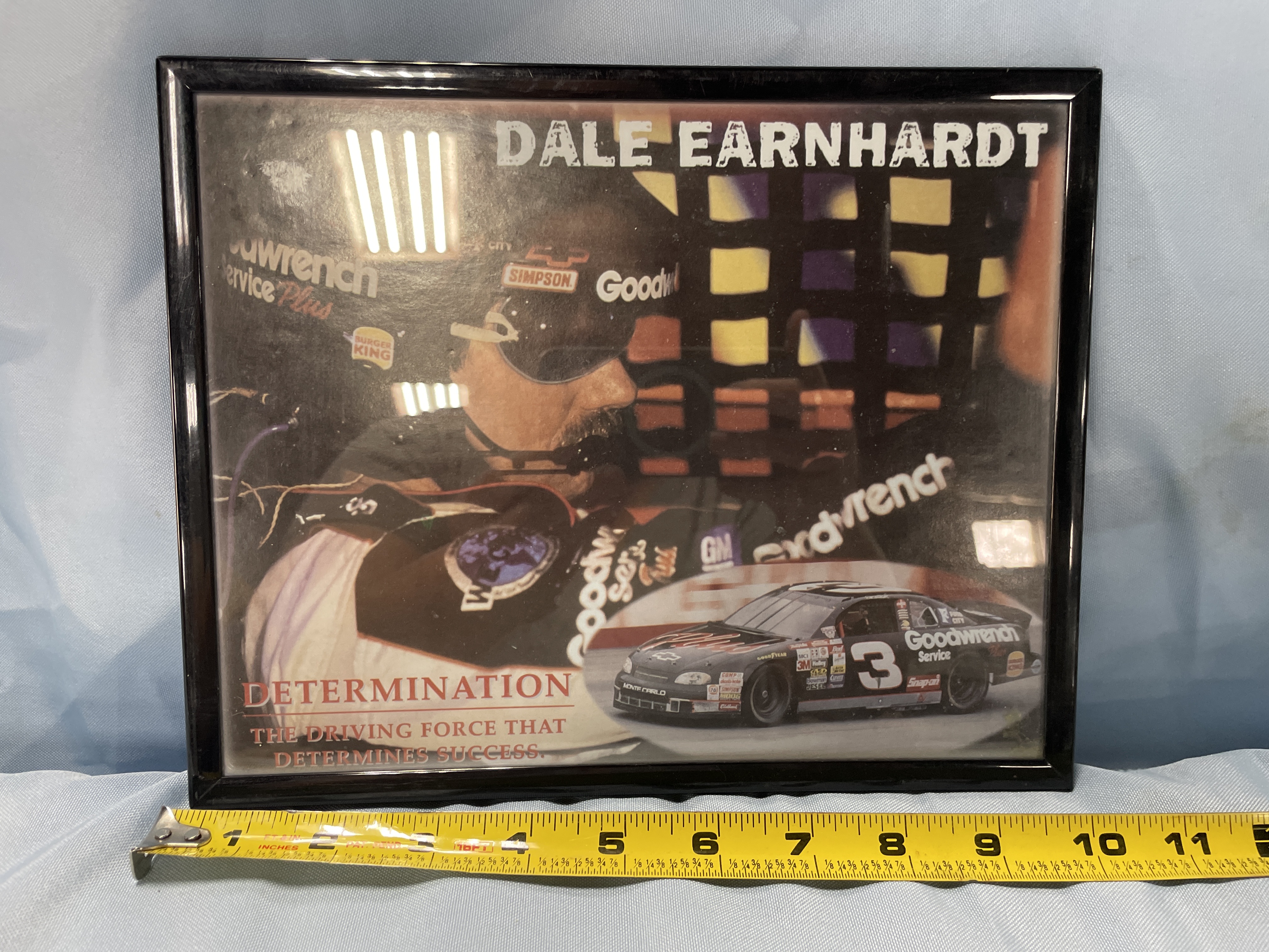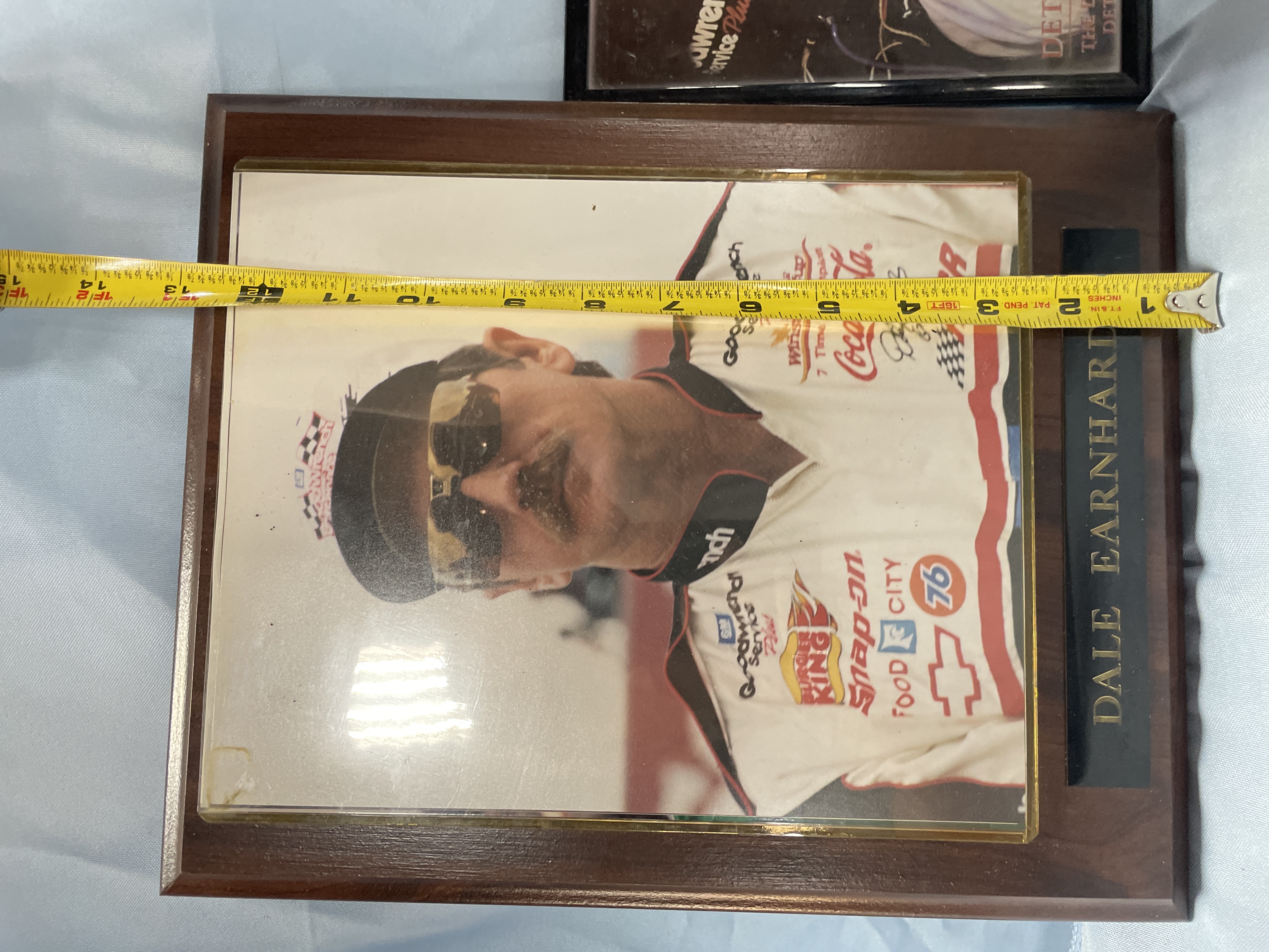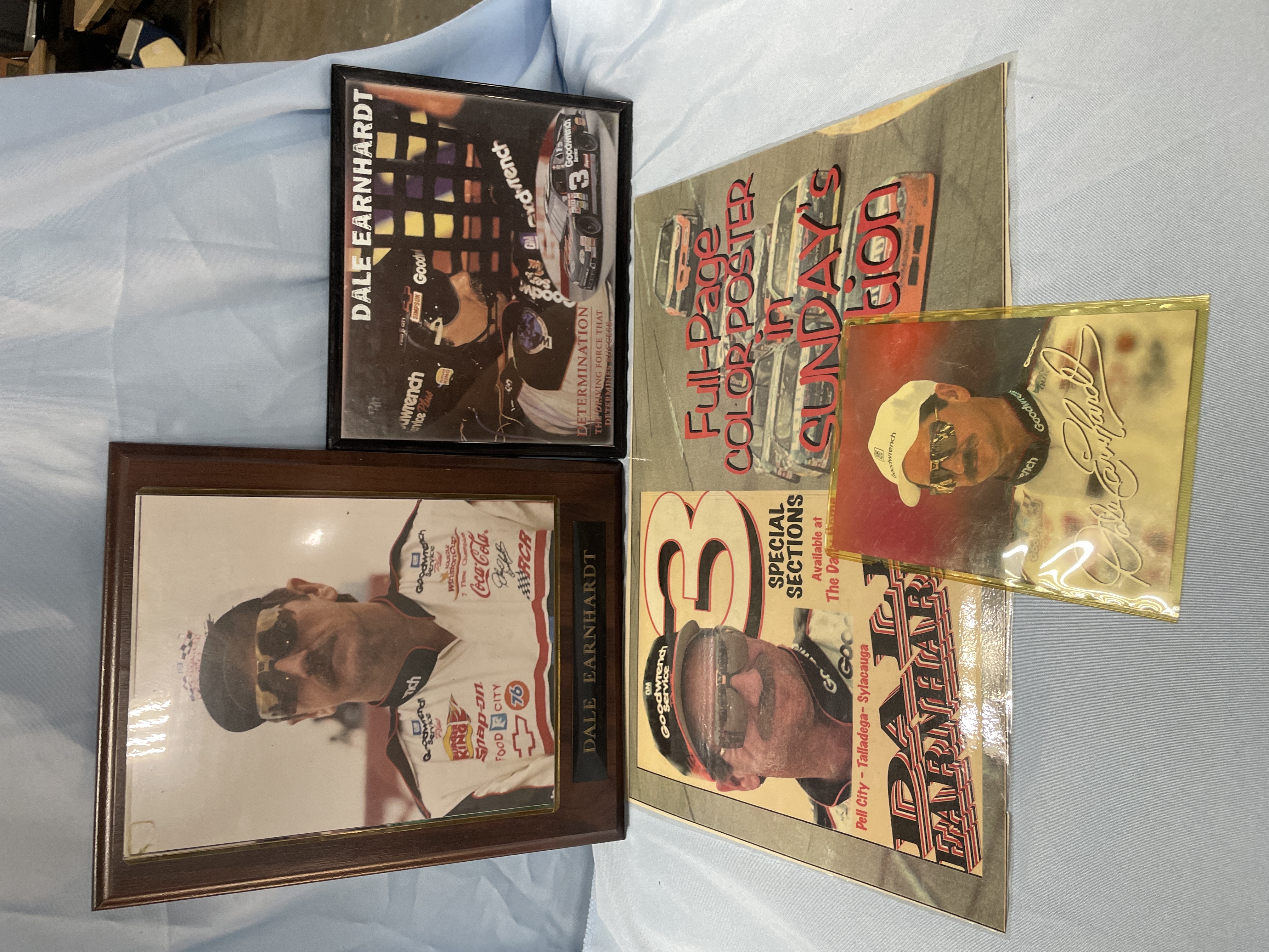 A collection of Dale Earnhardt memorabilia including framed photographs, a wooden plaque, and promotional posters ranging from 7 to 12 inches in width.