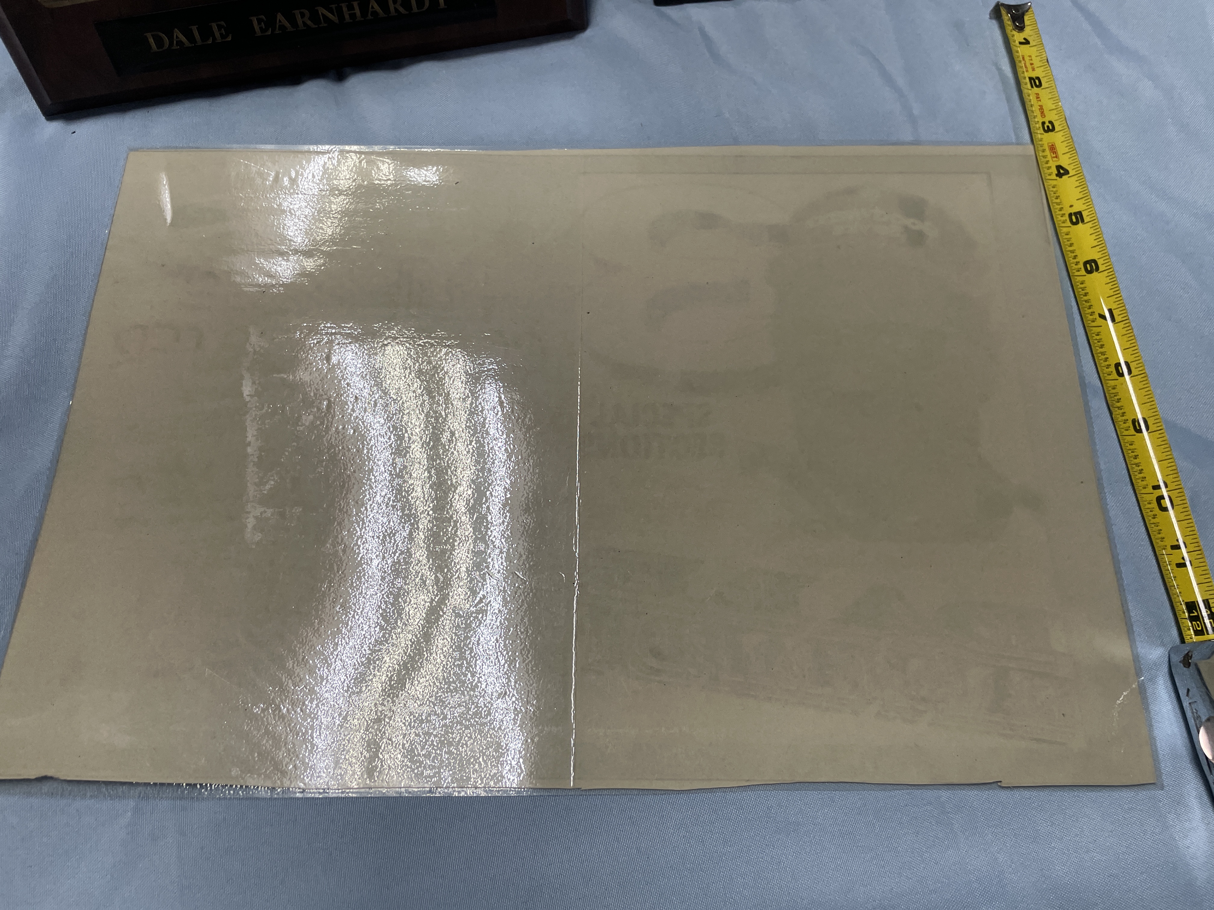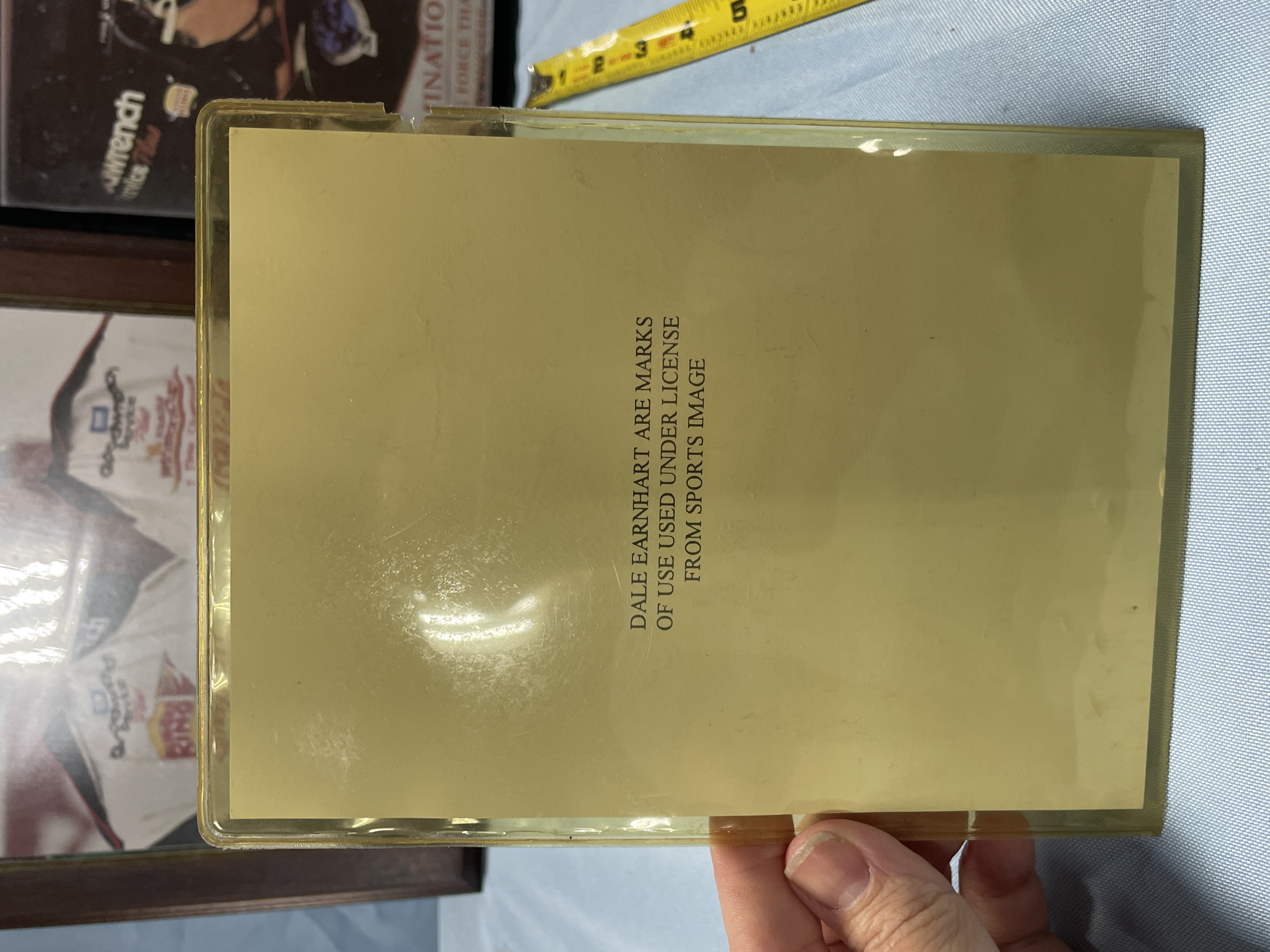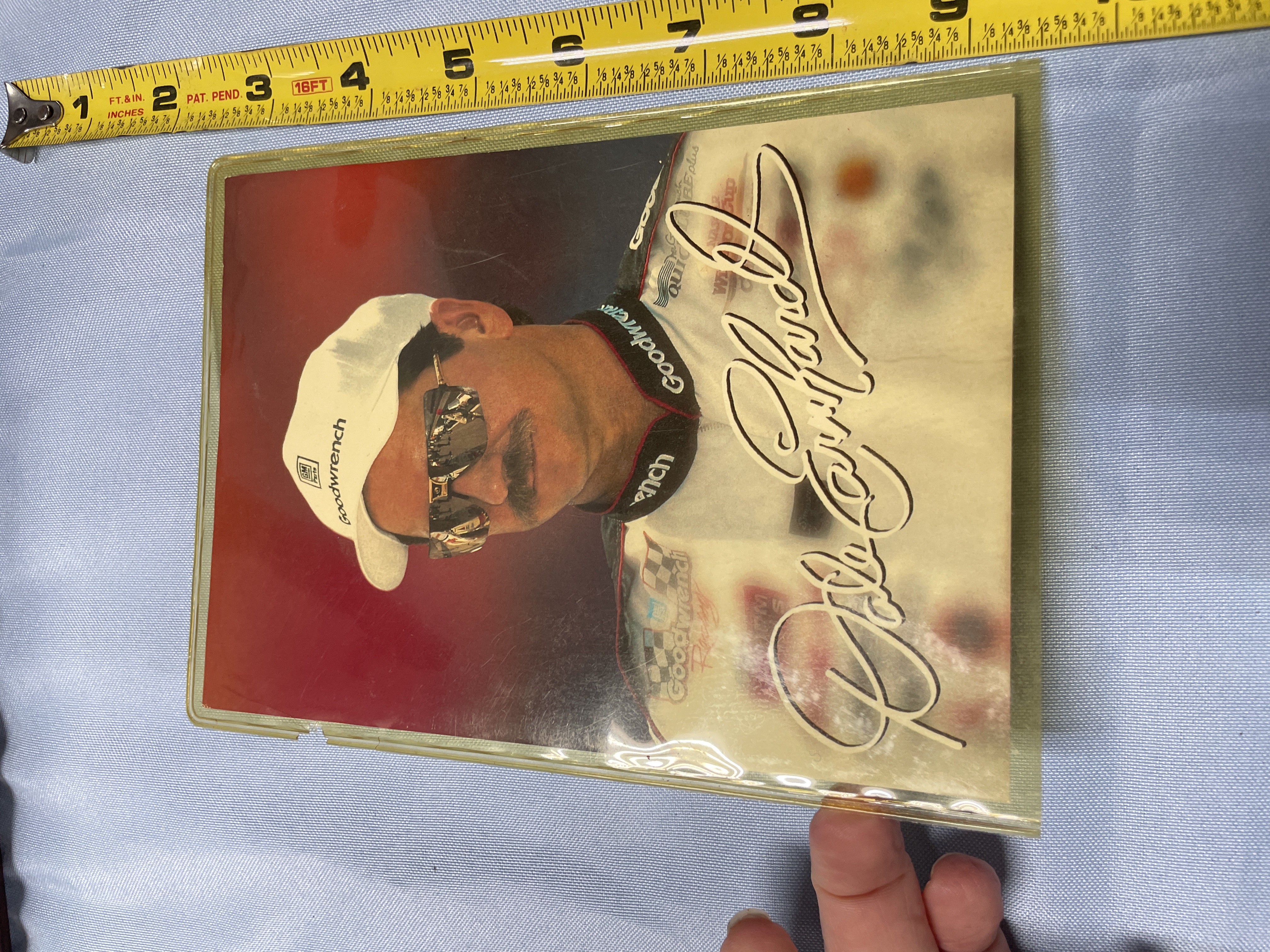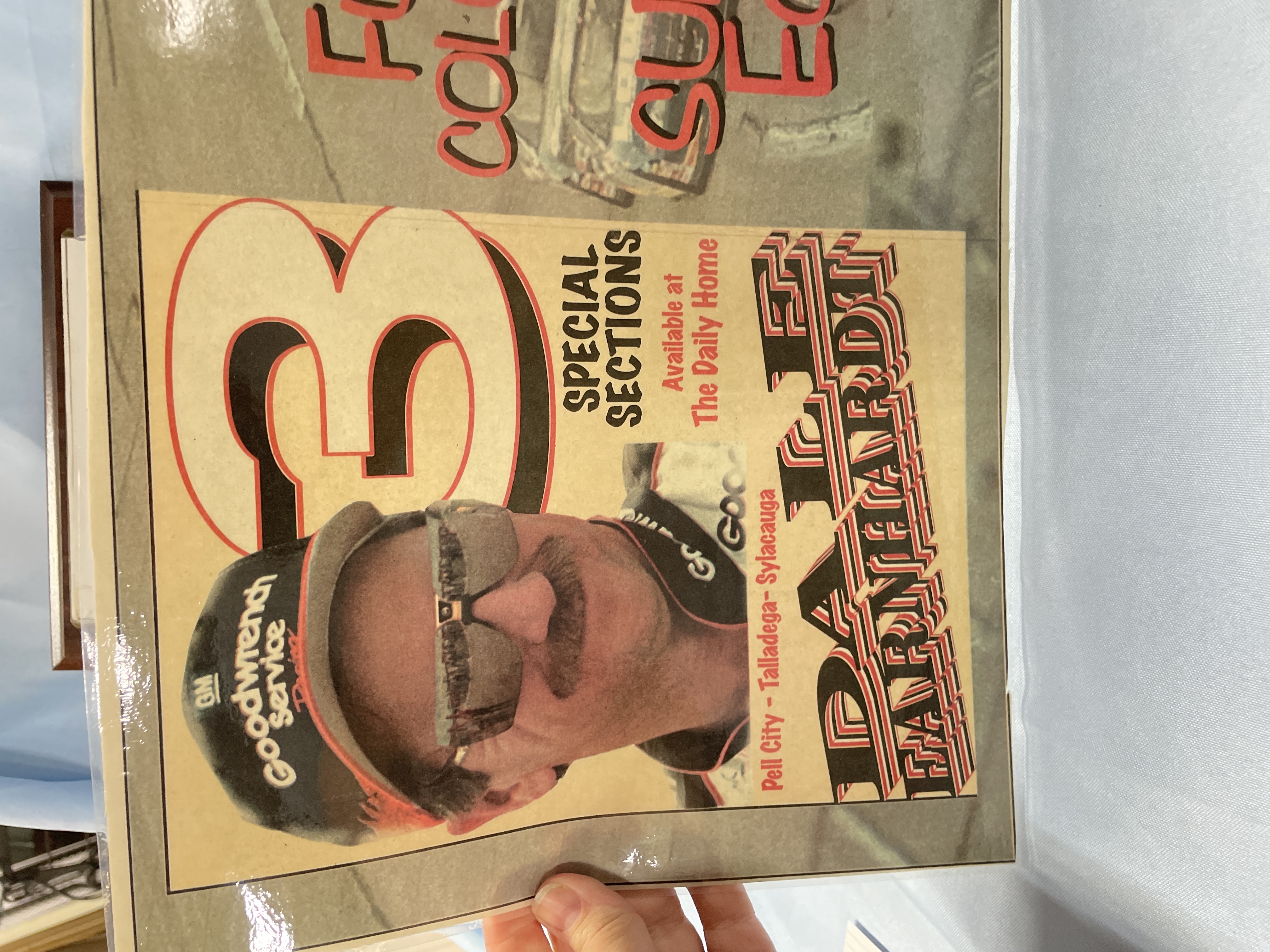 A collection of Dale Earnhardt memorabilia including framed photographs, a wooden plaque, and promotional posters ranging from 7 to 12 inches in width.