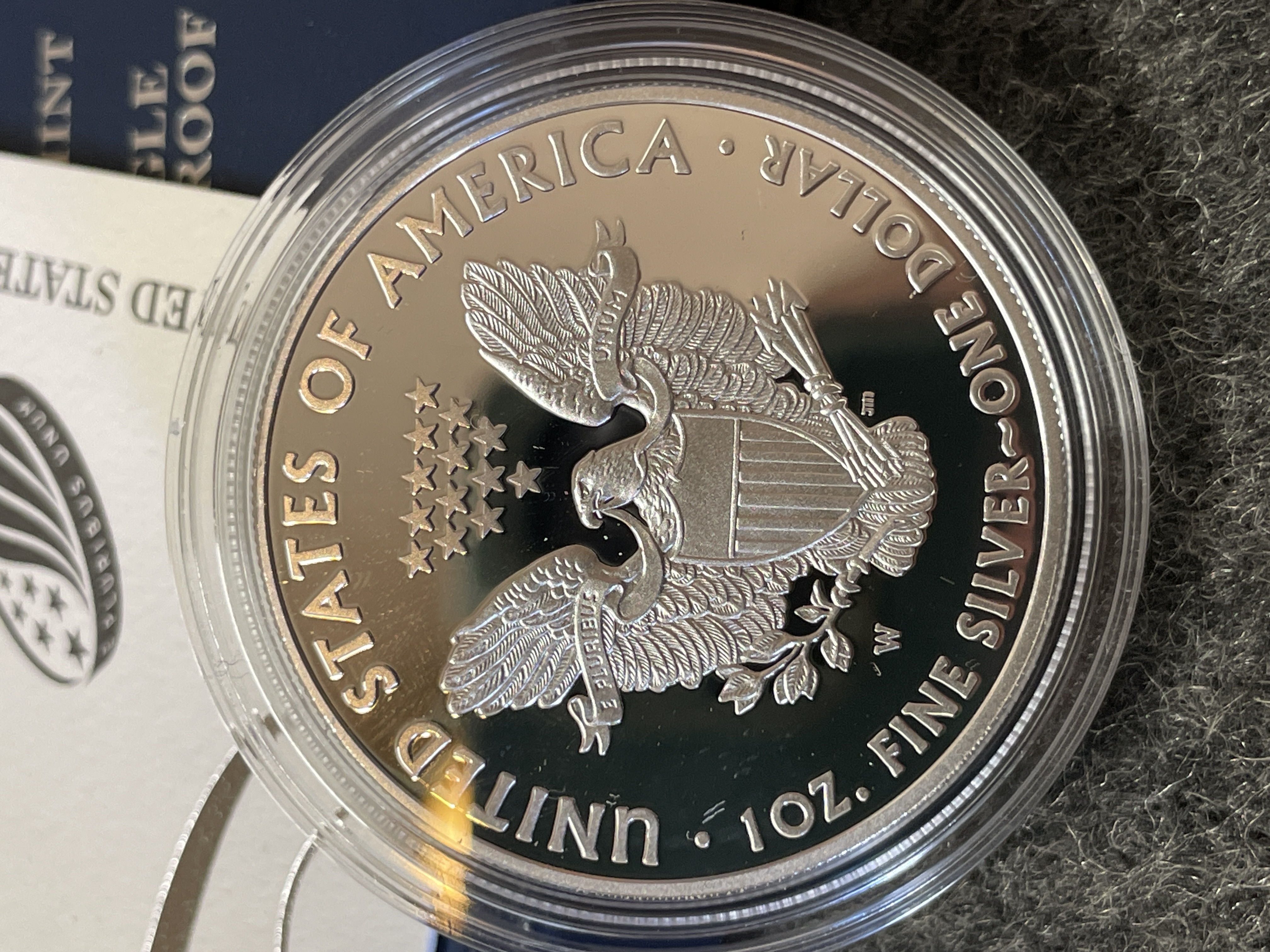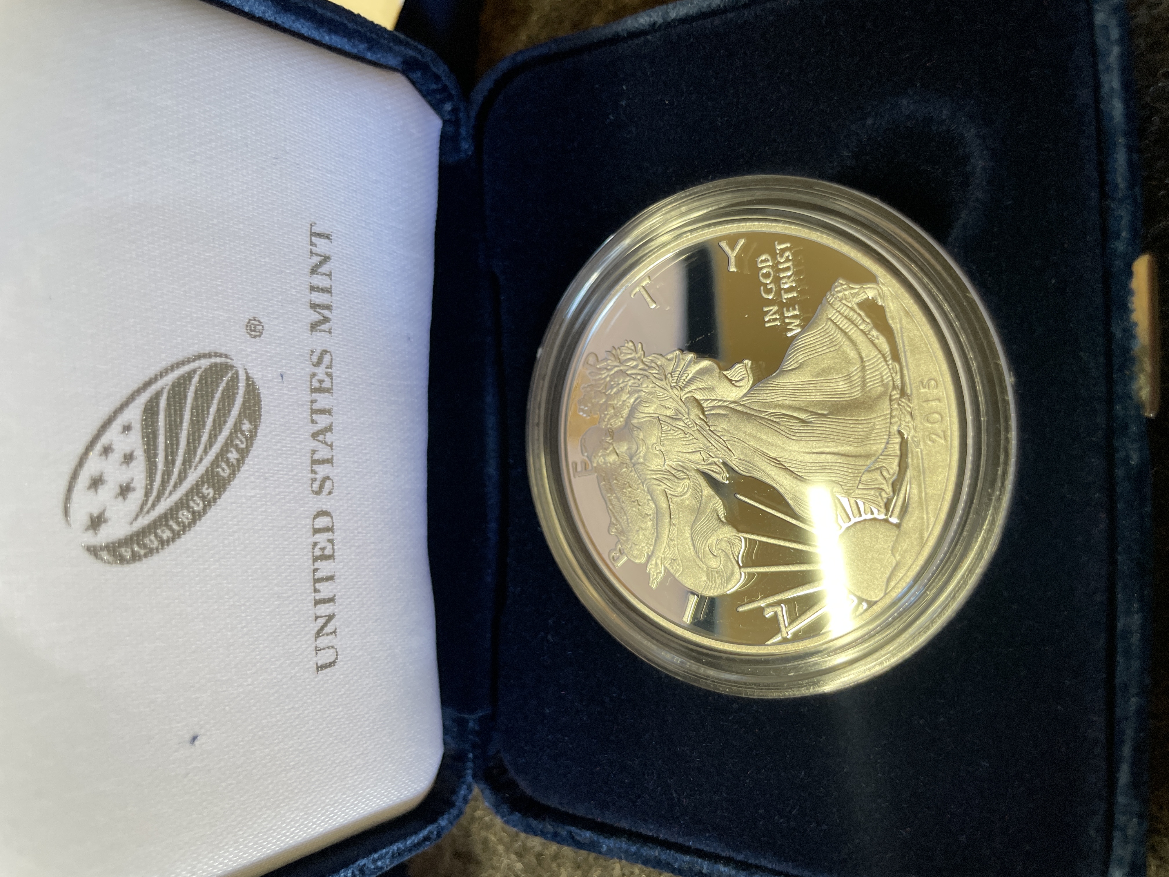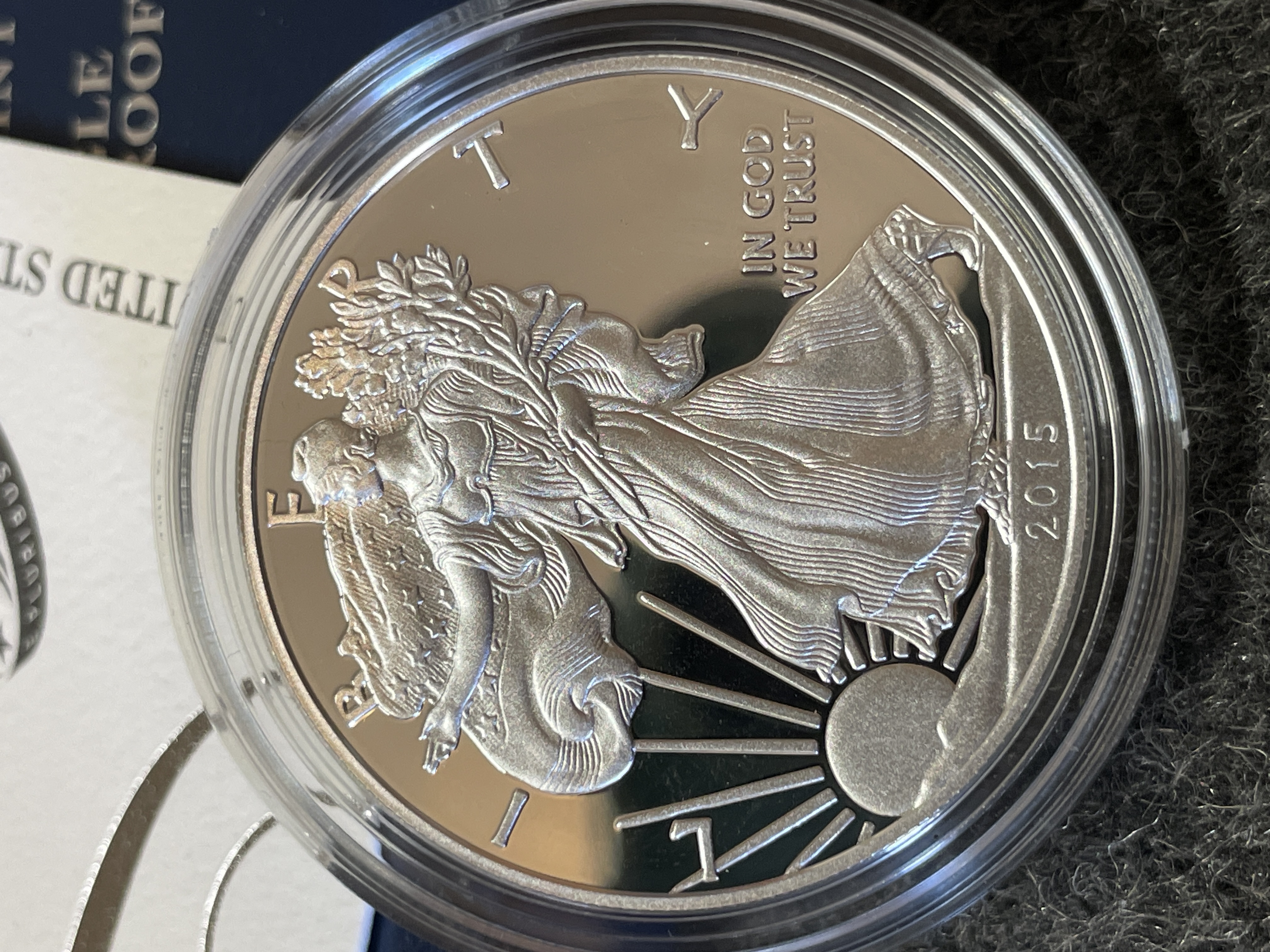 A 2015 American Eagle one ounce silver proof coin with a W mint mark, weighing 1.0000 troy ounce and measuring 1.598 inches in diameter, presented in its original box with a certificate of authenticity.