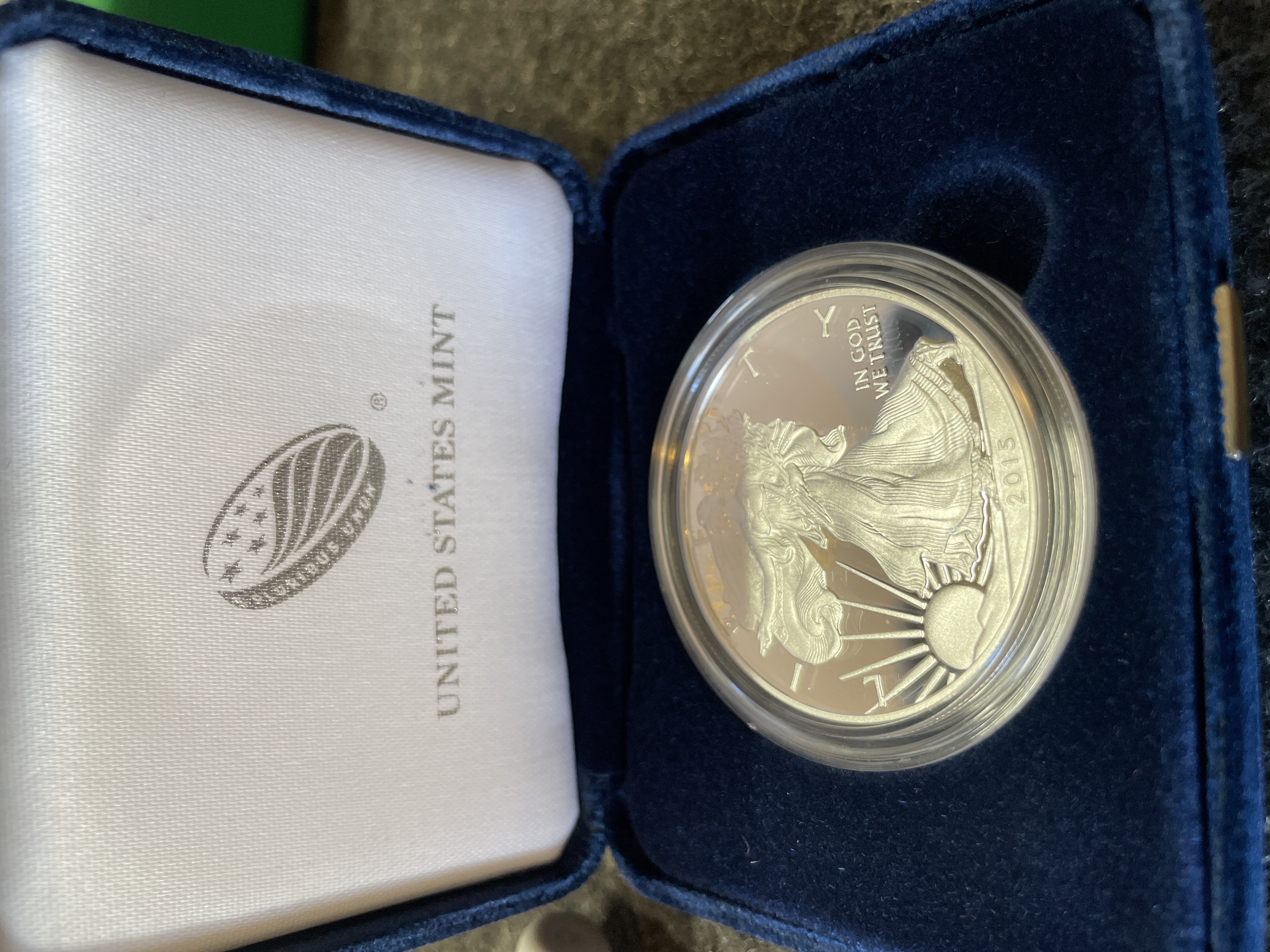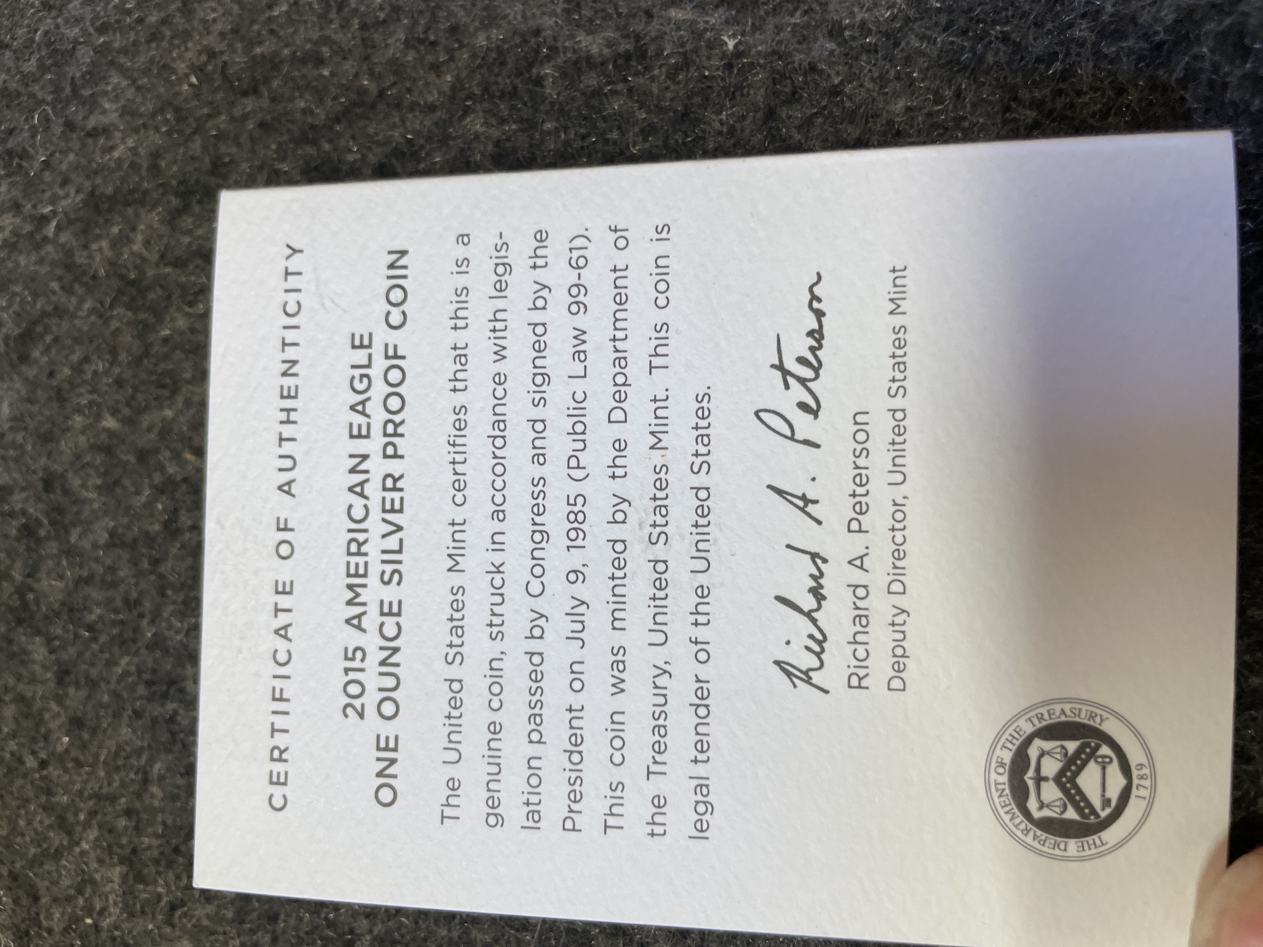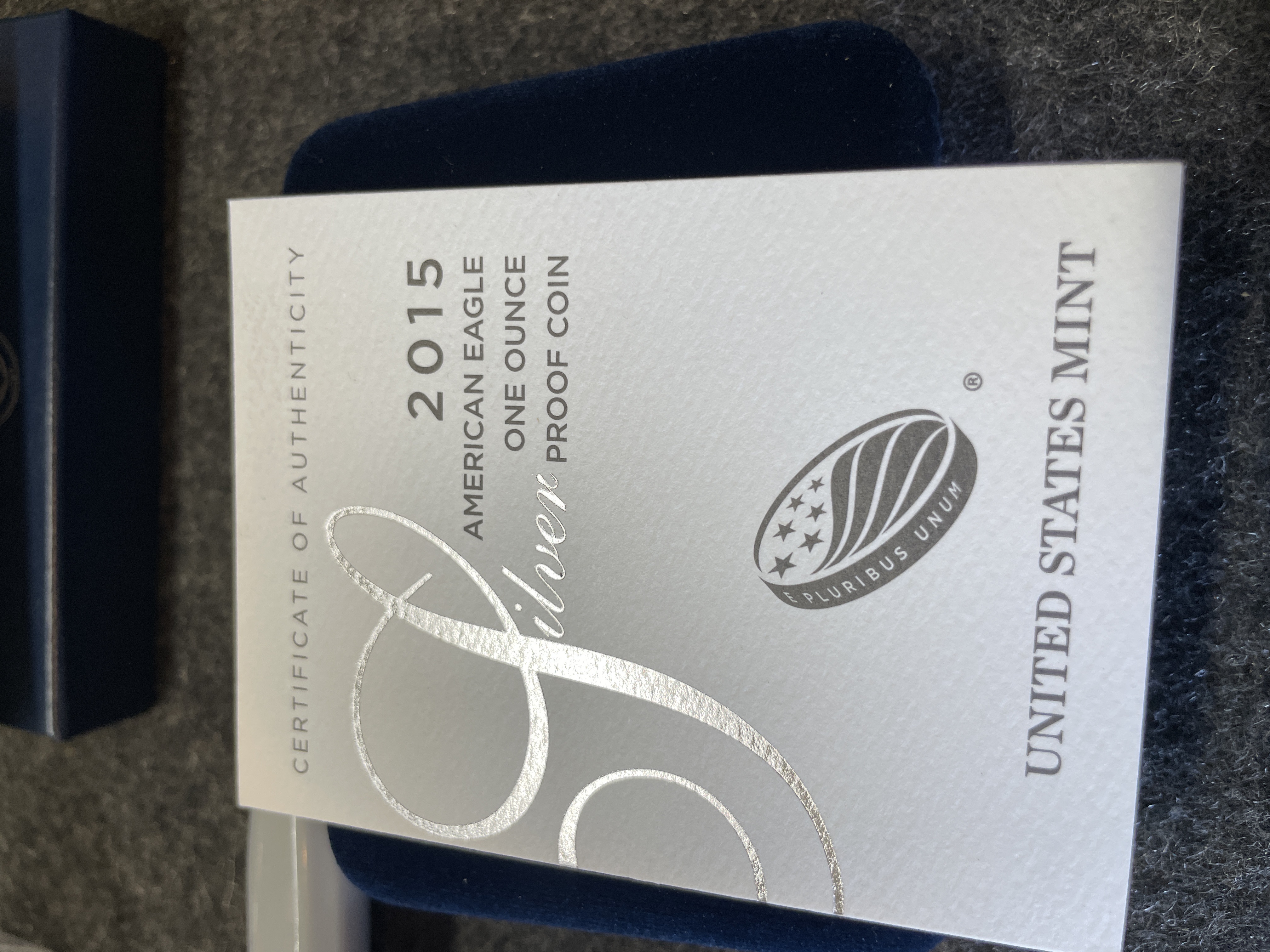 A 2015 United States Mint American Eagle one ounce silver proof coin weighing 1.0000 troy ounce and measuring 40.60 mm in diameter, including the original presentation box and certificate of authenticity.