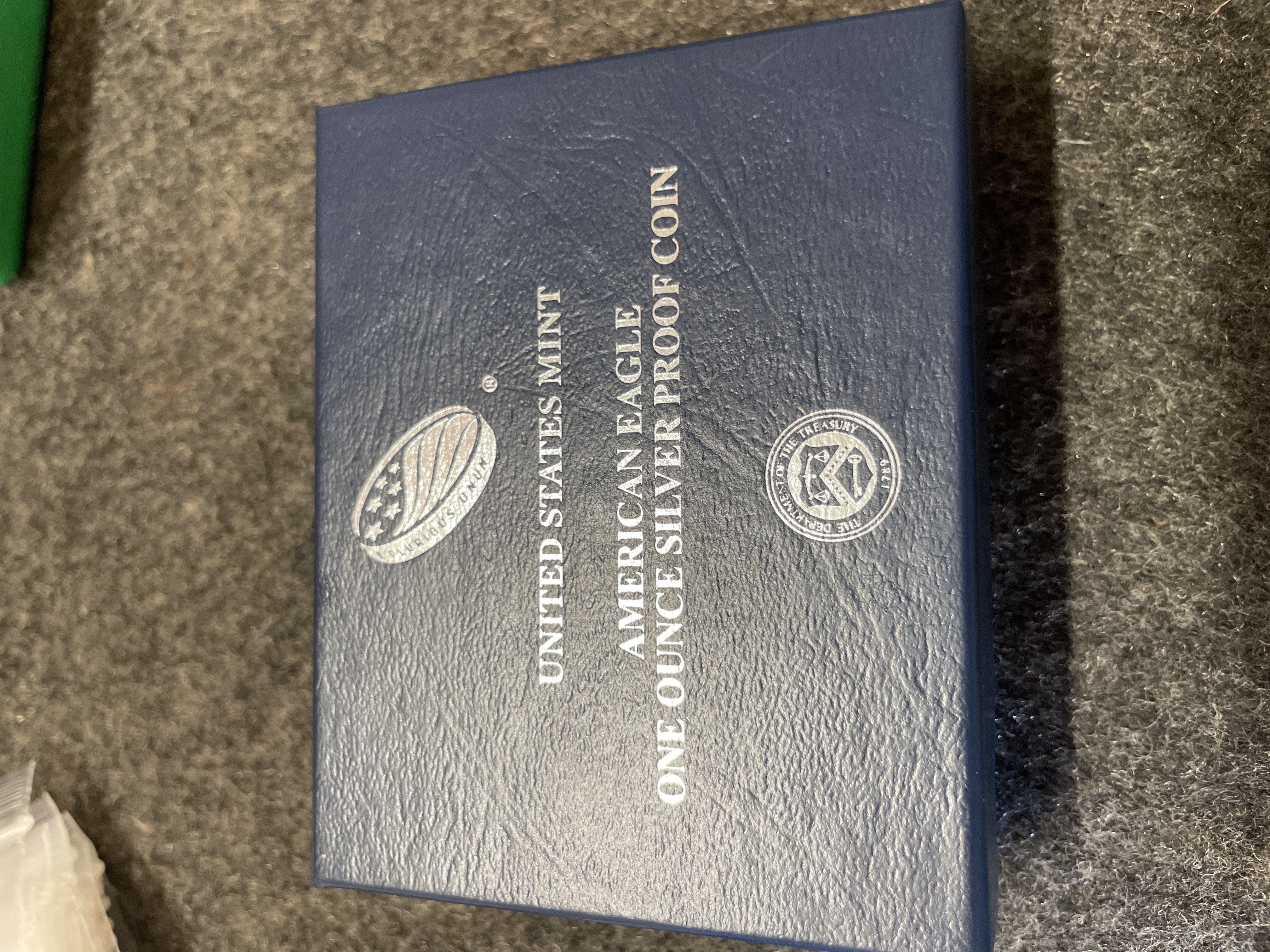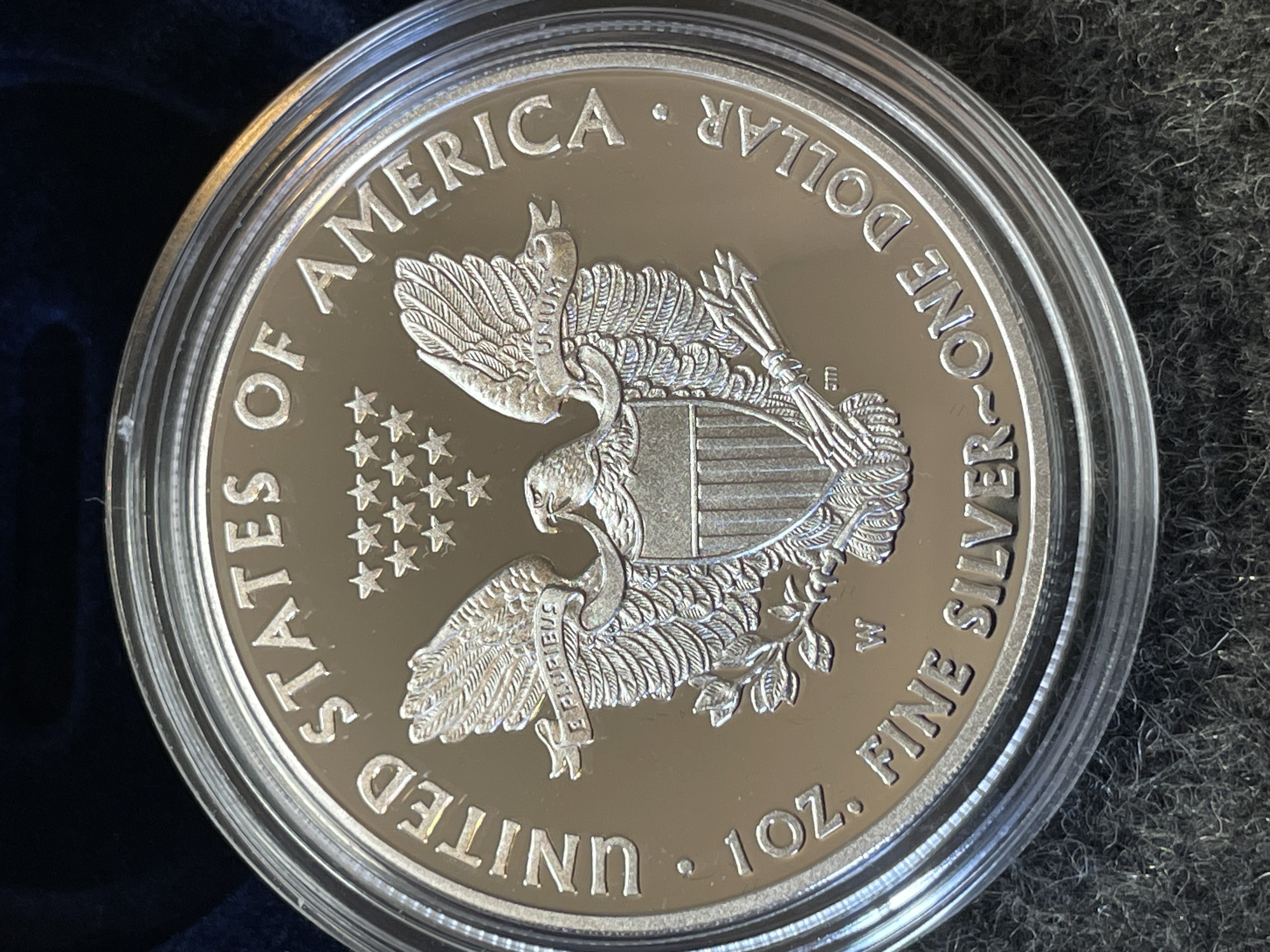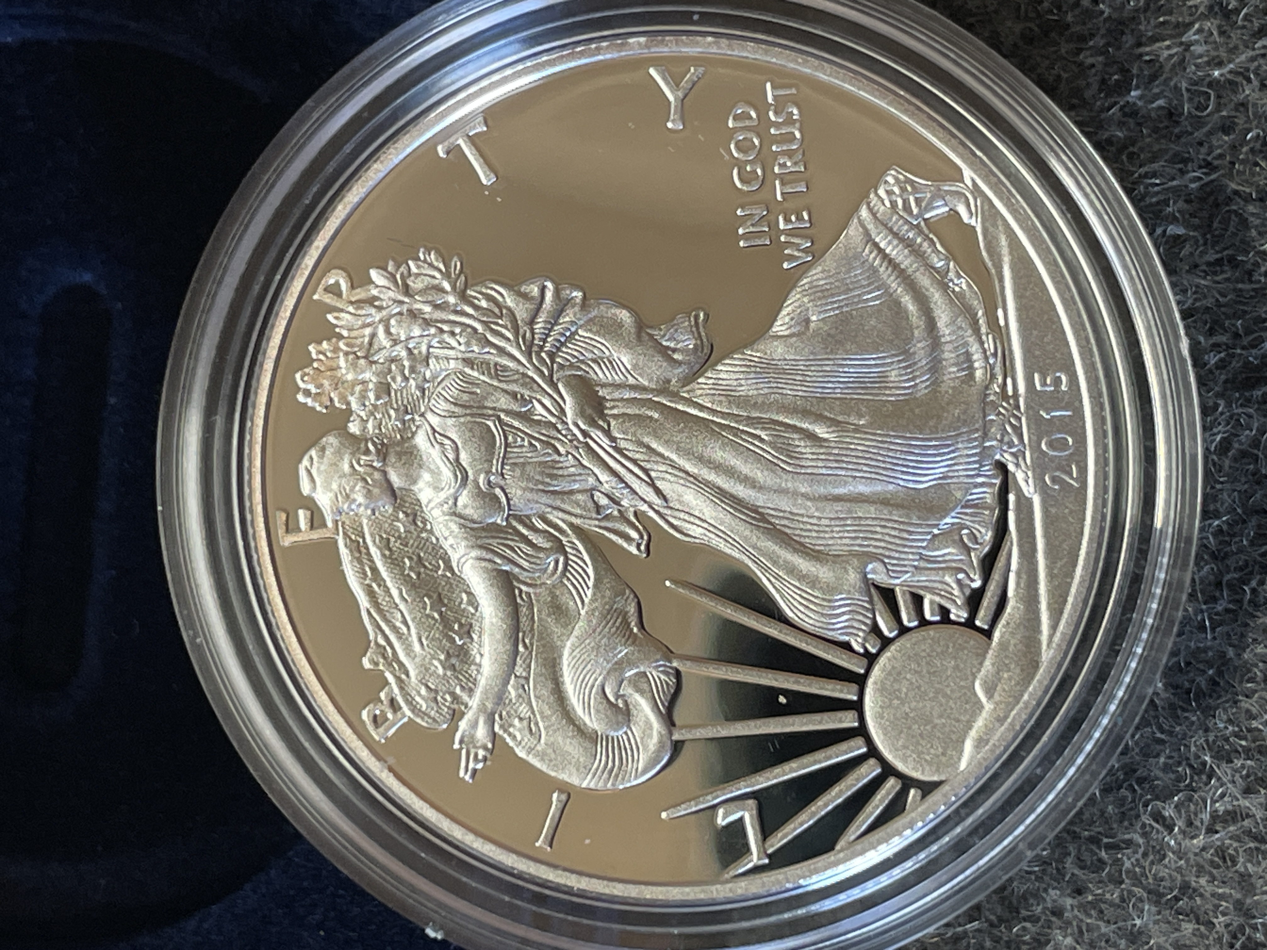 A 2015 United States Mint American Eagle one ounce silver proof coin weighing 1.0000 troy ounce and measuring 40.60 mm in diameter, including the original presentation box and certificate of authenticity.