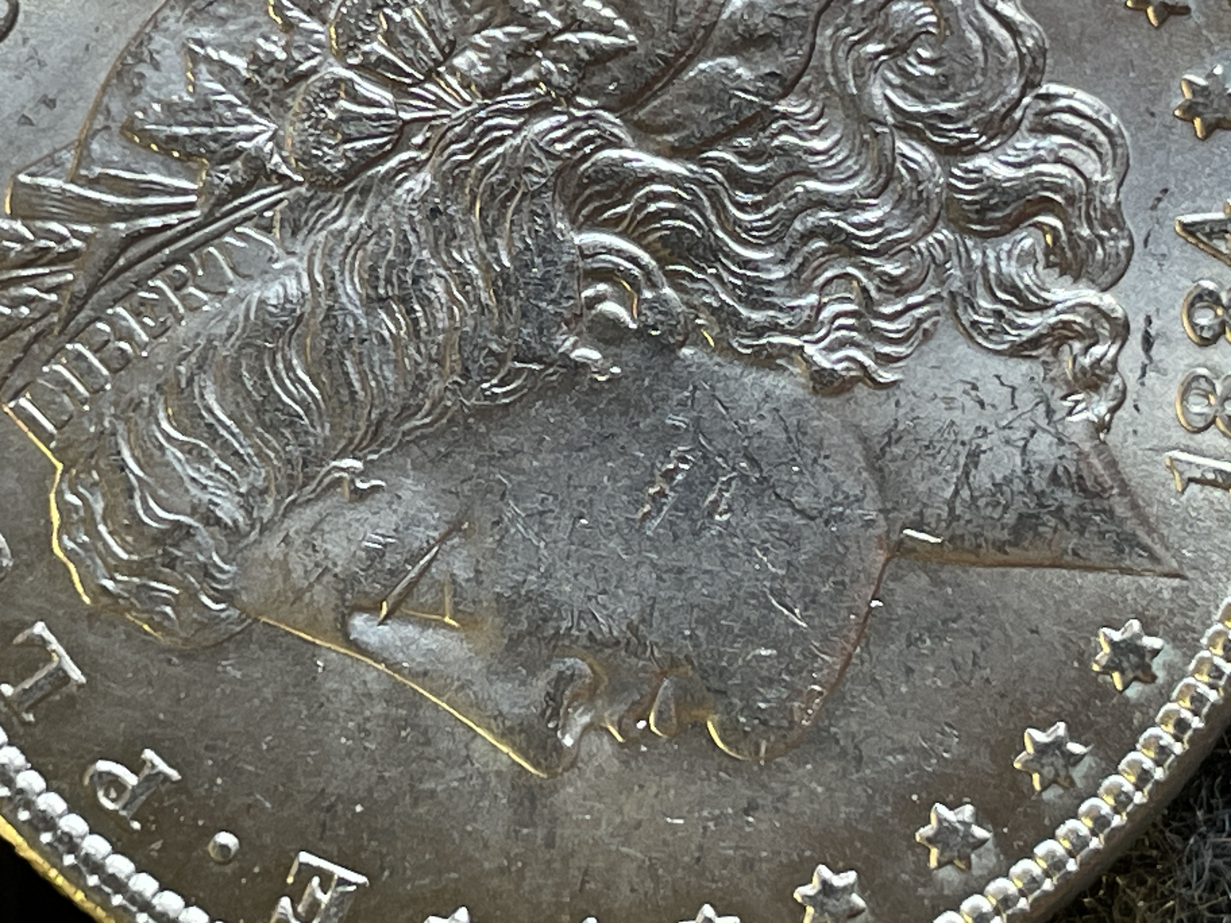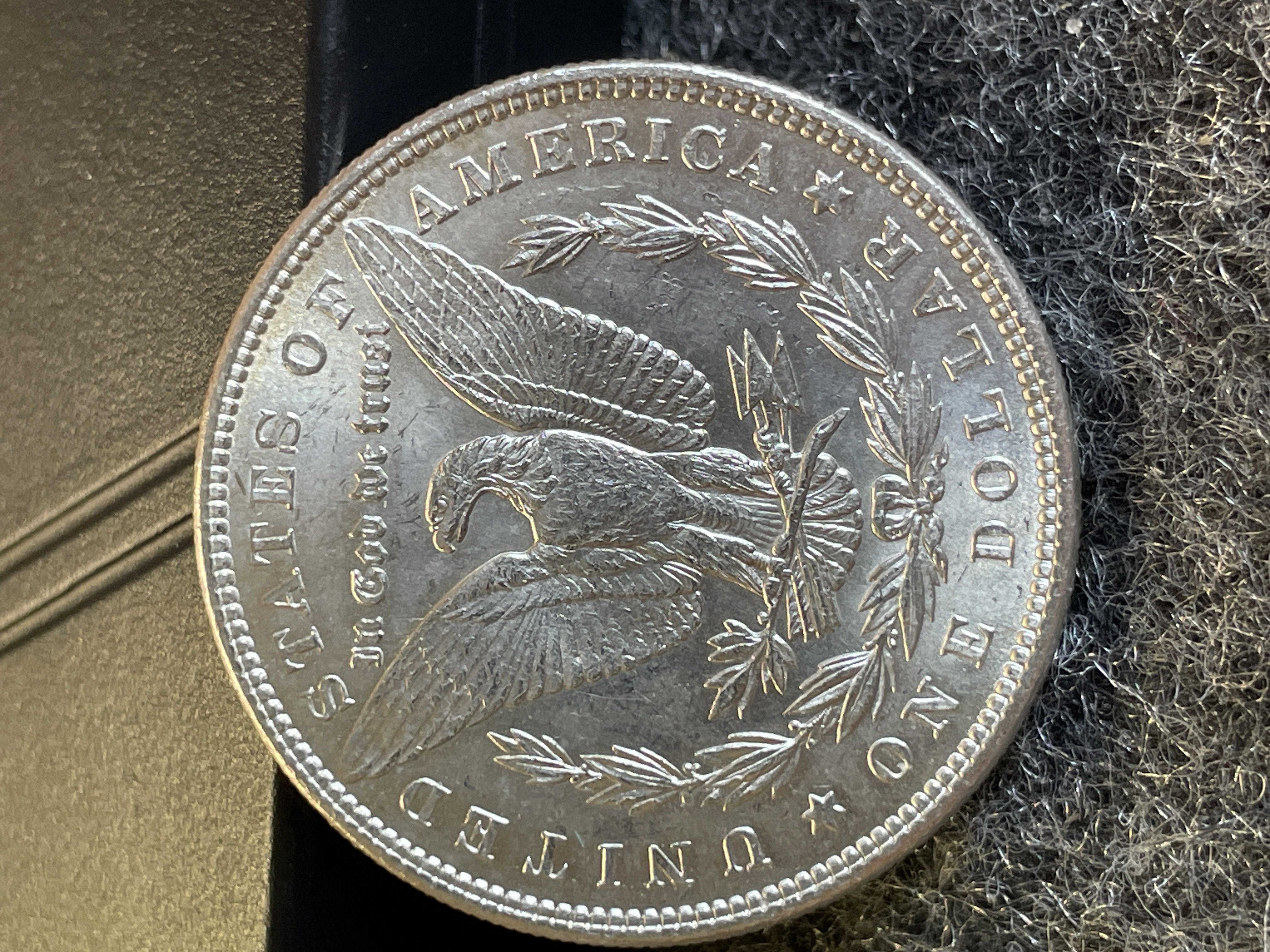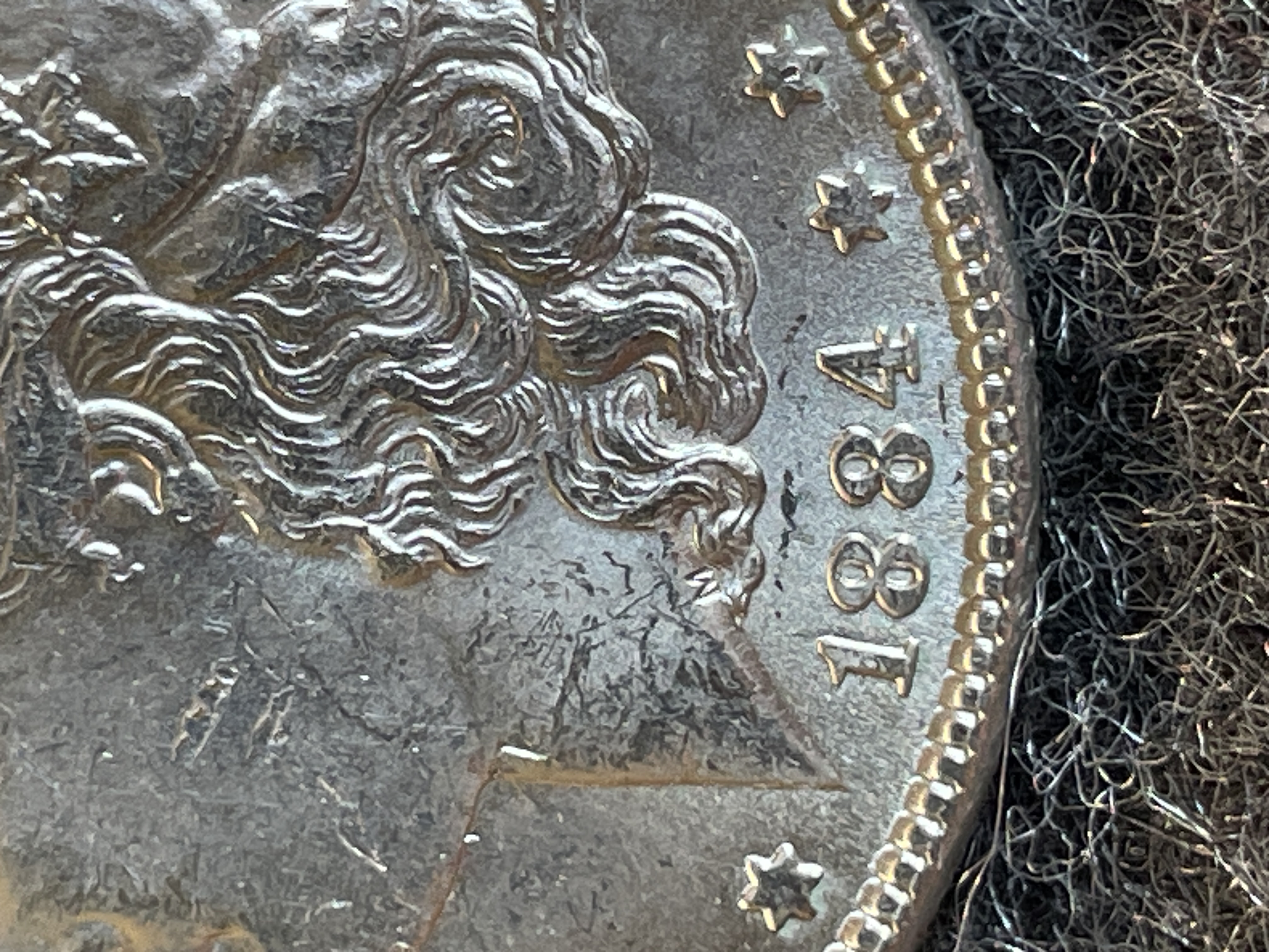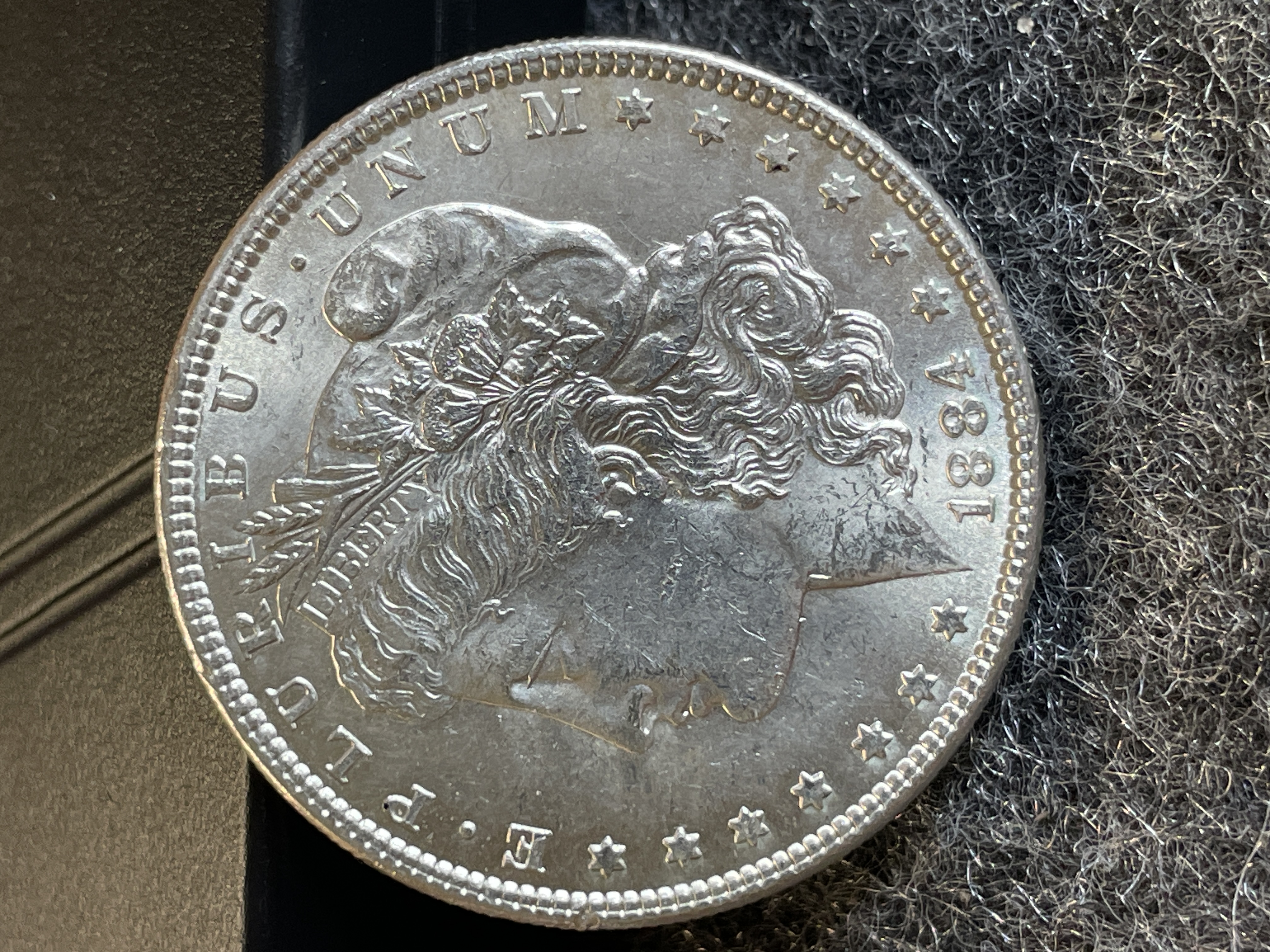 An 1884 United States Morgan silver dollar coin featuring Liberty on the obverse and an eagle on the reverse with standard inscriptions.