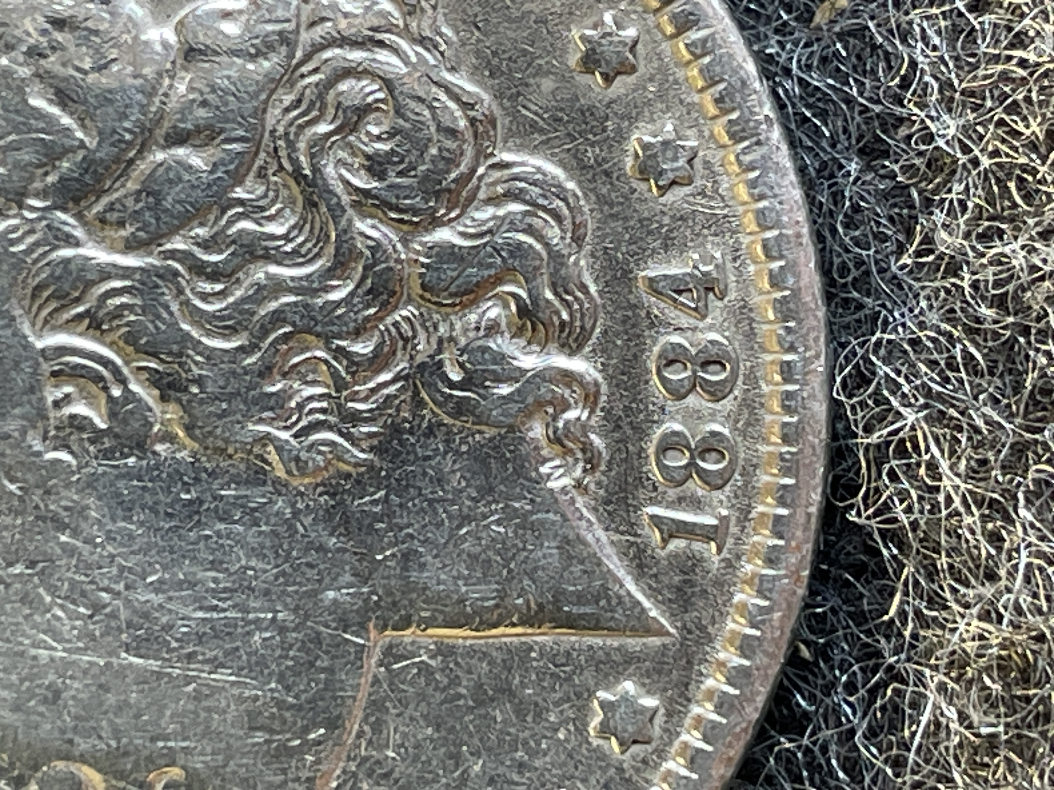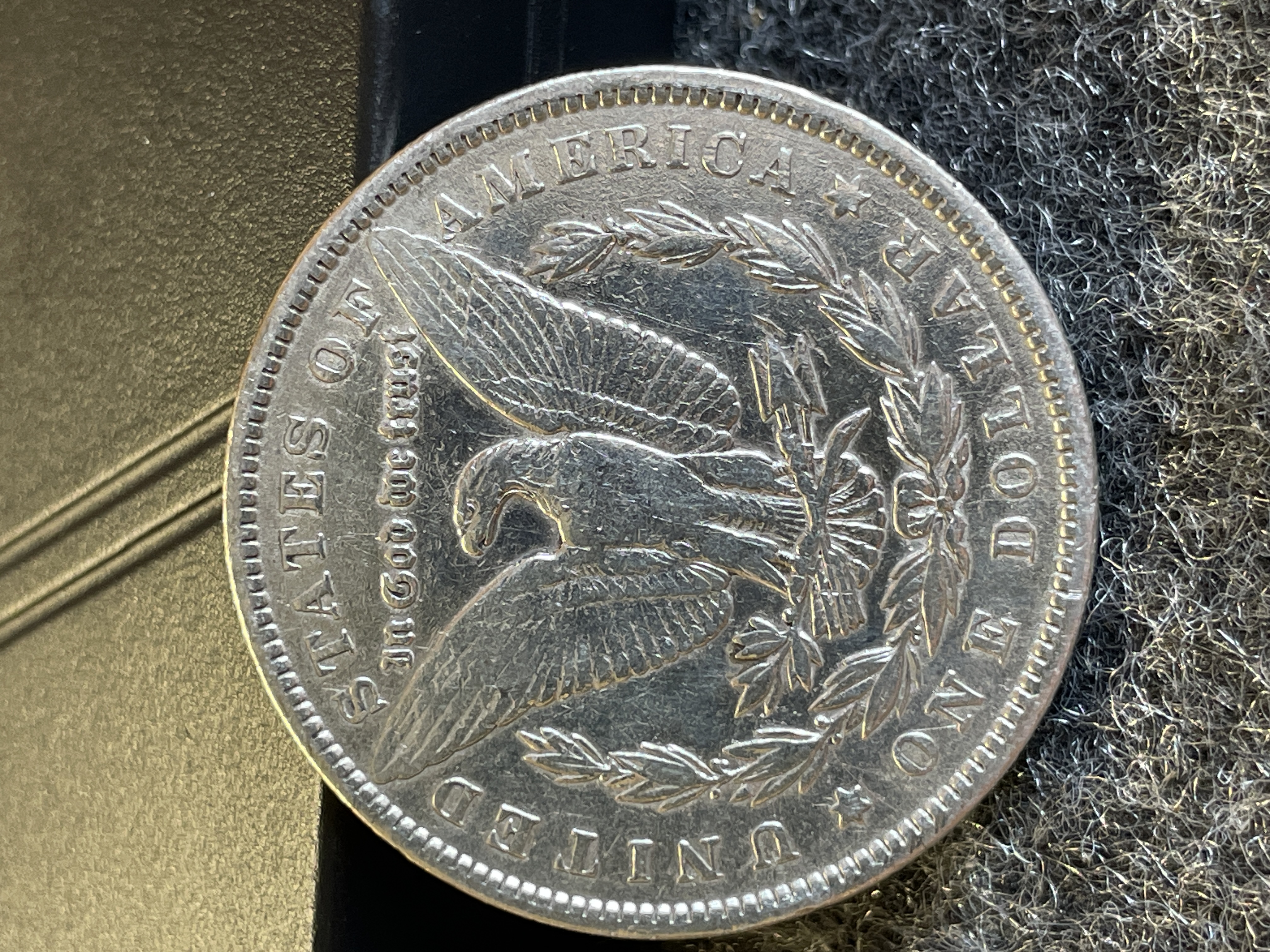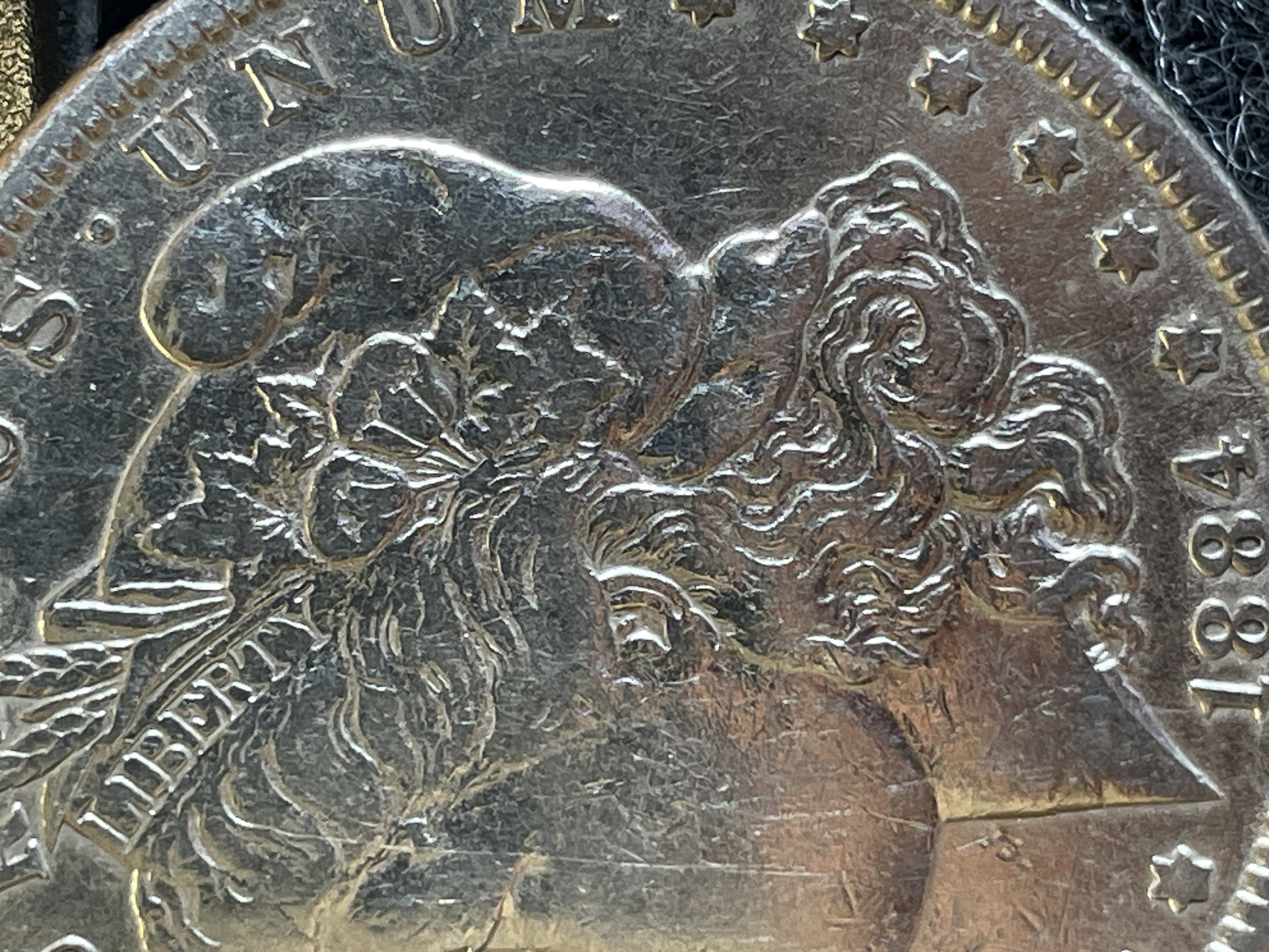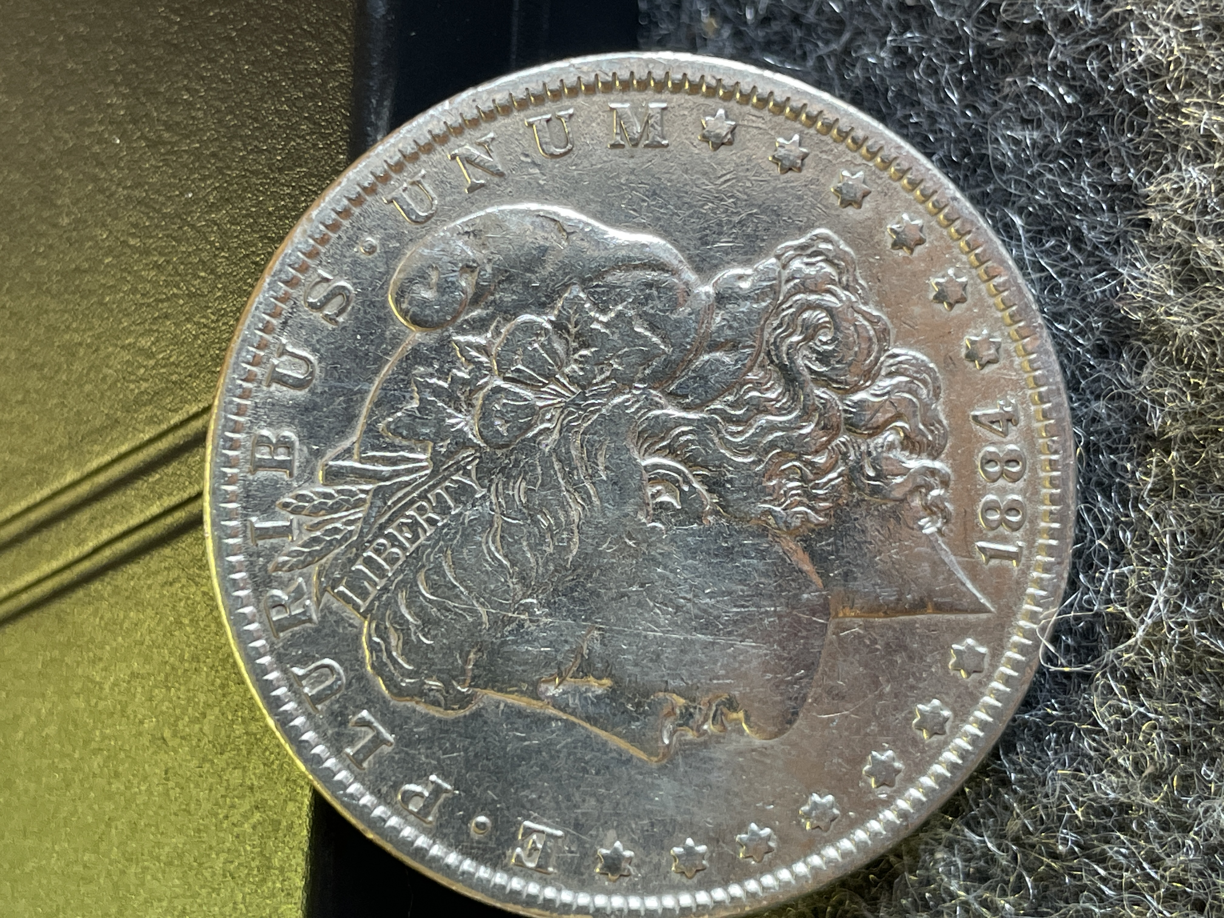 An 1884 Morgan silver dollar coin featuring Liberty on the obverse and a heraldic eagle on the reverse.