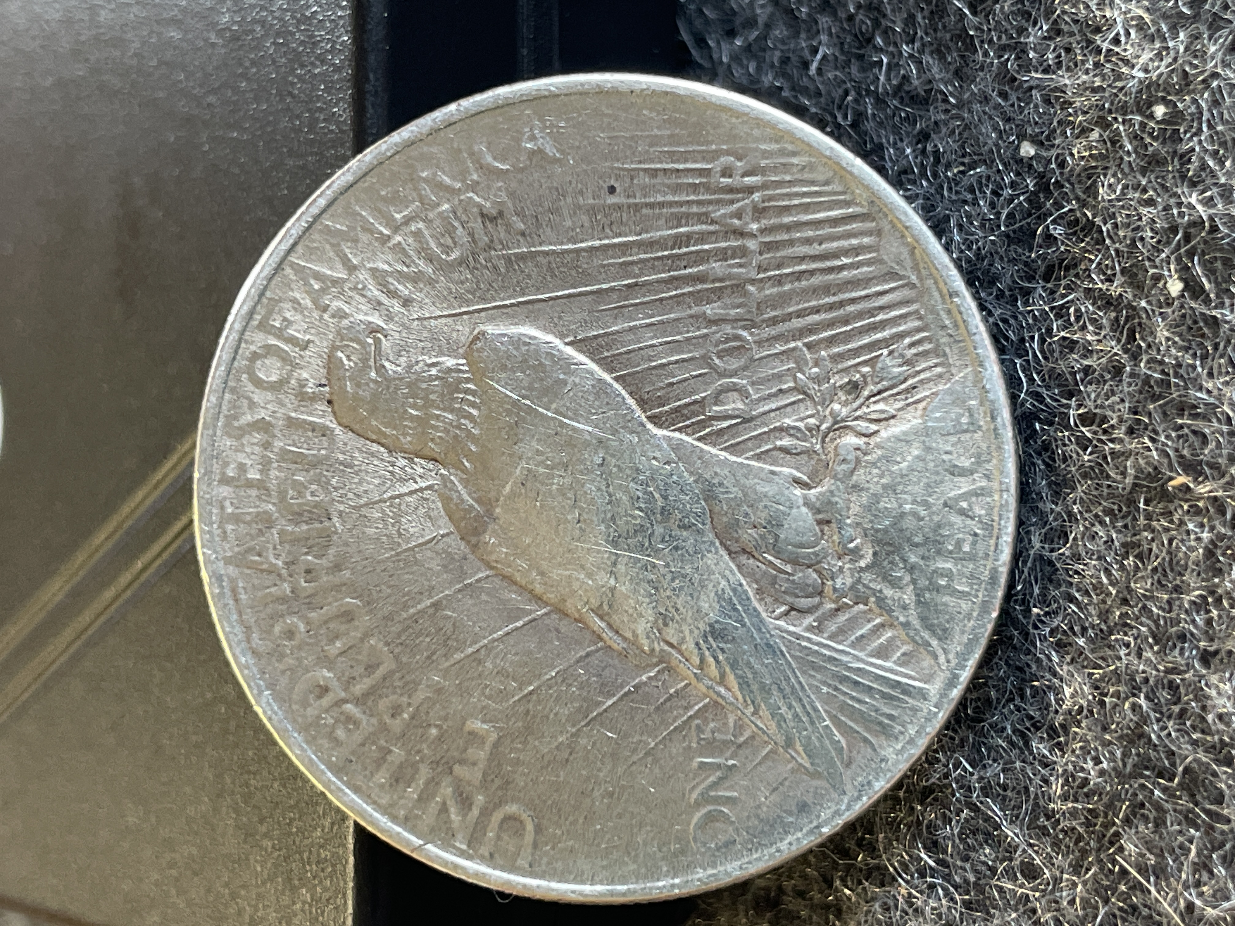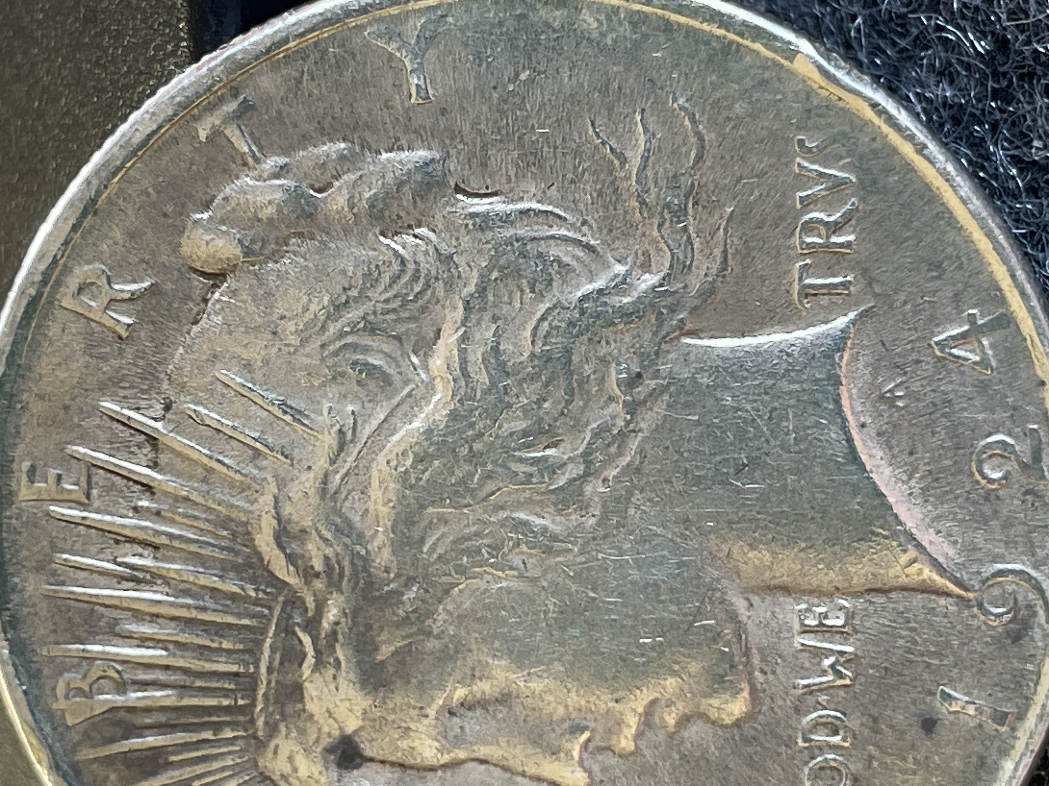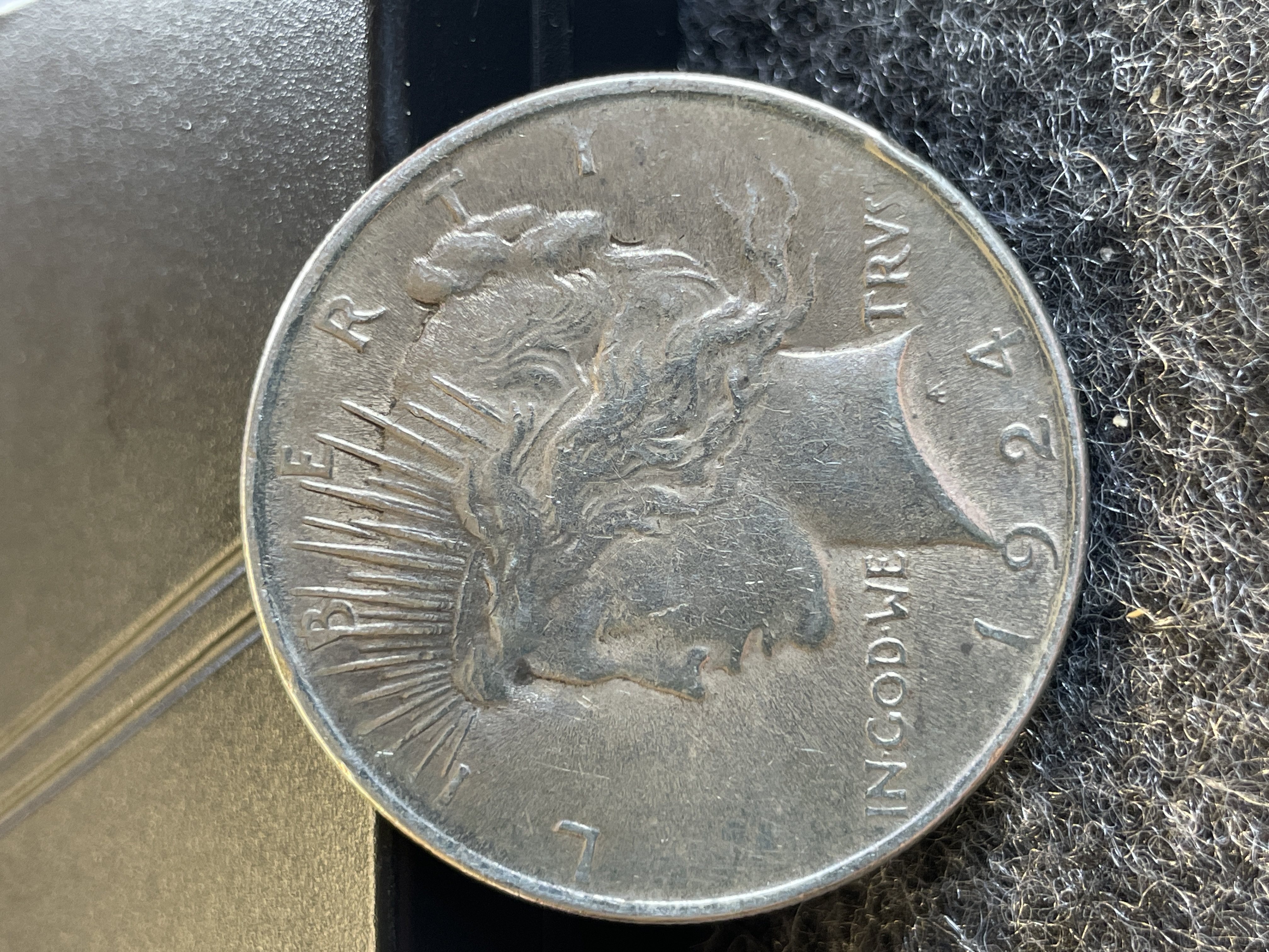 A single 1924 United States Peace silver dollar coin featuring Liberty on the obverse and a perched eagle on the reverse.