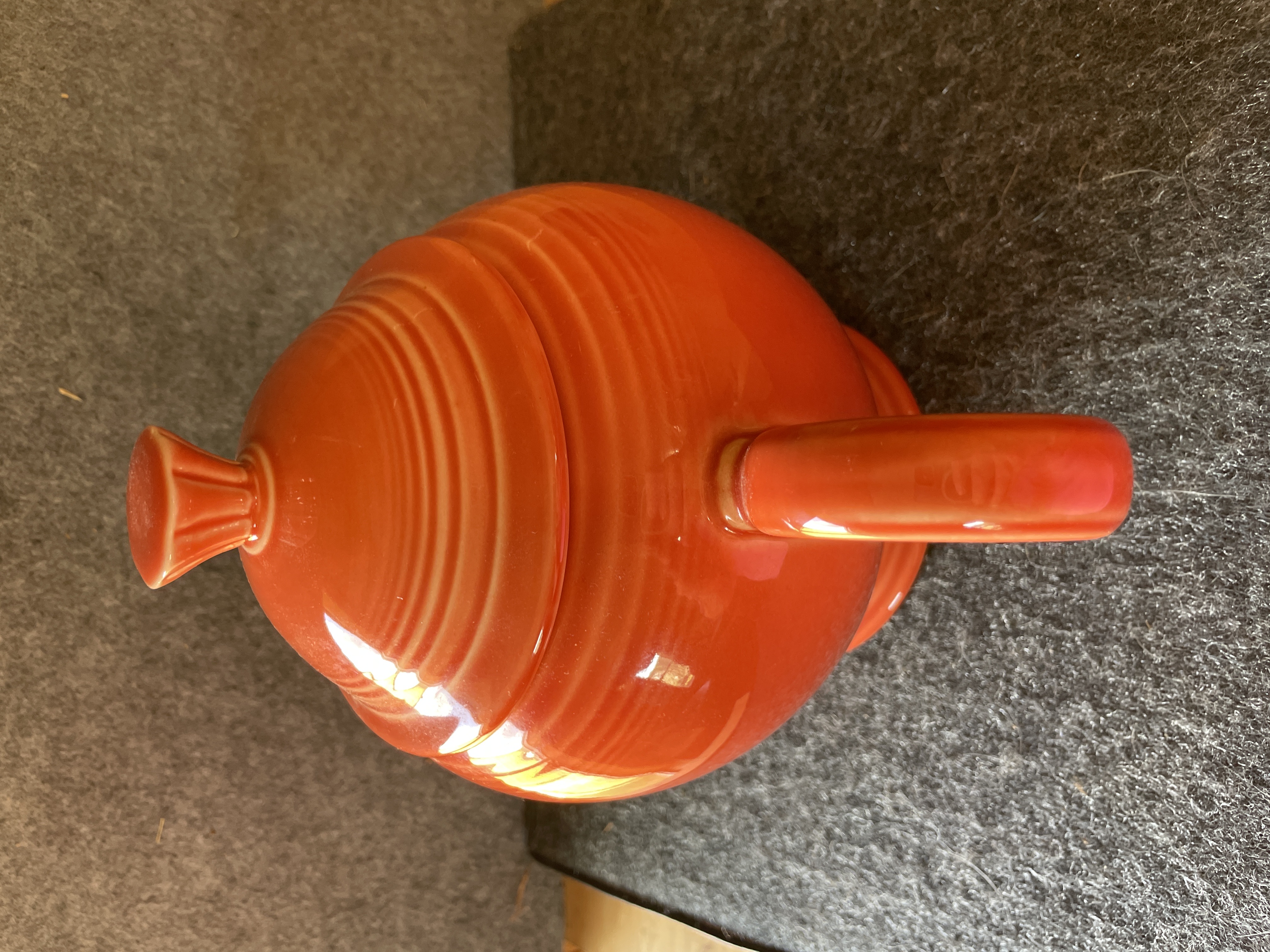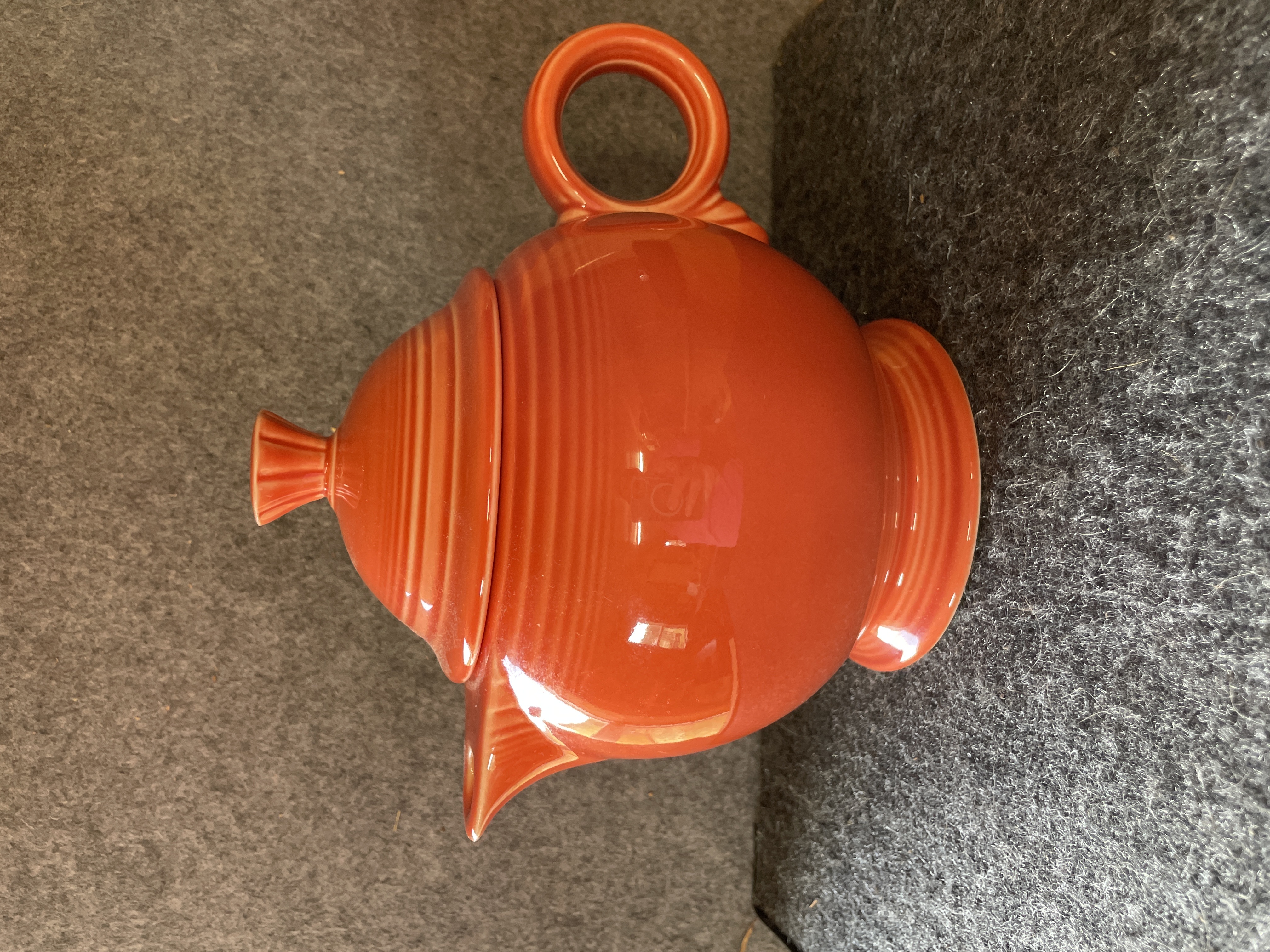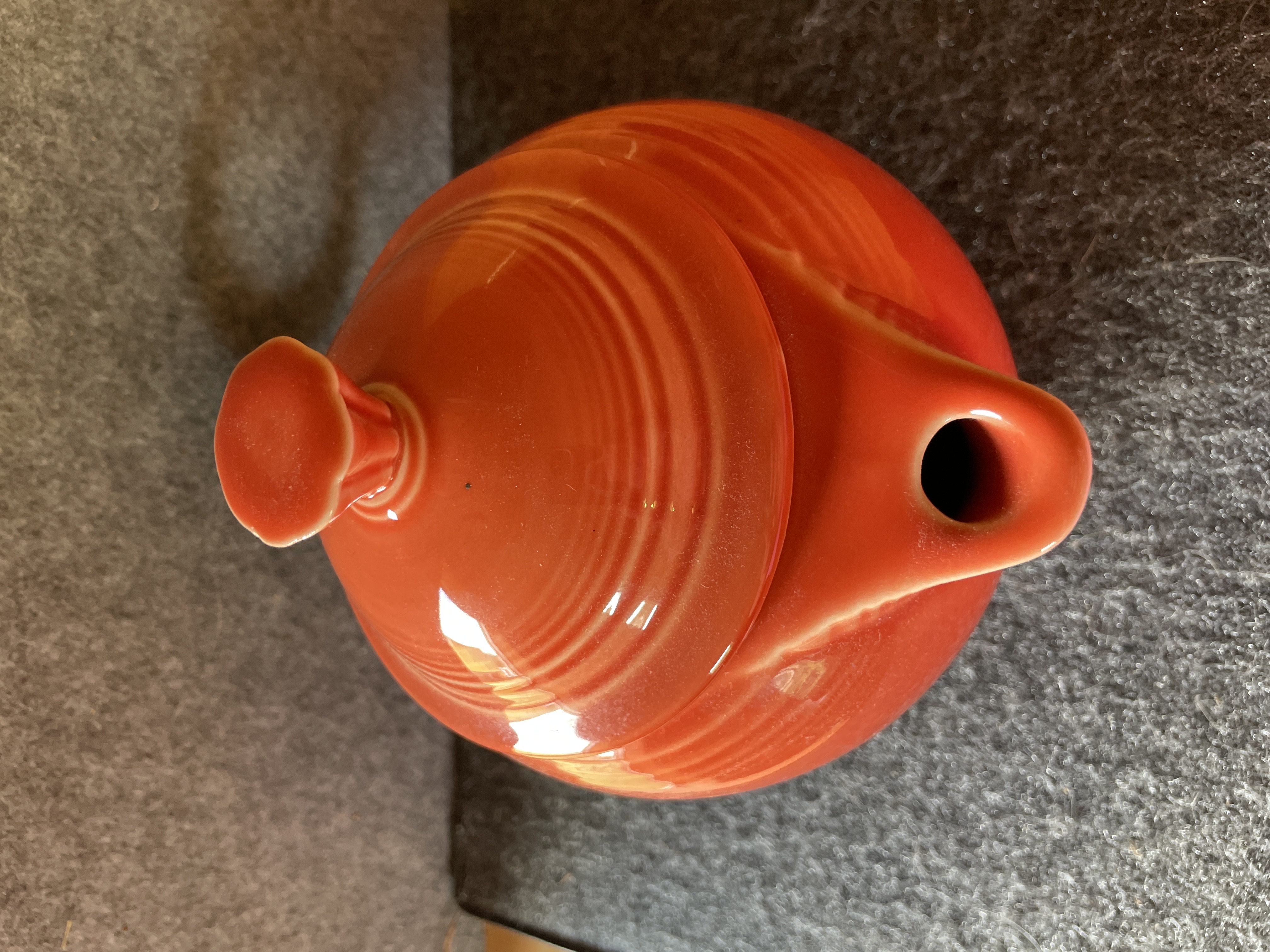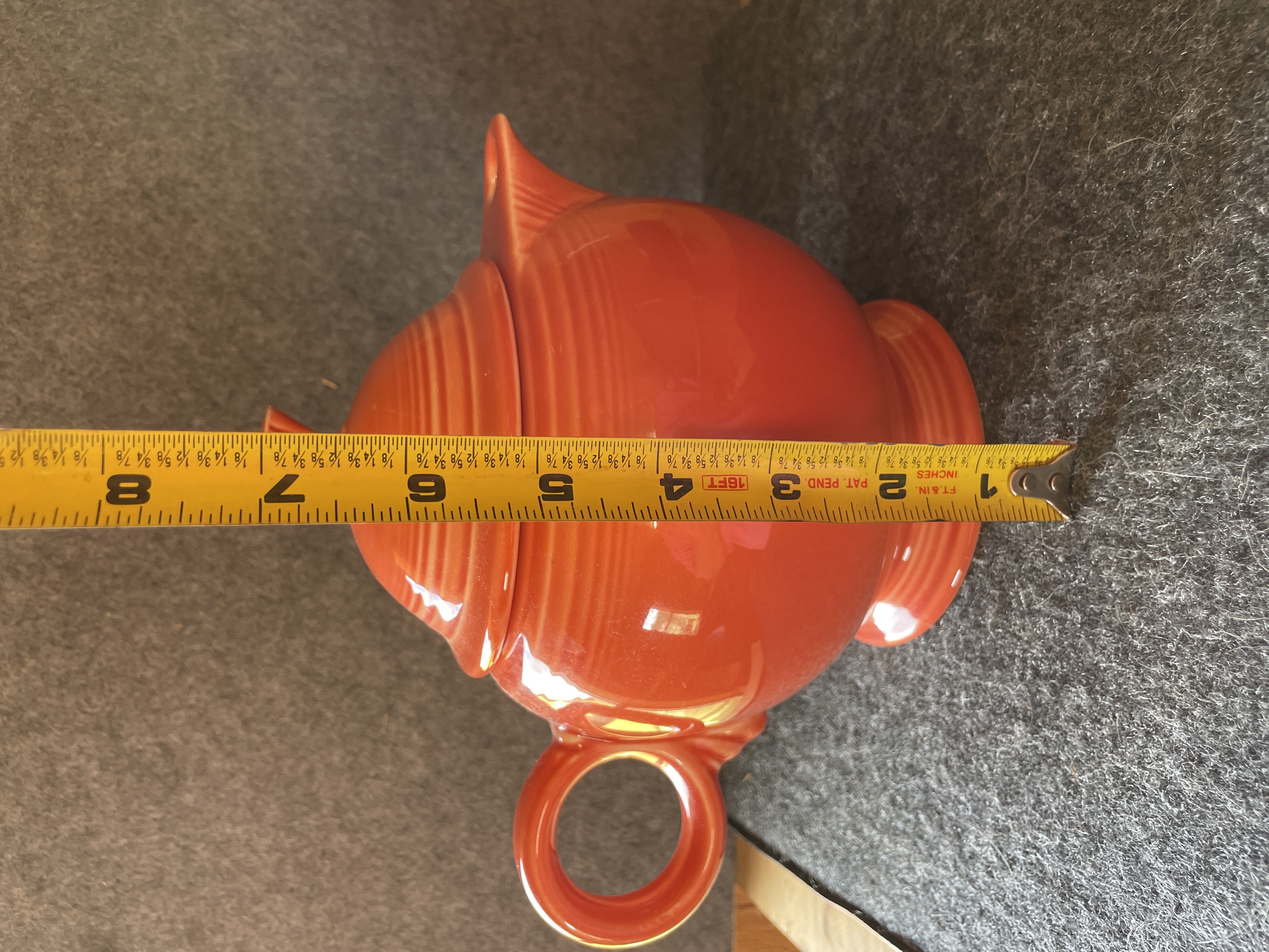 A Homer Laughlin Fiesta persimmon orange ceramic teapot with a matching lid, measuring approximately 7.5 inches in length.