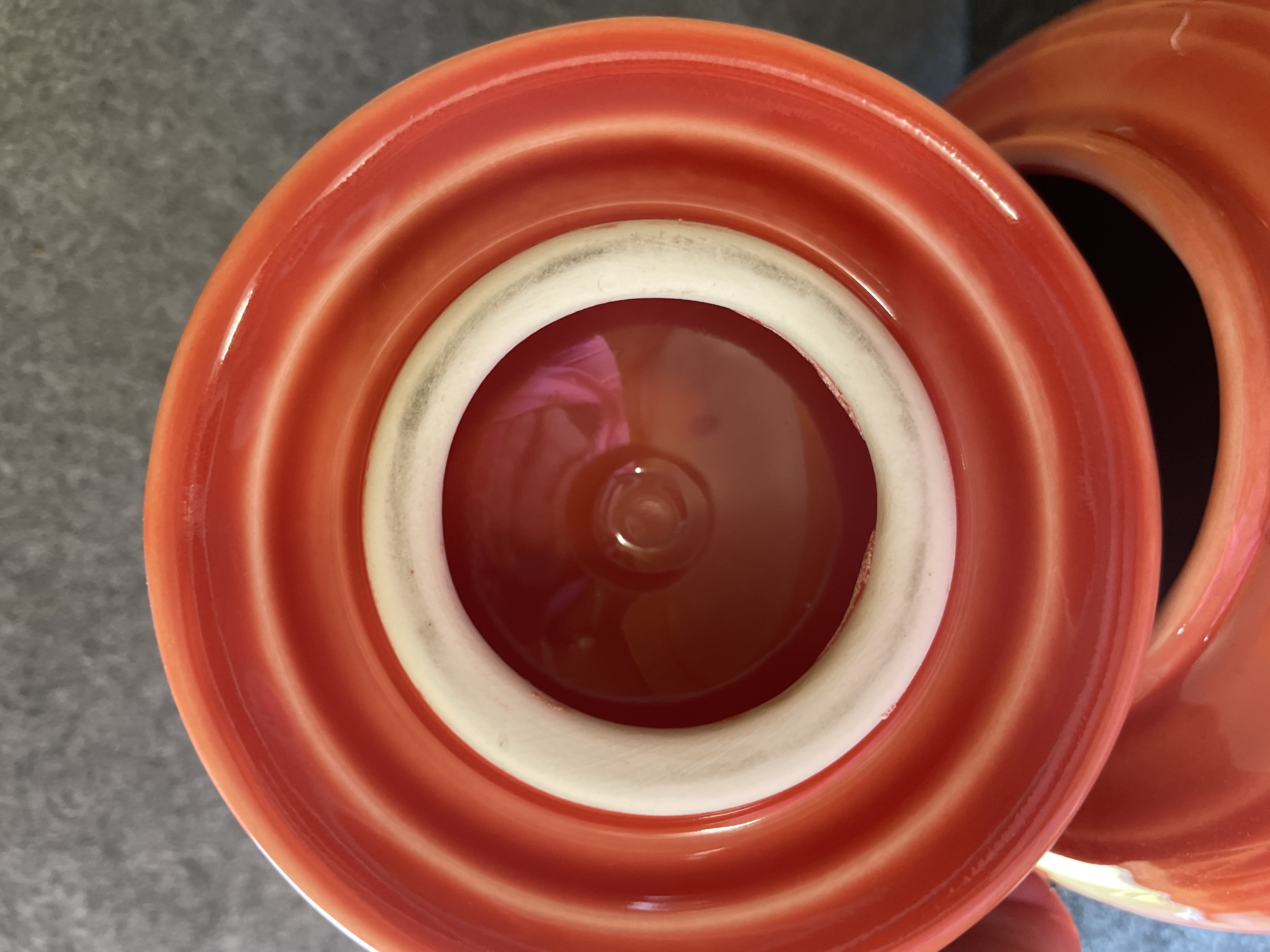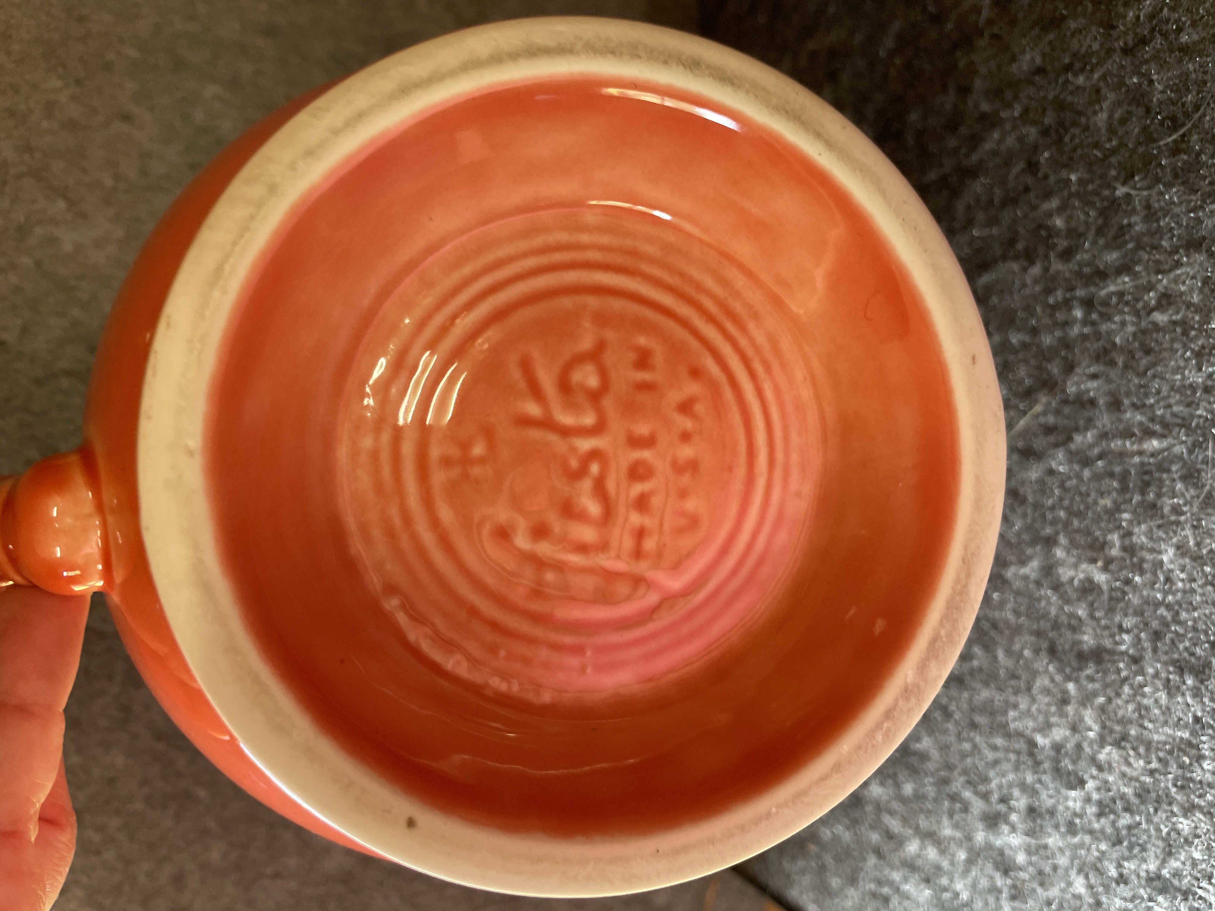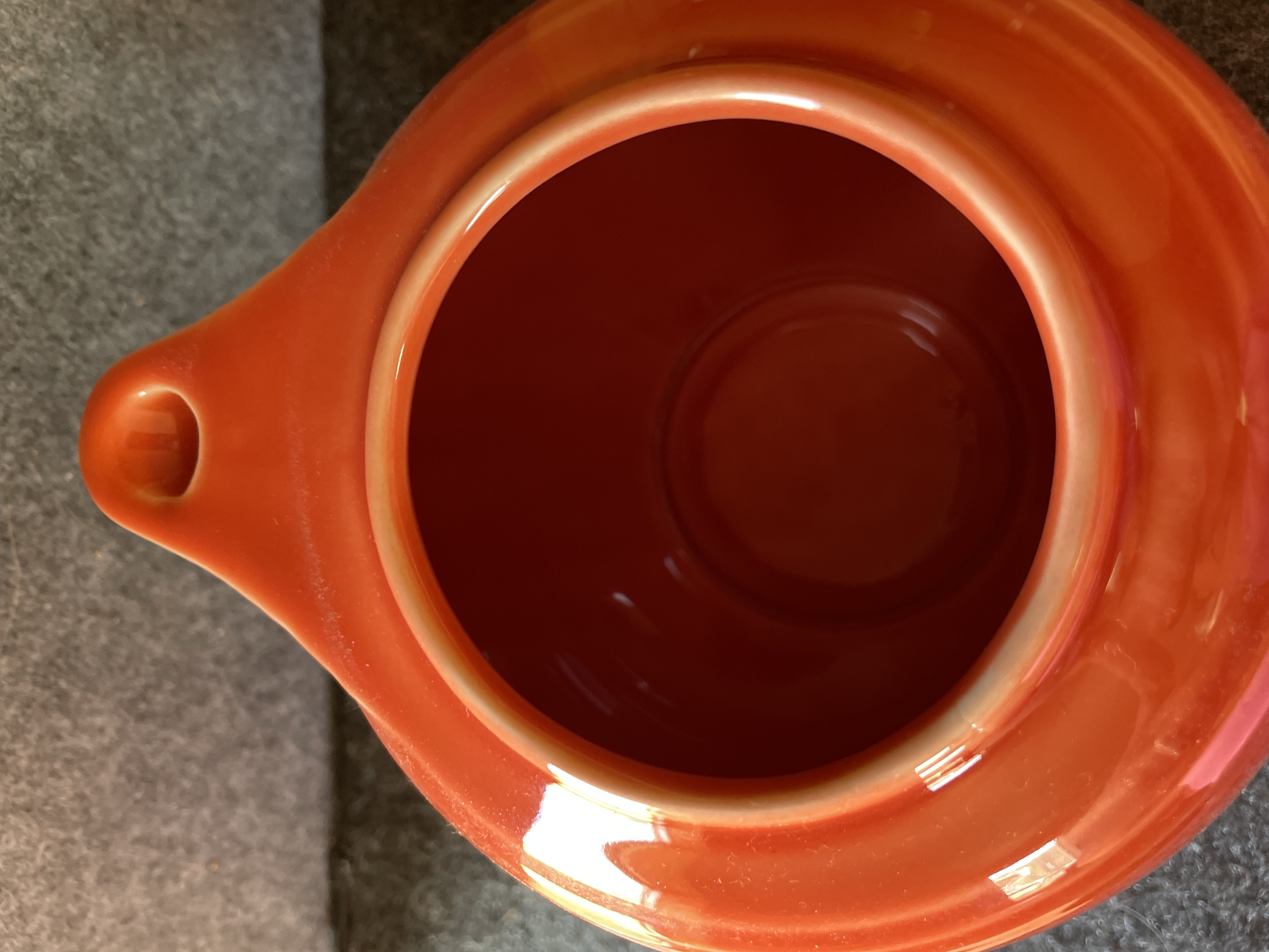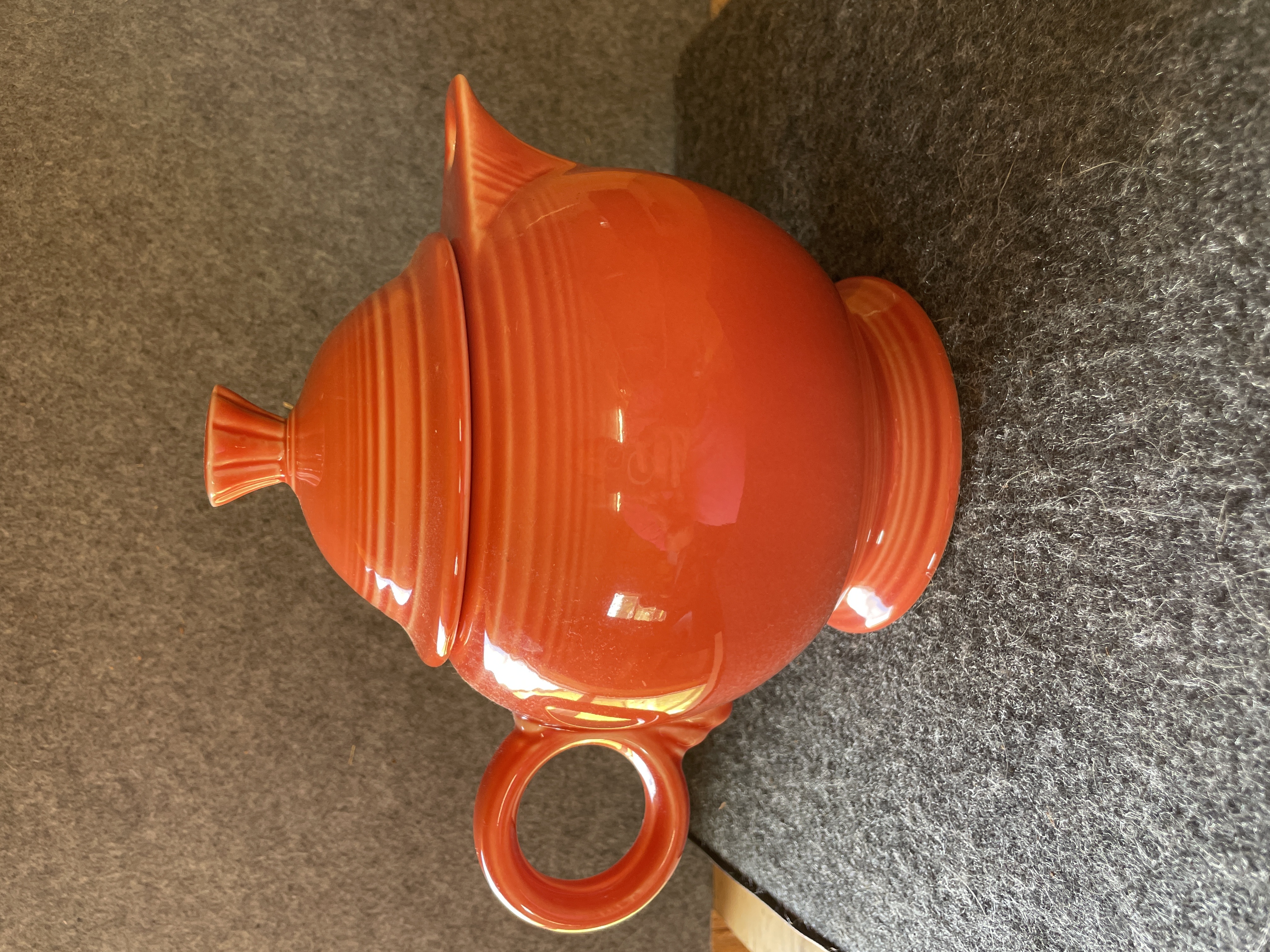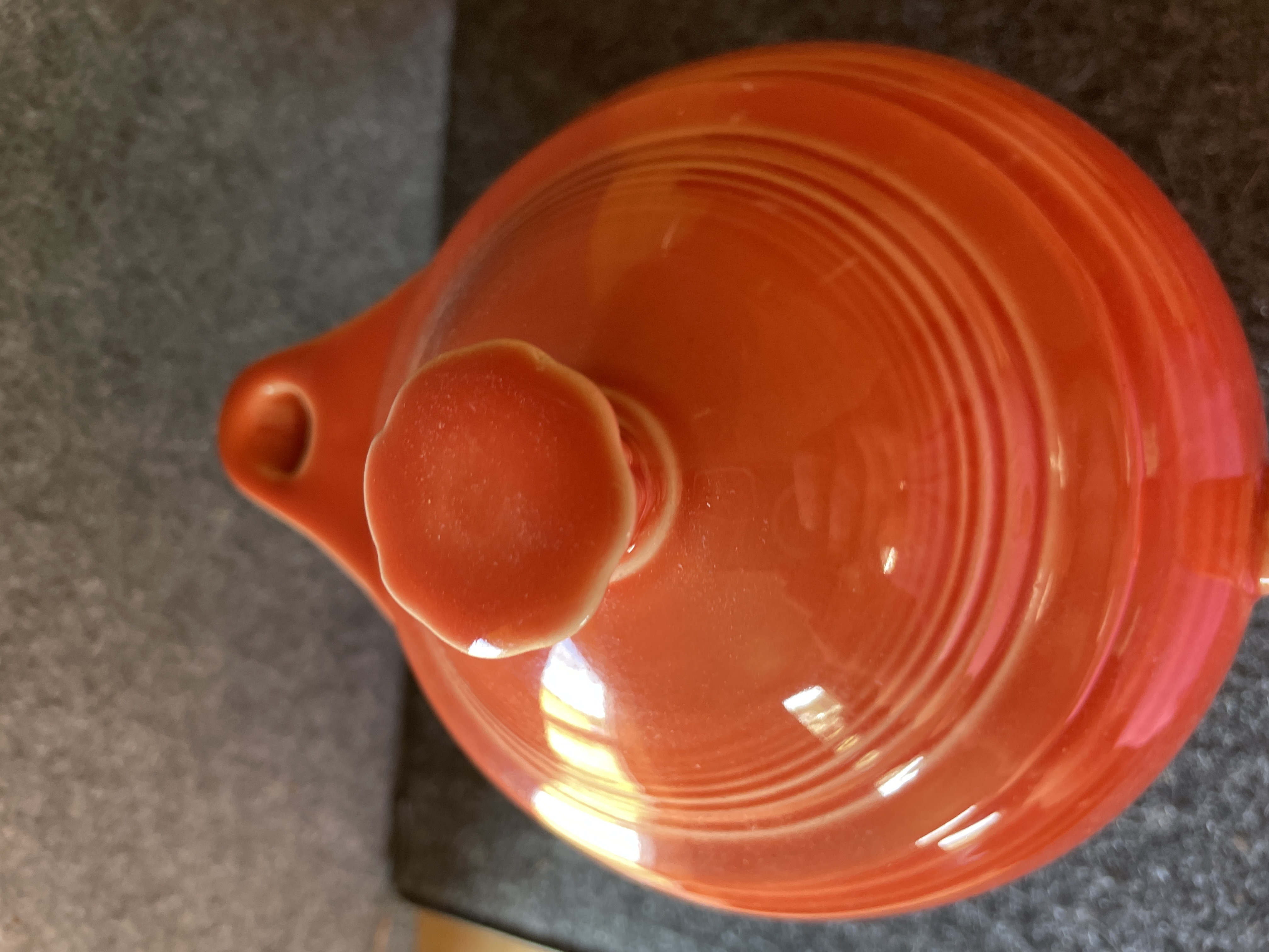 A Homer Laughlin Fiesta persimmon orange ceramic teapot with a matching lid, measuring approximately 7.5 inches in length.