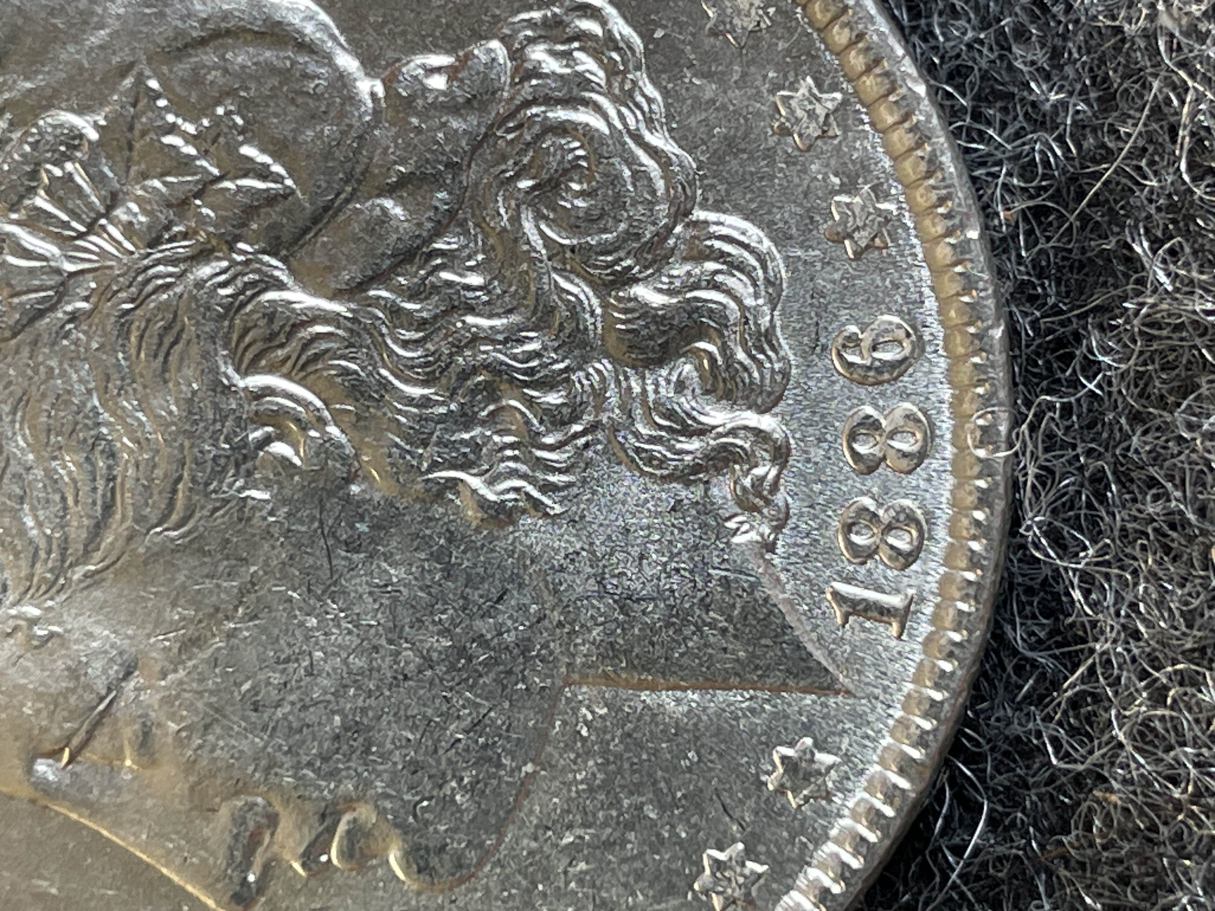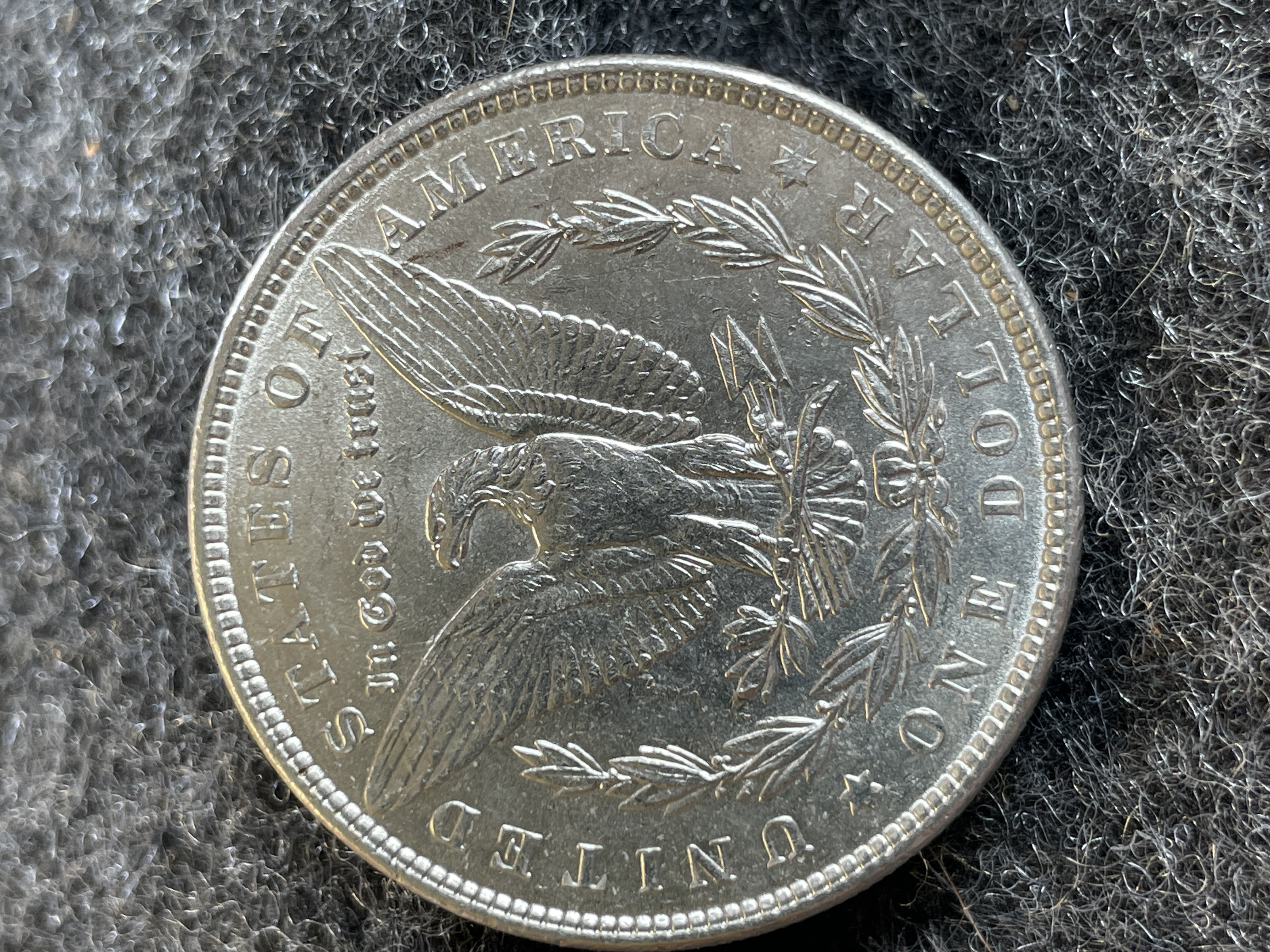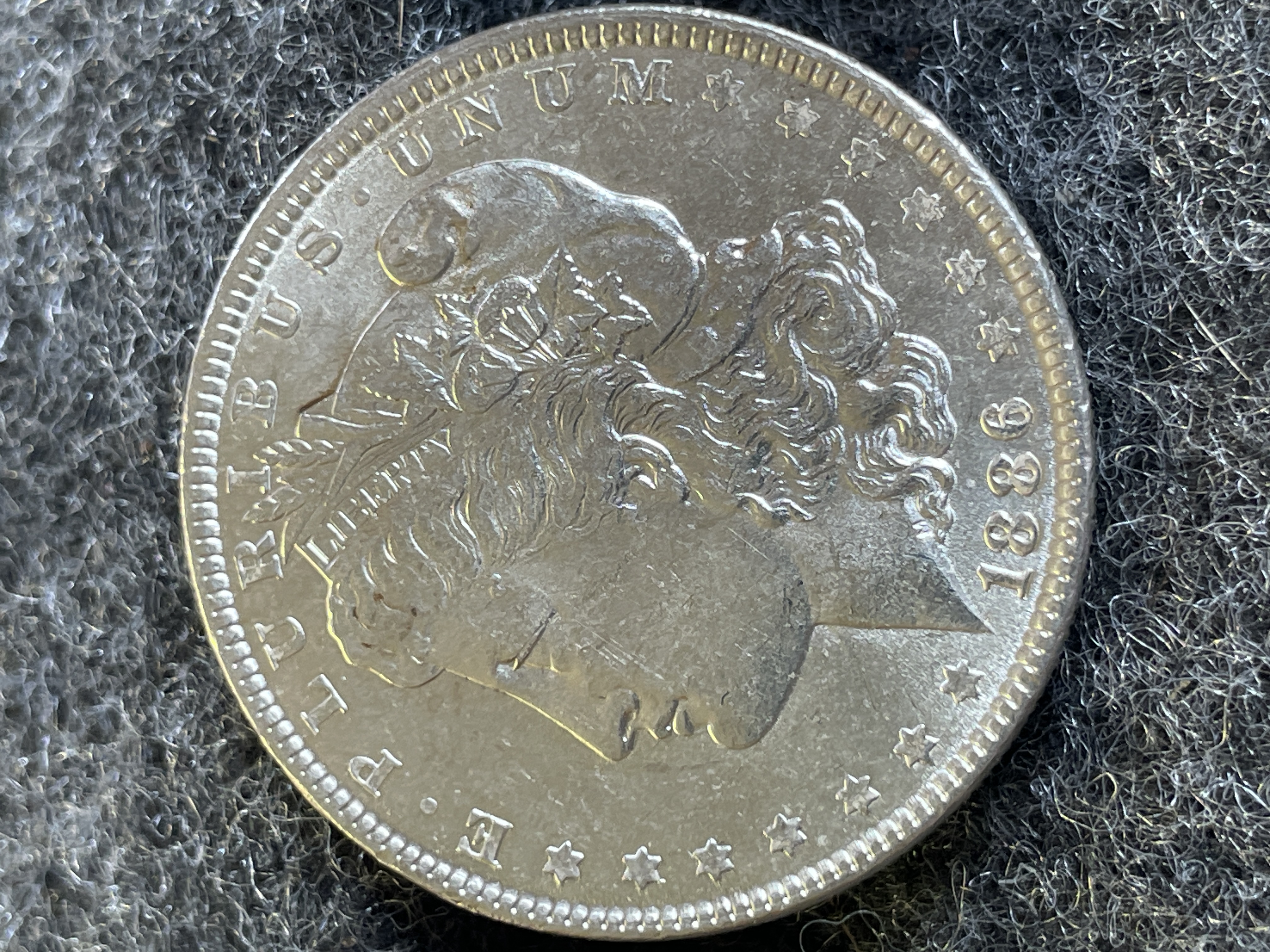 An 1886 United States Morgan silver dollar coin featuring a profile of Liberty on the obverse and an eagle on the reverse.