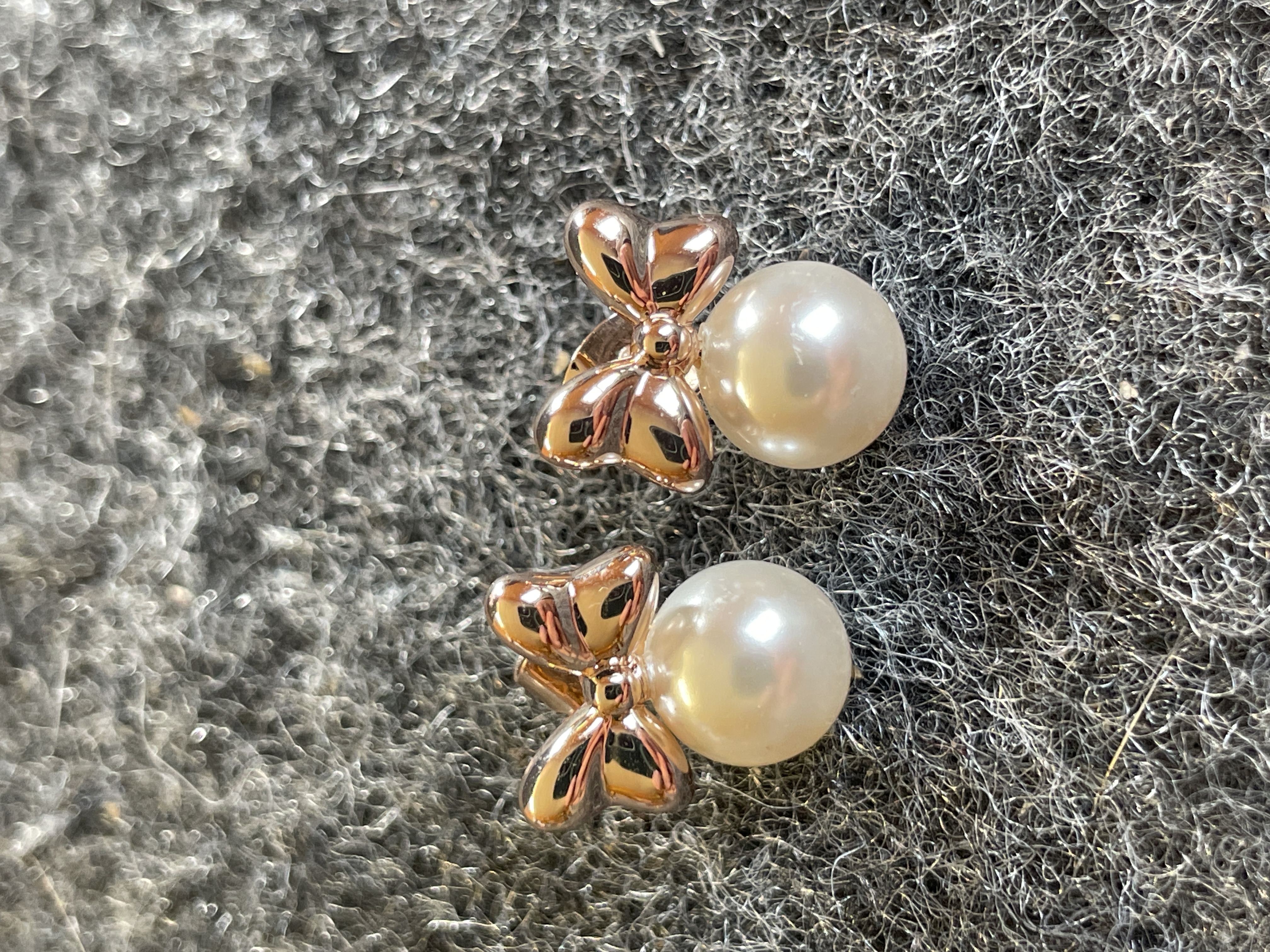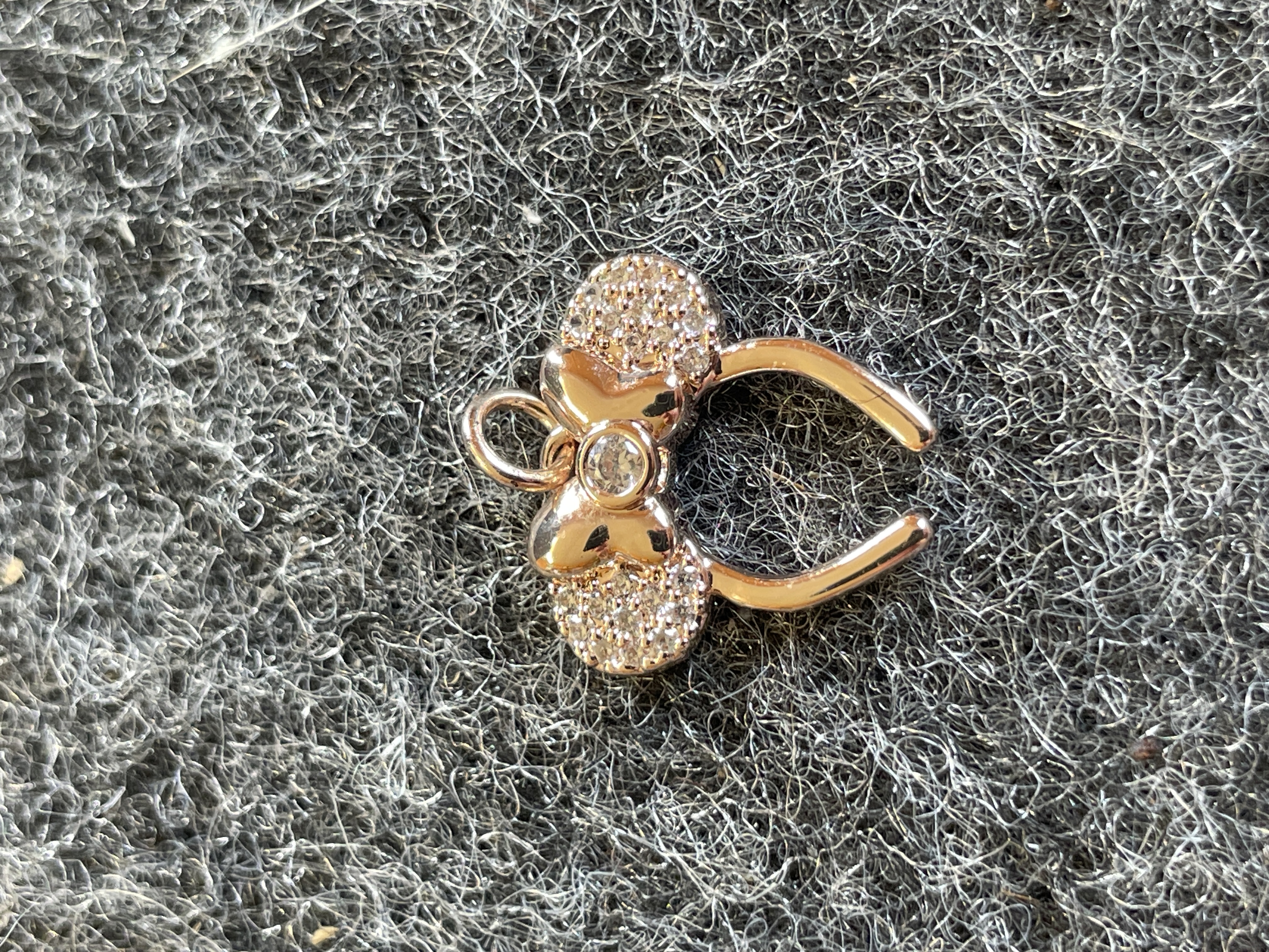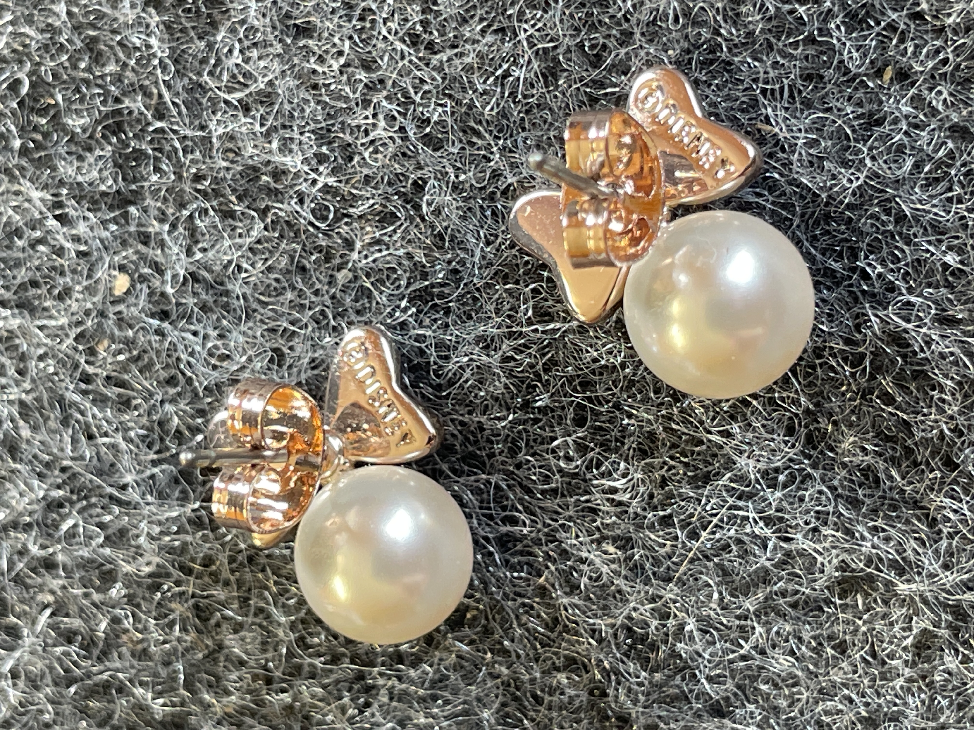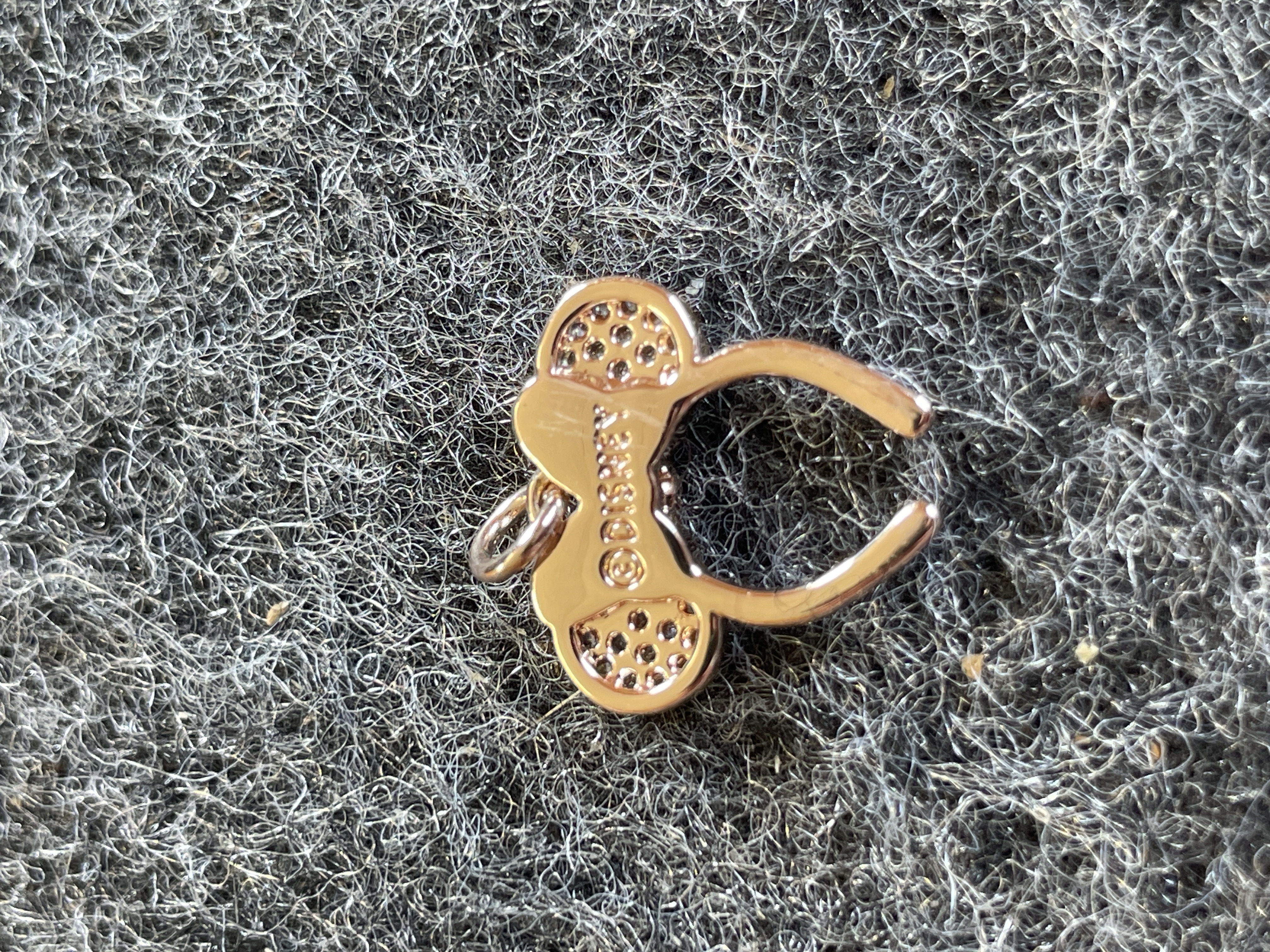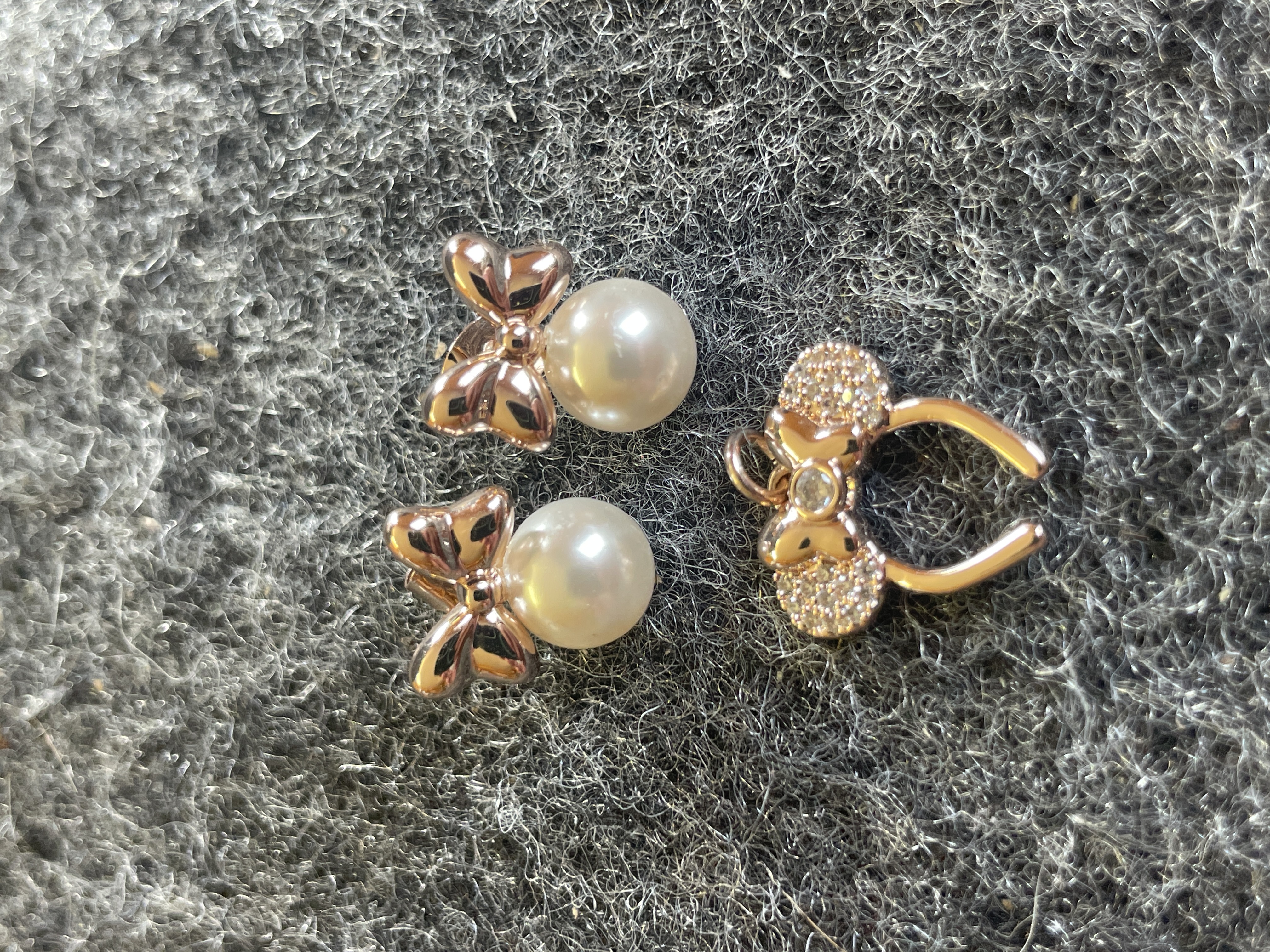 A trio of gold tone jewelry including a pair of pearl bow stud earrings and a stone-set Minnie Mouse headband ear cuff, all featuring the Disney maker’s mark.