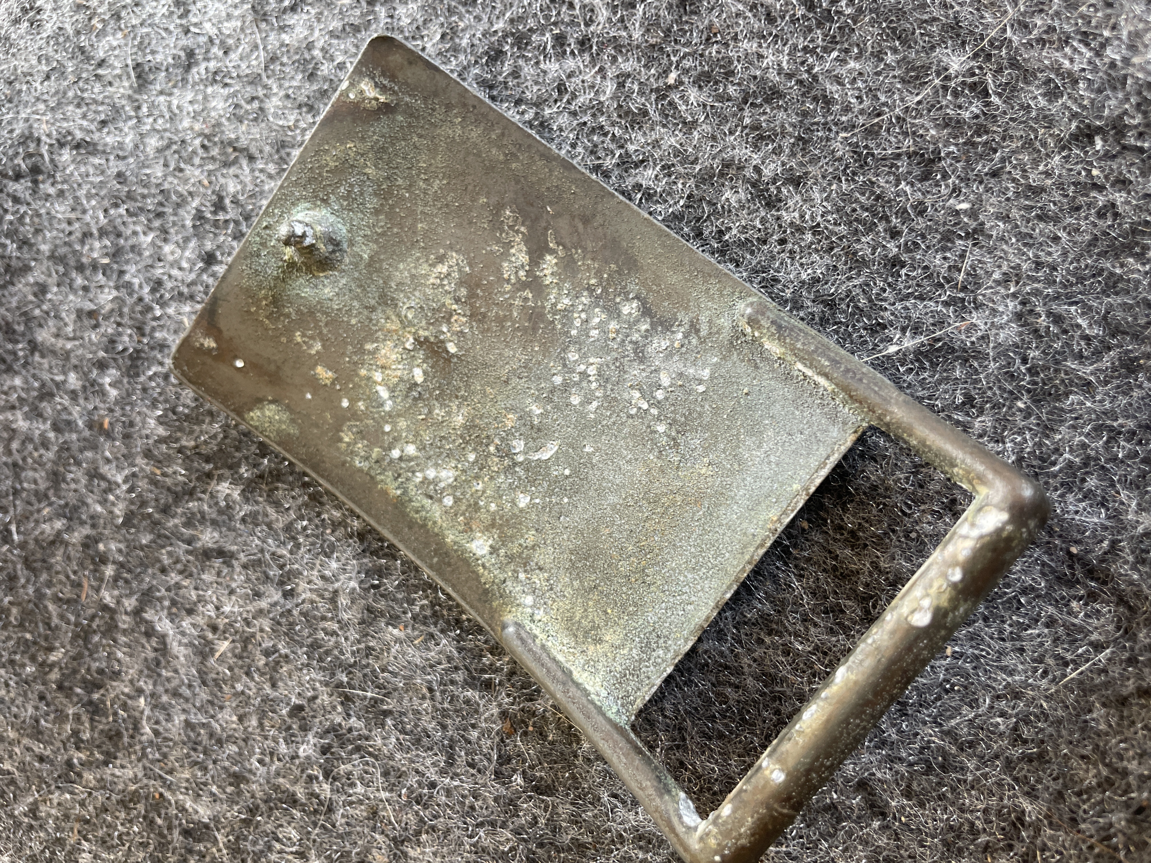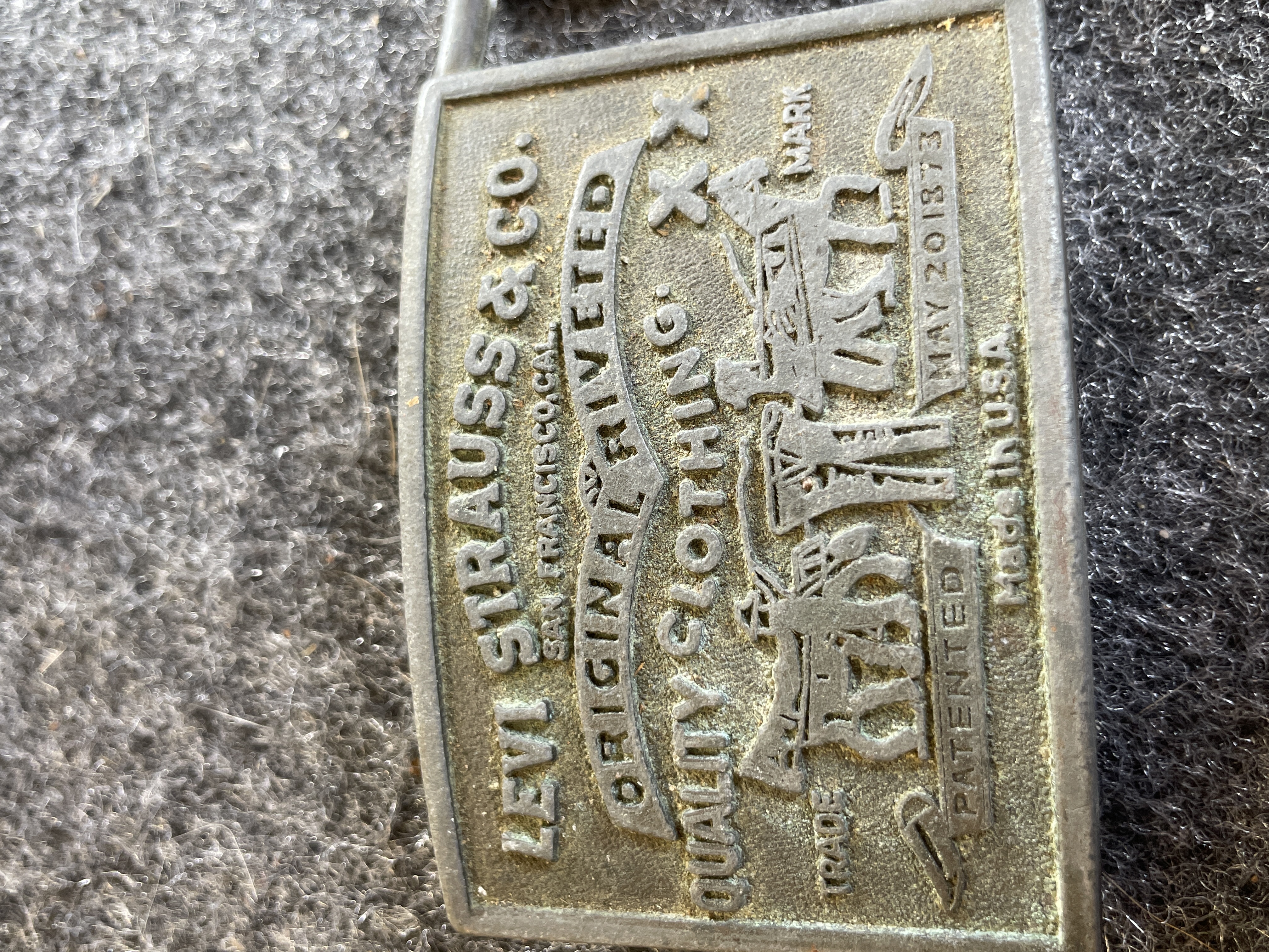 A brass-toned metal belt buckle featuring embossed Levi Strauss & Co. branding and a greenish patina.