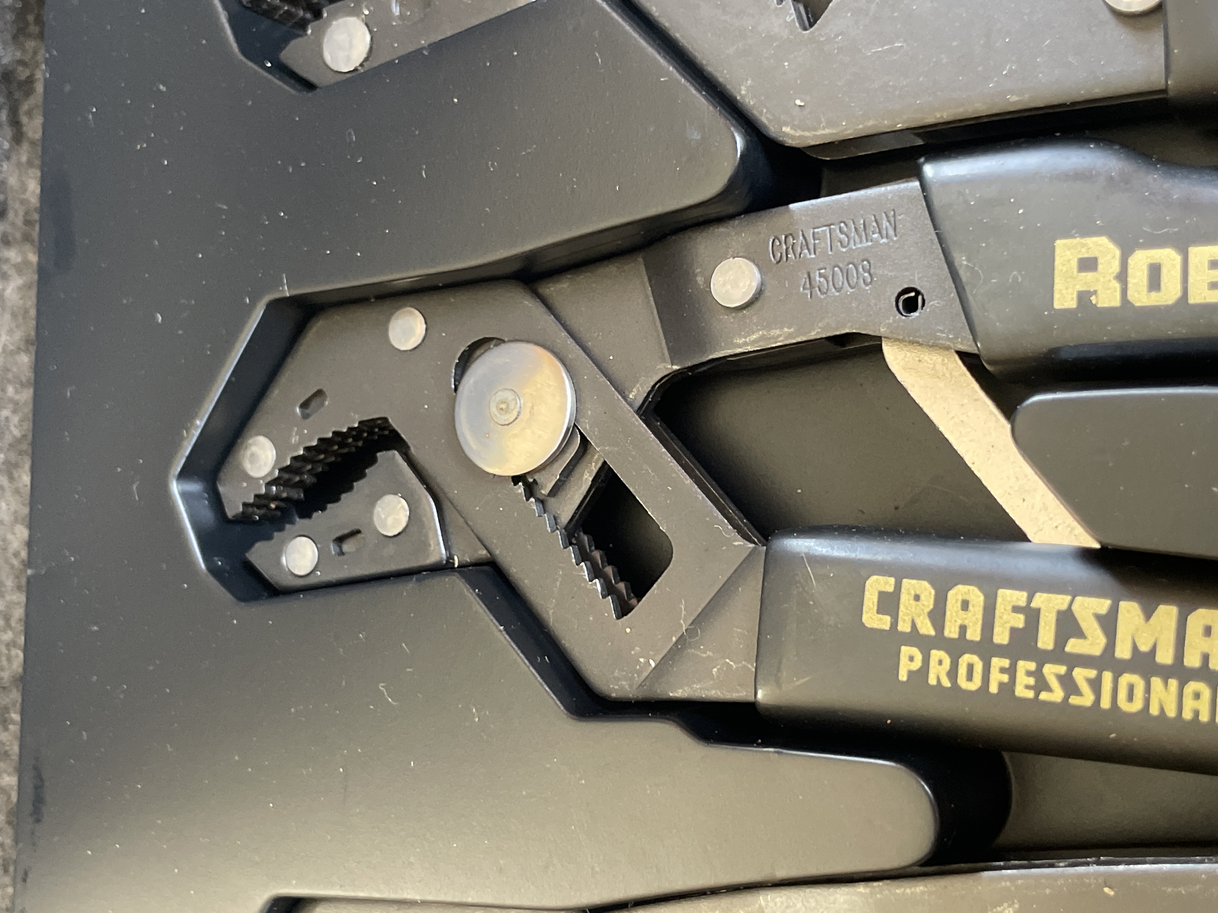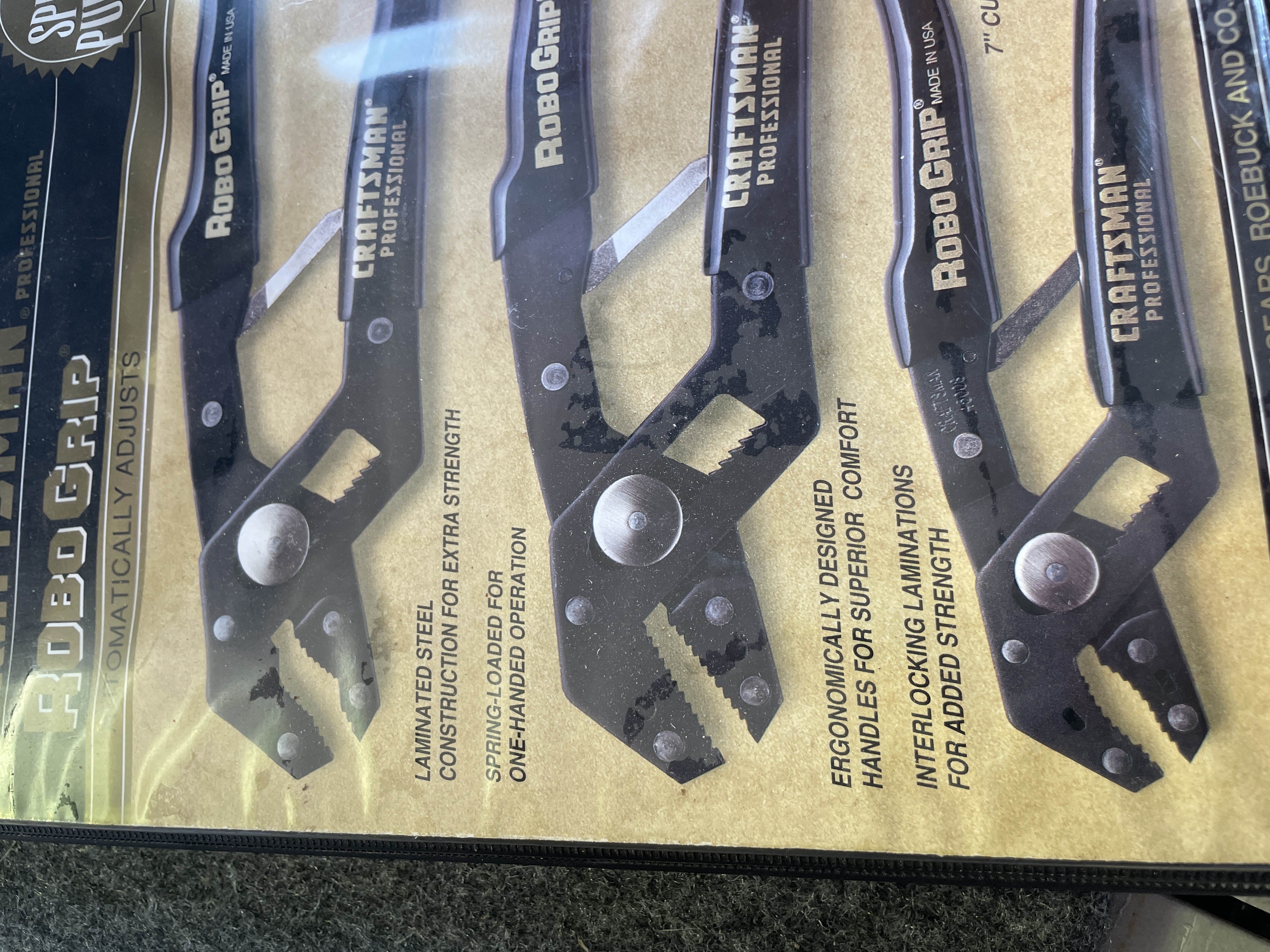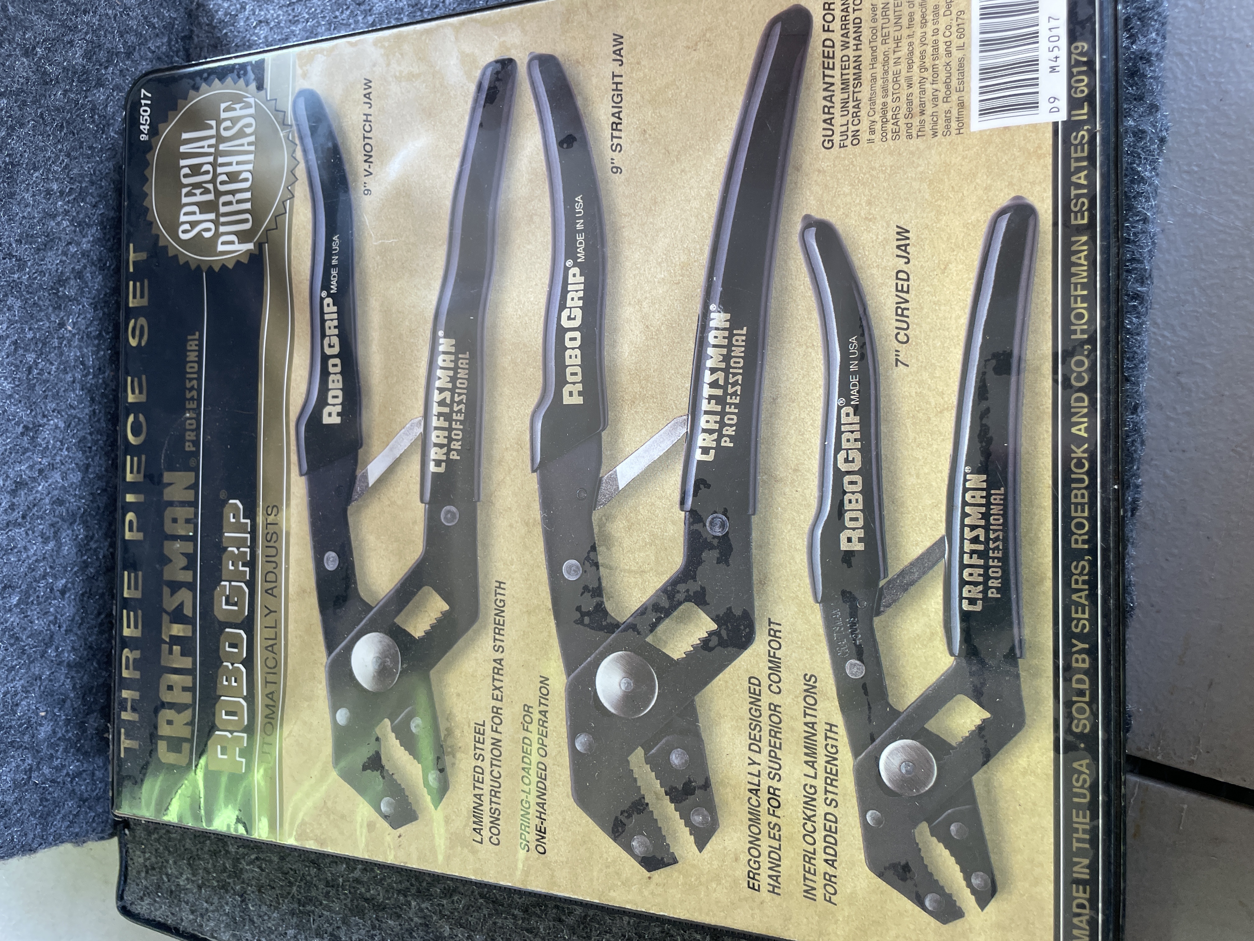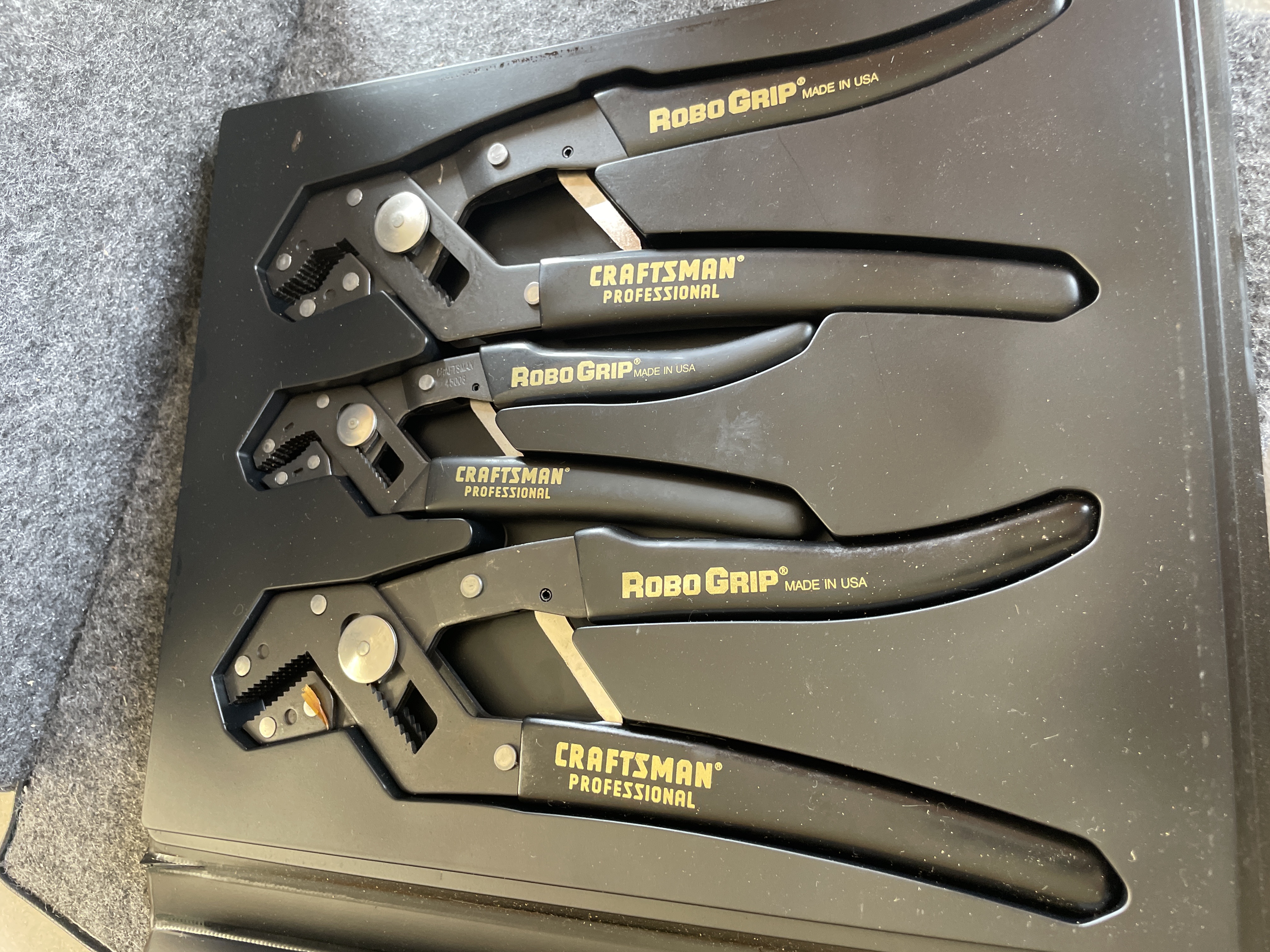 A three piece set of Craftsman Professional Robo Grip pliers featuring laminated steel construction and including 7 inch and 9 inch models made in the USA.