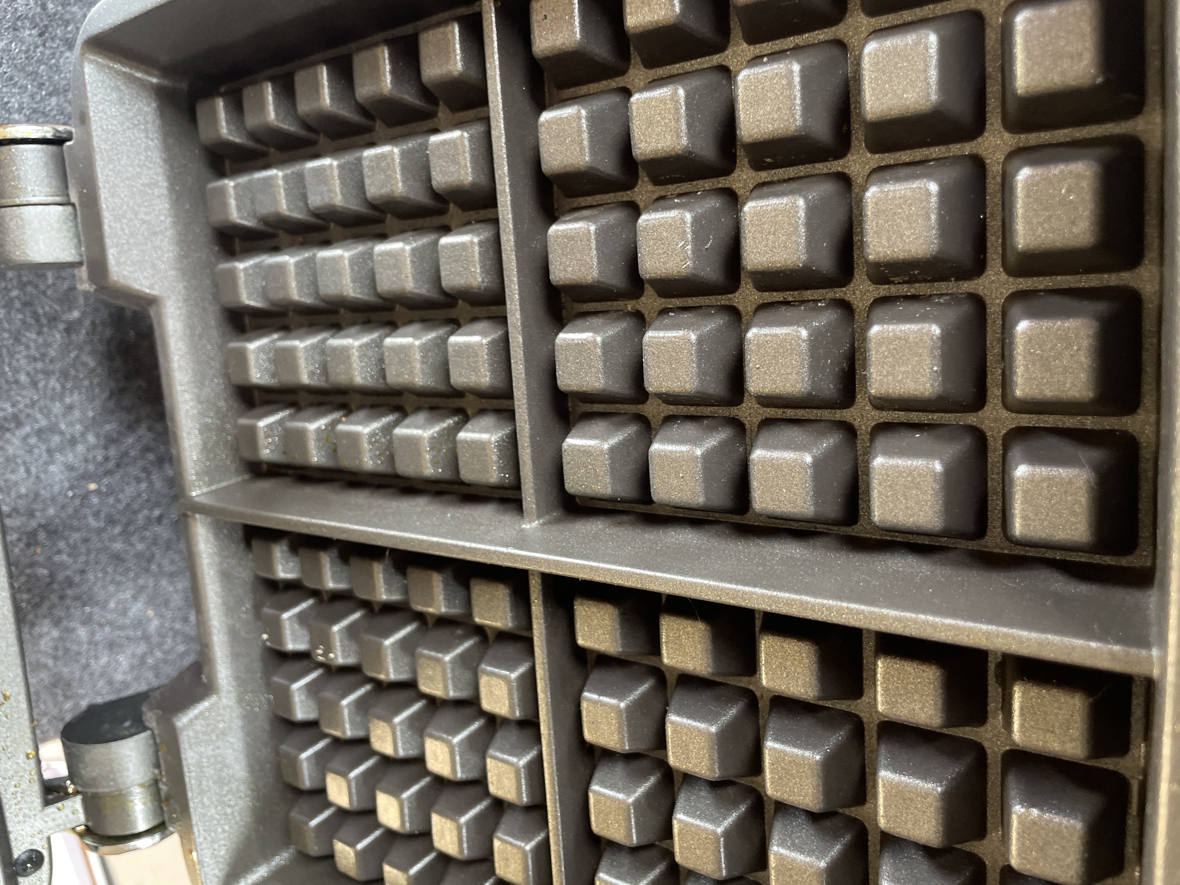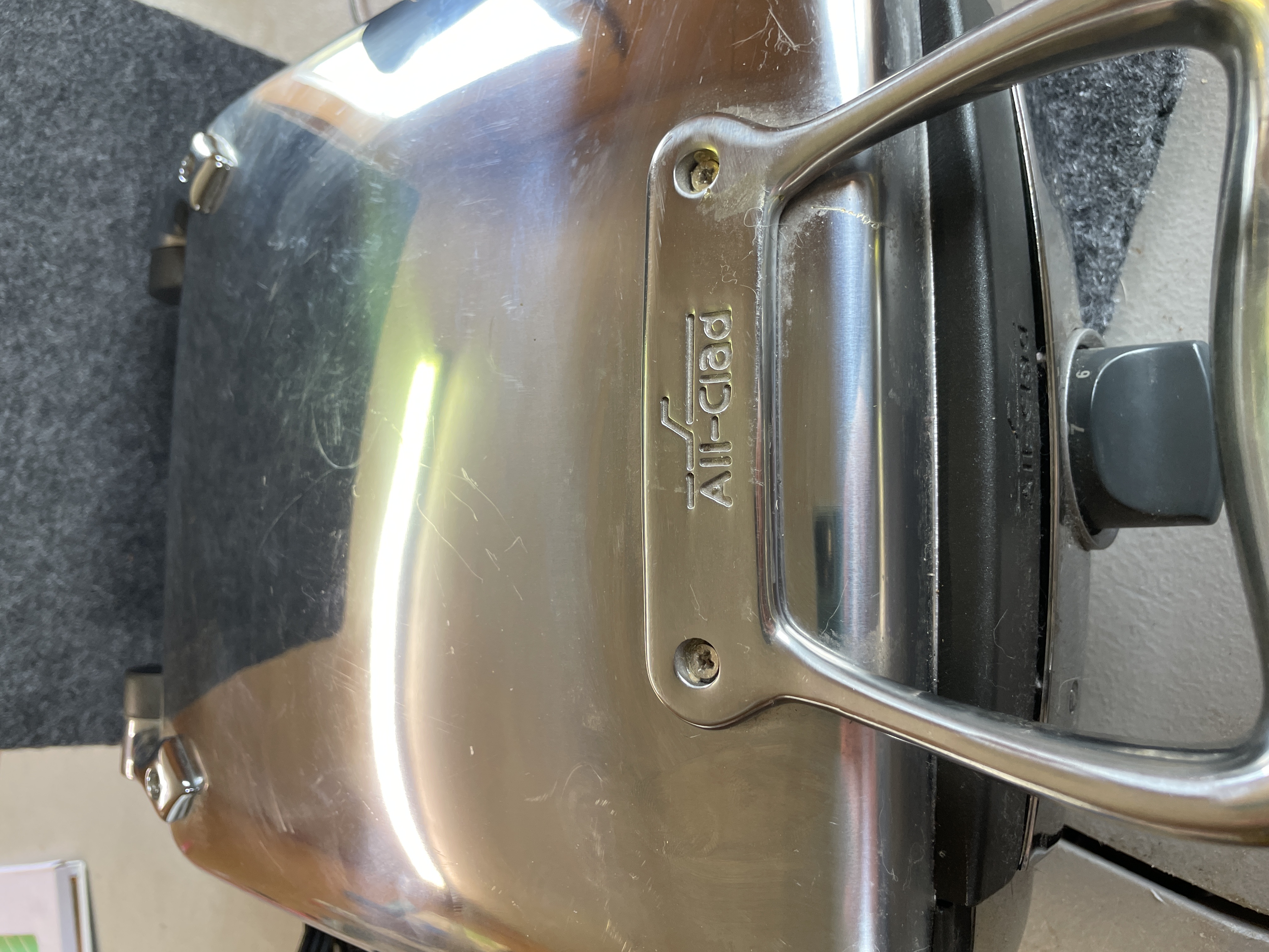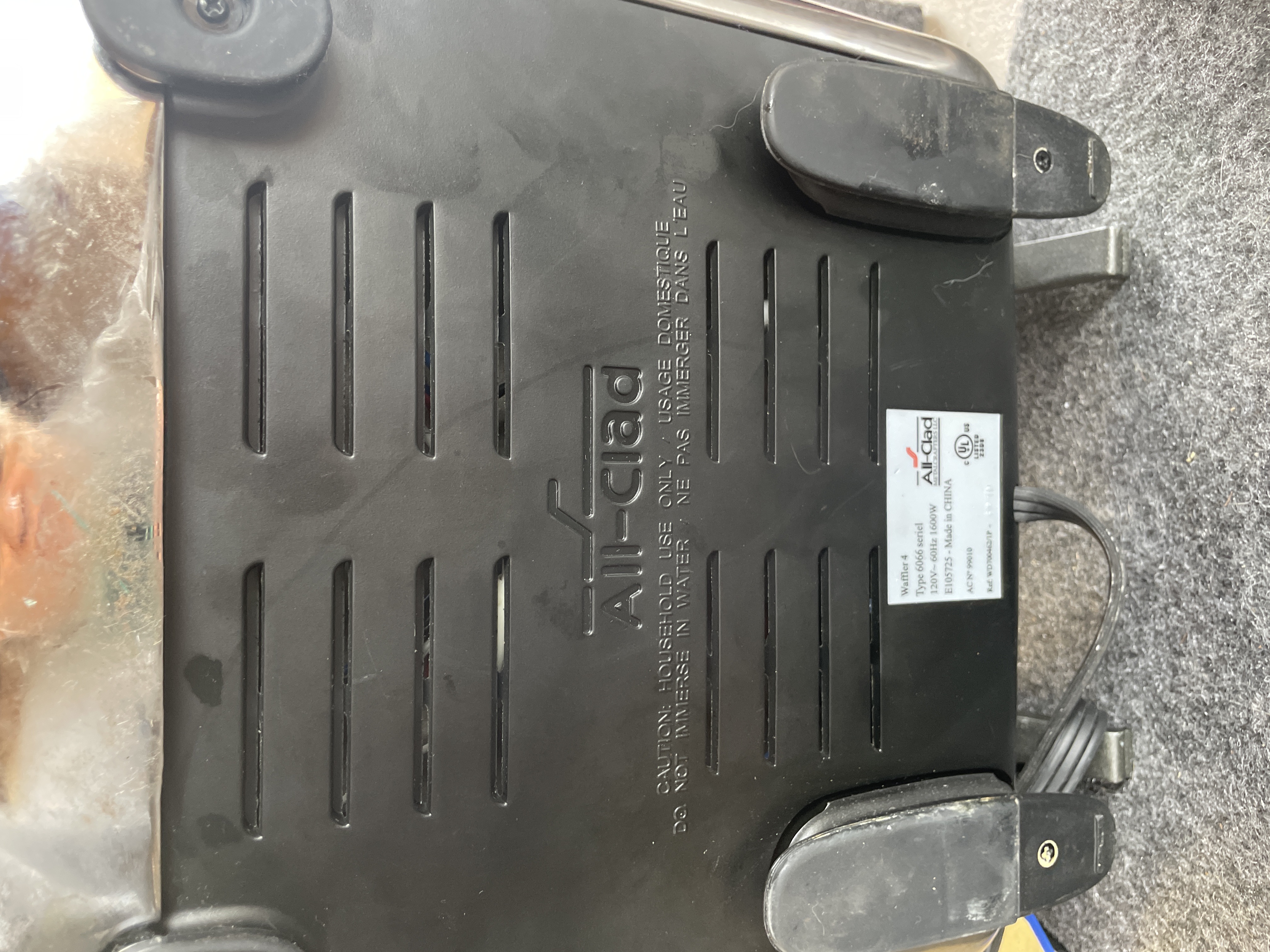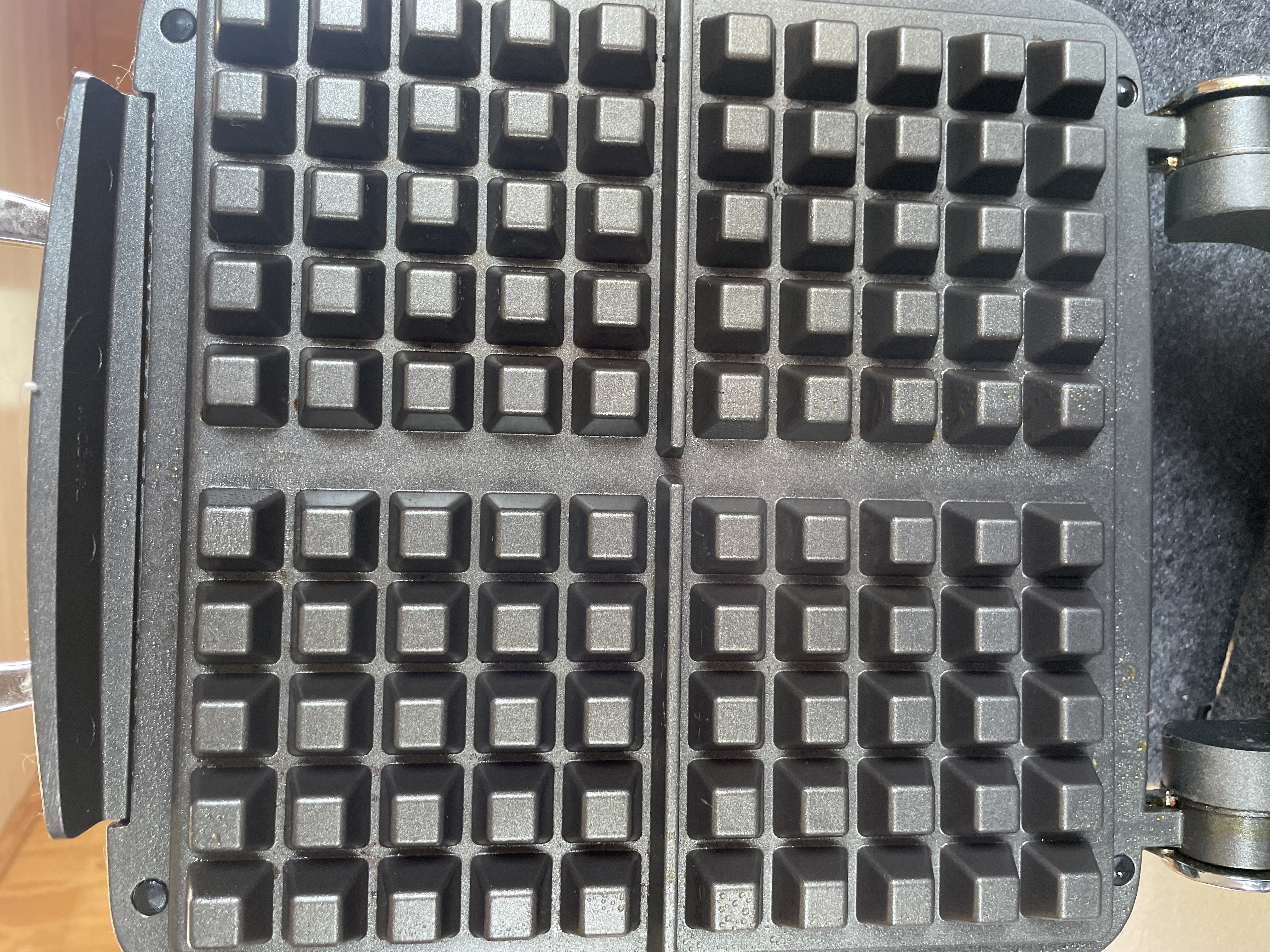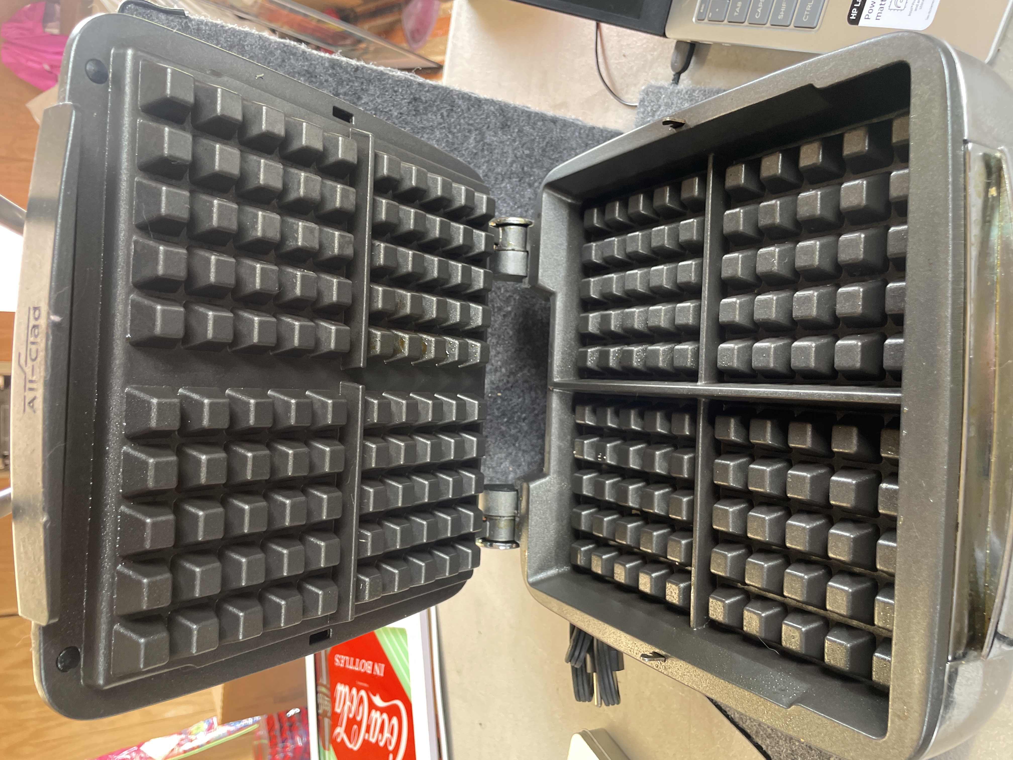 An All-Clad Waffler 4 electric waffle maker featuring a polished stainless steel exterior, four-square non-stick cooking plates, and 1600W of power.