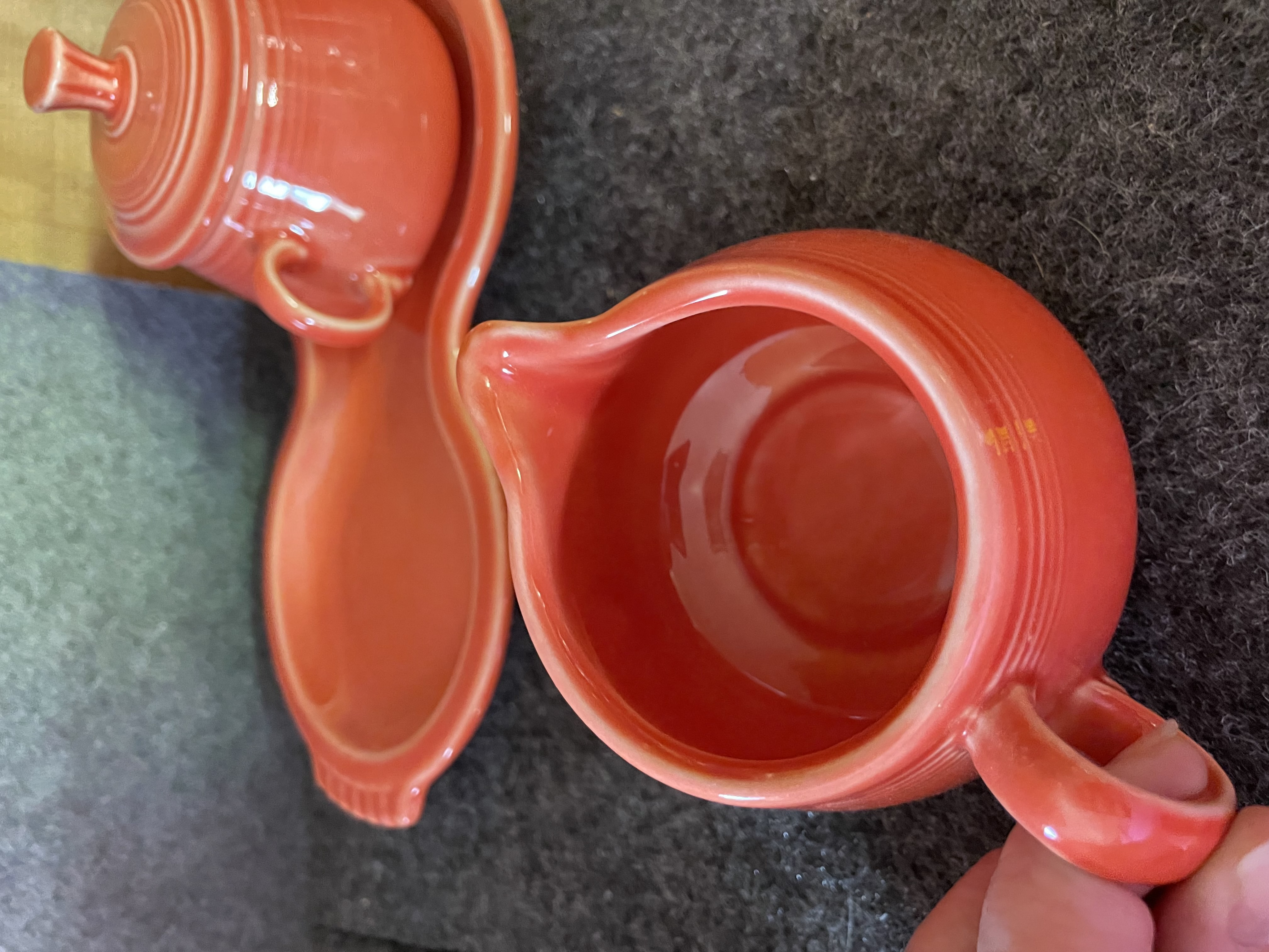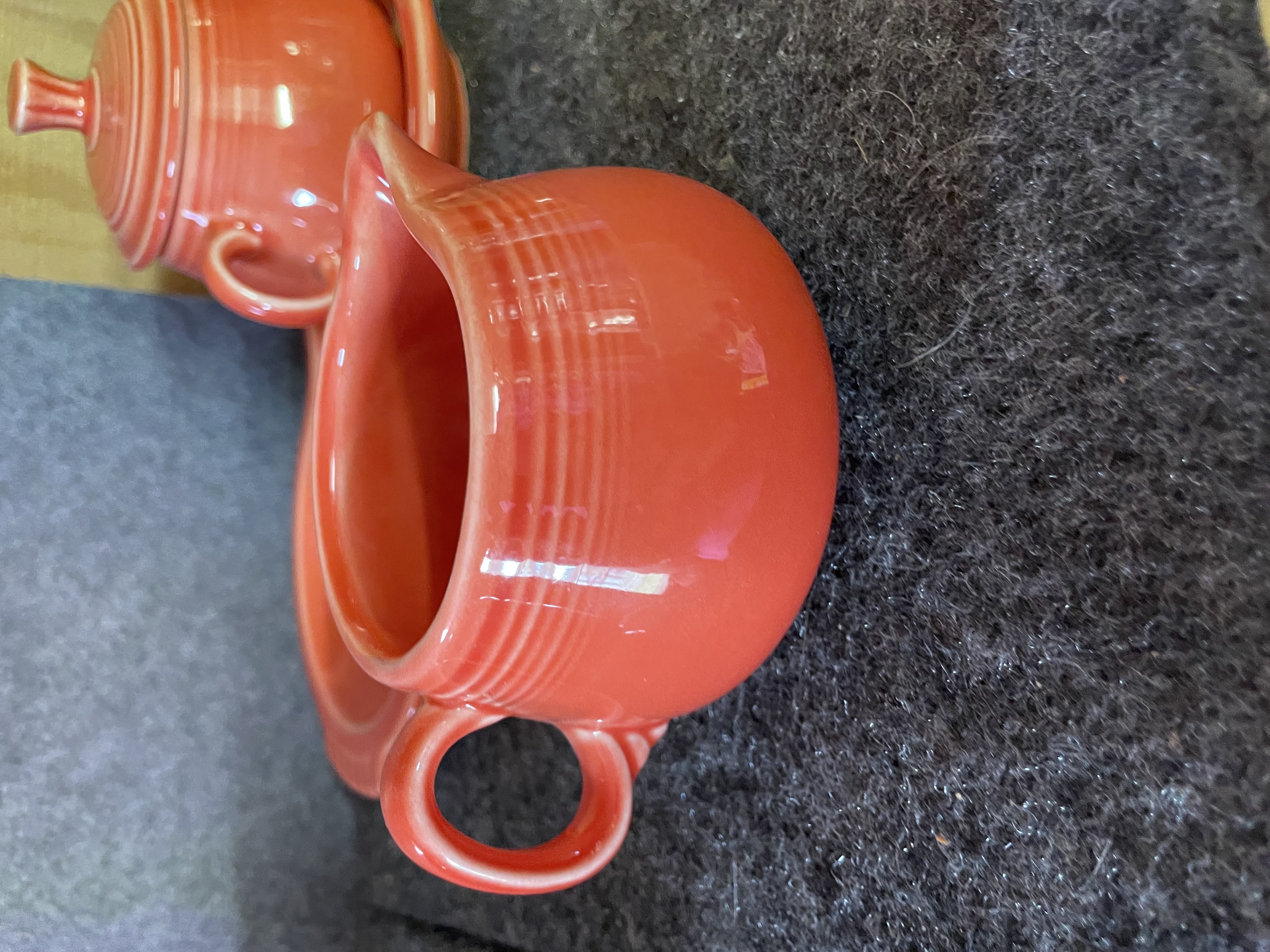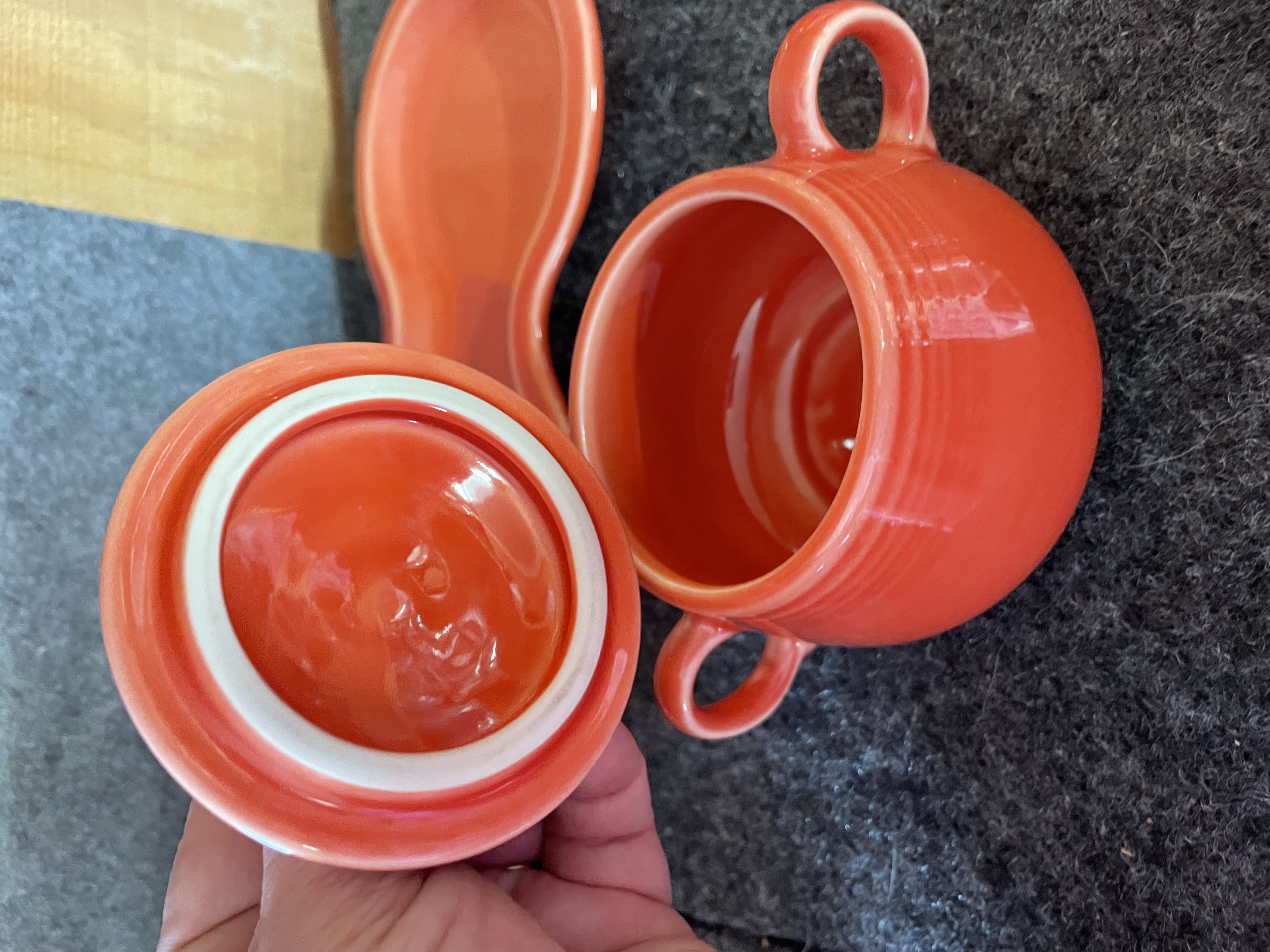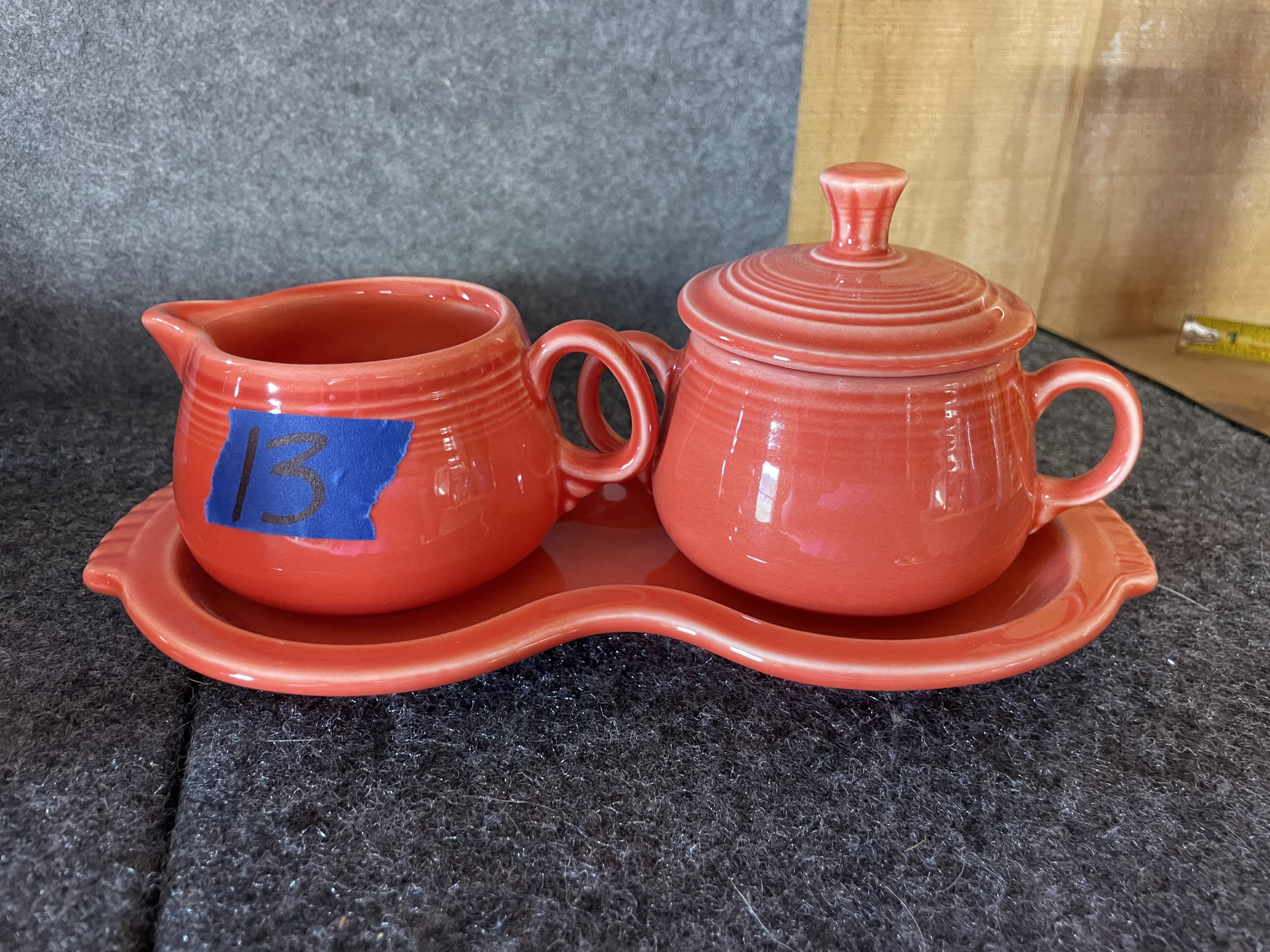 A three-piece orange-red ceramic set featuring a creamer, a lidded sugar bowl, and a figure-eight tray marked HLC Fiesta USA.