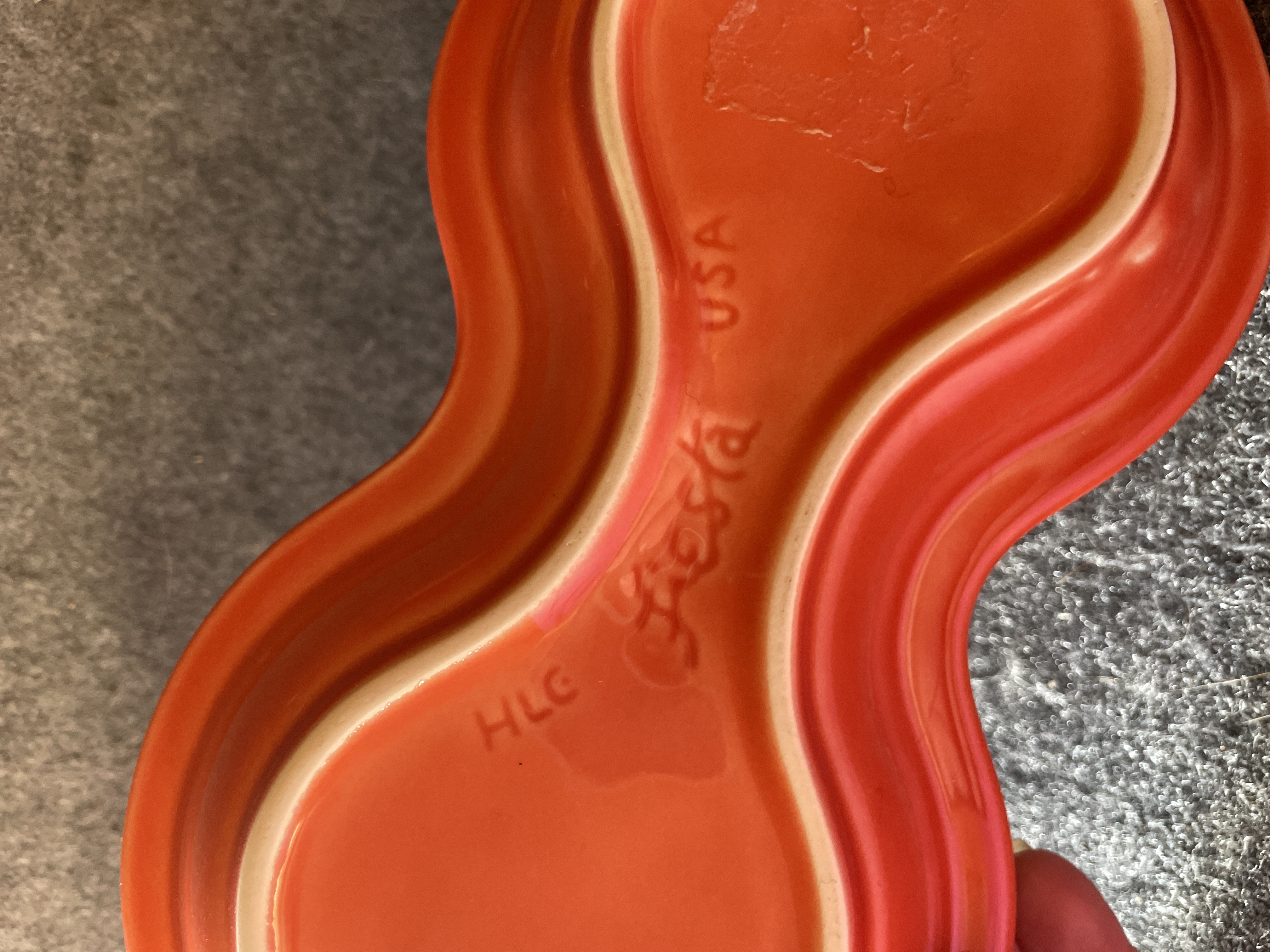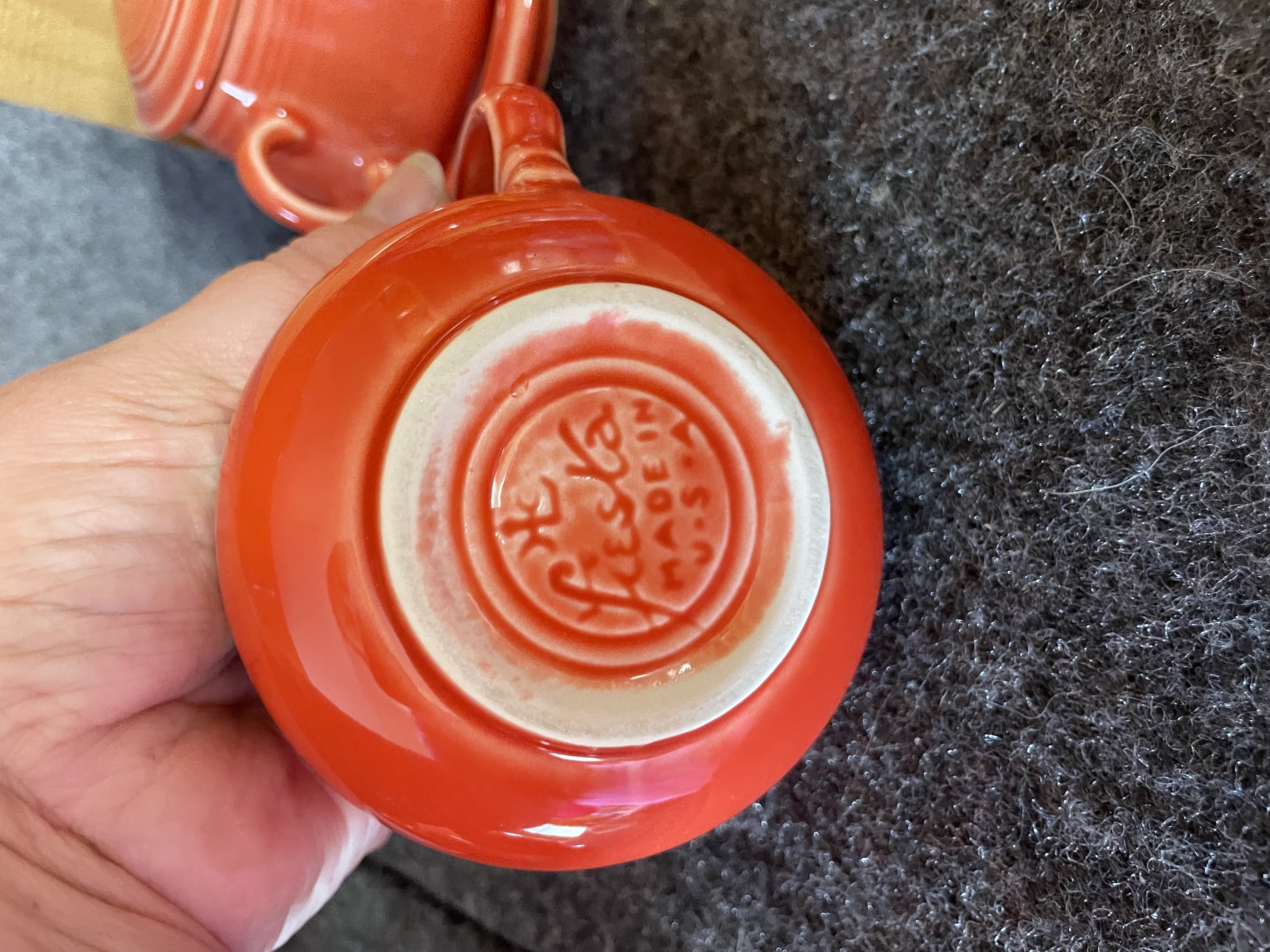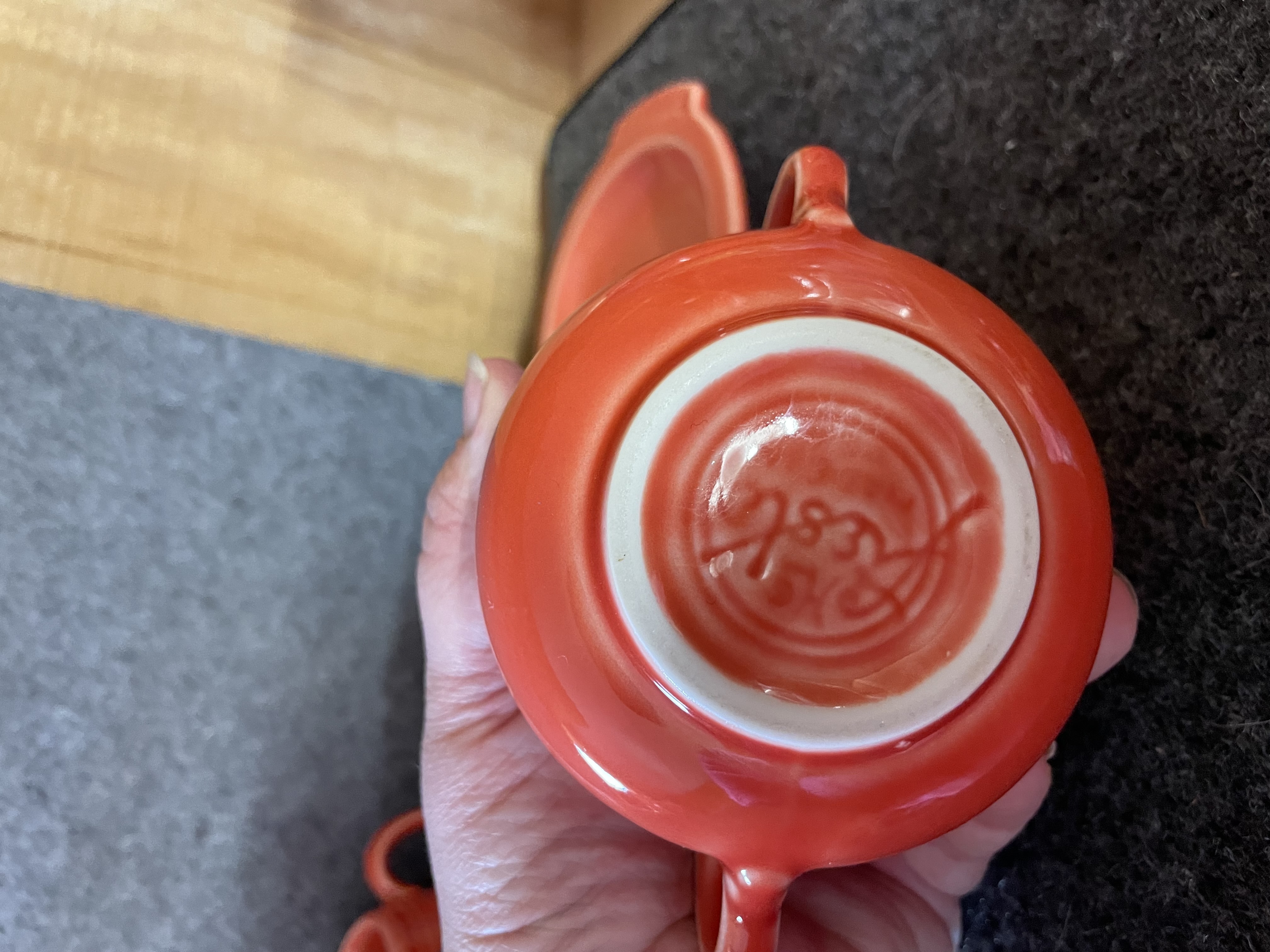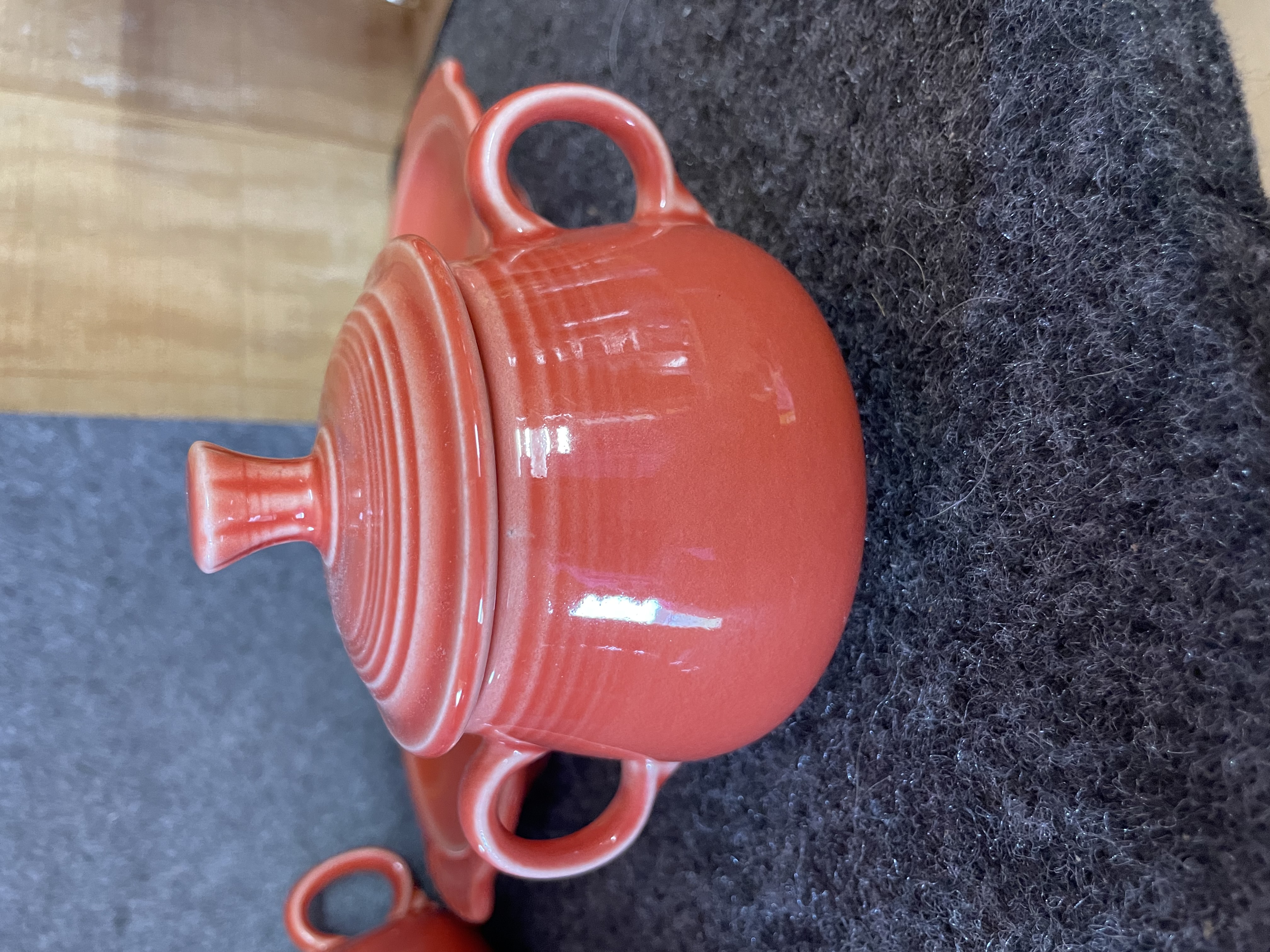A three-piece orange-red ceramic set featuring a creamer, a lidded sugar bowl, and a figure-eight tray marked HLC Fiesta USA.