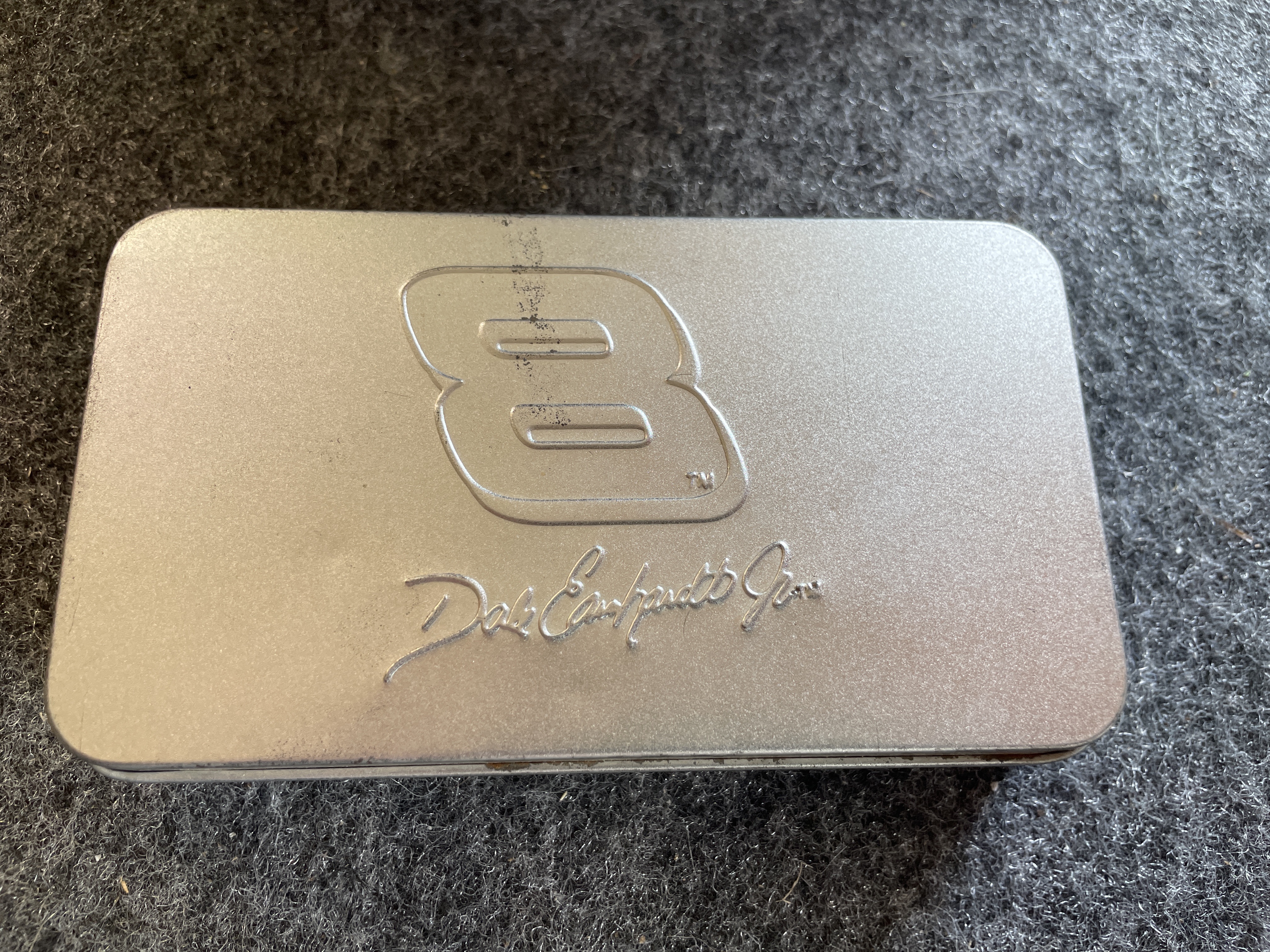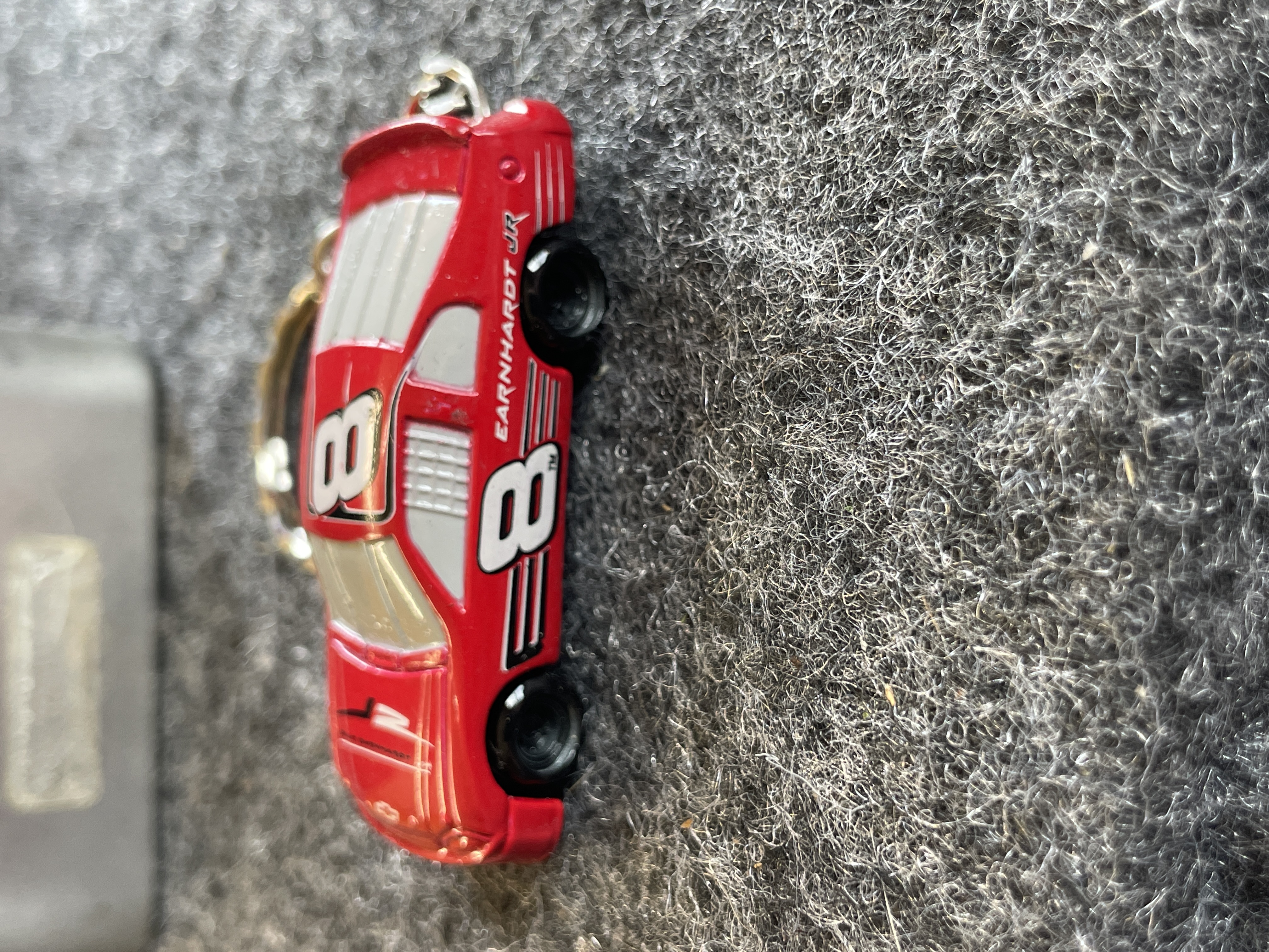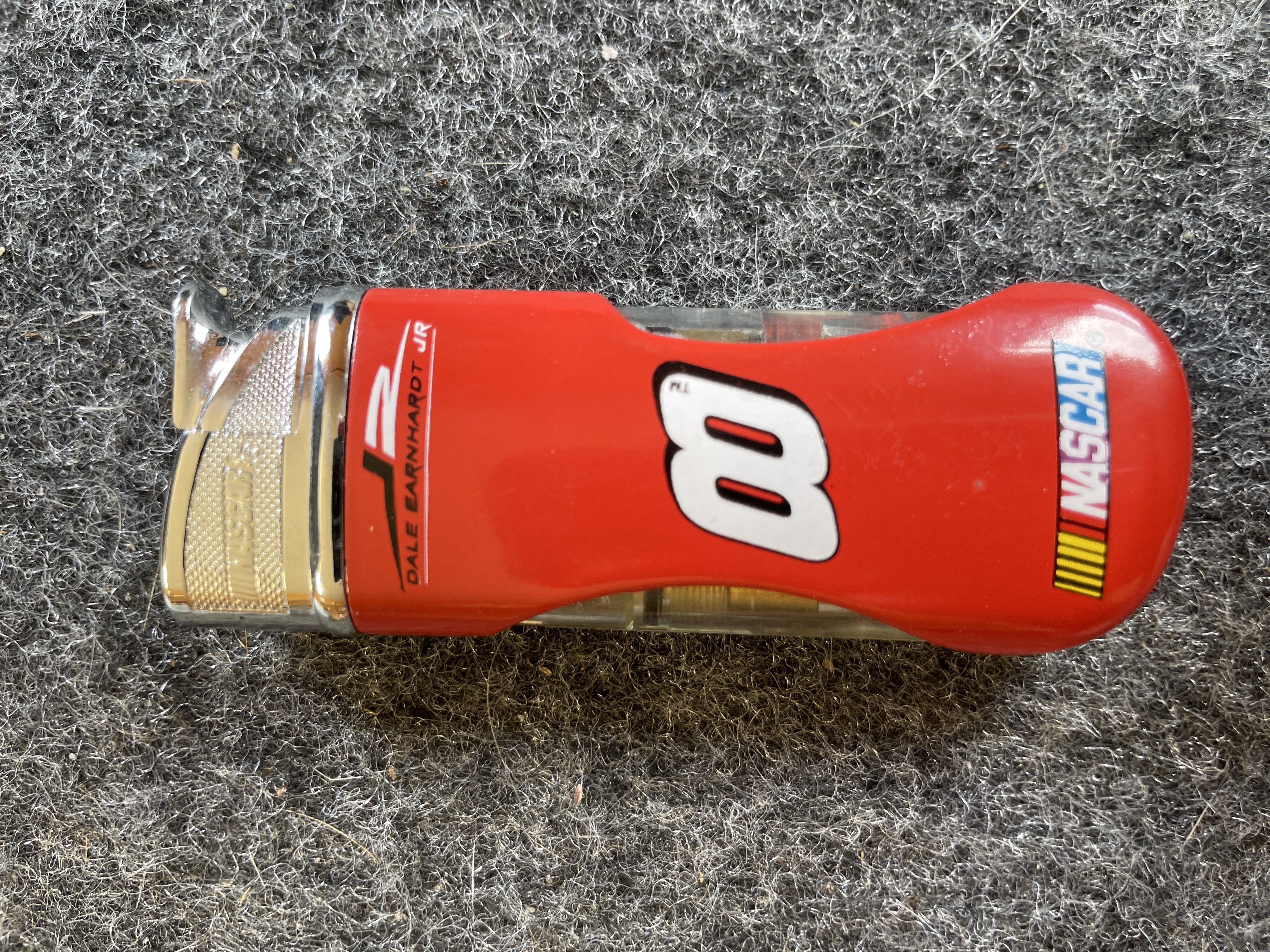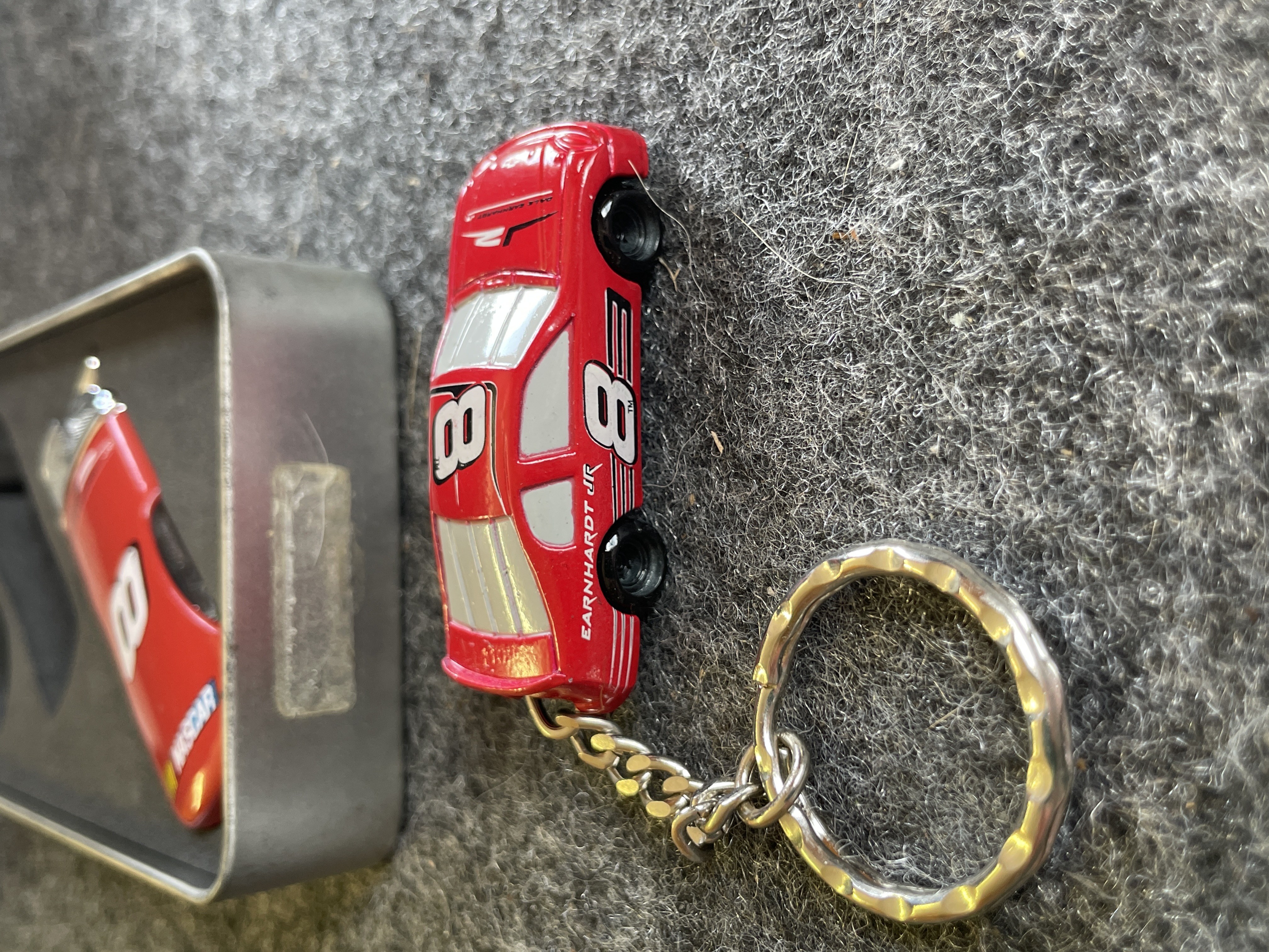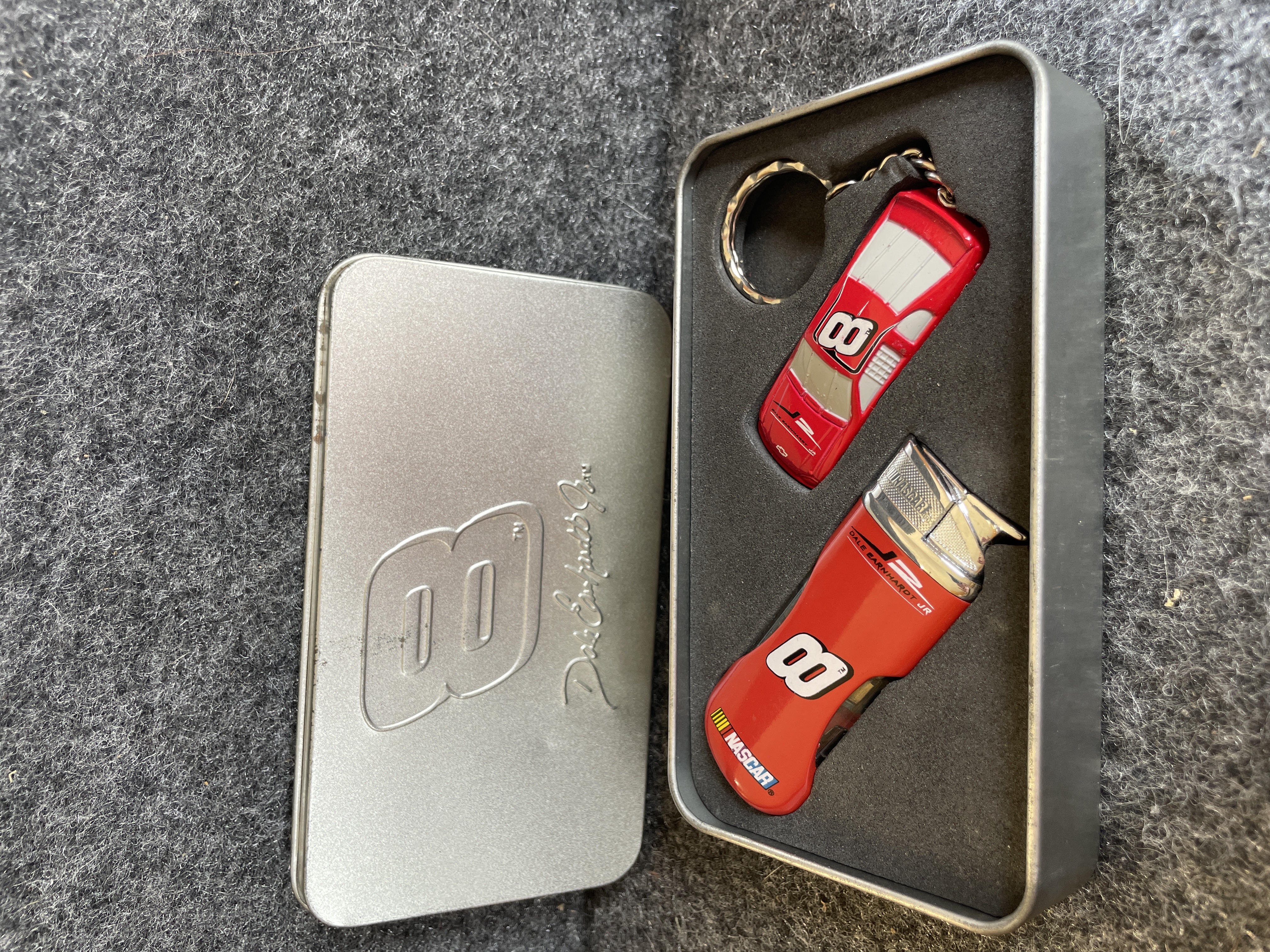 A red NASCAR-themed car-shaped keychain and a red lighter featuring the number 8 and Dale Earnhardt Jr. signature, presented in an embossed silver metal tin.