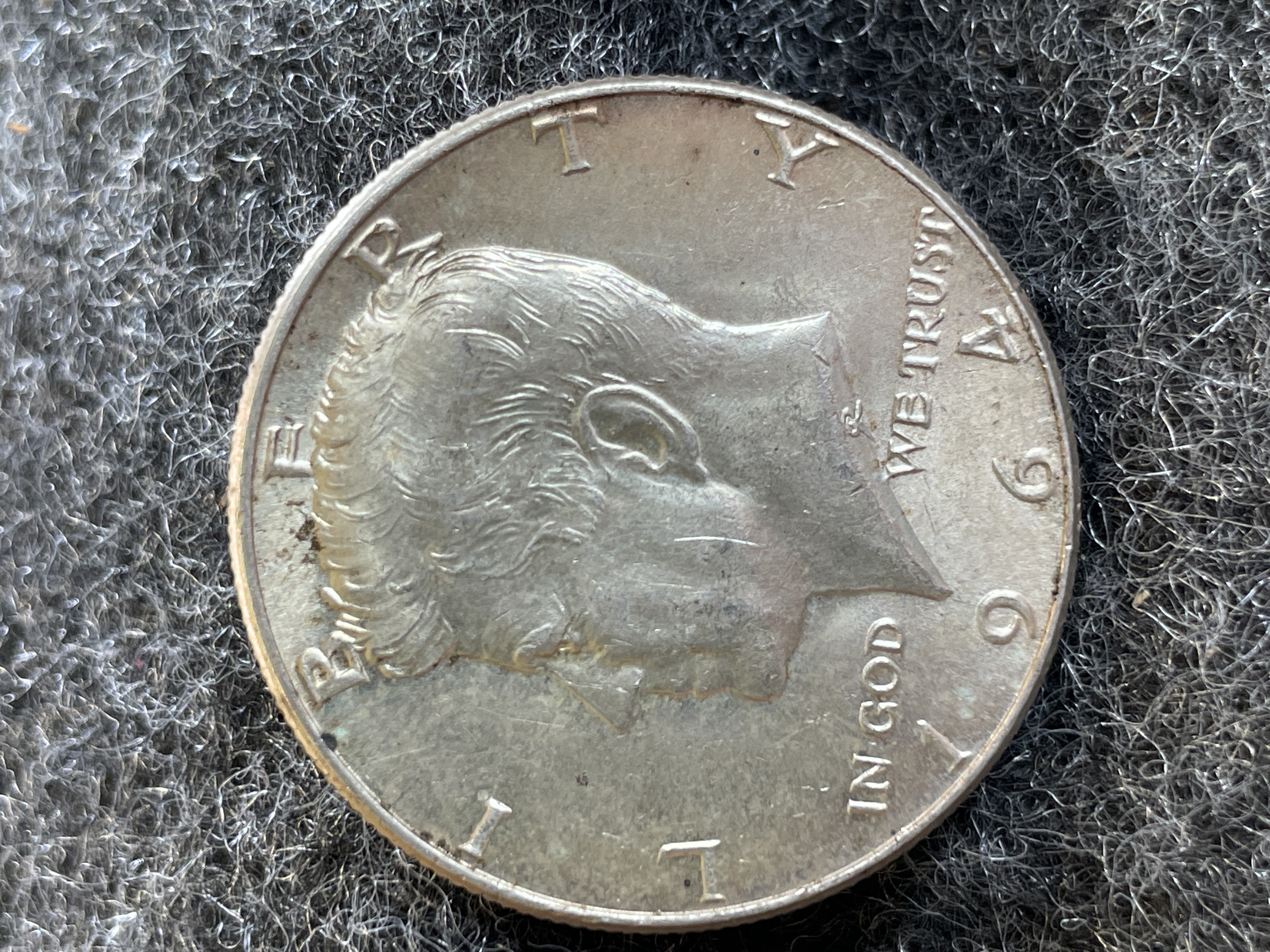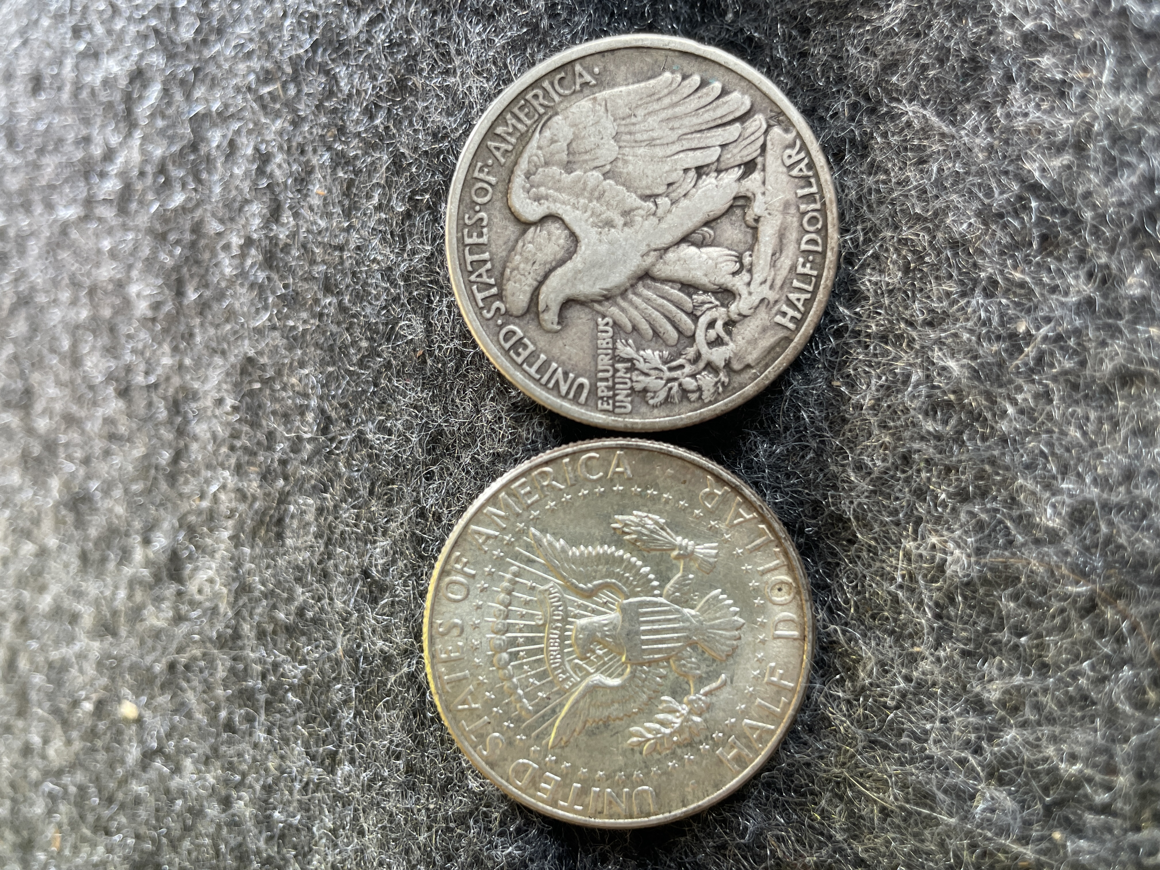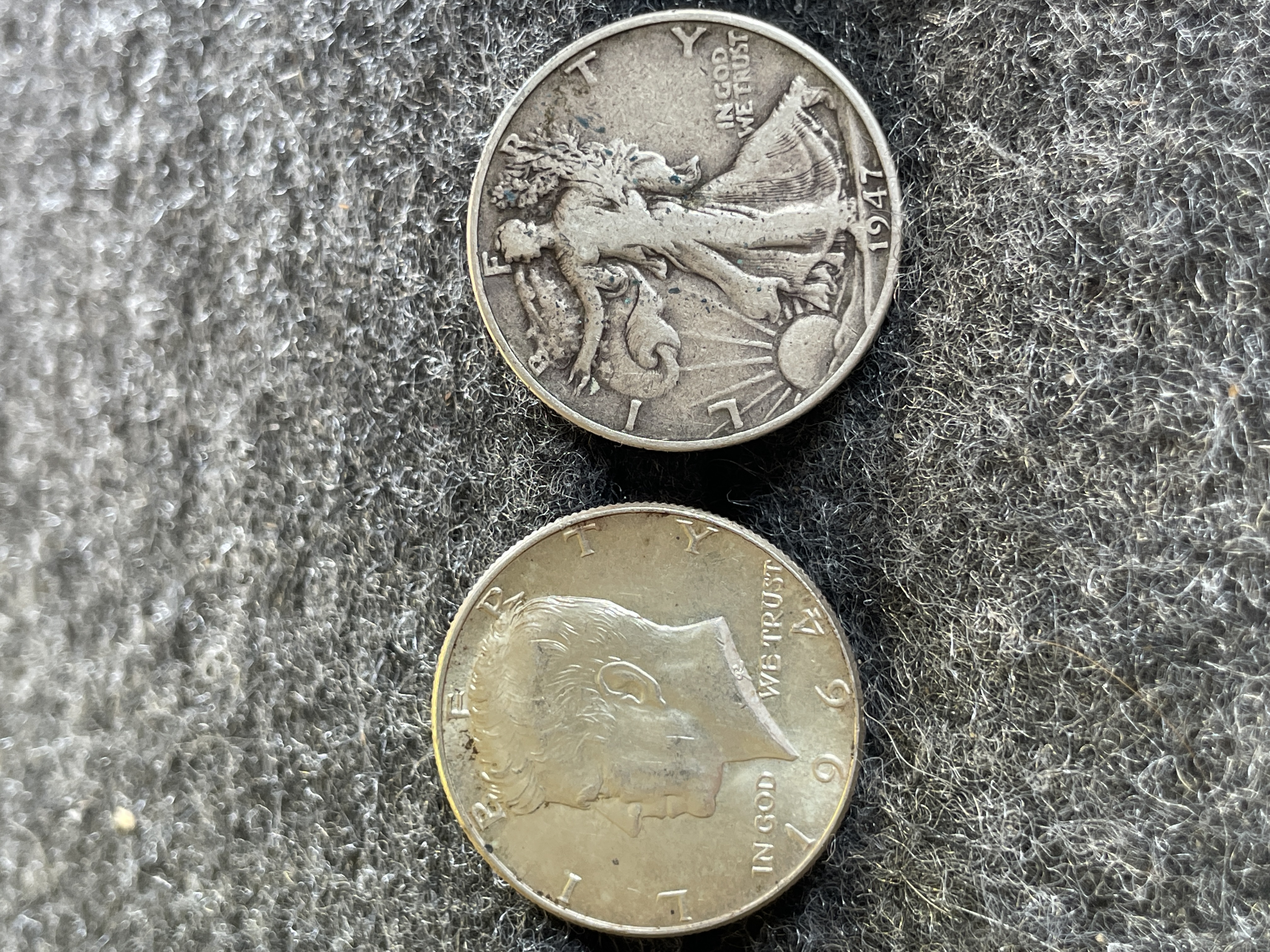 Two silver-toned United States half-dollar coins including a 1947 Walking Liberty and a 1964 Kennedy featuring standard inscriptions.