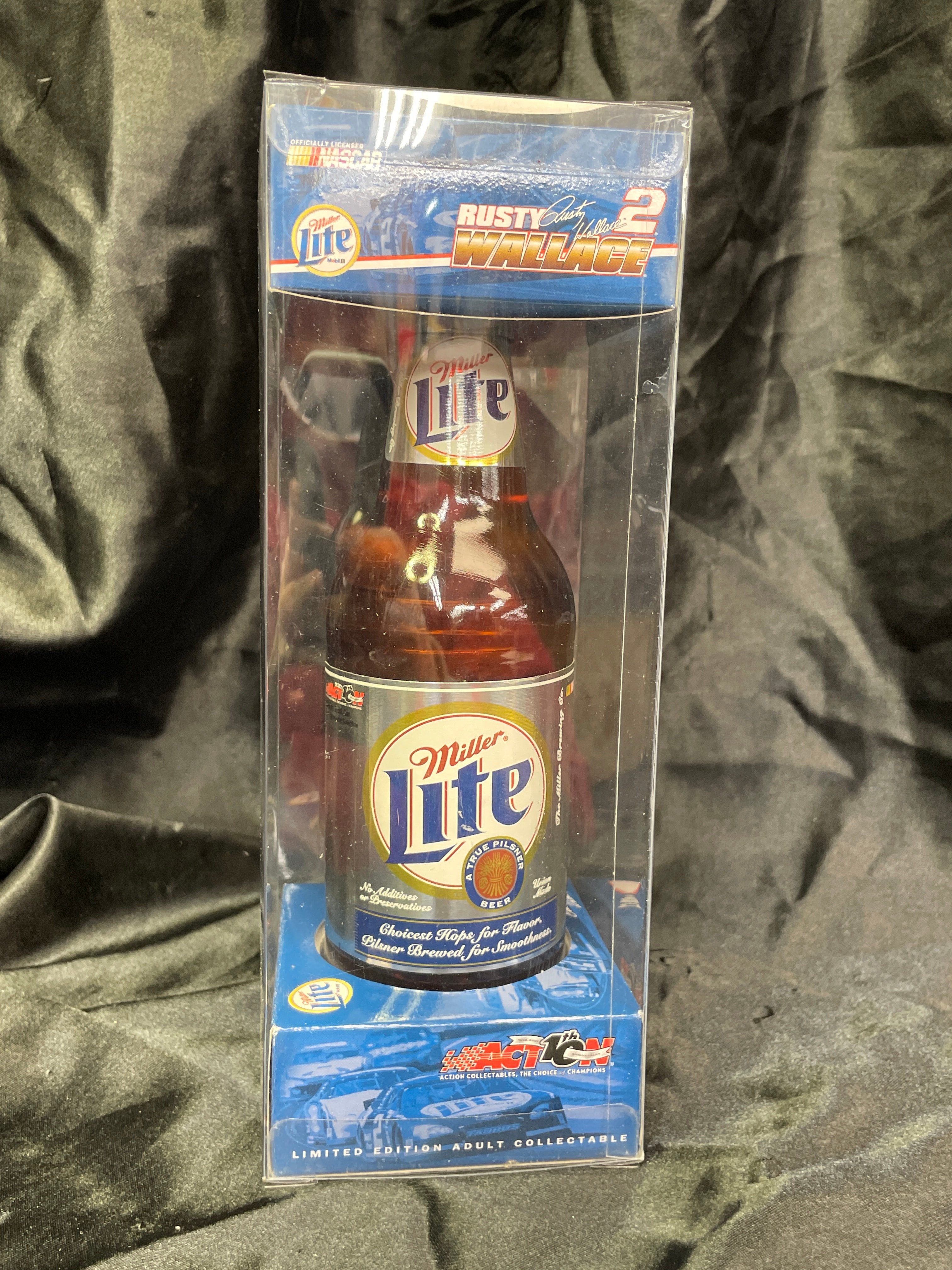 A NASCAR Rusty Wallace #2 Miller Lite 1:64 Stock Car in Bottle by Action Collectables, 2002. This modern licensed collectible features an amber glass bottle, prominently labeled “Miller Lite” and “A TRUE PILSNER BEER, ” which houses a 1:64-scale blue NASCAR stock car. The miniature car visible inside the bottle displays “Miller Lite” branding and the number “2.” The entire piece is sealed within its original clear plastic display case, which has a blue cardboard base and top. The packaging bears additional markings including “OFFICIALLY LICENSED NASCAR, ” “ACTION COLLECTABLES, THE CHOICE OF CHAMPIONS, ” and “LIMITED EDITION ADULT COLLECTABLE, ” along with “RUSTY WALLACE 2.”