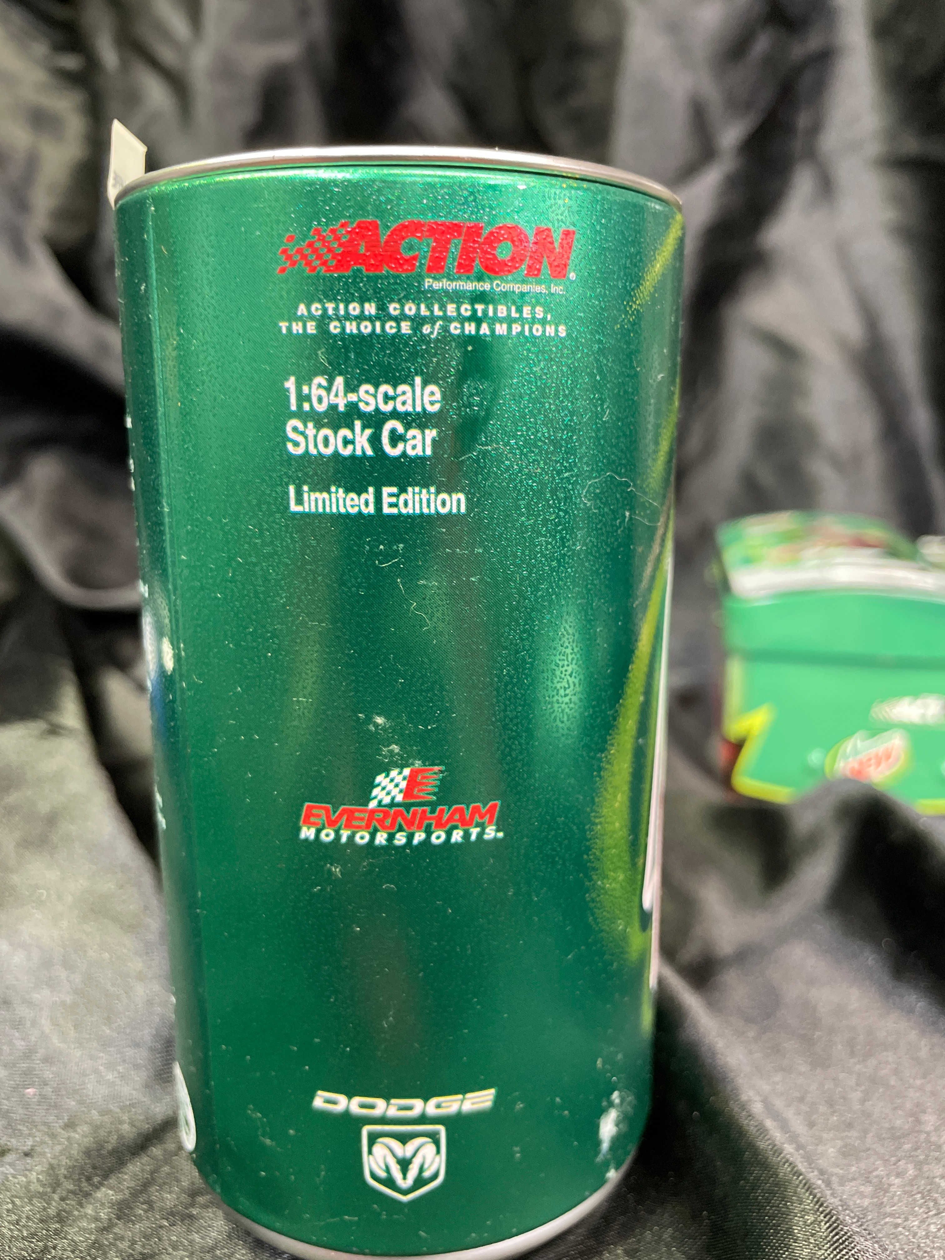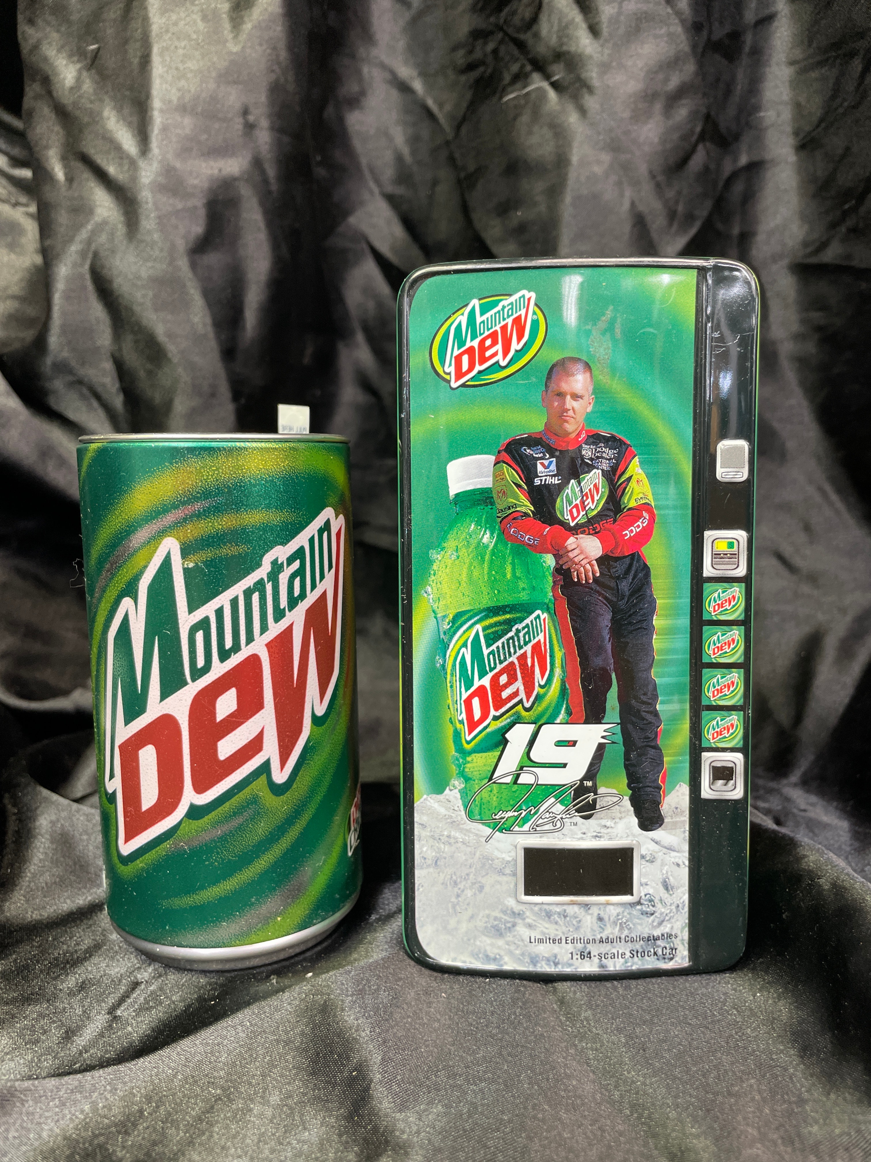 A Pair of Action Performance Mountain Dew NASCAR 1:64-Scale Collectible Tins, comprising a Jeremy Mayfield 'Vending Machine' Tin and a 'Soda Can' Tin may or may not have a smokie smell If you win and don't want we will take off your item at pick up! no sh