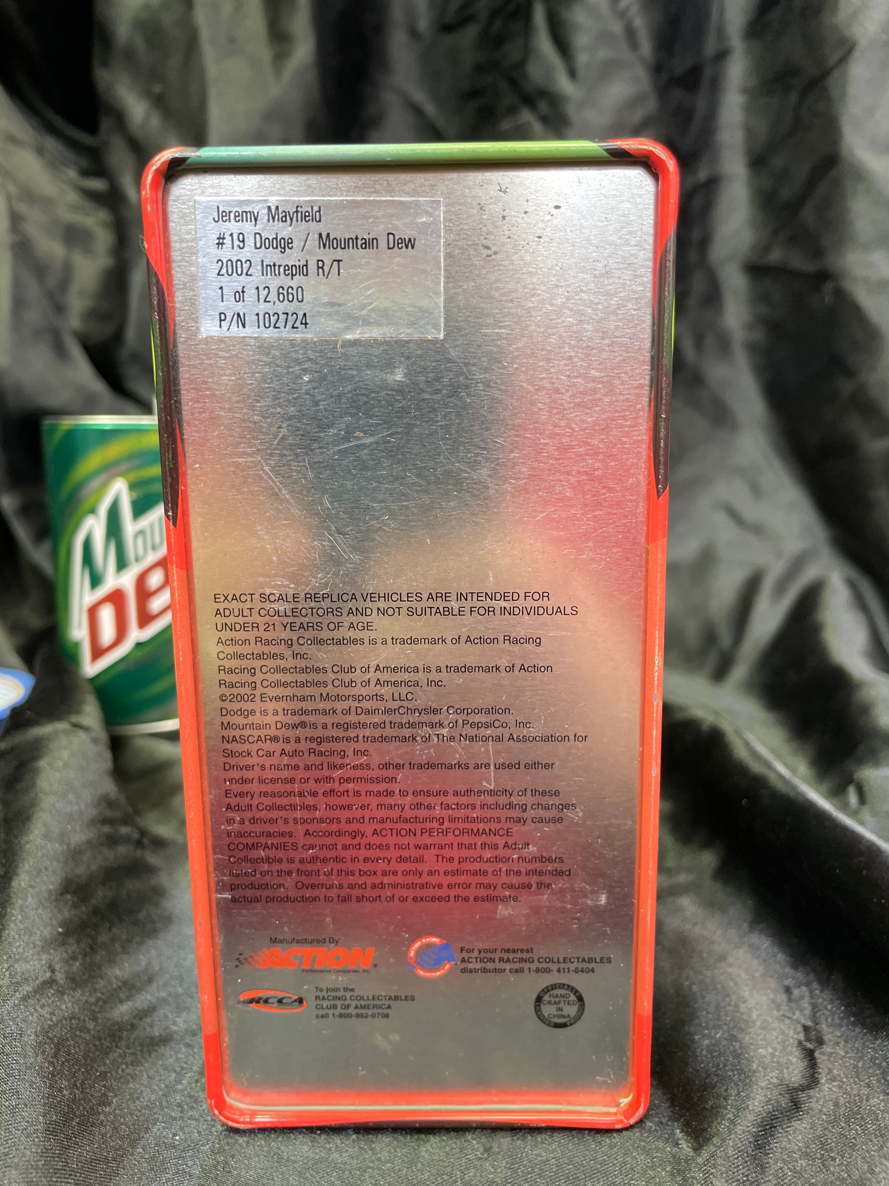 A pair of early 2000s metal collectible items manufactured by ACTION Performance Companies, Inc., featuring Mountain Dew branding and NASCAR racing themes. The first is a 2002 rectangular tin box, designed to resemble a miniature vending machine. It is adorned with a large image of race car driver Jeremy Mayfield next to a Mountain Dew bottle and his #19 car, with “Limited Edition Adult Collectibles 1:64-scale Stock Car” visible on the front. The reverse of this tin identifies it as “1 of 12,660” of a “2002 Intrepid R/T” and contains a 1:64-scale die-cast replica of a Mountain Dew #19 Dodge stock car nestled in a plastic insert. The second item is a 2001 cylindrical tin, styled as an oversized Mountain Dew soda can with a faux pull-tab lid. It features a green and yellow swirl design, “Mountain Dew” logo, and “1:64-scale Stock Car Limited Edition” text.
