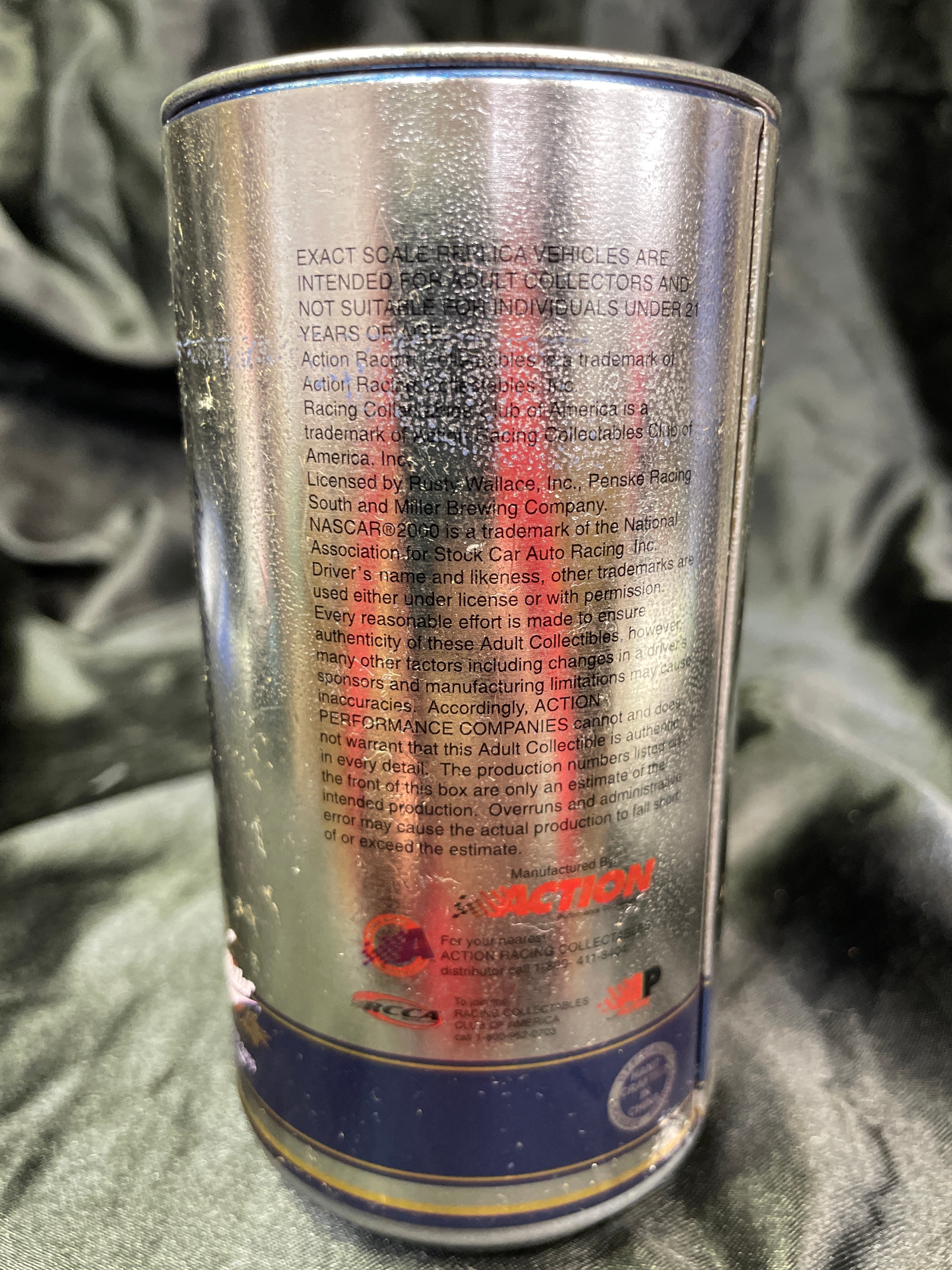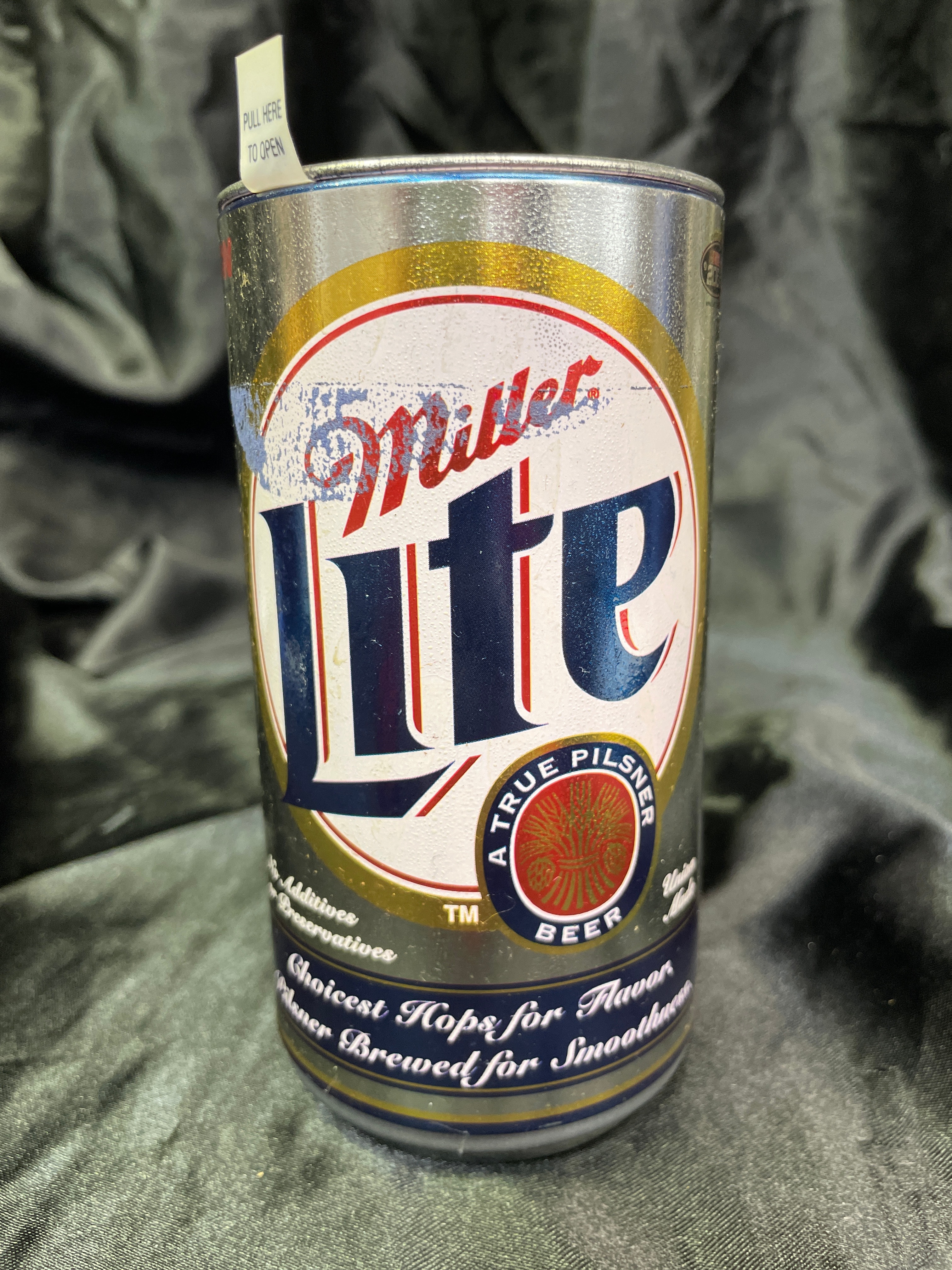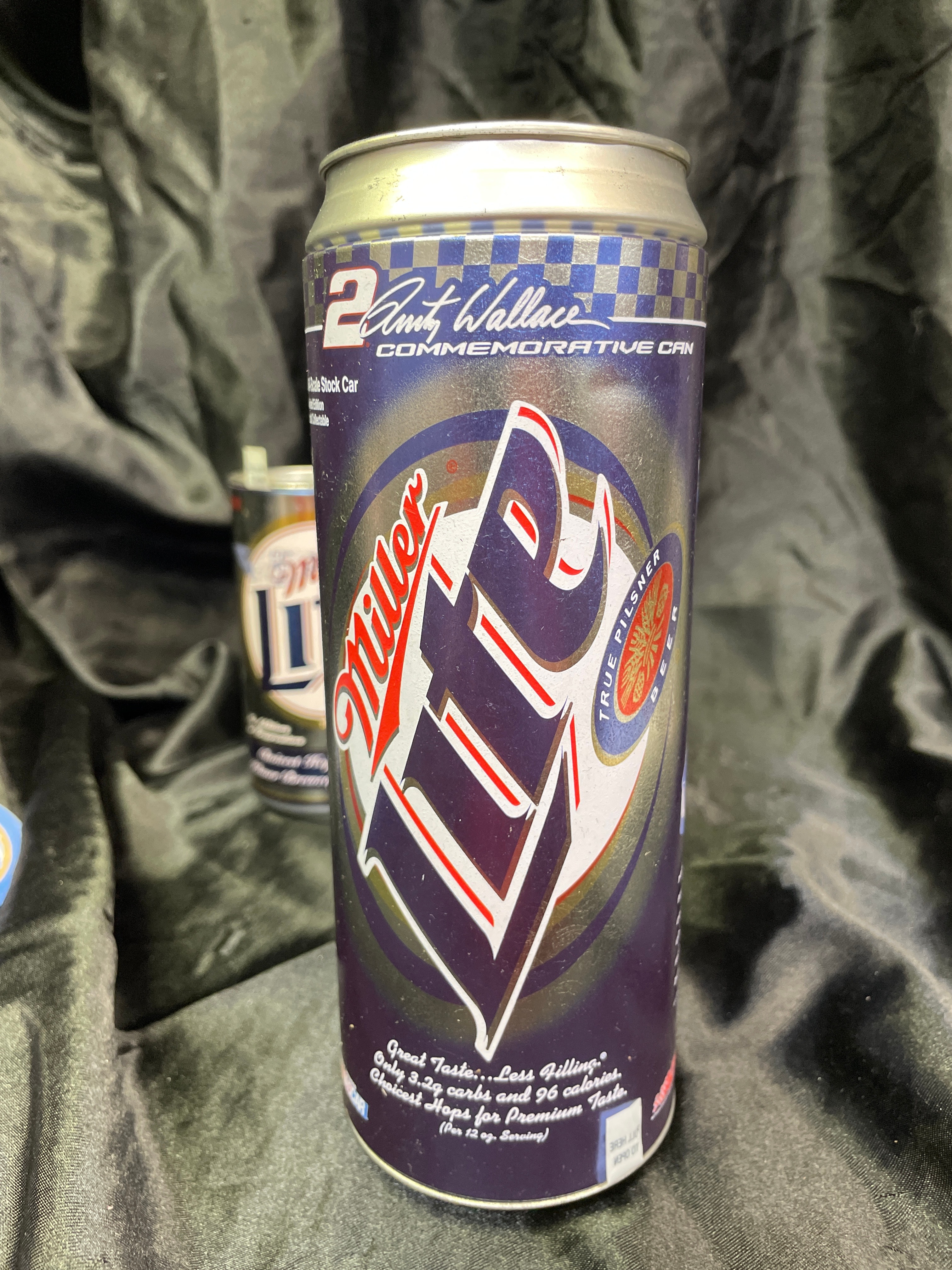 A pair of Miller Lite aluminum cans. The first is a 2005 Rusty Wallace #2 Miller Lite Charger in Can Limited Edition, explicitly identified by a base label (P/N 110556). This commemorative can features “Rusty’s Last Call” and “Penske Racing 2005” with imagery of Rusty Wallace and his #2 car. Text includes “Great Taste…Less Filling®” and “EXACT SCALE REPLICA VEHICLES ARE INTENDED FOR ADULT COLLECTORS”, indicating it contains a 1/64-scale stock car. It is sealed with a modern stay-tab. The second can is a standard Miller Lite aluminum can, featuring classic Miller Lite graphics with text “A TRUE PILSNER, ” “Choicest Hops for Flavor, ” and “Pilsner Brewed for Smoothness.” This can is opened via a modern stay-tab.